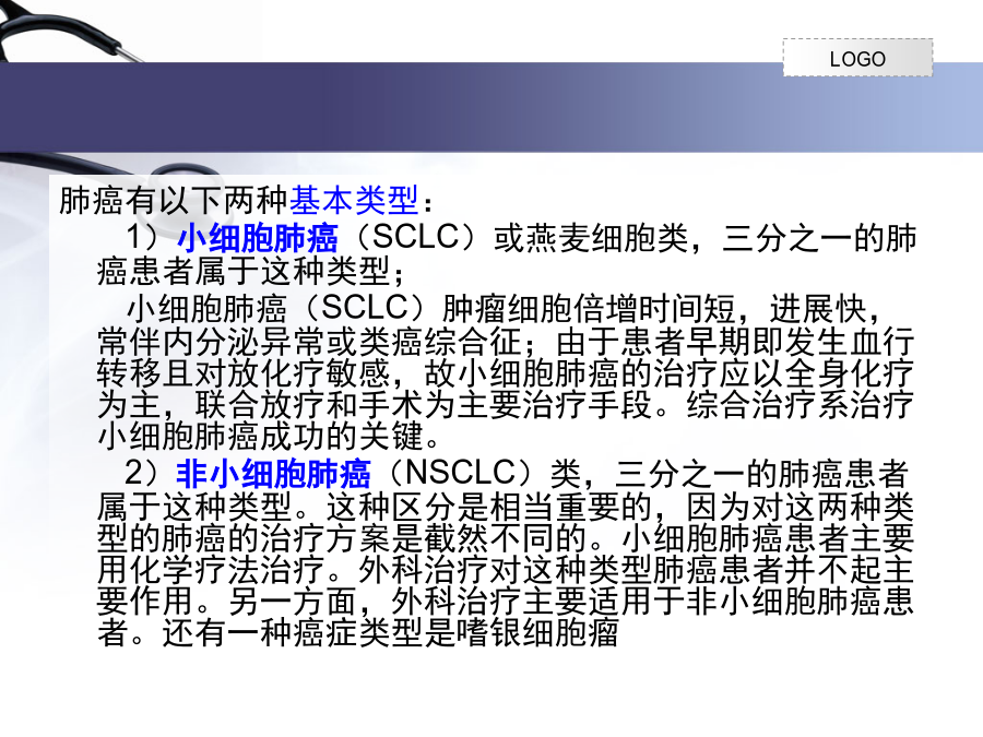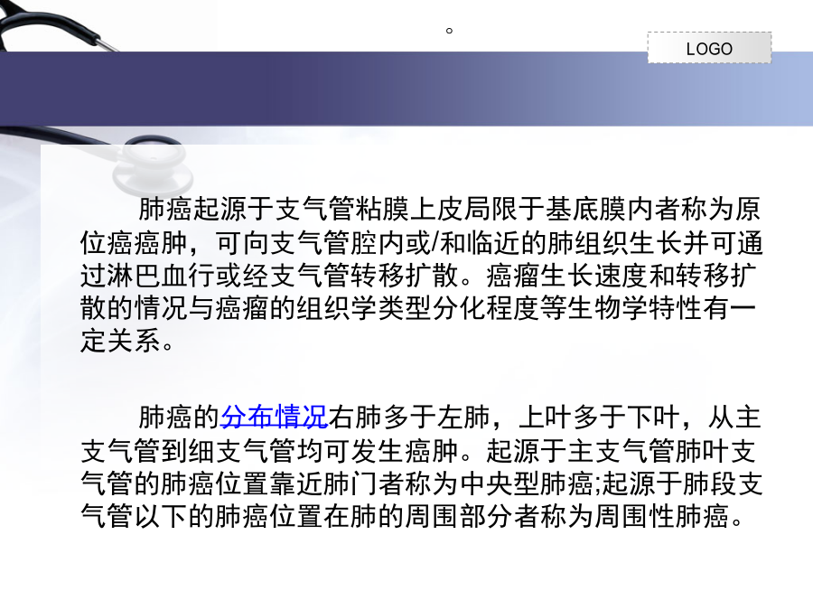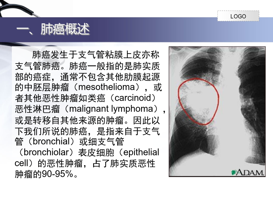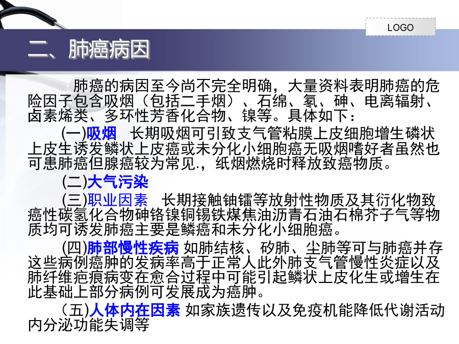 肺癌的医疗护理小讲课肺癌发生于支气管粘膜上皮亦称支气管肺癌。肺癌一般指的是肺实质部的癌症,通常不包含其他肋膜起源的中胚层肿瘤(mesothelioma),或者其他恶性肿瘤如类癌(carcinoid)恶性淋巴瘤(malignantlymphoma),或是转移自其他来源的肿瘤。因此以下我们所说的肺癌,是指来自于支气管(bronchial)或细支气管(bronchiolar)表皮细胞(epithelialcell)的恶性肿瘤,占了肺实质恶性肿瘤的90-95%。二、肺癌病因三、肺癌症状二)晚期症状 1.面、颈部水肿。 2.声嘶是最常见症状。 3.气促发生区域性扩散的肺癌患者几乎都有不同程度的气促。 四、诊断检查五、治疗方法六、围手术期护理七健康教育谢谢!