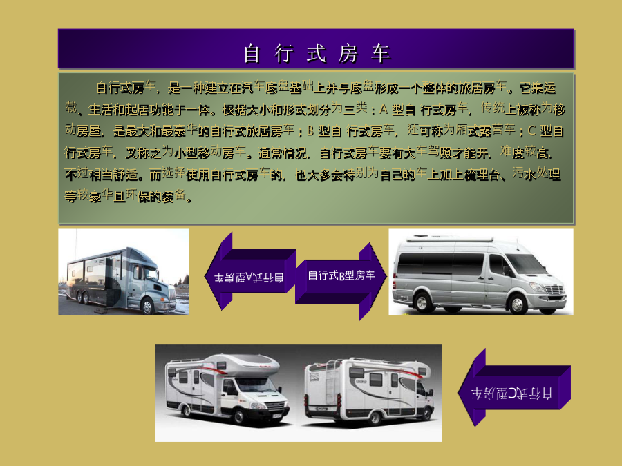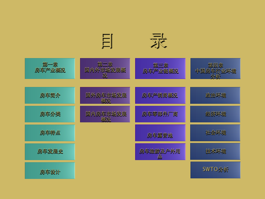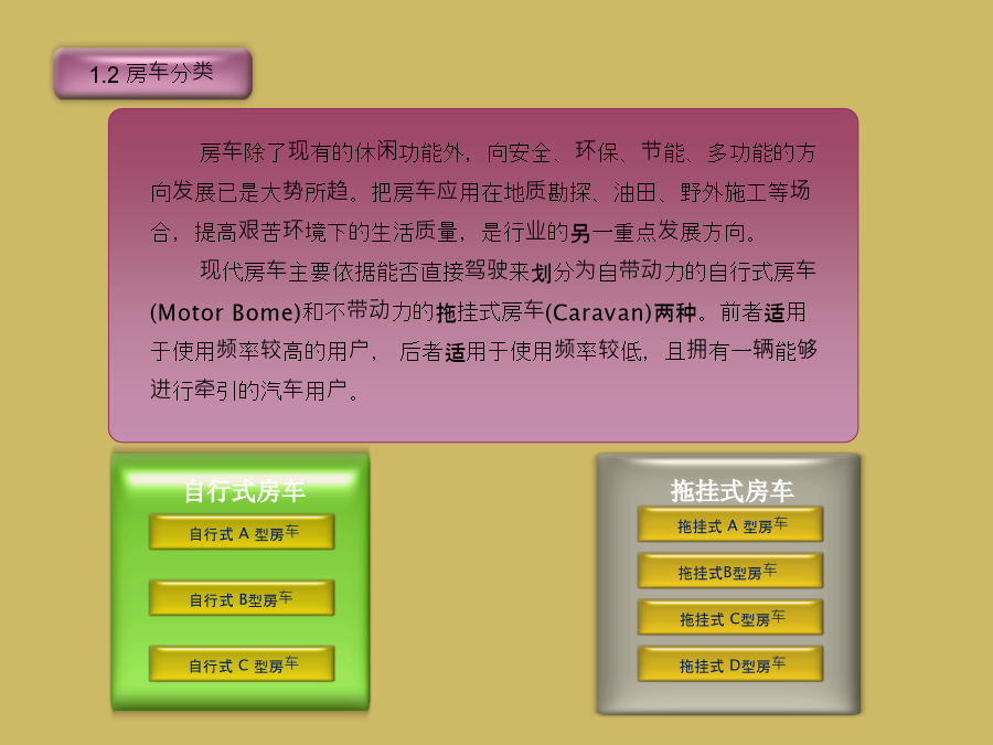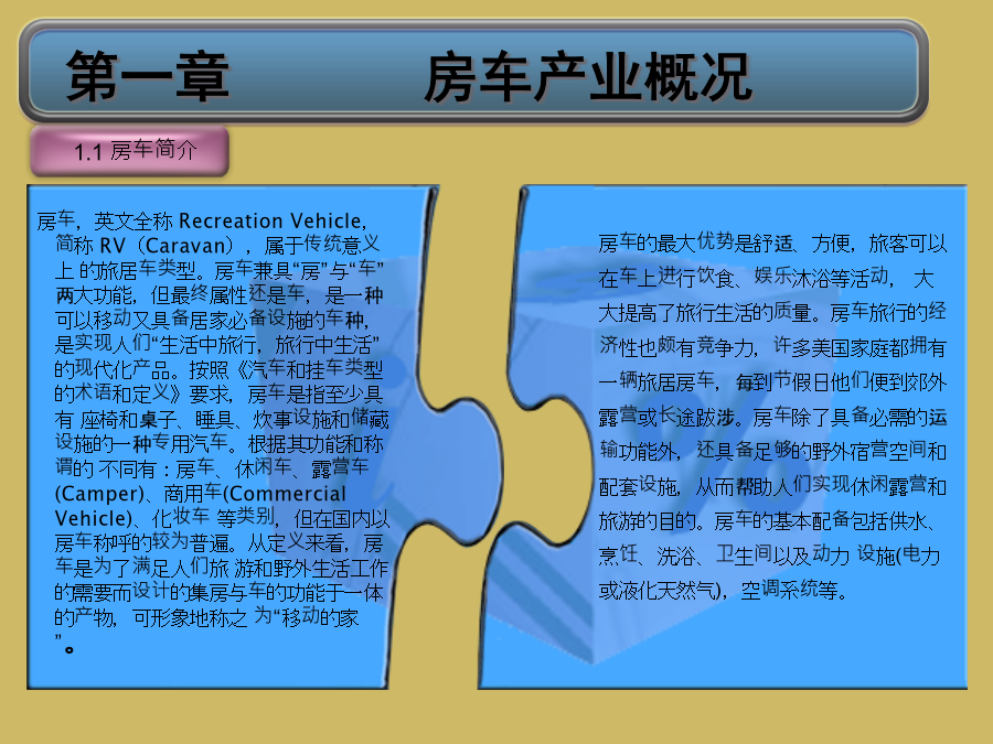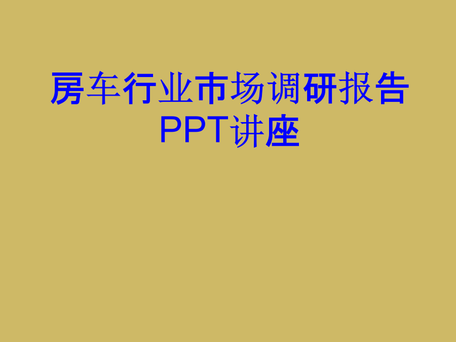 房车行业市场调研报告PPT讲座目录房车,英文全称RecreationVehicle,简称RV(Caravan),属于传统意义上的旅居车类型。房车兼具“房”与“车”两大功能,但最终属性还是车,是一种可以移动又具备居家必备设施的车种,是实现人们“生活中旅行,旅行中生活”的现代化产品。按照《汽车和挂车类型的术语和定义》要求,房车是指至少具有座椅和桌子、睡具、炊事设施和储藏设施的一种专用汽车。根据其功能和称谓的不同有:房车、休闲车、露营车(Camper)、商用车(CommercialVehicle)、化妆车等类别,但在国内以房车称呼的较为普遍。从定义来看,房车是为了满足人们旅游和野外生活工作的需要而设计的集房与车的功能于一体的产物,可形象地称之为“移动的家”。 1.2房车分类自行式房车拖挂式房车.是一种建立在挂车基础上的无动力源的旅居房车,它由小型客车轿车或皮卡牵引,组成旅居列车。拖挂式房车设计尺寸和质量大小适合高速公路行驶,不需特别许可,也不需要永久性的驻地。拖挂式房车按照应用类型分为:拖挂式A型房车、拖挂式B型房车、拖挂式C型房车、拖挂式D型房车。4.上世纪60年代,房车更是风靡一时,成为时尚生活的象征。每到节假日,人们便会驾着它到郊外露营或长途跋涉。精明的美国人把这种可移动的“房子”作为房地产来管理,叫移动房地产业。车身结构第二章国内外市场发展概况9 2013年6月份汽车销量完成情况(单位:万辆、%)汽车总需求:中国汽车市场需求快速增长,增长态势与乘用车市场需求增长态势基本相同2005~~2009年全球自行式房车新车注册量统计(辆)第三章房车产业链概况国外主要生产商一览表国内主要生产商一览表(1)生产厂家生产厂家国内主要生产商一览表(4)生产厂家整车厂量产、准量产房车专业房车改装厂及产品奔驰凌特是轻客中率先采用ESP系统的车型,这足以说明其对安全性的重视。而除此之外,其还配备了正副驾驶员安全气囊、每个座椅一条安全带、ABS(防抱死制动系统)、BAS(刹车辅助系统)、ASR(加速驱动防侧滑控制系统)等等,俨然当今主流中高级轿车的配置。凌特的动力单元是采用崭新CDI共轨燃油喷射技术的2.1升直列4缸柴油发动机。,具有更低的油耗、更小的噪音和更清洁的排放等优点。2.1升的发动机驱动车重2吨多的凌特丝毫未见吃力,最大输出扭矩达300Nm,作为房车底盘装载大重量的设备也不显吃力。同时,低底盘与2.6米的高大车身相对应,让凌特具备了改装所需要的足够的空间。金龙礼宾车的内部设计中无不体现着现代豪宅奢侈理念,可谓是车轮上的“移动豪宅”。房车的地板上铺着厚厚的乳白色羊毛地毯,客厅内摆放着高级真皮沙发、42英寸大屏幕液晶电视和五星级家庭影院音响系统,酒吧内藏有美酒,厨房内微波炉、电磁灶、洗碗机、三门冰箱一应俱全,可以在车上开办最出彩的家庭派对。房车的主卧配备了宽敞舒适的大床,旁边是视野广阔的美景大窗、备有专为女主人准备的走入式衣橱。宽敞的浴室带有冷热水系统,门前布置了华丽的梳妆台和洗衣、干衣机。此车突出特点是先进电子设备集中于一台中控电脑。车上的娱乐和窗帘都通过这台中控电脑控制,周边情况也通过中控电脑的屏幕随时看到,并且配备移动卫星电视接收系统、GPS卫星导航、多媒体电视会议系统、无线通话及无线网络等,既可在上面提供各种现代化的办公环境,又可作朋友聚会或客户会晤时的高雅接待。世界领先的重型卡车和大型巴士以及工业发动机制造商之一的斯堪尼亚(瑞典)重卡进入中国,在国内采用斯堪尼亚重卡底盘改装的首辆房车由中天高科特种车辆有限公司制造。其车内的设施有:卧具、炉具、冰箱、橱柜、沙发、餐桌椅、盥洗设施、空调、电视、音响等家具和电器。是集“衣、食、住、行”于一身,实现您野外露营、探险、考古、沙漠旅行、野外作业、野外办公、应急救援指挥等理想产品。广泛使用于旅游探险、石油勘探,煤矿应急救援,电力施工,矿山宿营等行业。3.2房车零部件厂商汽车制造业户外用品现状及问题4.2经济环境政府机构目前商务型房车仍然占据着中国房车市场的大量份额,政府机构和企业集团是房车市场的主要需求者和推动者,主要用于商务接待和商务活动。另外一些特殊行业也蕴含着巨大市场潜力,如建筑业、能源开发业以及农林畜牧业(野外种、养殖)等。个体消费配套设施问题4.4技术环境谢谢观看