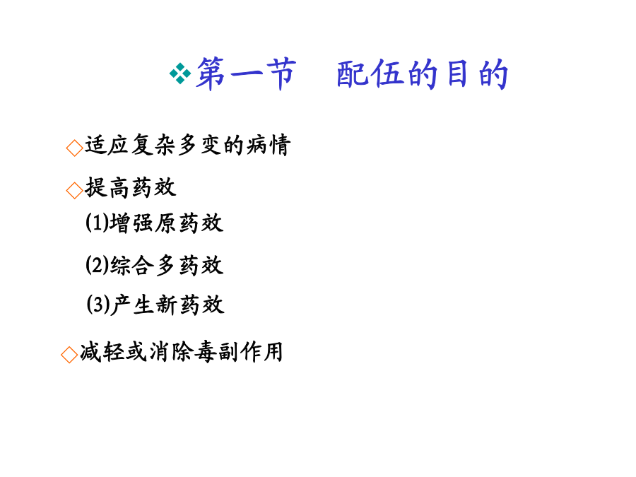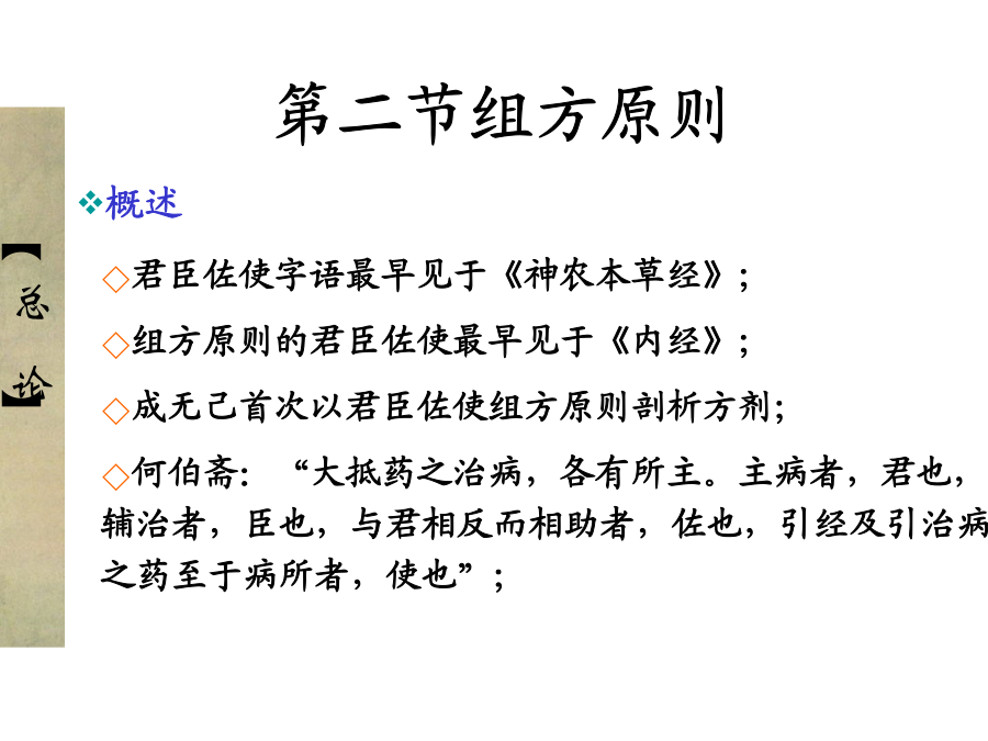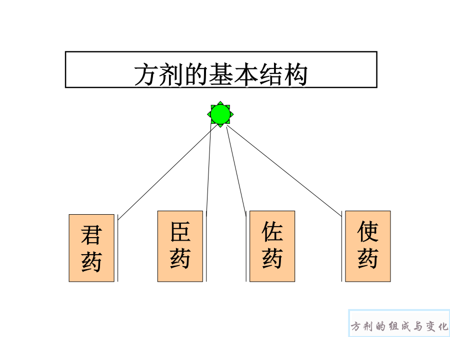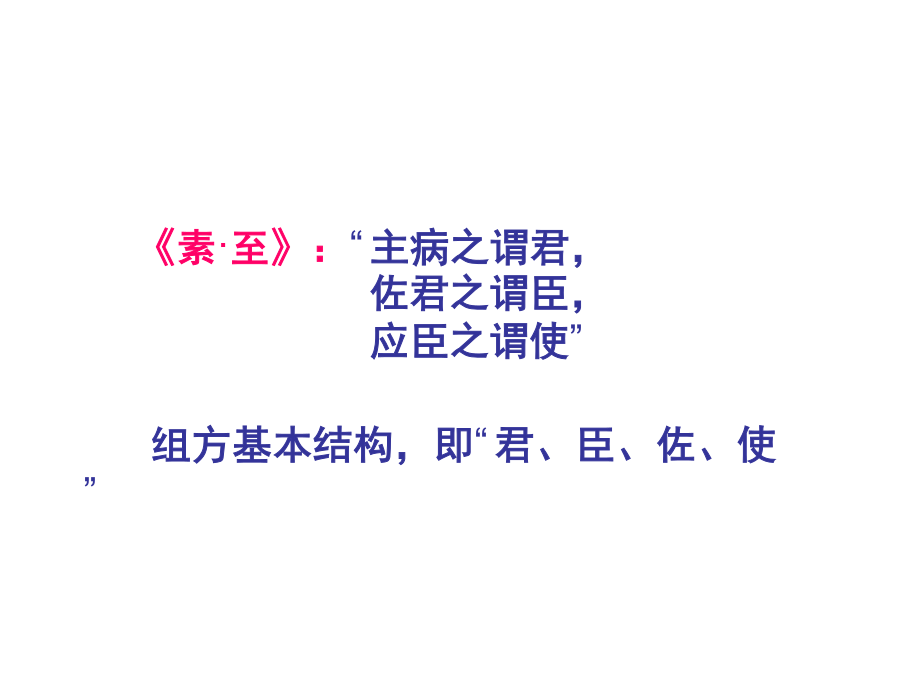 第一节配伍的目的【总论】【总论】《素·至》:“主病之谓君, 佐君之谓臣, 应臣之谓使”方剂的基本结构君君药臣药佐药使药使药在一首方剂中君药是主要的,起主要作用,是不可少的。臣、佐、使是否都具备,要根据病情和药性而定。麻 黄 汤一、为什么要组方变化? A、病情的轻重 B、病证的兼夹 C、年龄的大小 D、性别的差异 F、体质的强弱 G、地区季节气候差异方剂的变化形式药味增减变化臣药的加减:改变了君臣配伍关系,必然使方剂的功用发生根本变化。 例如:三拗汤,即麻黄汤去桂枝,主治风寒束肺的咳喘。 麻黄加术汤,即麻黄汤原方加白术12g,治疗痹证初起。用药相同,用量不同,其药力则有大小之别,从而改变了君臣地位及其配伍关系,必然使方剂的功用发生根本变化。方剂名称方剂名称同一方剂,用药、用量相同,剂型不同,其作用也有差别。小结历史上首次依据“君、臣、佐、使”理论分析组方原理的医著是:小承气汤变化为厚朴三物汤是属于: