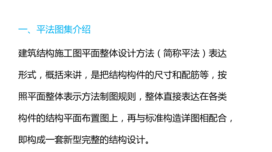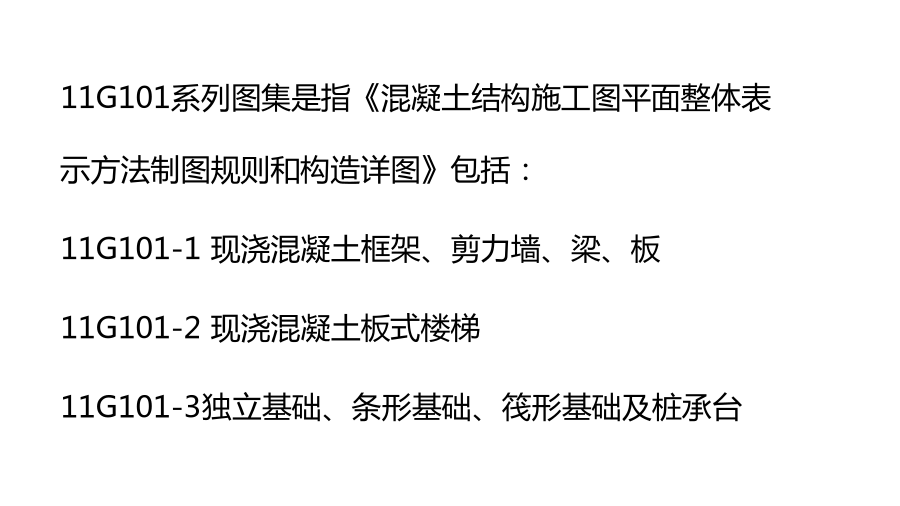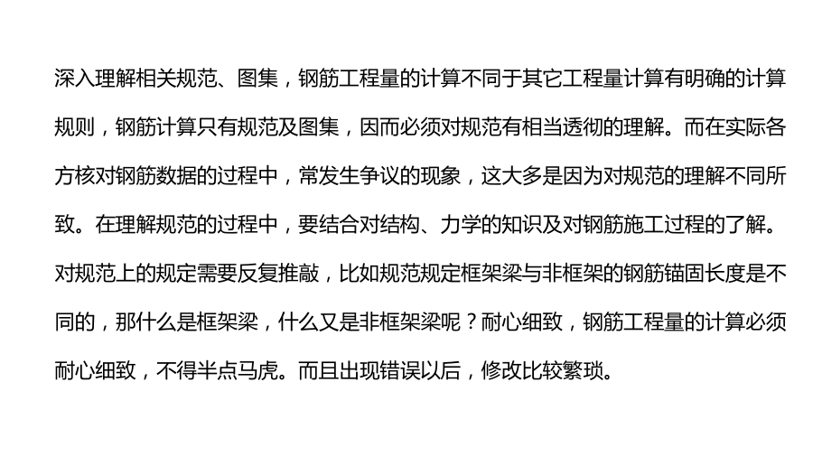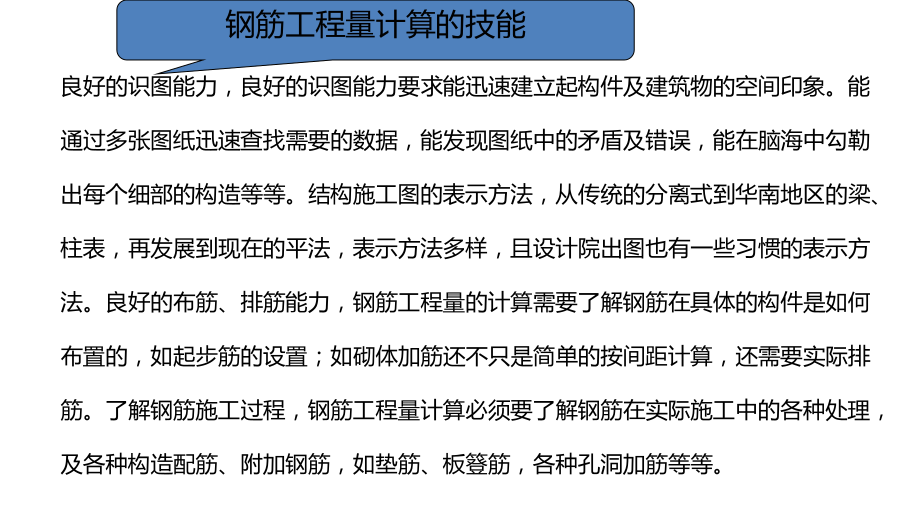 本讲内容:一、平法图集介绍 建筑结构施工图平面整体设计方法(简称平法)表达形式,概括来讲,是把结构构件的尺寸和配筋等,按照平面整体表示方法制图规则,整体直接表达在各类构件的结构平面布置图上,再与标准构造详图相配合,即构成一套新型完整的结构设计。 11G101系列图集是指《混凝土结构施工图平面整体表示方法制图规则和构造详图》包括: 11G101-1现浇混凝土框架、剪力墙、梁、板 11G101-2现浇混凝土板式楼梯 11G101-3独立基础、条形基础、筏形基础及桩承台良好的识图能力,良好的识图能力要求能迅速建立起构件及建筑物的空间印象。能通过多张图纸迅速查找需要的数据,能发现图纸中的矛盾及错误,能在脑海中勾勒出每个细部的构造等等。结构施工图的表示方法,从传统的分离式到华南地区的梁、柱表,再发展到现在的平法,表示方法多样,且设计院出图也有一些习惯的表示方法。良好的布筋、排筋能力,钢筋工程量的计算需要了解钢筋在具体的构件是如何布置的,如起步筋的设置;如砌体加筋还不只是简单的按间距计算,还需要实际排筋。了解钢筋施工过程,钢筋工程量计算必须要了解钢筋在实际施工中的各种处理,及各种构造配筋、附加钢筋,如垫筋、板簦筋,各种孔洞加筋等等。 深入理解相关规范、图集,钢筋工程量的计算不同于其它工程量计算有明确的计算规则,钢筋计算只有规范及图集,因而必须对规范有相当透彻的理解。而在实际各方核对钢筋数据的过程中,常发生争议的现象,这大多是因为对规范的理解不同所致。在理解规范的过程中,要结合对结构、力学的知识及对钢筋施工过程的了解。对规范上的规定需要反复推敲,比如规范规定框架梁与非框架的钢筋锚固长度是不同的,那什么是框架梁,什么又是非框架梁呢?耐心细致,钢筋工程量的计算必须耐心细致,不得半点马虎。而且出现错误以后,修改比较繁琐。(1)关于钢筋理论(预算用量)计算与下料计算 计算钢筋长度按钢筋什么部位来计算? 下料计算按钢筋中轴线计算 理论计算按钢筋外皮计算 (2)关于钢筋计算方法的多样性 有按甲方要求的,按国家规范的,按当地定额的,按地方标准的,按标准图集的。。。。没有统一的计算规则柱、墙以基础为支座——柱、墙与基础关联; 梁以柱为支座——梁与柱关联; 板以梁为支座梁——板与梁关联。 结构设计原则——强柱弱梁、强剪弱弯、强节点、强锚固、强构造。筏板或基础梁是柱、墙的支座,柱是梁的支座,梁是板的支座支座问题其实是力的传递路径问题。二、梁钢筋识图与算量 梁的平面注写包括集中标注与原位标注 集中标注表达梁的通用数值 原位标注表达梁的特殊数值。 当集中标注中的某项数值不适用于梁的某部位时,则将该项数值原位标注,施工中,原位标注优先于集中标注。 集中标注: 1、梁编号、梁截面尺寸 2、箍筋:钢筋级别、直径、加密区及非加密区、肢数 3、梁上下通长筋和架立筋, 4、梁侧面纵筋:构造腰筋及抗扭腰筋 5、梁顶面标高高差(该项为选注) . 梁截面尺寸,该项为必注值。 当为等截面梁时,用b×h表示; 当为竖向加腋梁时,用b×hGYC1×C2表示,其中C1为腋长,C2为腋高; 当为水平加腋梁时,用b×hPYC1×C2表示,其中C1为腋长,C2为腋宽,加腋部分应在平面中绘制; 当有悬挑梁且根部和端部的高度不同时,用斜线分隔根部与端部的高度值,即为b×h1/h2 原位标注内容包括梁支座上部纵筋(该部位含通长筋在内所有纵筋)、梁下部纵筋、附加箍筋或吊筋、集中标注不适合于某跨时标注的数值。 原位标注: 1、梁支座上、下部纵筋 2、吊筋、附加箍筋 梁箍筋,包括钢筋级别、直径、加密区与非加密区间距及肢数,该项为必注值。 箍筋加密区与非加密区的不同间距及肢数需用斜线“/”分隔; 当梁箍筋为同一种间距及肢数时,则不需用斜线; 当加密区与非加密区的箍筋肢数相同时,则将肢数注写一次;箍筋肢数应写在括号内。 例:Φ10@100/200(4) Φ8@100(4)/150(2) 当抗震结构中的非框架梁、悬挑梁、井字梁,及非抗震结构中的各类梁采用不同的箍筋间距及肢数时,也用斜线“/”将其分隔开来。注写时,先注写梁支座端部的箍筋(包括箍筋的箍数、钢筋级别、直径、间距与肢数),在斜线后注写梁跨中部分的箍筋间距及肢数。 例: 13Φ10@150/200(4), 18Φ12@150(4)/200(2),梁上部通长筋或架立筋配置(通长筋可为相同或不同直径采用搭接连接、机械连接或对焊接连接的钢筋),该项为必注值。 当同排纵筋中既有通长筋又有架立筋时,应用加号“+”将通长筋和架立筋相联。注写时须将角部纵筋写在加号的前面,架立筋写在加号后面的括号内,以示不同直径及与通长筋的区别。当全部采用架立筋时,则将其写入括号内。 例:2φ22+(4φ12) 2φ22+4φ20 当梁的上部纵筋和下部纵筋为全跨相同,且多数