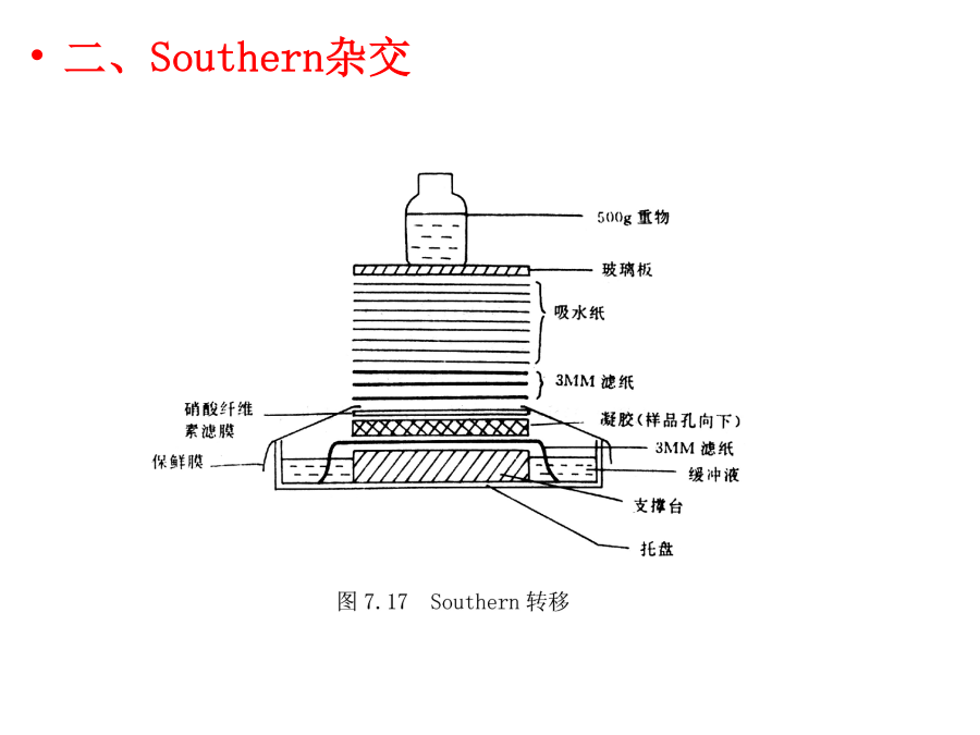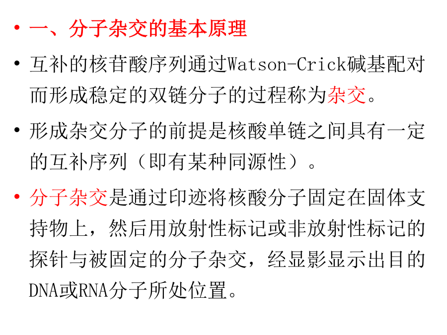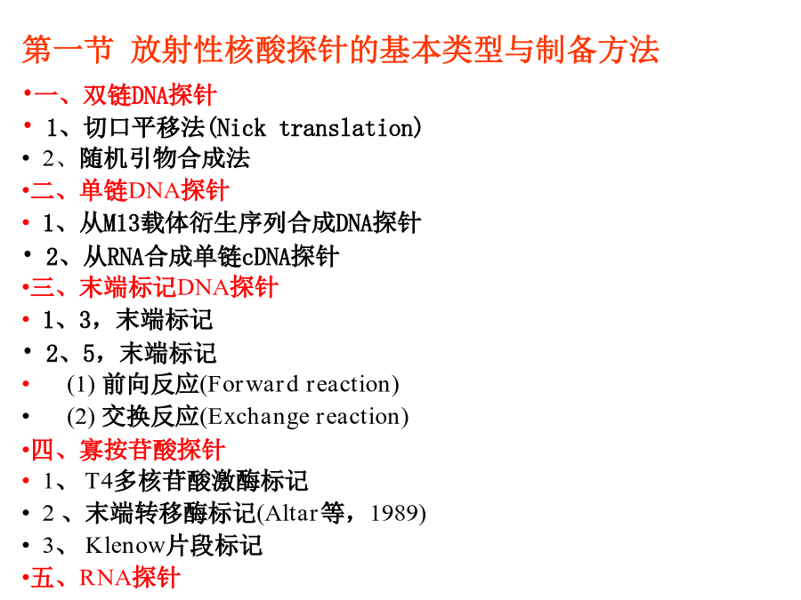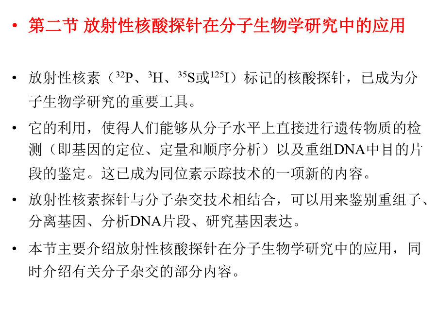 一、双链DNA探针 1、切口平移法(Nicktranslation) 2、随机引物合成法 二、单链DNA探针 1、从M13载体衍生序列合成DNA探针 2、从RNA合成单链cDNA探针 三、末端标记DNA探针 1、3,末端标记 2、5,末端标记 (1)前向反应(Forwardreaction) (2)交换反应(Exchangereaction) 四、寡按苷酸探针 1、T4多核苷酸激酶标记 2、末端转移酶标记(Altar等,1989) 3、Klenow片段标记 五、RNA探针第二节放射性核酸探针在分子生物学研究中的应用 放射性核素(32P、3H、35S或125I)标记的核酸探针,已成为分子生物学研究的重要工具。 它的利用,使得人们能够从分子水平上直接进行遗传物质的检测(即基因的定位、定量和顺序分析)以及重组DNA中目的片段的鉴定。这已成为同位素示踪技术的一项新的内容。 放射性核素探针与分子杂交技术相结合,可以用来鉴别重组子、分离基因、分析DNA片段、研究基因表达。 本节主要介绍放射性核酸探针在分子生物学研究中的应用,同时介绍有关分子杂交的部分内容。一、分子杂交的基本原理 互补的核苷酸序列通过Watson-Crick碱基配对而形成稳定的双链分子的过程称为杂交。 形成杂交分子的前提是核酸单链之间具有一定的互补序列(即有某种同源性)。 分子杂交是通过印迹将核酸分子固定在固体支持物上,然后用放射性标记或非放射性标记的探针与被固定的分子杂交,经显影显示出目的DNA或RNA分子所处位置。二、Southern杂交Middle三、放射性核酸探针在分子生物学研究中的应用 (1)筛选载体外源DNA需要与某种工具重组,然后才能导入宿主细胞中进行克隆和保存或表达外源DNA中的遗传信息,这种将外源DNA携带进入宿主细胞的工具称为载体。根据核酸序列的同源性,利用放射性核酸探针与转化后宿主细胞中的质粒或噬菌体进行杂交,可以筛选出重组的质粒或噬菌体。从而实现重组载体的筛选。 (2)检测基因表达细胞核内的DNA片段通过转录形成mRNA并释放到细胞质中。被检测基因在细胞中的转录情况可以进行如下分析: ①Northern杂交检查细胞中是否含有特定的mRNA,测定特定mRNA在总RNA中的比例,由此获得目的mRNA的转录情况。 ②斑点杂交应特异性探针检测mRNA,并估计表达过程中mRNA的转录程度。(3)筛选基因文库由于在构建文库的工作中需要筛选大量的重组子,通常都采用杂交进行筛选,以便在较短的时间内获得阳性克隆。用DNA片段作为探针进行杂交的溶液主要有:甲酰胺;水溶液。这两种溶液都能得到良好的结果。 (4)鉴定作物品种由于不同品种的作物,其DNA和mRNA存在着差异,因此用特定的核酸探针进行不同品种间的分子杂交,可得到不同品种在遗传物质上的差异。 (5)诊断与鉴定病害在病害的诊断和鉴定中,核酸探针技术被认为是一种非常有力的手段。它不仅能确定染色体组的组成和基因的功能,而且为病毒的诊断和确定病毒间的关系提供了新途径。 (6)加快DNA序列分析对大片段的DNA进行序列分析时,可用限制酶将它酶切成小片段,再用已知序列的核酸探针进行杂交,测定它们间的同源性。这样可以大大加快序列的测定过程。