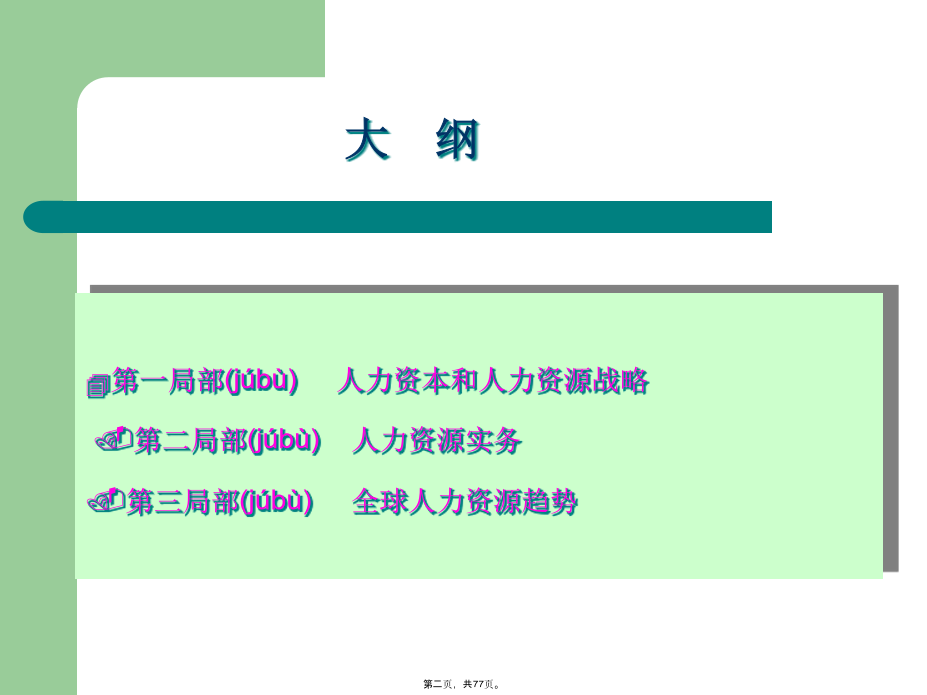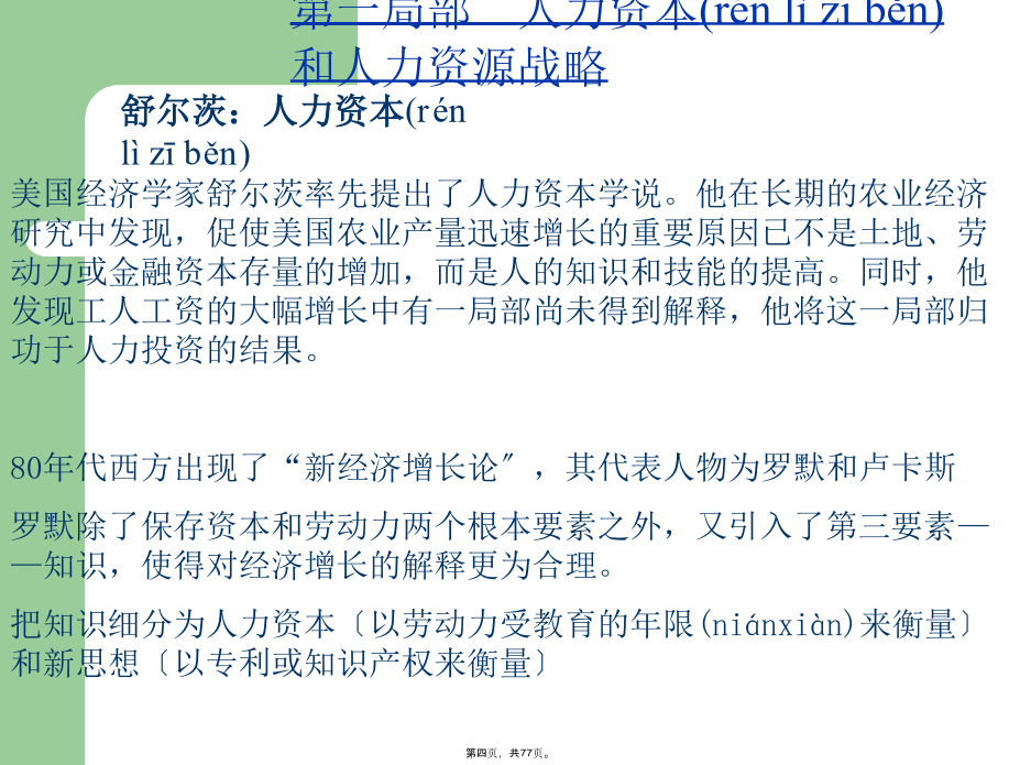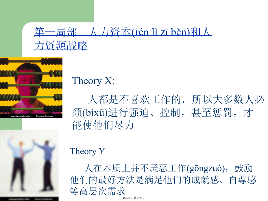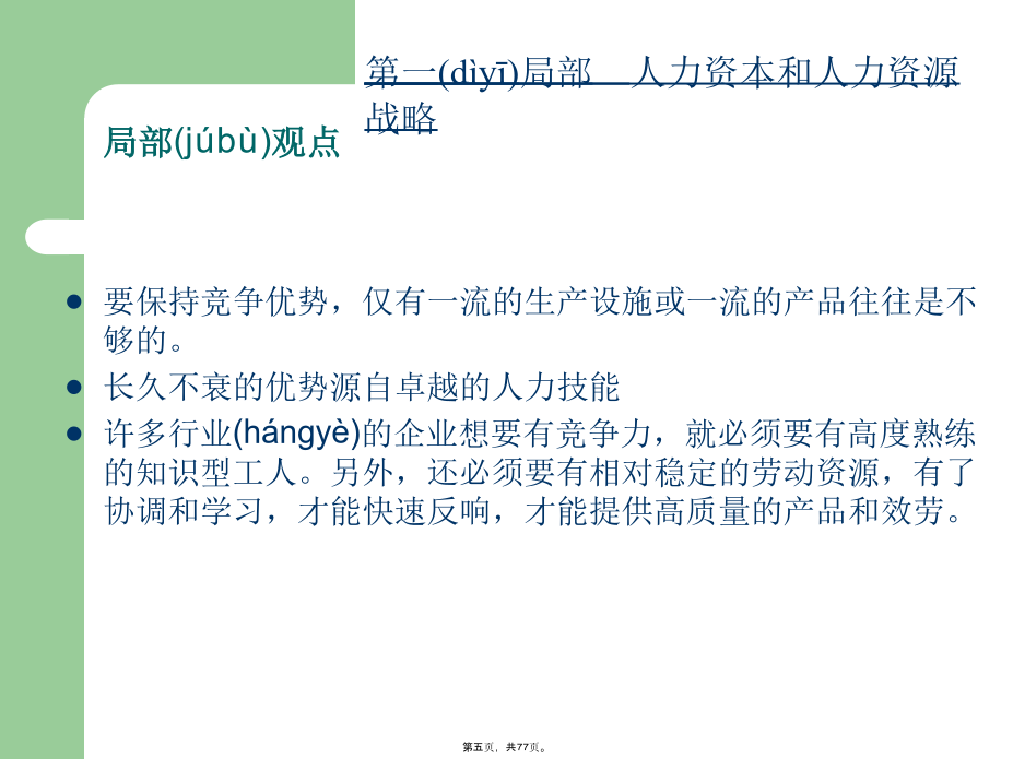 非人事经理(jīnglǐ)的人力资源管理第一局部(júbù)人力资本和人力资源战略第二局部(júbù)人力资源实务第三局部(júbù)全球人力资源趋势TheoryX: 人都是不喜欢工作的,所以大多数人必须(bìxū)进行强迫、控制,甚至惩罚,才能使他们尽力美国经济学家舒尔茨率先提出了人力资本学说。他在长期的农业经济研究中发现,促使美国农业产量迅速增长的重要原因已不是土地、劳动力或金融资本存量的增加,而是人的知识和技能的提高。同时,他发现工人工资的大幅增长中有一局部尚未得到解释,他将这一局部归功于人力投资的结果。 80年代西方出现了“新经济增长论〞,其代表人物为罗默和卢卡斯 罗默除了保存资本和劳动力两个根本要素之外,又引入了第三要素——知识,使得对经济增长的解释更为合理。 把知识细分为人力资本〔以劳动力受教育的年限(niánxiàn)来衡量〕和新思想〔以专利或知识产权来衡量〕局部(júbù)观点使命资料: ?高效和低效人力资源管理质量(zhìliàng)的比较? ?某航空公司的战略与人力资源?播种一种思想(sīxiǎng),收获一种行为;播种一种行为,收获一种习惯; 播种一种习惯,收获一种性格;播种一种性格,收获一种命运第一局部人力资本和人力资源战略(zhànlüè)第二局部人力资源实务第三局部全球人力资源趋势人力资源实务(shíwù)人力资源职能(zhínéng)划分的一般模式人力资源职能划分的一般(yībān)模式链接(liànjiē)资料:人力资源部的责任管理人员的职责:应该扮演积极(jījí)角色,与员工共同创造双赢的结果高层管理(guǎnlǐ)者在绩效管理(guǎnlǐ)中的责任人力资源职能划分的一般(yībān)模式8,12,17,18,19,30,34题答S或N为1分 其余(qíyú)的题目,答A或F的为1分 得分为1的题目如果是3,4,8,10,15,18,19,22,24,26,28,30,32,34,35画个圈计算填在P栏 剩下的得1分的题数填在T上外企:就事论事(jiùshìlùnshì)。现在也是很人性化人力资源实务(shíwù)绩效指导(zhǐdǎo)沟通的形式绩效(jìxiào)数据来源1、熟悉评估的原那么 2、细心观察下属的表现并防止偏见;不清晰的记忆;偏向某局部工作,未能全面兼顾;因个人经验影响判断;侧重个人特制而忽略实际表现 3、了解下属的各项资料 技巧;工作经验;培训纪录 4、分析下属的员工表现、其优点及缺点,并积累具体、公正的资料与下属沟通;集中在一些重要和决定性的重点(zhòngdiǎn) 5、准备一些可实行的建议,于适当时向下属提供协助 6、制订下一次表现评估的时间及工作表现的标准 7、预先通知下属表现评估的日期以便她准备 8、划出足够和不受干扰的时间比便能与下属做出全面的讨论选择适宜的时间:不宜在要下班(xiàbān)的时候 选择适宜的场地:相对封闭安静的环境 准备面谈资料 方案好面谈的程序一、分析绩效(jìxiào)问题一、分析(fēnxī)绩效问题二、主动(zhǔdòng)倾听的技巧三、积极(jījí)赞扬三、积极(jījí)赞扬四、绩效(jìxiào)改进四、绩效(jìxiào)改进五、绩效评估中管理人员容易掉入的陷阱(xiànjǐng)和本卷须知1、讨论完毕后,尽快整理讨论内容——制订的方案、跟进的要点、对下属做出的承诺,并复印(fùyìn)一份给该下属 2、主管须对个人在该评估讨论中的表现做出反响 哪方面处理得当 哪方面可以做得更好 对下属及其工作有没有加深认识 对自己及工作有没有加深认识人力资源实务(shíwù)辞职报告的三大经典(jīngdiǎn)理由/ClassicReasonsforQuitting雇员流动(liúdòng)的原因分类/Typesofturnovercauses员工(yuángōng)离职的双力作用/Twoforcesworkingtogether国外一个大型人力资源研究机构对20000名刚离职的人员进行了调查(diàochá),结果令人吃惊:许多人离职并非是由于薪资,而是 西门子的离职调查中,薪水低并不是西门子中国(zhōnɡɡuó)公司的主要原因,而是第四或第五位,而开展时机提升到第二位,西门子在同类国际企业中员工流失率是比较低的,以下三种原因占了整个离职原因的一半始终(shǐzhōng)牢记/doremember…HR怎么办“主管(zhǔguǎn)问题〞对我公司的启示人力资源实务(shíwù)面试(miànshì)准备面试(miànshì)准备——面试中胜任(shèngrèn)能力模式——如何设定关键(guānjiàn)胜任能力如何(rúhé)就面试维度问问题--STAR行为面试方法应酬(yìngchou)并开始面试结