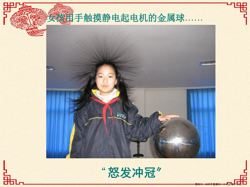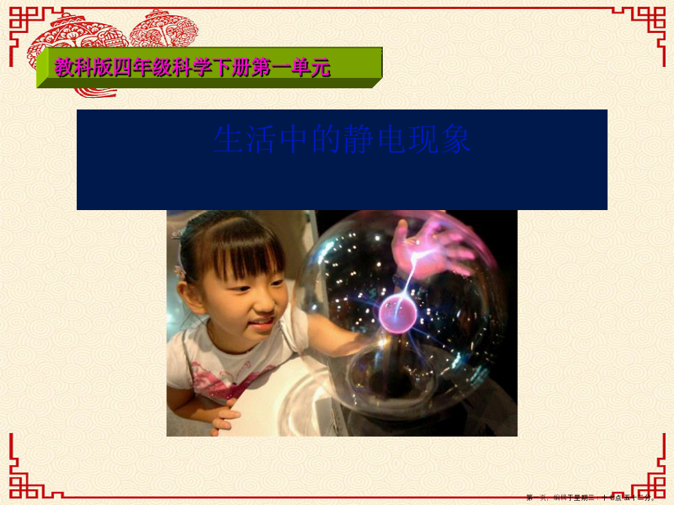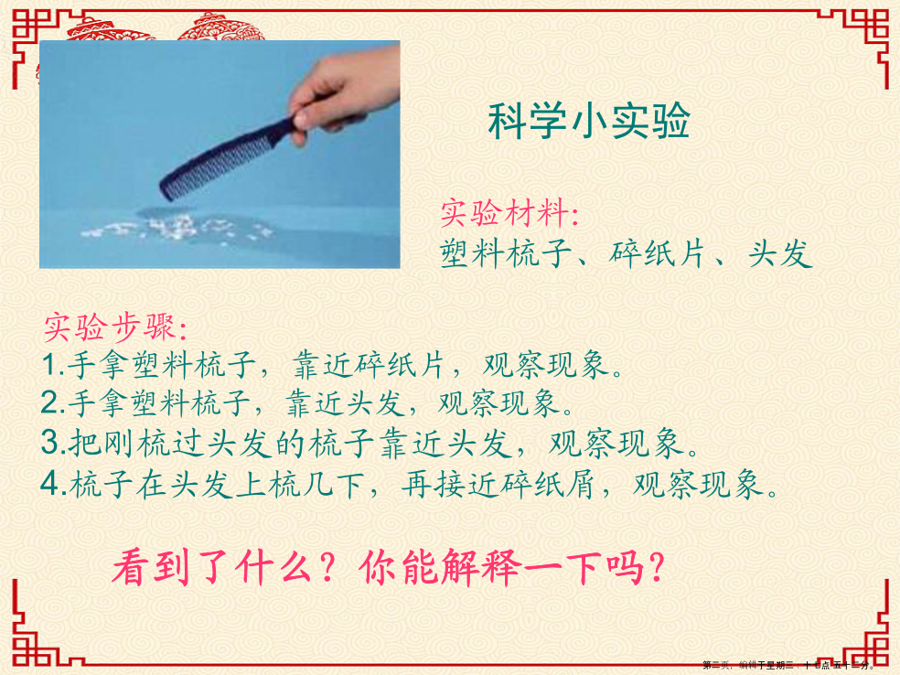 教科版四年级科学下册第一单元科学小实验第三页,编辑于星期三:十七点五十二分。第四页,编辑于星期三:十七点五十二分。“怒发冲冠〞生活中的静电现象随处可见。 静电存在于我们周围的一切物质之中,包括人类在内的生物和非生物。尺子探究活动:摩擦起电不一样的电荷——正电荷和负电荷梳理后的头发带负电荷活动一: 用充气的气球和头发摩擦后分开,再用经过摩擦的气球的一侧去靠近头发,观察现象。活动活动一: 用充气的气球和头发摩擦后分开,再用经过摩擦的气球的一侧去靠近头发,观察现象。活动二:两个摩擦后的物体,有时相互吸引,有时互相排斥。 这跟我们前面所学的磁铁性质极其相似。第十六页,编辑于星期三:十七点五十二分。让电荷流动起来形成电流,需要具备两个条件:电路用电器课外延伸: 1、油罐车为什么会有一条尾巴? 2、避雷针怎样避雷?2、静电的防止雷暴来临时留在室内比处于室外平安;留在有防雷设施的室内比无防雷设施的室内平安;站立于屋顶最不平安。 雷暴来临时当你处于空旷的田野或开阔地带时,应尽快找有防雷设施的地方躲避;如果当时找不到躲避的地方,切记:处于低矮的地方比突出的高地更平安。不能在山顶、山脊、田埂、土堆上行走或肩扛长形工具和物件,不能靠近孤立的高大树木和烟囱类建筑物。如何防止和消除静电呢?关键要保持周围环境的湿度,并尽量减少易引发静电的因素。 一、室内要保持一定的湿度。房间里要勤拖地、勤洒些水,或使用空气加湿器增加湿度。 二、要勤洗澡、勤换衣服,以消除人体外表积聚的静电荷。 三、少穿皮、毛和化纤质地的衣物,特别是老年人,应尽量穿柔软、光滑的棉纺织或丝织衣物。 四、平时多喝水、勤洗脸、洗手,发现头发无法梳理时,将梳子浸湿消除静电后再梳理头发。 五、脱衣后和接触金属用品前,先用手摸一下墙壁,将身体上的静电释放出去。第二十四页,编辑于星期三:十七点五十二分。第二十五页,编辑于星期三:十七点五十二分。 一、填空题 1、静电存在于所有物质中,物质同时具有〔〕种电荷,分别是〔〕电荷和〔〕电荷。 2、在用塑料梳子梳理枯燥头发的时候,梳子带〔负〕电荷,头发带〔正〕电荷,当梳子和头发靠近的时候,会发生相互〔吸引〕的现象。 二、选择题 1、以下属于静电现象的是〔〕。 A、打雷时闪电B、手电筒使用的电池 C、脱毛衣时的啪啪声D、以上都不是 2、將这两个带负电的小球相互靠近,出现的现象是〔〕 A、相互远离B、相互靠近C、先远离再靠近D、先靠近再远离 3、將两个小球用棉线拴在一个小木尺上,出现了相互吸引的情况,由此实验 现象可知,两个小球所带的电荷是〔〕 A、同种电荷B、异种电荷C、可能是同种电荷,也可能是异种电荷。 4、假设用另外两个小球用上题的方法做实验,出现了相互排斥的情况,由此可知这两个小球所带的电荷〔〕 A、同种电荷B、异种电荷C、可能是同种电荷,也可能是异种电荷