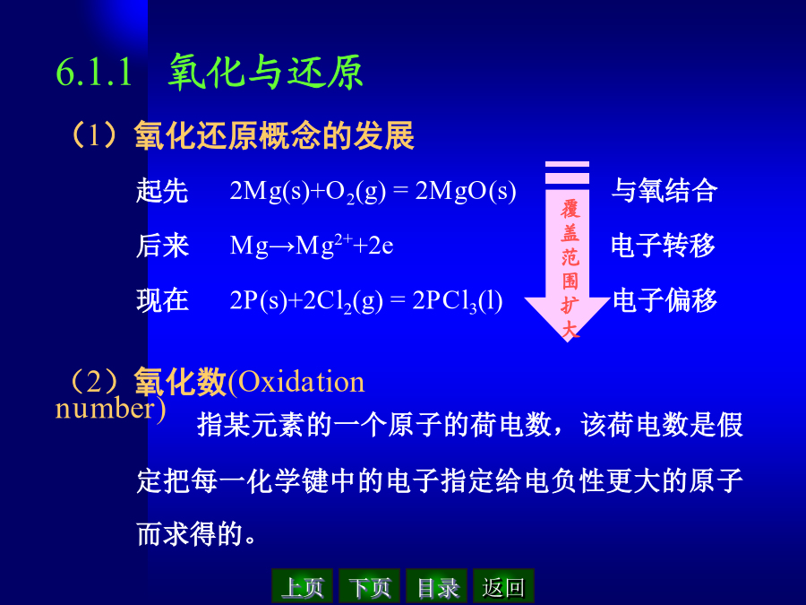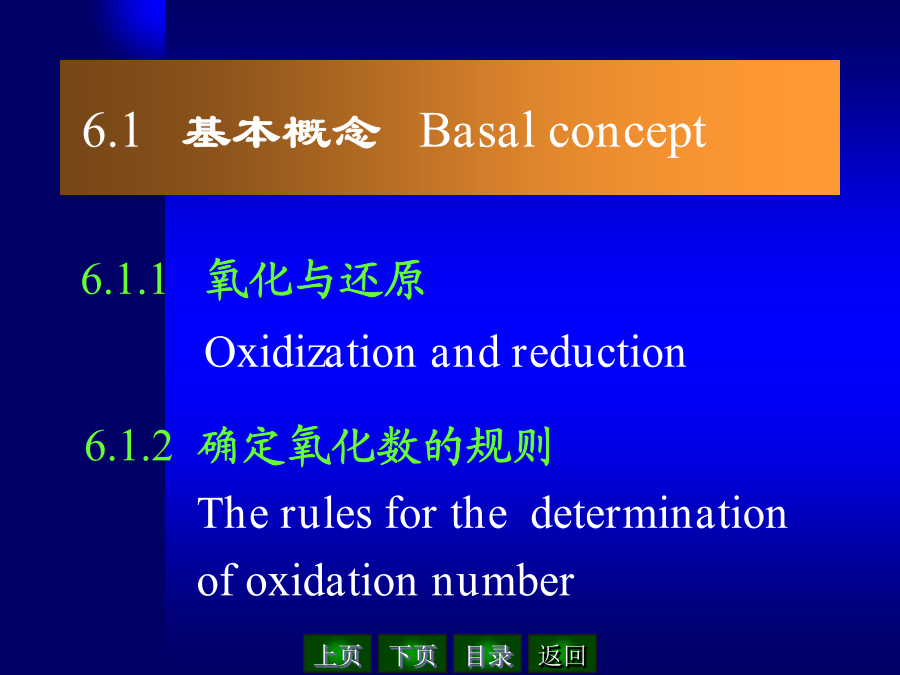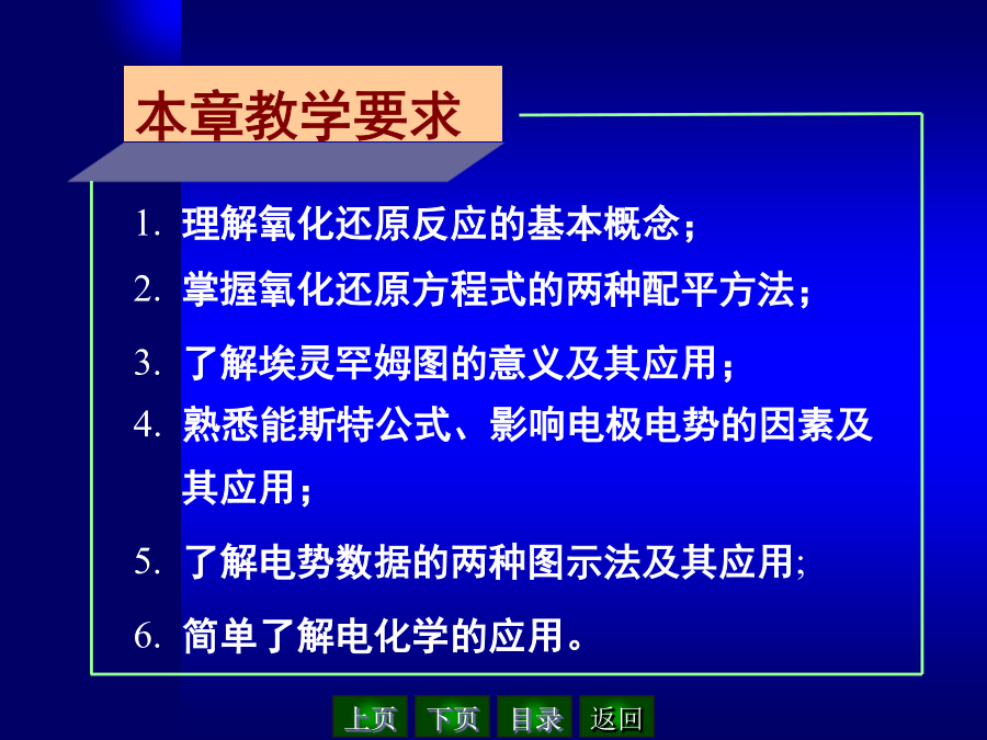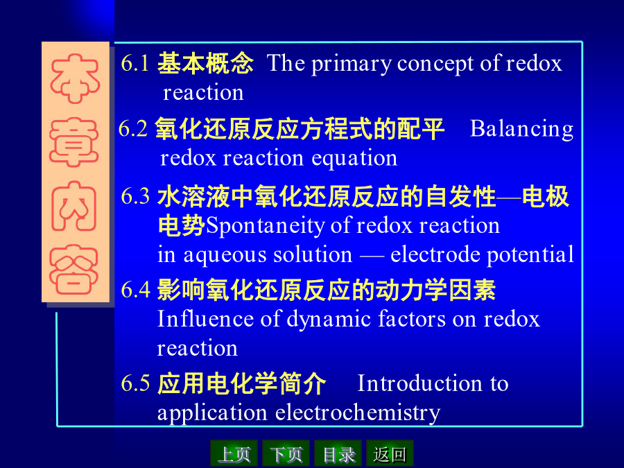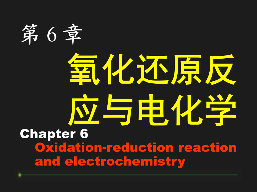 Oxidation-reductionreactionandelectrochemistry1.理解氧化还原反应的基本概念;6.1基本概念Theprimaryconceptofredox reaction起先2Mg(s)+O2(g)=2MgO(s)与氧结合 后来Mg→Mg2++2e电子转移 现在2P(s)+2Cl2(g)=2PCl3(l)电子偏移氧化(oxidation):氧化数增加的过程 还原(reduction):氧化数降低的过程什么是“氧化数”? 它与“化合价”有否区别?6.1.2确定氧化数的规则4.卤化物中卤素原子的氧化数为-1。Solution整个反应被氧化的元素氧化值的升高总数与被还原的元素氧化值的降低总数相等。●计算相关原子氧化值上升和下降的数值。例如,本例 中Cl原子氧化数下降值为6[(-1)-(+5)],4个P原子 氧化数上升值为20{[(+5)-0]×4}。用氧化值法配平氯酸与磷作用 生成氯化氢和磷酸的反应。配平铜与稀硝酸反应的方程式: Cu+HNO3→Cu(NO3)2+NO在酸性介质中铋酸钠可将MnSO4氧化为NaMnO4,写出配平了的离子方程式。酸性介质: 多n个O加2n个H+,另一边加n个H2O6.2.2半反应法(离子—电子法)●电荷守恒:得失电子数相等 ●质量守恒:反应前后各元素原子总数相等用半反应法配平下列反应方程式SolutionSolution用半反应法配平方程式Solution6.3.2标准电极电势 Standardelectrodepotential6.3.1电化学电池与氧化还原反应(1)铜锌原电池(Acopper-zinccell)(2)氧化还原电对(Redoxcouple)作用: ●让溶液始终保持电中性,使电极反应得以继续进行 ●消除原电池中的液接电势(或扩散电势)M活泼:溶解>沉积(5)电极类型(Thevarioustypesofelectrodes)●金属-金属难溶盐电极(6)原电池的表示法(Thenotationofgalvaniccell)6.3.2标准电极电势事实上,标准电极电势的绝对值是无法测定的。于是建立了标准氢电极。(3)甘汞电极(4)标准电极电势的测定●表中电对按Eθ(Ox/Red)代数值由大到小的顺序排列。 Eθ(Ox/Red)代数值越大,正向半反应进行的倾向 越大,即氧化型的氧化性越强;Eθ(Ox/Red)代数 值越小,正向半反应进行的倾向越小,或者说逆向半 反应进行的倾向越大,即还原型的还原性越强。上 表中的最强氧化剂和还原剂分别为F2和K。●一些电对的Eq与介质的酸碱性有关,因此有表和 表之分。通过计算,判断标准态条件下反应Pb2+(aq)+Sn(s)Sn2+(aq)+Pb(s) 进行的方向。6.3.3浓度对电势的影响Solution(1)浓度对电池电动势的影响Au(s)与Cl2(g)在水溶液中的反应方程式为:2Au+3Cl22Au3++6Cl-1)Eθ池=Eθ(Cl2/Cl-)-Eθ(Au3+/Au) =(+1.36V)-(+1.42V) =-0.06V电化学电池达到平衡时电池不再产生电流(E池=0V),对实用电化学电池而言,平衡状态则意味着电池耗尽.由于平衡状态下Q=Kθ,不难由能斯特方程式得到:判断13题中由金和氯气构成的电池反应进行的限度。(2)浓度对电极电势的影响用纯水代替构成标准氢电极的酸性水溶液,试计算该氢电极的电极电势。(3)电极电势与溶液pH的关系计算pH等于(a)1.00,(b)2.00,(c)3.00的酸性水溶液中氢电极的电极电势。Solution影响电极电势的因素还有哪些?沉淀的生成对电极电势的影响Solution氧化型形成配合物,Eq↓还原型形成配合物, Eq↑氧化型和还原型都形成配合物,看两者的相 对大小。Solution(4)浓差电池(Concentrationcell)如果上面那个电池表达式中的x值 等于(a)1.0×10-1,(b)1.0×10-2,(c) 1.0×10-3,试计算三种氢电极分别与标准氢电极构成的 浓差电池的电动势。(1)确定金属的活动性顺序 (2)计算原电池的电动势 (3)判断氧化剂和还原剂的相对强弱 (4)判断氧化还原反应进行的方向 (5)选择合适的氧化剂和还原剂 (6)判断氧化还原反应进行的次序 (7)求平衡常数 (8)求溶度积常数 (9)估计反应进行的程度 (10)求溶液的pH (11)配平氧化还原反应方程式(1)确定金属的活动性顺序(2)计算原电池的电动势(3)判断氧化剂和还原剂的相对强弱Solution有一含有Cl-、Br-、I-的混合溶液,欲使I-氧化为I2,而Br-和Cl-不发生变化。在常用的氧化剂H2O2、Fe2(SO4)3和KMnO4中选择哪一种合适?即:一种氧化剂可以氧化几种还原剂时,首