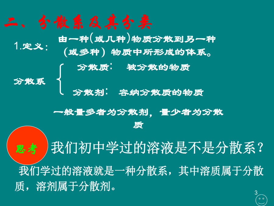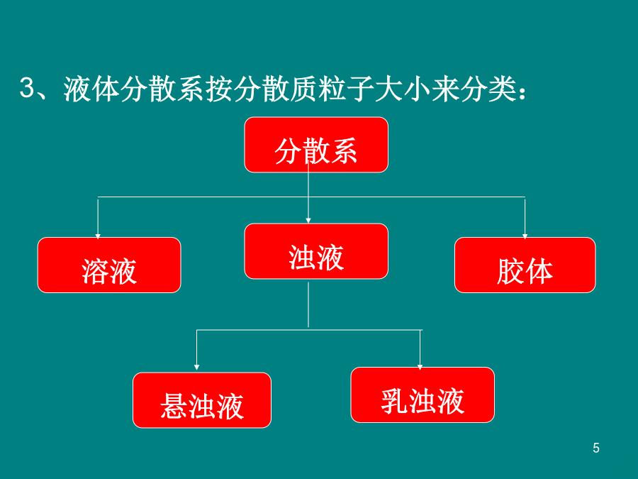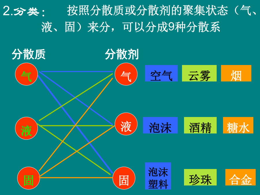 物质的分类(2)二、分散系及其分类我们初中学过的溶液是不是分散系?固分散系三种分散系的比较想一想氢氧化铁胶体的制备★注意:①加热至溶液呈红褐色后停止加热 (2)胶体性质光线透过树叶间的缝隙射入密林中放电影时放影室射到银幕上的光柱将胶体和泥水分别进行过滤,观察并纪录实验现象胶体的性质除了丁达尔现象之外,还有哪些性质呢?②布朗运动:③电泳——电泳胶体具有介稳定性的原因:④胶体聚沉胶体的分类固溶胶雾常见胶体及其应用随堂自测: 1、FeCl3溶液与Fe(OH)3胶体具有的共同性质是() A、分散质颗粒直径都在1nm~100nm之间 B、都具有丁达尔效应 C、都能透过滤纸 D、都呈红褐色2、胶体最本质的性质是() A、胶体具有丁达尔效应 B、胶粒能作布朗运动 C、胶粒能电泳 D、胶体粒子直径是10-7~10-5cm3、鉴别FeCl3溶液和Fe(OH)3胶体用();分离Fe(OH)3胶体和悬浊液用()方法。 4、当光束通过下列分散系时,可能产生丁达尔效应的是() A、NaCl溶液B、Fe(OH)3胶体 C、盐酸D、豆浆 1.溶液、胶体和浊液这三种分散系的根本区别是() A.是否为大量分子或离子的集合体 B.分散质微粒直径的大小 C.能否透过滤纸 D.是否均一、稳定、透明 2.下列分散系属于胶体的是() ①肥皂水②豆浆③食盐水 ④蔗糖水⑤泥水⑥淀粉溶液 A.只有②B.①②③ C.①②⑥D.①②③④⑥ 3.在氢氧化铁胶体中逐滴滴入一种液体,初滴入时氢 氧化铁胶体发生凝聚而沉淀,继续滴入,沉淀消失则这 种溶液应是()。 A.0.5mol/L硫酸镁B.蒸馏水 C.0.5mol/L氯化钾溶液D.0.5mol/L盐酸