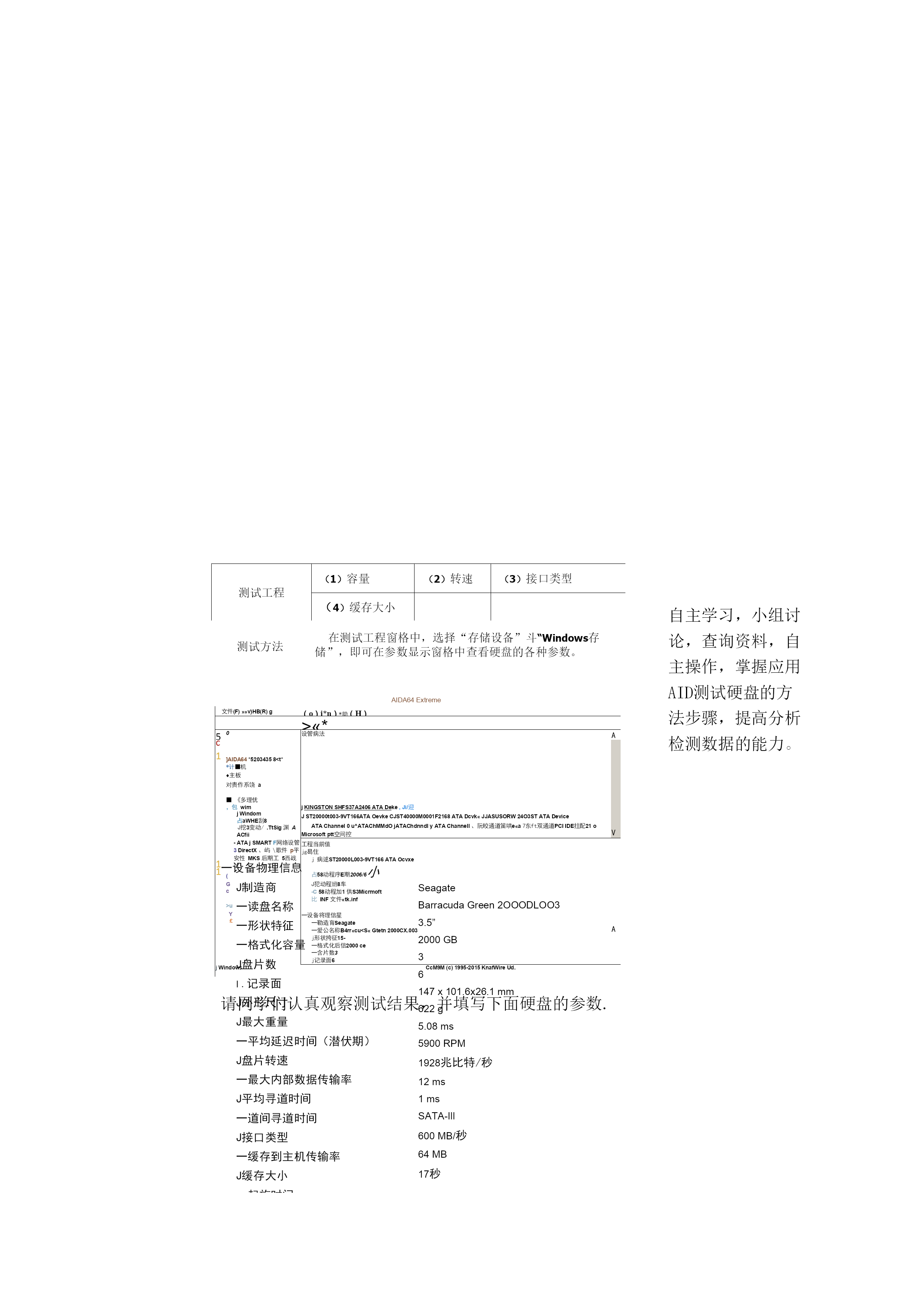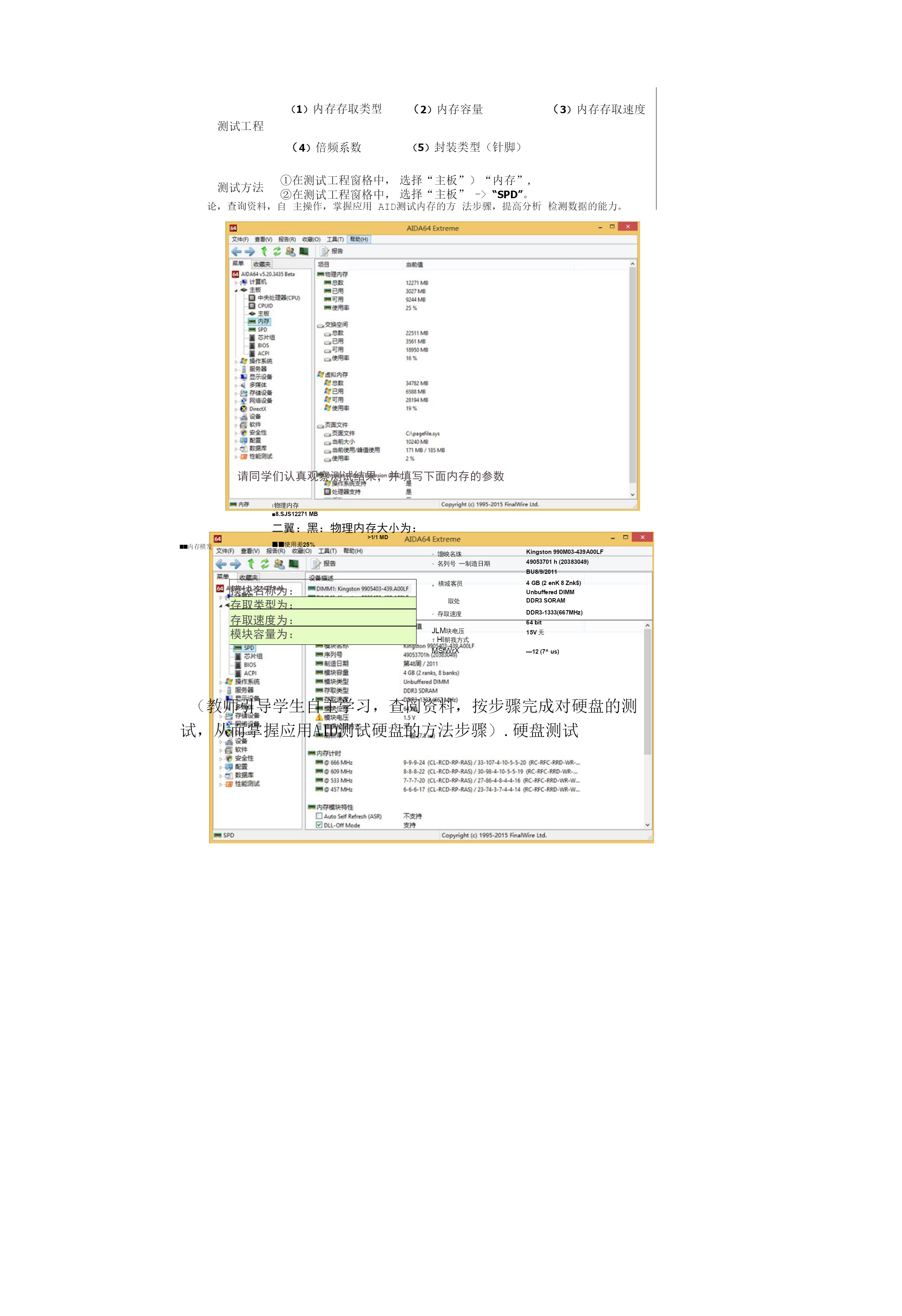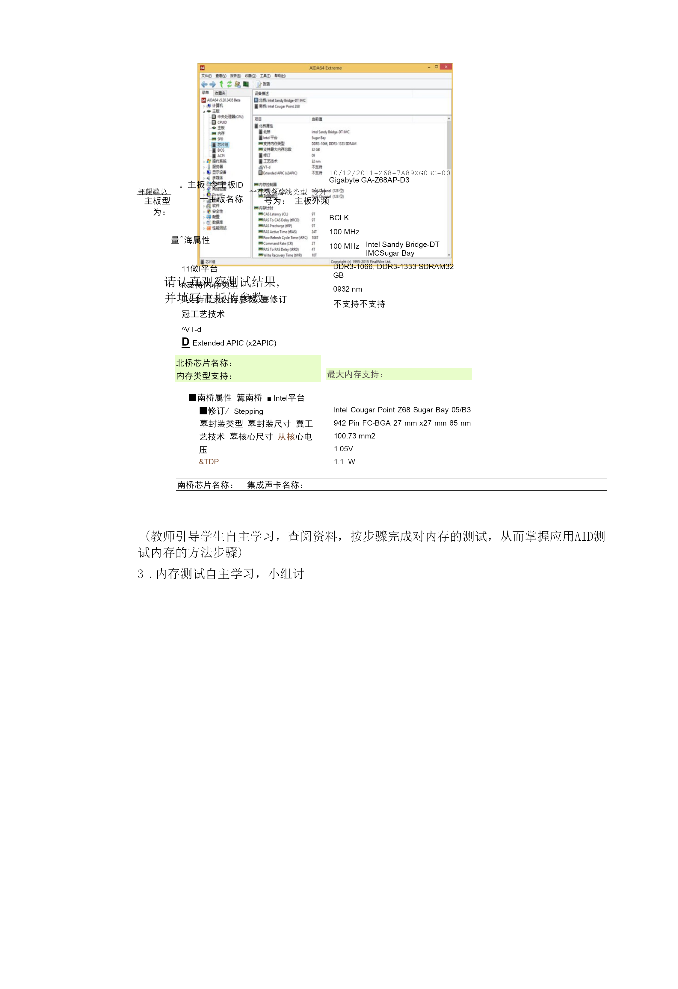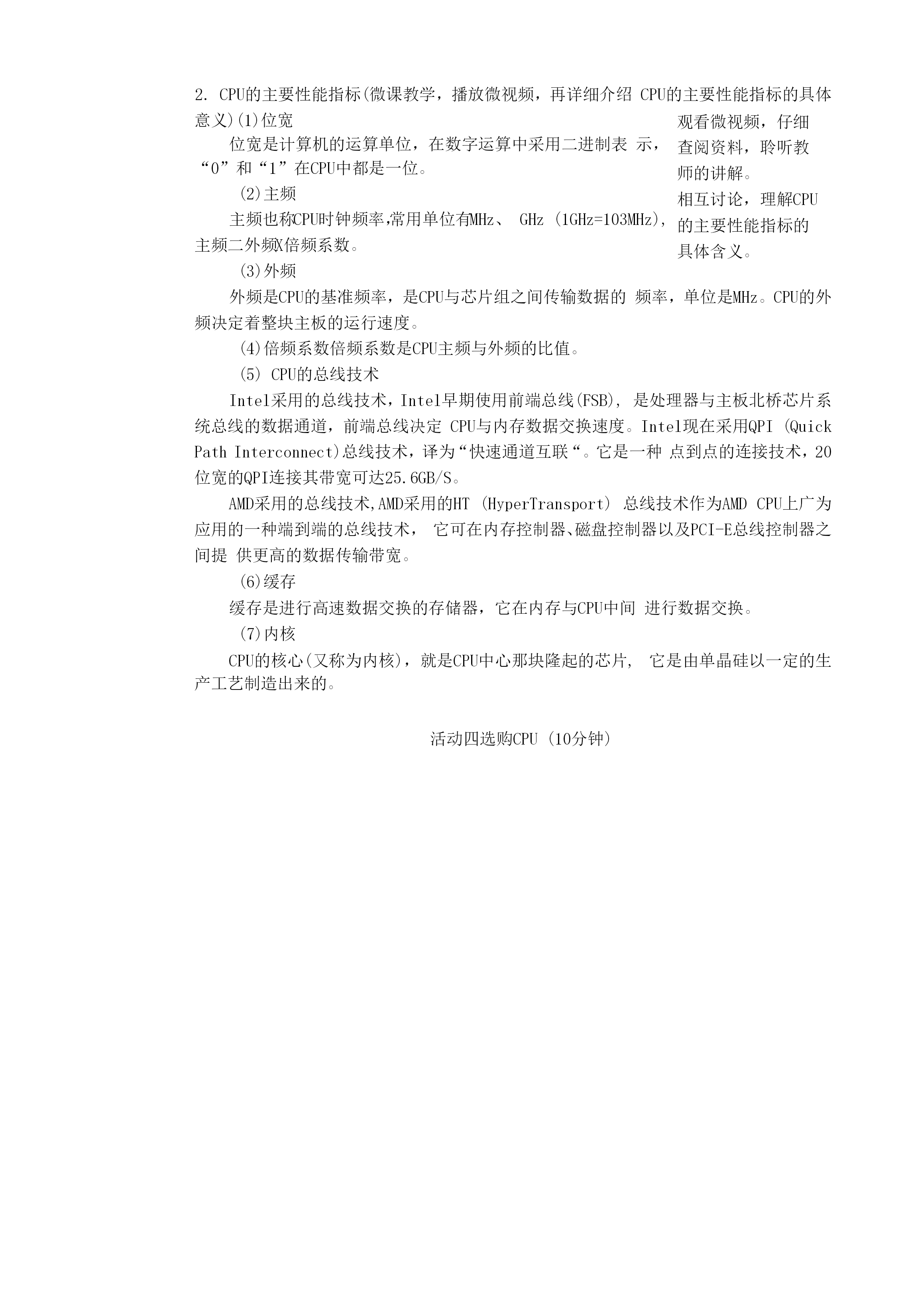 《计算机组装与维护》教案教学设计 课题认识计算机的组成课型理论班级教师课时2教学分析教材分析教师备课时填写学情分析教师备课时填写教学目标知识.识别和识别计算机各软硬件 .认识计算机系统的组成技能.正确描述计算机系统的软硬件组成 .识别和识别计算机各软硬件素养.通过分小组训练,相互操作学习,培养学生合作意识 .培养学生认识事物的建构主义科学观教学重点正确描述计算机系统的软硬件组成;识别和识别计算机各软硬件教学难点正确描述计算机系统的软硬件组成;计算机系统各组成局部的层次关系教学方法任务驱动、讲授法、讲练结合教学环境软件环境:Win7及以上操作系统,PowerPoint 硬件环境:多媒体教室或软件实训室,计算机或智能手机 教学资源:PPT教学反思教师课后填写 观看微视频,仔细查阅资料,聆听教师的讲解。 相互讨论,理解CPU的主要性能指标的具体含义。 2.CPU的主要性能指标(微课教学,播放微视频,再详细介绍CPU的主要性能指标的具体意义)(1)位宽 位宽是计算机的运算单位,在数字运算中采用二进制表示,“0”和“1”在CPU中都是一位。 (2)主频 主频也称CPU时钟频率,常用单位有MHz、GHz(1GHz=103MHz),主频二外频X倍频系数。 (3)外频 外频是CPU的基准频率,是CPU与芯片组之间传输数据的频率,单位是MHz。CPU的外频决定着整块主板的运行速度。 (4)倍频系数倍频系数是CPU主频与外频的比值。 (5)CPU的总线技术 Intel采用的总线技术,Intel早期使用前端总线(FSB),是处理器与主板北桥芯片系统总线的数据通道,前端总线决定CPU与内存数据交换速度。Intel现在采用QPI(QuickPathInterconnect)总线技术,译为“快速通道互联“。它是一种点到点的连接技术,20位宽的QPI连接其带宽可达25.6GB/S。 AMD采用的总线技术,AMD采用的HT(HyperTransport)总线技术作为AMDCPU上广为应用的一种端到端的总线技术,它可在内存控制器、磁盘控制器以及PCI-E总线控制器之间提供更高的数据传输带宽。 (6)缓存 缓存是进行高速数据交换的存储器,它在内存与CPU中间进行数据交换。 (7)内核 CPU的核心(又称为内核),就是CPU中心那块隆起的芯片,它是由单晶硅以一定的生产工艺制造出来的。 活动四选购CPU(10分钟)请认真观察测试结果,并填写主板的参数 。主板令主板ID一主板名称 10/12/2011-Z68-7A89XG0BC-00 GigabyteGA-Z68AP-D3BCLK 100MHz 100MHz 一前端总^^生令总线类型令外部频率一有效频率 主板型号为:主板外频为:量^海属性 11做I平台 R支持内存类型 I支持最大内存总数塞修订冠工艺技术 ^VT-d DExtendedAPIC(x2APIC) IntelSandyBridge-DTIMCSugarBay DDR3-1066,DDR3-1333SDRAM32GB 0932nm 不支持不支持 北桥芯片名称: 内存类型支持: ■南桥属性篝南桥■Intel平台 ■修订/Stepping 墓封装类型墓封装尺寸翼工艺技术墓核心尺寸从核心电压 &TDP 最大内存支持: IntelCougarPointZ68SugarBay05/B3942PinFC-BGA27mmx27mm65nm100.73mm2 1.05V W南桥芯片名称:集成声卡名称: (教师引导学生自主学习,查阅资料,按步骤完成对内存的测试,从而掌握应用AID测试内存的方法步骤) .内存测试自主学习,小组讨测试工程(1)内存存取类型(2)内存容量(3)内存存取速度(4)倍频系数(5)封装类型(针脚)测试方法①在测试工程窗格中,②在测试工程窗格中,选择“主板”)“内存”,选择“主板”->“SPD”。论,查询资料,自主操作,掌握应用AID测试内存的方法步骤,提高分析检测数据的能力。 请同学们认真观察测试结果,并填写下面内存的参数 ।物理内存■8.SJS12271MB二翼:黑:物理内存大小为: >1/1MD■■使用差25%■■内存横发 ・馒映名珠 ・名列号一制造日期Kingston990M03-439A00LF49053701h(20383049)BU8/9/2011模块名称为:,横城客员4GB(2enK8Znk$)UnbufferedDIMM存取类型为:取处DDR3SORAM存取速度为:・存取速度DDR3-1333(667MHz) 64bit模块容量为:JLM块电压 1HI朝我方式15V无MSfWrX—12(7^us) (教师引导学生自主学习,查阅资料,按步骤完成对硬盘的测试,从而掌握应