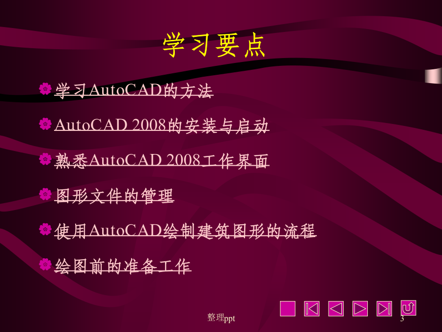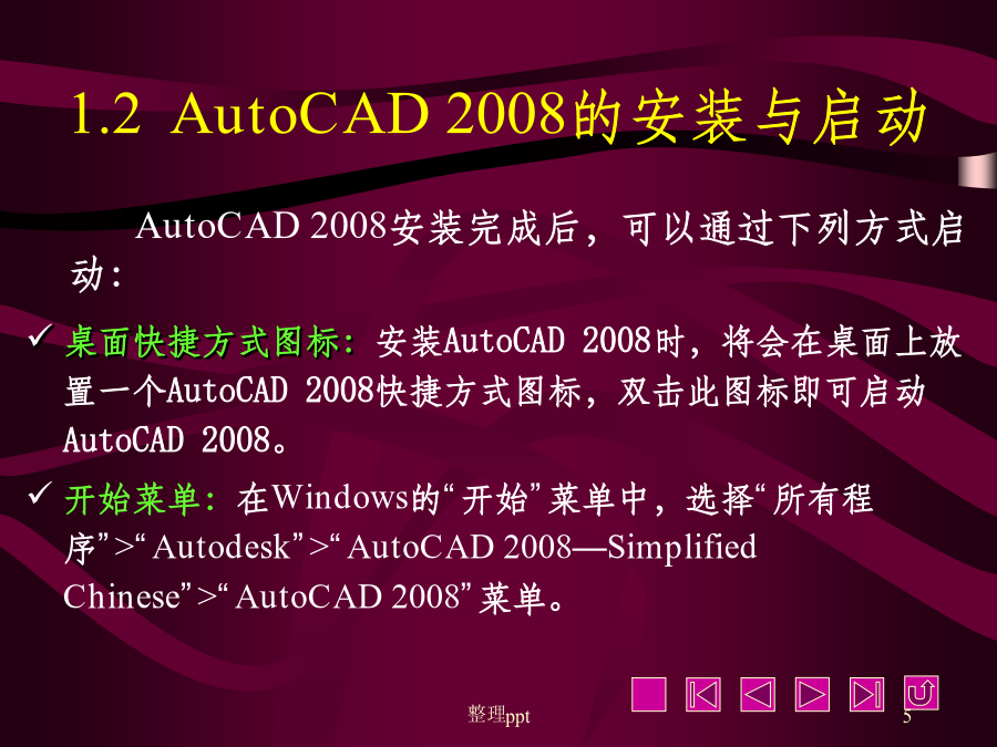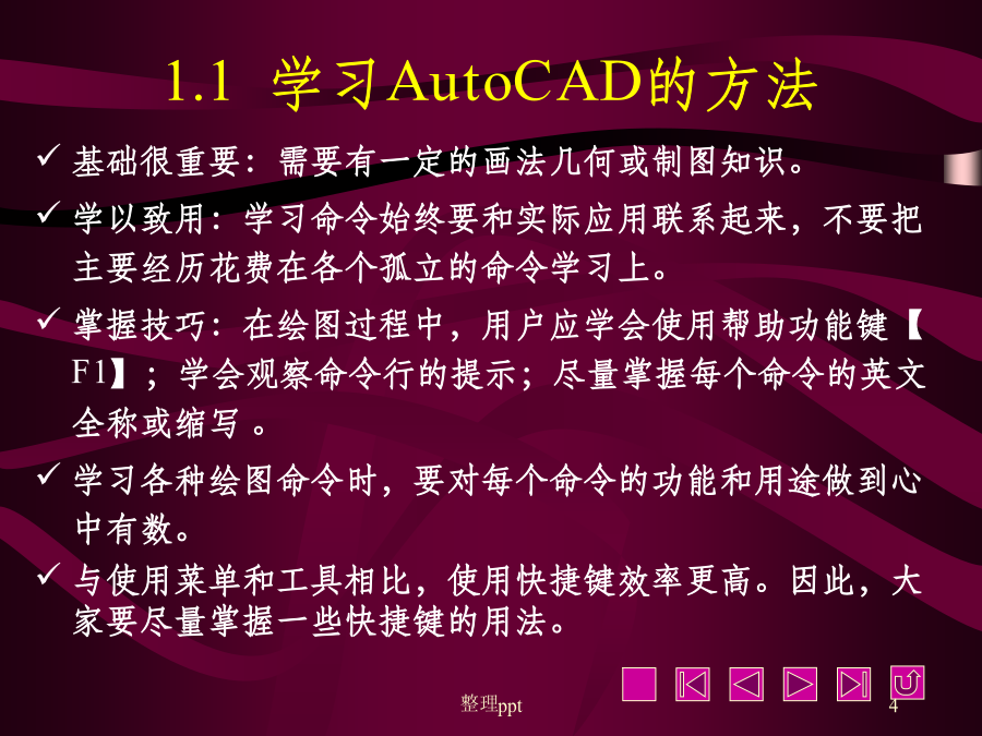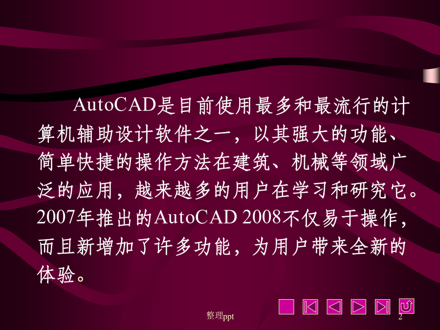 AutoCAD是目前使用最多和最流行的计算机辅助设计软件之一,以其强大的功能、简单快捷的操作方法在建筑、机械等领域广泛的应用,越来越多的用户在学习和研究它。2007年推出的AutoCAD2008不仅易于操作,而且新增加了许多功能,为用户带来全新的体验。学习要点1.1学习AutoCAD的方法1.2AutoCAD2008的安装与启动1.3熟悉AutoCAD2008工作界面1.3.1标题栏1.3.2菜单栏与快捷菜单除菜单栏外,在绘图区域、工具栏、状态栏等位置单击鼠标右键,还将弹出相应的快捷菜单。快捷菜单的内容取决于光标所在位置,以及当前操作状态,使用它们可以快速地完成某些操作,如下图所示。1.3.3工具栏和面板2.面板单击控制面板图标,将显示与该控制面板功能相关的滑出面板,或打开与其功能相关的工具选项板。如果要隐藏某个控制面板,可以在该控制面板所在区域单击鼠标右键,然后从弹出的快捷菜单中选择“隐藏”。另外,选择“控制台”菜单下的面板名也可显示或隐藏某个控制面板。如需隐藏面板,可单击面板窗口左上角的的按钮。隐藏面板后,面板将收缩为一个控制条。以后要显示面板,只需将光标移至该控制条所在区域即可。1.3.4绘图窗口与坐标系1.3.5命令行与文本窗口1.3.6状态栏1.3.7工具选项板二维草图与注释:启动AutoCAD2008,系统将自动进入“二维草图与注释”工作空间,此时在绘图区上方显示了“工作空间”和“标准注释”工具栏,在绘图区右侧显示了二维操作面板。 三维建模:此时在绘图区上方显示了“工作空间”、“标准”和“图层”工具栏,在绘图区右侧显示了三维操作面板和工具选项板。AutoCAD经典:显示AutoCAD经典界面,此时在绘图区上方显示了“标准”、“样式”、“工作空间”、“图层”和“特性”工具栏,在绘图区左侧显示了“绘图”工具栏,在绘图区右侧显示了工具选项板和“修改”工具栏。1.4图形文件的管理1.5使用AutoCAD绘制建筑图形的流程使用AutoCAD画图的两种方式1.6绘图前准备因此,图层是组织图形的有效手段。通过合理划分图层,可以使图形的信息清晰、有序,图形输出方便快捷,在下表中给出了常用的图层设置。在AutoCAD中,利用“图层”工具栏中的“图层控制”下拉列表中的特性图标可控制图层的打开/关闭、锁定/解锁等状态,如下图所示。下面是国标中对制图的其他一些规定。