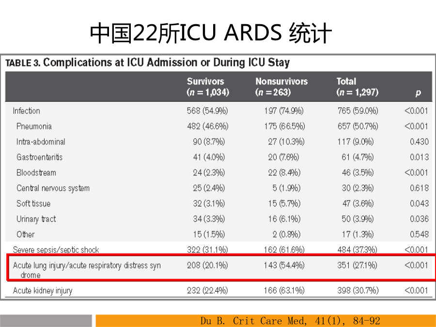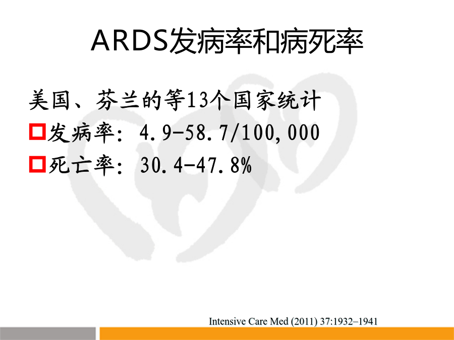 ARDS诊断与治疗ARDS的概念ARDS发病率和病死率中国22所ICUARDS统计1994年AECC诊断标准2012ARDS(柏林)诊断标准4个临床数据库的数据分析显示柏林标准对患者预后有更好的预测效度比较ARDS分级与尸解病理结果的关系患者一般情况结果(1)结果(2)小结ARDS的治疗ARDS常见病因重症CAP的经验性抗生素选择呼吸机相关性肺炎常见致病菌与初始抗感染治疗ARDS呼吸支持肺保护策略对ARDS临床疗效的荟萃分析肺保护通气策略小潮气量与控制平台压肺复张策略PEEP—肺复张与低氧血症改善RM常用的方法28293031RM时机的选择RM对不同病因ARDS的疗效肺复张的并发症肺复张小结俯卧位通气俯卧位能够明显降低严重ARDS患者的28天死亡率仰卧位组和俯卧位组第90天患者生存率散点图,结果提示俯卧位组患者的生存率明显高于仰卧位组,差异具有统计学意义(P<0.001)。研究结论俯卧位通气时机俯卧位通气持续时间俯卧位通气的禁忌症俯卧位通气并发症俯卧位通气小结高频振荡通气与传统通气生存率比较高频振荡通气与传统通气生存率比较两个研究的结论关于高频振荡通气(HFOV)的小结ECMO治疗ARDSECMO的类型180人患者随机分组 新生儿(1993-95年)Lancet2009;374:1351–63ECMO在H1N1重大传染疾病中的应用ECMO的常见并发症ECMO适应症60结论呼吸支持治疗的展望如何合理选择(1)—ARDS规范治疗(六步法)如何合理的选择(2)合理应用各种措施改善ARDS生存率全文小结