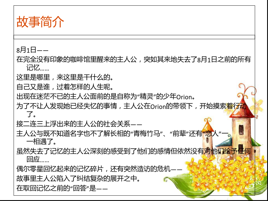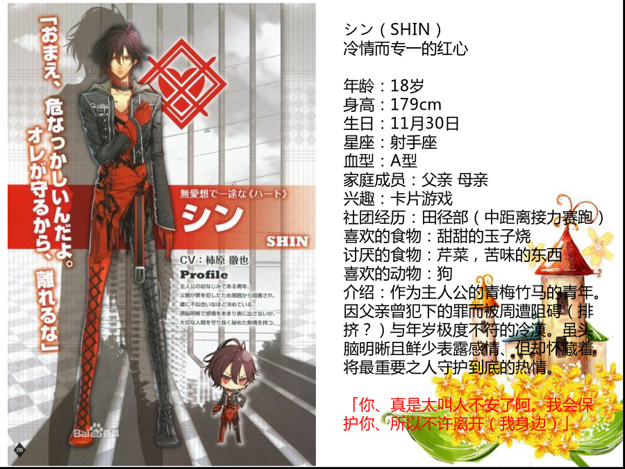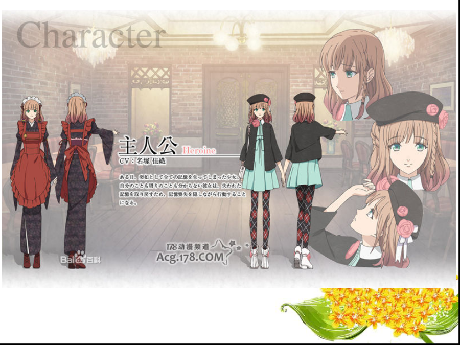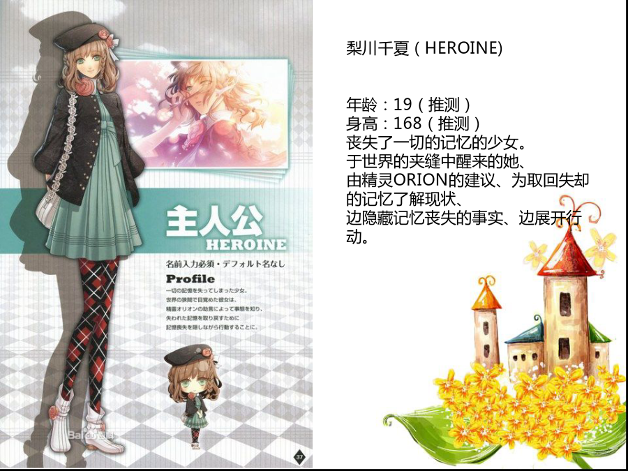 AMNESIA失忆症故事简介梨川千夏(HEROINE) 年龄:19(推测) 身高:168(推测) 丧失了一切的记忆的少女。 于世界的夹缝中醒来的她、 由精灵ORION的建议、为取回失却的记忆了解现状、 边隐藏记忆丧失的事实、边展开行动。シン(SHIN) 冷情而专一的红心 年龄:18岁 身高:179cm 生日:11月30日 星座:射手座 血型:A型 家庭成员:父亲母亲 兴趣:卡片游戏 社团经历:田径部(中距离接力赛跑) 喜欢的食物:甜甜的玉子烧 讨厌的食物:芹菜,苦味的东西 喜欢的动物:狗 介绍:作为主人公的青梅竹马的青年。因父亲曾犯下的罪而被周遭阻碍(排挤?)与年岁极度不符的冷漠。虽头脑明晰且鲜少表露感情、但却怀藏着将最重要之人守护到底的热情。 「你、真是太叫人不安了阿。我会保护你、所以不许离开(我身边)」ケント(KENT) COOL而合理的四叶草 年龄:25岁 身高:190cm 生日:9月23日 星座:天秤座 血型:B型 家庭成员:父亲母亲 兴趣:出数学题观察 社团经历:无 喜欢的食物:浓菜汤 讨厌的食物:螃蟹栗 喜欢的动物:全部(就观察的角度来讲) 介绍:常以俯视的视线看待物事、不通人情的数学课的大学院生(即修士或博士)。将周遭的人作为观察对象的他因与主人公的接触、而欲要观察与恋爱一同滋长的感情。 「我、好像正怀抱着酷似被称之为恋爱那样的感情」トーマ(TOMA) 慈爱与疯狂的方块 年龄:20岁 身高:181cm 生日:4月12日 星座:白羊座 血型:B型 家庭成员:父亲母亲 兴趣:篮球骑自行车上网电视游戏读书料理 社团经历:足球部广播社弓道部新闻部 喜欢的食物:辣的都喜欢 讨厌的食物:生的水果都讨厌 喜欢的动物:人类 介绍:主人公的青梅竹马、兄长般的存在。欲要守护被置身于危险中的主人公。怜爱着恋慕自己的主人公、虽然怀有想要保护她到底的情感、可这亦同时成为其精神不安定的原因。 「假如觉得害怕、就叫我罢。我会保护你的」ウキョウ(UKYO) 被谜团包围小丑 年龄:24岁 身高:185cm 生日:3月3日 星座:双鱼座 血型:O型 兴趣(表):喜欢收集有奇怪花纹的内裤练习发型和人说话 兴趣(里):打扫洗衣服和人说话 社团经历:铁人三项部草裙舞部足球部曲棍球部橄榄球部卡巴迪部舞蹈部美术部骑马部辩论部(还参加了其它15个社团) 喜欢的食物(表):能吃的话什么都行 喜欢的食物(里):果冻·布丁系 讨厌的食物(表):并没有特别讨厌的 讨厌的食物(里):生鸡蛋牛蒡海苔 喜欢的动物:什么都喜欢(但是会被讨厌) 介绍:于主人公的面前突如其来现身的迷之青年。因不可解的言行而使主人困惑。虽然也有保护主人公的时候、但亦有转身一变就展露险恶表情之事。归根结蒂、他的真面目究竟是…… 「虽不记得已与你几度相遇、几度分离但我现在、即便是现在也依然爱着你唷」オりオン(ORION) 支援着主人公的精灵 介绍:从其他世界而来的精灵。在来到人类世界的途中、不意与主人公的意识体冲撞并造成女主人公的失忆状态,对此似乎很愧疚。被囚闭在主人公心中的他、正试着取回她失却的记忆。 「从现在开始我与你不得不协力、取回你的记忆」サワ(SAWA)(左图上) 值得信赖的亲友 介绍:爽朗的性格的女大学生。似乎是之前主人公的好友。虽然多话却是值得信赖的存在、多少会关注主人公的事情。同时也是一起打工的伙伴。 ミネ(MINE)(左图下) 不好惹的后辈 介绍:主人公打工地打工的后辈。明白自己的可爱之处、发现美型就会卖弄风情的厉害的角色。但因毫不隐藏那种行为。似乎让人讨厌不起来。リカ(RIKA)(左图上) 危险之香的女人 介绍:穿着犹如贵妇人一样的迷之女子。醉心IKKI、主宰着他的FANCLUB。敌视接近IKKI的女性。似乎在暗地里活跃着什么。 ワカ(WAKA)(左图下) 打工处的店长 兴趣(推测):读书魔术狙击练习挥刀 喜欢的食物:并没有特别喜欢的 讨厌的食物:并没有特别讨厌的 喜欢的动物:不明 介绍:主人公打工地方的店长。虽是有着稳固???方针的经营者、却也有世俗的见风使舵??的性格。据主人公所去的不同世界性格亦有所不同。无比爱着店这一点却没有改变。父(FATHER)(左图左上) 关爱主人公的父亲 介绍:主人公之父。与主人公分开生活、时而通过电话交谈。虽因工作非常忙碌而无法见面、却很重视主人公。 オ一ナ一(OWNER)(左图右上) 打工店的持有者 介绍:外表可疑的主人公打工的店的OWNER。虽将店里的事交任给ワカ、有时却会为从业人员??????似乎对店怀有很强烈的感情。 イッキファン(IKKIFAN)(左图下) 时而暴走的危险的少女们 介绍:所属于IKKIFANCLUB的少女们。对IKKI过度执着、绝不饶恕妨碍者布置了各种找人麻烦的机关。AMNES