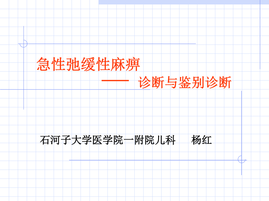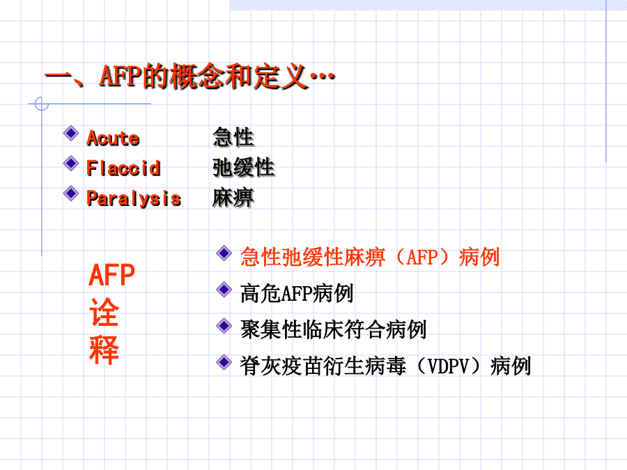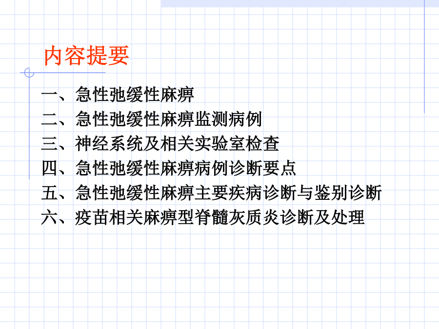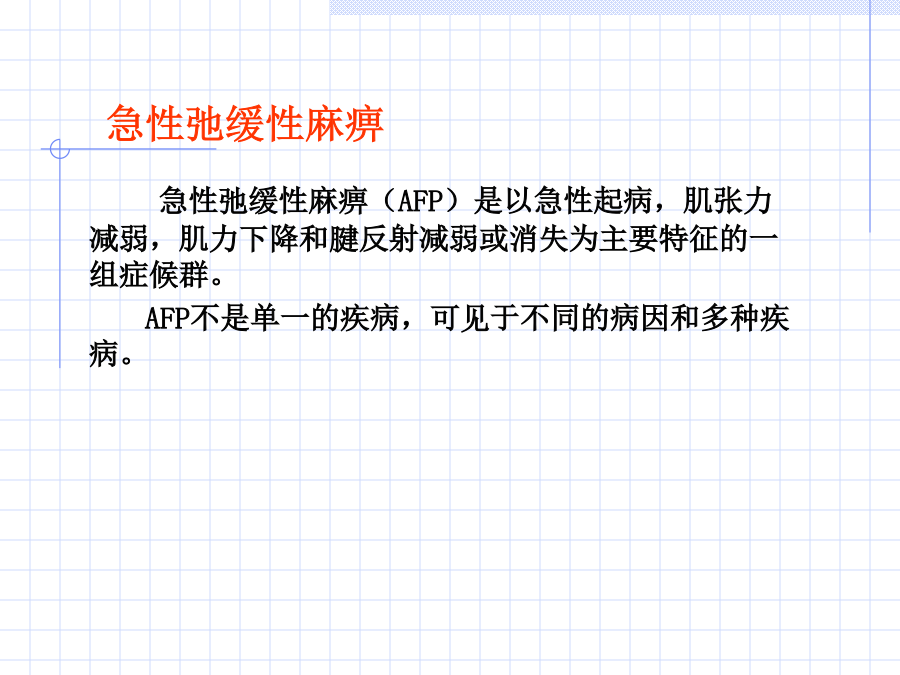 急性弛缓性麻痹——诊断与鉴别诊断内容提要AFP诠释急性弛缓性麻痹(AFP)是以急性起病,肌张力减弱,肌力下降和腱反射减弱或消失为主要特征的一组症候群。 AFP不是单一的疾病,可见于不同的病因和多种疾病。二、急性弛缓性麻痹监测病例概念监测疾监测疾病种类病种类7、单神经炎 8、神经丛炎 9、周期性麻痹(包括低钾软瘫,高钾软瘫,正常钾软瘫) 10、肌病(全身型重症肌无力,中毒性,原因不明性肌病) 11、急性多发性肌炎 12、肉毒中毒 13、四肢瘫,截瘫和单瘫(原因不明) 14、短暂性肢体麻痹 三、神经系统检查及相关实验检测神经系统的检查要点(一)运动检查1、肌萎缩2、肌张力3、肌力(二)感觉检查(三)反射检查(四)脑膜刺激征AFP实验室检测要点四、AFP病例诊断要点(一)详细可靠病史(二)区别真假麻痹和上下运动神经元麻痹损伤部位加强对脊髓休克的认识特别提示——对脊髓休克的认识五、急性弛缓性麻痹主要疾病诊断与鉴别诊断诊断与鉴别诊断要点脊髓灰质炎病毒属肠道病毒 (Poliovirusisanenterovirus,asmallRNAvirusthataffectsthecentralnervoussystem.) 脊髓灰质炎传染源和途径发病机制(PATHOGENESIS)全身淋巴组织中血液:第二次病毒血症前驱期病毒毒力多强血脑屏障CNS瘫痪前期NC受损轻NC受损重无瘫痪型瘫痪型瘫痪期(nonparalytictype)(paralytictype)脊髓灰质炎病理脊髓灰质炎分期临床分期脊髓灰质炎分期临床表现脊髓灰质炎分期临床表现脊髓灰质炎分期临床表现脊髓灰质炎分期临床表现根据病变部位,可分4型:脊髓型(spinalform)延髓型(bulbarform)脑型(encephaliticform)混合型(mixedform)颅神经运动神经核受损 (involvementofmotorcranialnervenuclei) 血管运动中枢受损 (involvementofvasomotorcenter) 呼吸中枢受损 (involvementofrespirationcenter)高热、烦躁不安、惊厥、昏迷 上运动神经元痉挛性瘫痪 脊髓灰质炎分期临床表现脊髓灰质炎分期临床表现脊髓灰质炎(麻痹型以脊髓型多见)Poliomyelitis,Indiamarina脑脊液检查 瘫痪前期:细胞-蛋白分离, 瘫痪期:蛋白—细胞分离 病毒分离 临床实用价值不大 实验室检查诊断治疗格林巴利综合症鉴别急性横贯性脊髓炎急性麻痹综合征六、疫苗相关麻痹型脊髓灰质炎的诊断处理VAPP均为散发,无季节和高峰地区分布。 WHO一项研究显示,服苗者中: 脊灰疫苗Ⅲ型所致VAPP最多。 接触者VAPPII型最多。VAPP发病机制的探讨 与疫苗株病毒的基因突变有关,导致毒力增强。在人肠道内复制的过程发生变异,一些变异可导致高水平神经毒力的回复,引起VAPP。VAPP次要诱因是: 在服用OPV后30天内进行臀肌注射(主要是抗生素)、1995年罗马尼亚一项研究表明在服用OPV后30天内多次进行抗生素注射更易引起VAPP。被称为诱发VAPP的次要因素。 VAPP(疫苗相关病例)的定义麻痹日期麻痹日期脊灰的临床经过1.降低和预防VAPP发生率的策略 采用灭活脊灰病毒疫苗(IPV)与脊髓灰质炎减毒活疫苗(OPV)联合免疫策略,新疫苗的研制等, 目前存有争论,世界某些先进国家,多年无脊灰流行,如美国、加拿大等国已用IPV做为儿童常规免疫。 认真询问病史和查体,严格控制OPV接种的禁忌症, 降低VAPP发生,OPV服用后一月内避免臂肌注射。 非特异性预防措施。定义:异常反应是指合格的疫苗在实施规范接种过程后,造成受种者机体组织器官功能损害,相关各方面均无过错不良反应,任何医疗单位或个人均不得做出预防接种异常反应诊断。 根据卫生部文件要求: 各级医疗机构在治疗过程中凡遇到急性弛缓性麻痹症状的病例,必须诊断慎重,在不能明确病因情况下,均作为“急性弛缓性麻痹(原因待查)”诊断,不应做出“类脊灰”和脊灰(原因待查)等其他诊断。 卫生部文件卫疾控发[2006]269号VAPP治疗与康复 VAPP无特效治疗法,临床多以对症,针灸,按摩等康复治疗措施,后遗症可选用矫形手术。每年12月5日和6日和次年1月5日和6日 为消灭脊髓灰质炎强化免疫活动日; 在强化活动日里,对所有4岁以下的儿童 实施脊髓灰质炎口服疫苗的普服每年12月5日和6日和次年1月5日和6日 为消灭脊髓灰质炎强化免疫活动日; 在强化活动日里,对所有4岁以下的儿童 实施脊髓灰质炎口服疫苗的普服