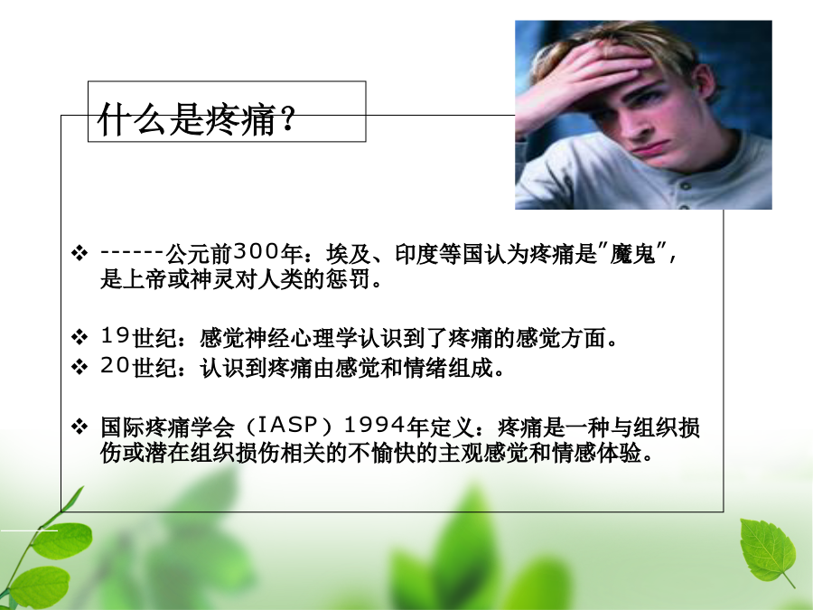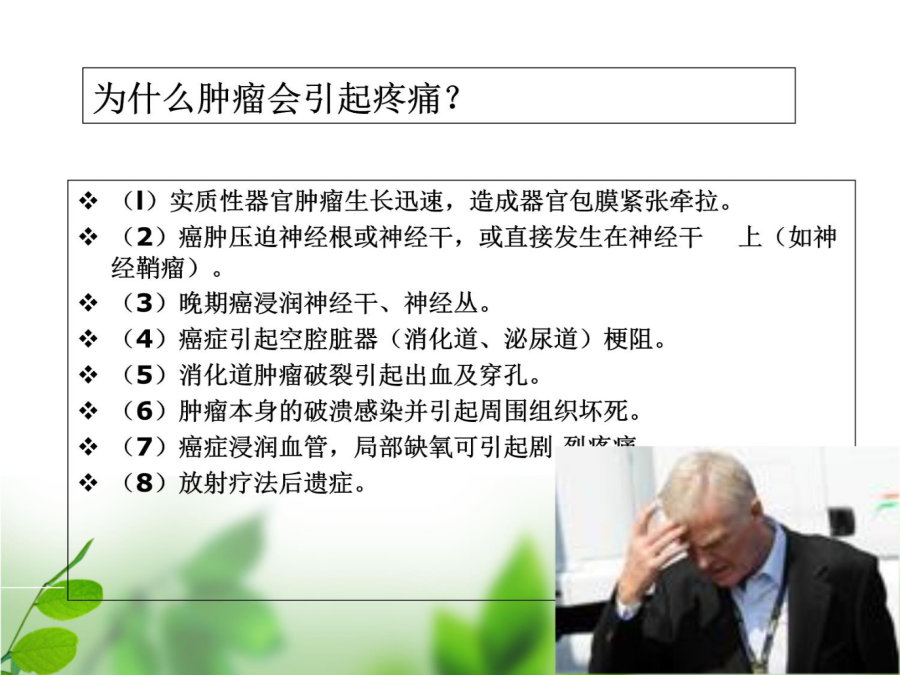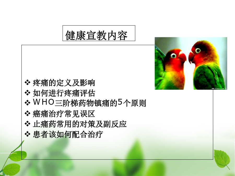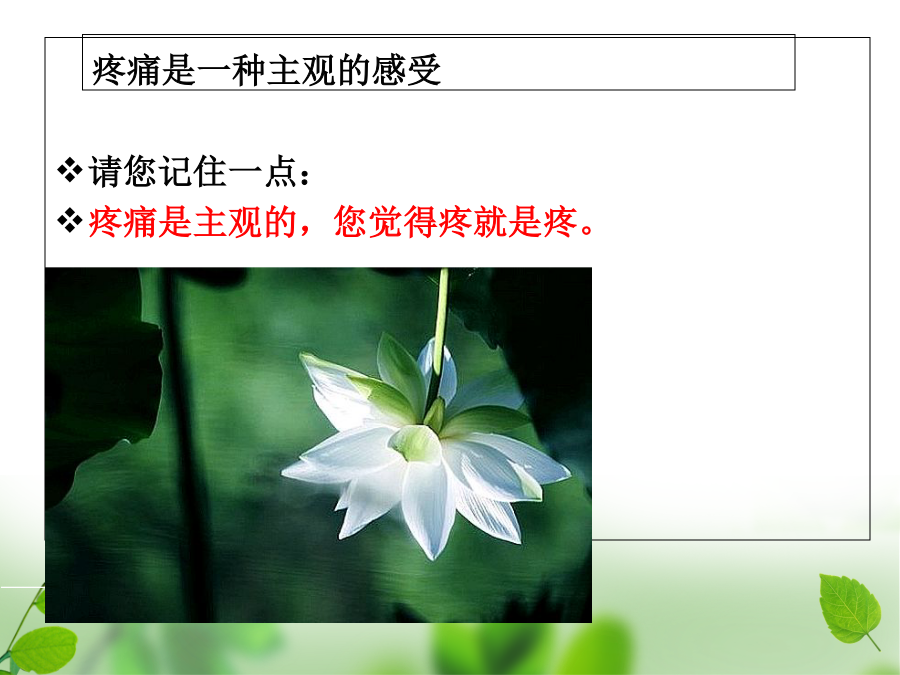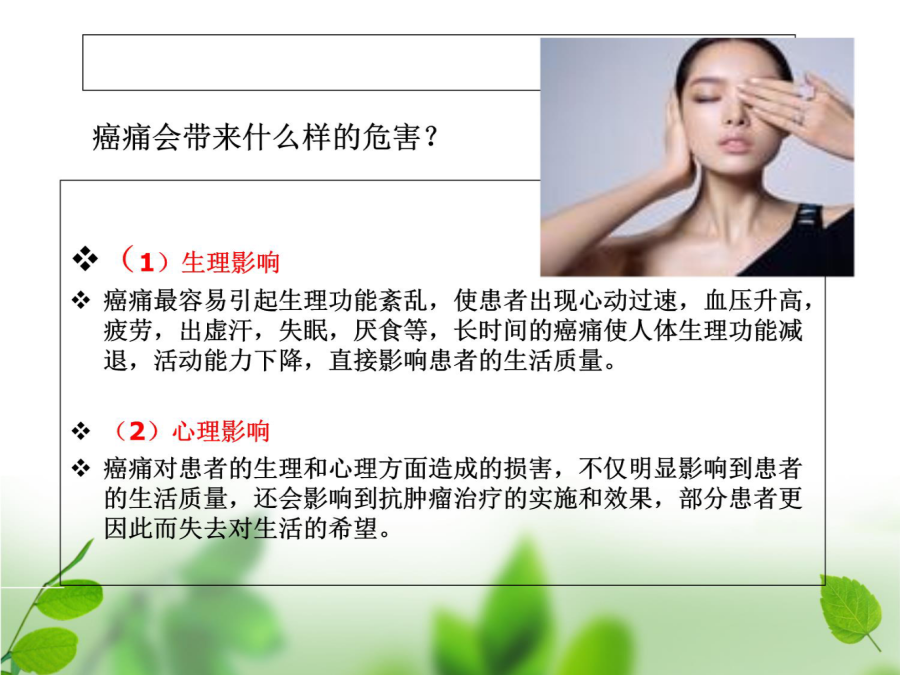 健康宣教内容什么是疼痛?疼痛是一种主观的感受像关注血压一样关注疼痛该如何表达出您的疼痛该如何表达出您的疼痛癌痛治疗不充分的原因癌痛患者治疗不充分的原因肿瘤病友无需忍受疼痛肿瘤患者无需忍受疼痛常见治疗癌痛的方法有哪些?WHO三阶梯镇痛方案及5个原则按阶梯给药口服给药按时服药个体化给药注意具体细节止痛药常用的对策及副反应1、恶心、呕吐2、便秘3、疲乏、嗜睡、头晕癌痛治疗常见误区误区1:止痛治疗只要能使疼痛部分缓解即可误区2:长期服用麻醉性止痛药会“成瘾”、增加用药剂量意味着成瘾误区3:哌替啶比吗啡效果更好误区4:服用大剂量的阿片类药物会中毒误区5:不到万不得以的时候不能使用阿片类止痛药误区6:吗啡剂量越大,说明病情越重误区7:一旦使用阿片类药物,就可能终身需要用药患者该如何配合治疗?