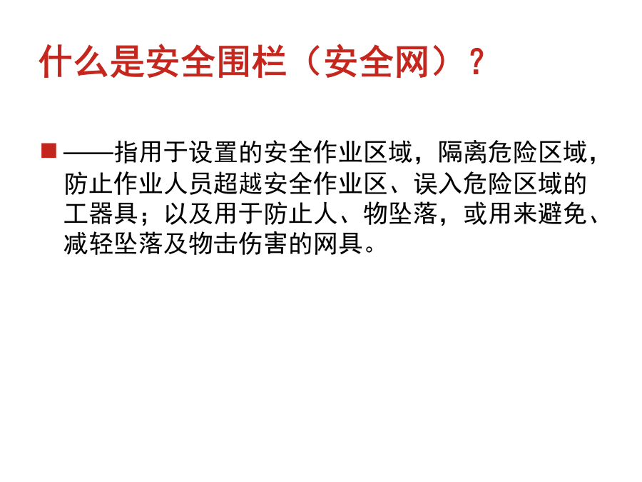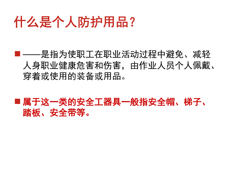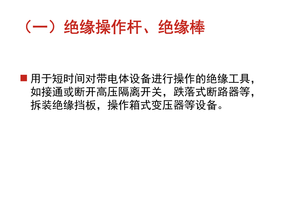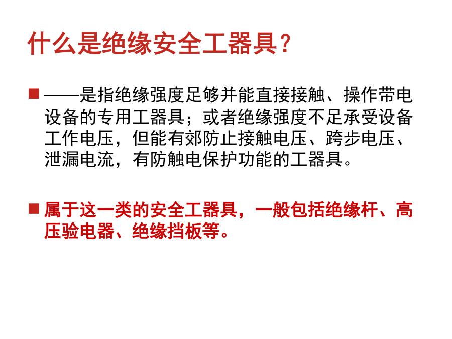 常用电力安全工器具的使用、维护和保养什么是绝缘安全工器具?什么是个人防护用品?什么是安全围栏(安全网)?(一)绝缘操作杆、绝缘棒绝缘操作杆、绝缘棒由工作部分、绝缘部分和握手部分组成。工作部分一般由金属或具有较大机械强度的绝缘材料制成,一般不宜过长,在满足工作需要的情况下,长度不宜超过5~8mm,以免过长时操作发生相间或接地短路。绝缘部分和握手部分一般是由环氧树脂管制成,绝缘杆的杆身要求光洁、无裂纹或损伤,其长度根据工作需要、电压等级和使用场所而定。 使用要求:维护及存放要求:(二)验电器高压验电器使用范围声光式验电器结构工作原理使用要求:维护及存放要求常见故障原因及处理方法:(三)低压验电器使用方法及注意事项:(四)绝缘夹钳1、使用和保管注意事项:(五)绝缘手套使用要求:使用绝缘手套常见的错误:维护及存放报废条件(六)绝缘靴使用要求:维护及存放要求(八)便携式接地和接地短路装置、个人保安接地线便携式接地和接地短路装置(以下简称接地线) 为了接地或接地和短路目的,用人工将其连接到电气设备上的装置。可泄放残余电荷,防止在突然来电时的危险电压和电弧,避免工作人员触电和电弧烧伤。 个人保安接地线 为了防止邻近带电设备和线路产生的感应电压,以保证操 作人员的人身安全而装设的接地装置。分类分相式接地线个人保安接地线结构组成:装拆顺序:使用要求(1):使用要求(2):维护及存放要求:(九)安全带围杆作业安全带示意图图2区域限制安全带示意图坠落悬挂安全带示意图安全绳背带使用要求:维护与存放要求:(八)安全帽防护原理:安全帽内部结构:使用要求:维护与存放要求:(十)梯子作业人员在梯子上正确的站立姿势是:一只脚踏在踏板上,另一条腿跨入踏板上部第三格的空挡中,脚钩着下一格踏板。