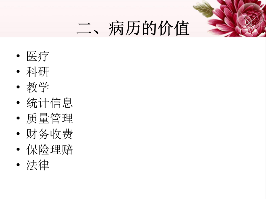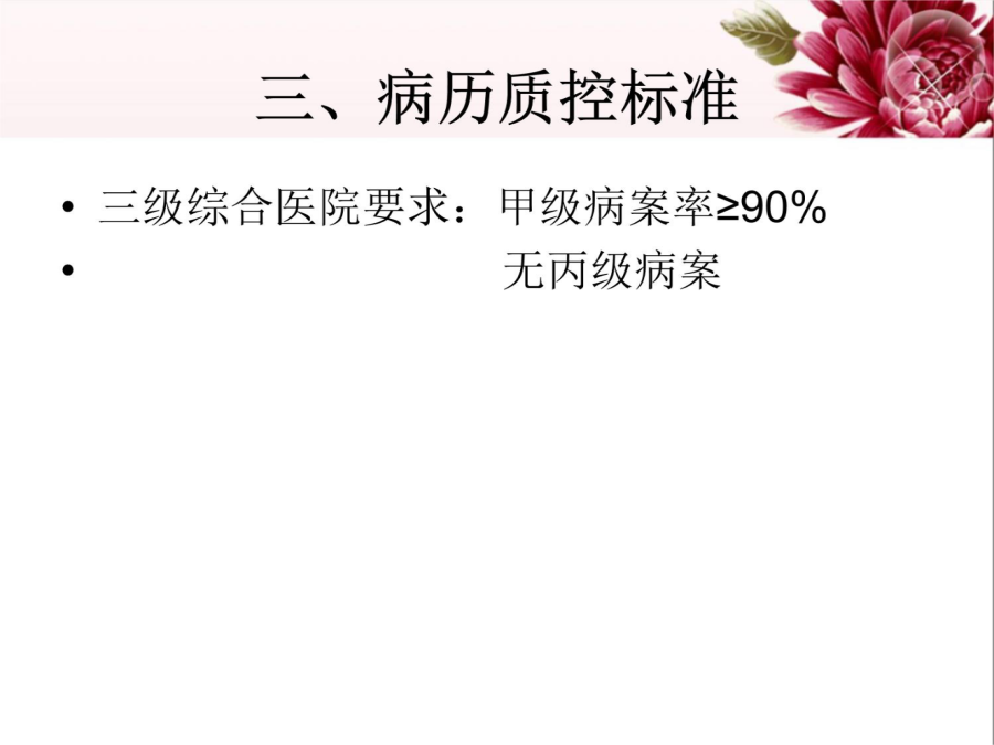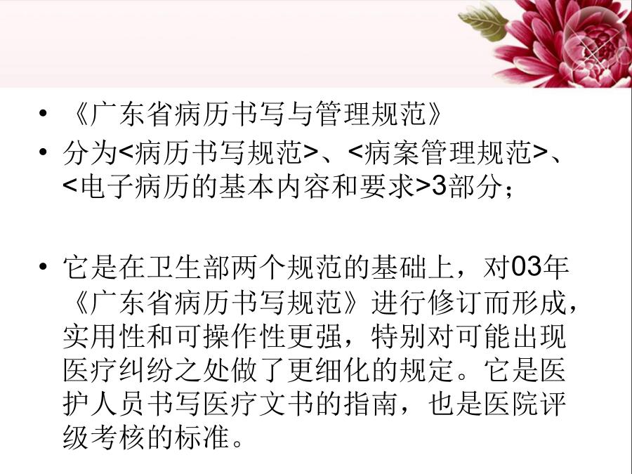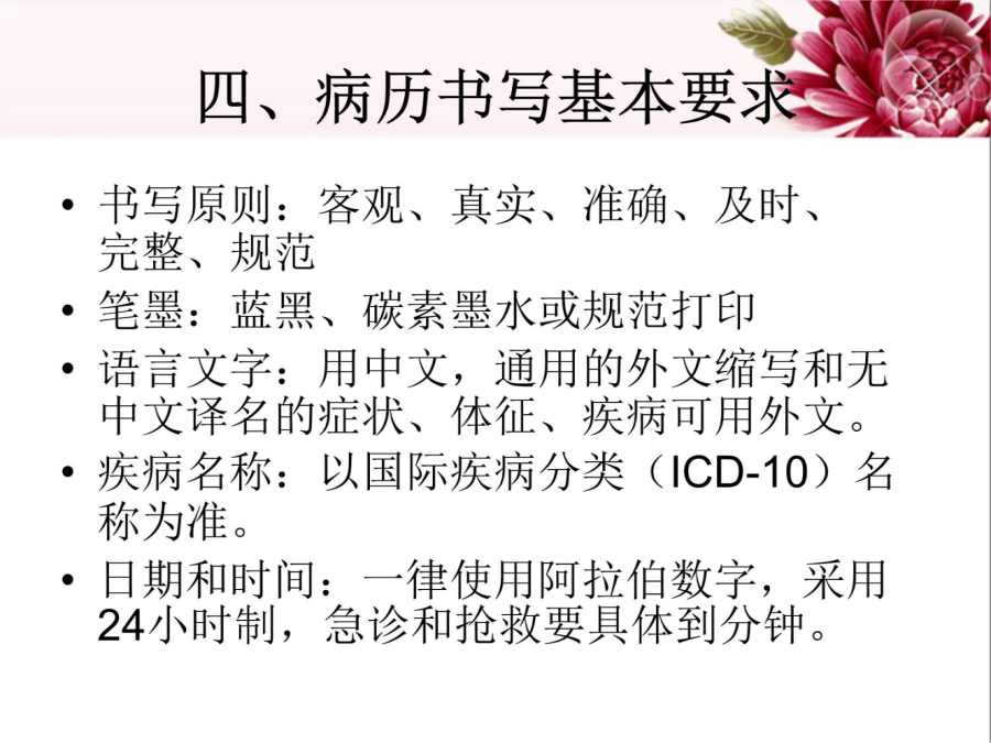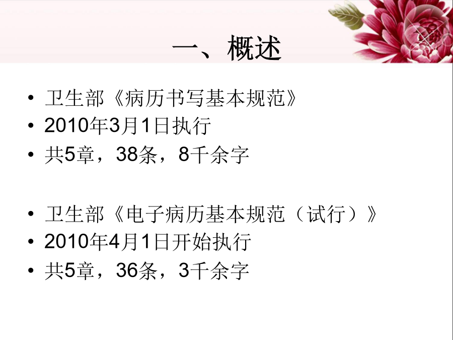 一、概述二、病历的价值四、病历书写基本要求四、病历书写基本要求四、病历书写基本要求四、病历书写基本要求四、病历书写基本要求四、病历书写基本要求四、病历书写基本要求四、病历书写基本要求五、各类时限规定五、各类时限规定六、病程记录时限七、各种记录完成负责人八、护理记录书写九、乙级病历的标准九、乙级病历的标准九、乙级病历的标准十、新规范新增扣分点(乙级)十、新规范新增扣分点十一、导致丙级的单项缺陷(新旧一致)十二、评分说明十三、小结新规范特点十四、病历首页填写应注意的问题十五、病历书写其他问题十六、提高病案质量建议