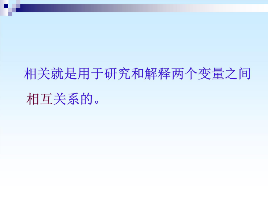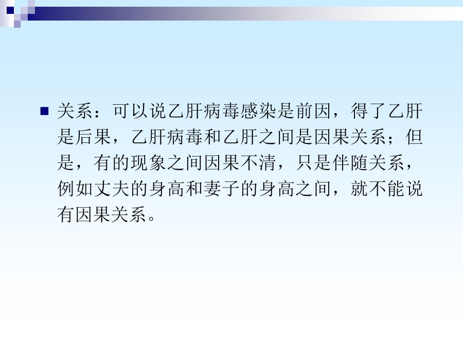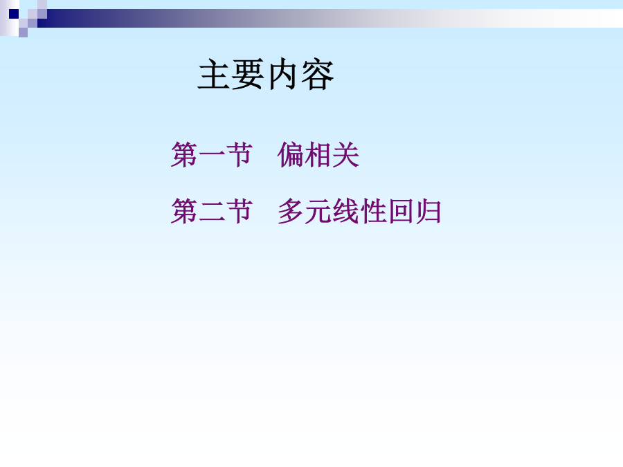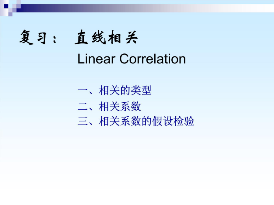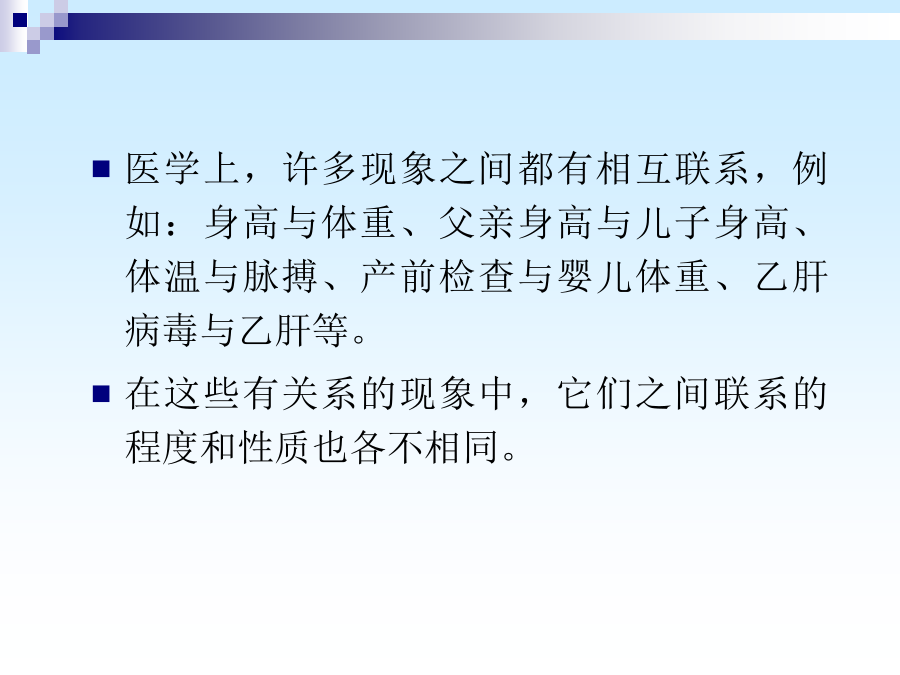 主要内容医学上,许多现象之间都有相互联系,例如:身高与体重、父亲身高与儿子身高、体温与脉搏、产前检查与婴儿体重、乙肝病毒与乙肝等。 在这些有关系的现象中,它们之间联系的程度和性质也各不相同。 关系:可以说乙肝病毒感染是前因,得了乙肝是后果,乙肝病毒和乙肝之间是因果关系;但是,有的现象之间因果不清,只是伴随关系,例如丈夫的身高和妻子的身高之间,就不能说有因果关系。为了研究父亲与成年儿子身高之间的关系,卡尔.皮尔逊测量了1078对父子的身高。把1078对数字表示在坐标上,如图。 它的形状象一块橄榄状的云,中间的点密集,边沿的点稀少,其主要部分是一个椭圆。一、相关的类型二、相关系数一个产科医师发现孕妇尿中雌三醇含量与产儿的体重有关。 于是设想,通过测量待产妇尿中雌三醇含量,可以预测产儿体重,以便对低出生体重进行预防。因此收集了31例待产妇24小时的尿,测量其中的雌三醇含量,同时记录产儿的体重。 问尿中雌三醇含量与产儿体重之间相关系数是多少?是正相关还是负相关? 分析问题:总体-样本、目的、变量、关系编号 (1) SPSS计算程序从计算结果可以知道,31例待产妇尿中雌三醇含量与产儿体重之间呈正相关,相关系数是0.61。根据资料类型选择不同的方法计算r问题:我们能否得出结论:待产妇尿中雌三醇含量与产儿体重之间成正相关,相关系数是0.61?为什么?三、相关系数的假设检验对相关系数的假设检验,常用t检验,选用统计量t的计算公式如下: H0:=0 H1:≠0 =0.05 r=0.61,n=31,代入公式t=另外的例子: 1、身高与肺活量的简单相关系数2、体重与肺活量的简单相关系数3、身高与体重的简单相关系数第一节偏相关一、概念当控制一个变量时,偏相关系数的计算公式: 身高与肺活量的偏相关系数(体重为控制变量)PARTIALCORRELATIONCOEFFICIENTS Controllingfor..X1(身高) Y(肺活量)X2(体重) Y1.0000.569 (0)(26) P=.P=.002 X2.5691.0000 (26)(0) P=.002P=.一、回归方程 二、回归系数 三、回归系数的假设检验 四、直线回归的应用知道了两个变量之间有直线相关关系,并且一个变量的变化会引起另一个变量的变化,这时,如果它们之间存在准确、严格的关系,它们的变化可用函数方程来表示,叫它们是函数关系,它们之间的关系式叫函数方程。但在实际生活当中,由于其它因素的干扰,许多双变量之间的关系并不是严格的函数关系,不能用函数方程反映,为了区别于两变量间的函数方程,我们称这种关系式为直线回归方程,这种关系为直线回归. 直线回归就是用来描述一个变量如何依赖于另一个变量。 其任务就是要找出一个变量随另一个变量变化的直线方程,我们把这个直线方程叫做直线回归方程。 一、回归方程a称为截距(intercept),表示X取值为0时Y的平均水平。 b称为回归系数(regressioncoefficient)或直线的斜率(slope),表示X每变化一个单位时,Y平均改变b个单位。 b>0时,随X的增大而增大; b<0时,随X的增大而减小; b=0时,直线与X轴平行,Y与X无直线关系二、回归系数这就是我们求得的二者关系的回归方程SPSS程序回归直线的描绘=2.15+0.061X三、回归系数的假设检验回归系数的检验方法有两种: (1)方差分析 (2)t检验 两种方法是等价的。(1)方差分析因变量Y的变异的分解不考虑回归时,Y的总变异SS总全部视为随机误差;而回归以后,回归的贡献使得随机误差减小为SS剩。如果两变量间总体回归关系确实存在,回归的贡献就应当大于随机误差;大到何种程度时可以认为具有统计意义,可计算如下的F统计量:自由度分别是:ν回=1,ν残=n-2 MS回与MS残分别称为回归均方和残差均方。 求得F值后查F界值表得到P值,最后按所取水准作出总体回归关系是否成立的推断结论。(2)t检验: H0:β=0 H1:β≠0 α=0.05 统计量t的计算公式为: 自由度=n-2 例1: H0:β=0 H1:β≠0 α=0.05对于一元线性回归来说,方差分析与t检验是完全等价的,且有关系式: 利用SPSS实现直线回归:四、直线回归的应用3.利用回归方程进行统计控制 利用回归方程进行逆估计,即要求因变量y的容许取值范围,逆向估计X的取值范围。 五、应用直线相关与回归的注意事项(一)注意事项3.利用散点图 对于性质不明确的两组数据,可先做散点图,在图上看它们有无关系、关系的密切程度、是正相关还是负相关,然后再进行相关回归分析。4.变量范围 相关分析和回归方程仅适用于样本的原始数据范围之内,超出了这个范围,我们不能得出两变量的相关关系和回归