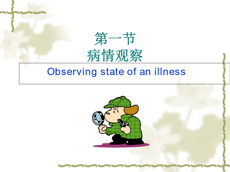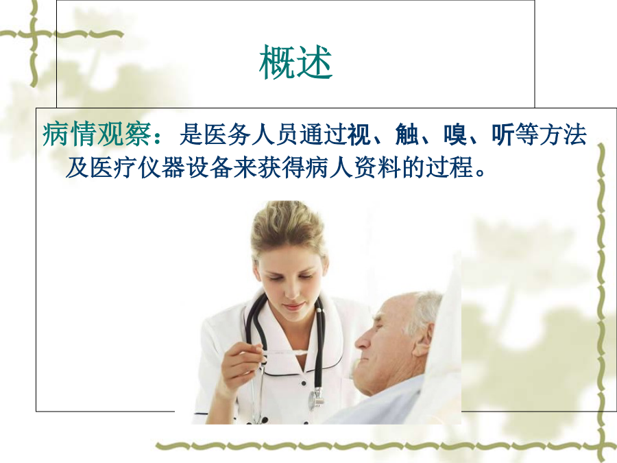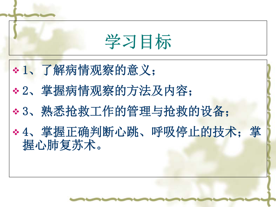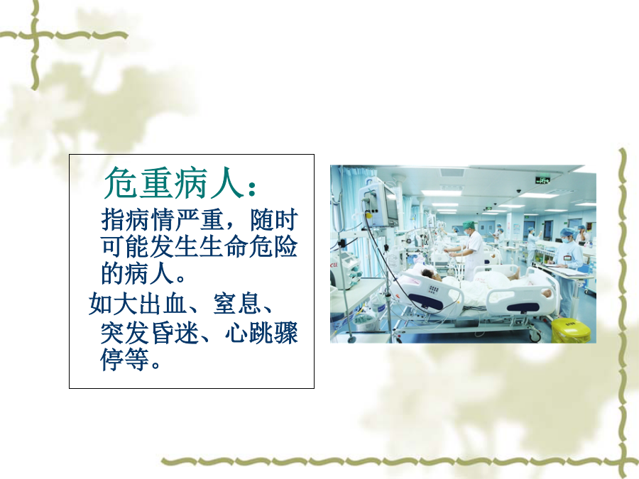 学习目标概述危重病人: 指病情严重,随时可能发生生命危险的病人。 如大出血、窒息、突发昏迷、心跳骤停等。Observingstateofanillness一、病情观察的意义(二)病情观察的内容1.一般情况的观察1.一般情况的观察1.一般情况的观察1)急性病容:2)慢性病容:3)病危面容:4)二尖瓣面容:5)贫血面容:1.一般情况的观察1.一般情况的观察1.一般情况的观察2、生命体征3、中心静脉压4、意识状态 意识障碍 是指个体对外界环境刺激缺乏正常反应的一种精神状态。凡影响大脑活动的疾病均会引起不同程度的意识改变。 意识障碍依轻重程度不同可分为:(1)嗜睡(somnolence)(2)意识模糊(confusion)(3)昏睡(stupor)(4)昏迷:1)浅昏迷: 意识大部分丧失,无自主运动,对声、光刺激无反应,对疼痛刺激(如压迫眶上缘)可有痛苦表情及躲避反应。瞳孔对光反射、角膜反射、眼球运动、吞咽反射、咳嗽反射等可存在。呼吸、心跳、血压无明显改变,可有大小便失禁或潴留。2)深昏迷: 意识完全丧失,对各种刺激均无反应。全身肌肉松弛,肢体呈现迟缓状态,深浅反射均消失,偶有深反射亢进及病理反射出现。机体仅能维持循环与呼吸的最基本功能,呼吸不规则,血压可下降,大小便失禁或潴留。5.瞳孔(1)瞳孔的大小与对称性2)异常瞳孔: 1)瞳孔缩小: 瞳孔直径﹤2mm称为瞳孔缩小, ﹤1mm为针尖样瞳孔。2)瞳孔散大: 瞳孔直径﹥5mm称为瞳孔散大瞳孔对光反射: 1)正常:正常瞳孔对光反应灵敏,并于光亮处瞳孔收缩,昏暗处瞳孔扩大。2)异常:当瞳孔大小不随光线刺激而变化时,称瞳孔对光反应消失,常见于危重或深昏迷病人。 迟钝、消失——见于病情危重或深昏迷病人6.自理能力7.心理状态8.其他第二节(一)抢救工作的组织与管理(二)抢救室内抢救器械和药品管理(二)抢救室内抢救器械和药品管理(三)常用抢救技术1.基本生命支持技术2.人工呼吸器的使用2.人工呼吸器的使用3.氧气吸入法3.氧气吸入法4.吸痰法4.吸痰法病人突发病情变化应急程序提问: