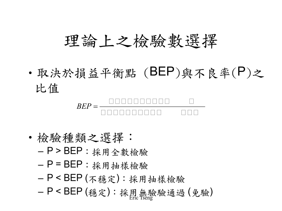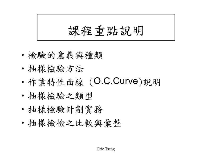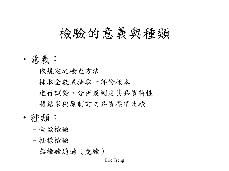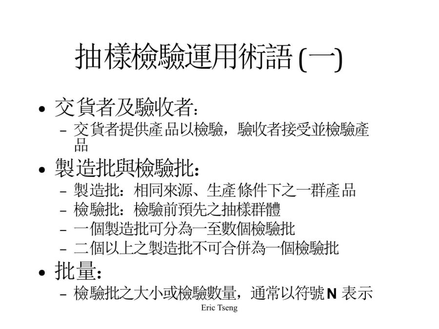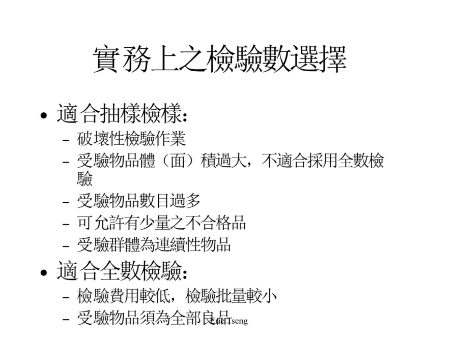 課程重點說明檢驗的意義與種類取決於損益平衡點(BEP)與不良率(P)之比值 檢驗種類之選擇: P>BEP:採用全數檢驗 P=BEP:採用抽樣檢驗 P<BEP(不穩定):採用抽樣檢驗 P<BEP(穩定):採用無驗驗通過(免驗)檢驗單位:取自檢驗批中,彼此不重疊之集合體 樣本:自檢驗批中,隨機抽取之部份檢驗單位 樣本大小:樣本內檢驗單位之數量,通常以符號n表示 允收數:判斷檢驗群體是否合格之基準數,用於計數值抽樣檢驗,通常以符號C表示 合格判定值:判斷檢群體是否合格之基準值,用於計量值抽樣檢驗,通常以符號XU或XL表示適用之場合: 適用於樣本大小(n)很大、不合格率(p)很小之分配狀態 適用於缺點數管制圖 適用於計數值抽樣檢驗之允收機率計算 適用之條件: n>=16 N>=10*n(即無限群體) p(不合格率)<0.1自含有1,200件之一批產品中,隨機選取100件為樣本加以檢驗,買賣雙方約定不合格品數為2個或以下,則允收該批,若假設全批之不合格率P為0.02,試計算其允收機率原則:任何抽樣檢驗,產品在某一不合格率下,具有可能被判斷為合格或允收之機率 例:按前例,請製作O.C.曲線計算表O.C.曲線之繪製O.C.曲線之判斷能力O.C.曲線之參數(一)允收品質水準(AQL,AcceptableQualityLevel)O.C.曲線之參數(二)生產者冒險率O.C.曲線之參數(三)拒收品質水準(LTPD,LotTolerancePercentDefective)O.C.曲線之參數(四)消費者冒險率允收機率約50% 引一橫軸之平行線,交會於O.C.曲線 自該點垂直於不合率之一半,為該AOQL之值 O.C.曲線之中間部份O.C.曲線資料彙整抽樣檢驗之種類(一)依抽樣方式區分抽樣檢驗之種類(二)依抽樣型式區分單次抽樣檢驗流程雙次抽樣檢驗流程多次抽樣檢驗流程調整型抽樣檢驗(一)檢驗嚴格程度之制訂調整型抽樣檢驗(二)單次抽樣檢驗之基本步驟調整型抽樣檢驗(三)雙次抽樣檢驗之基本步驟調整型抽樣檢驗(四)多次抽樣檢驗之基本步驟調整型抽樣檢驗表格範例:調整型抽樣檢驗(單次)範例:調整型抽樣檢驗(雙次)範例:調整型抽樣檢驗(多次)抽樣檢驗之比較計數值抽樣檢驗彙整計量值抽樣檢驗彙整
