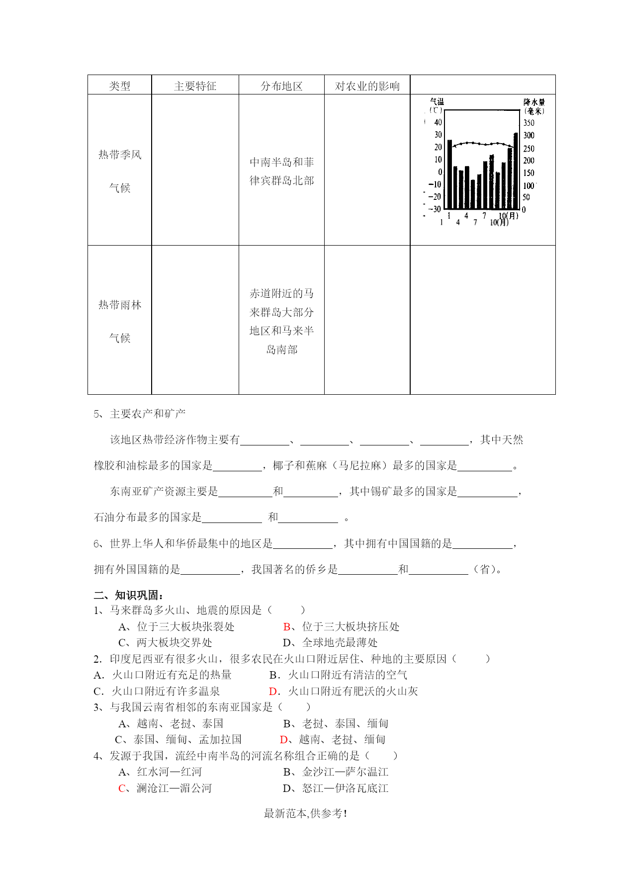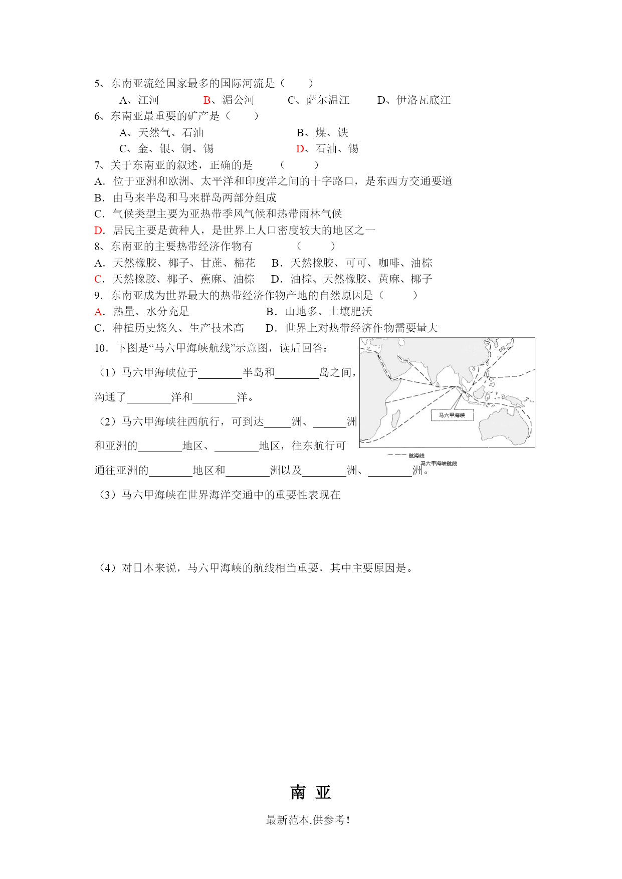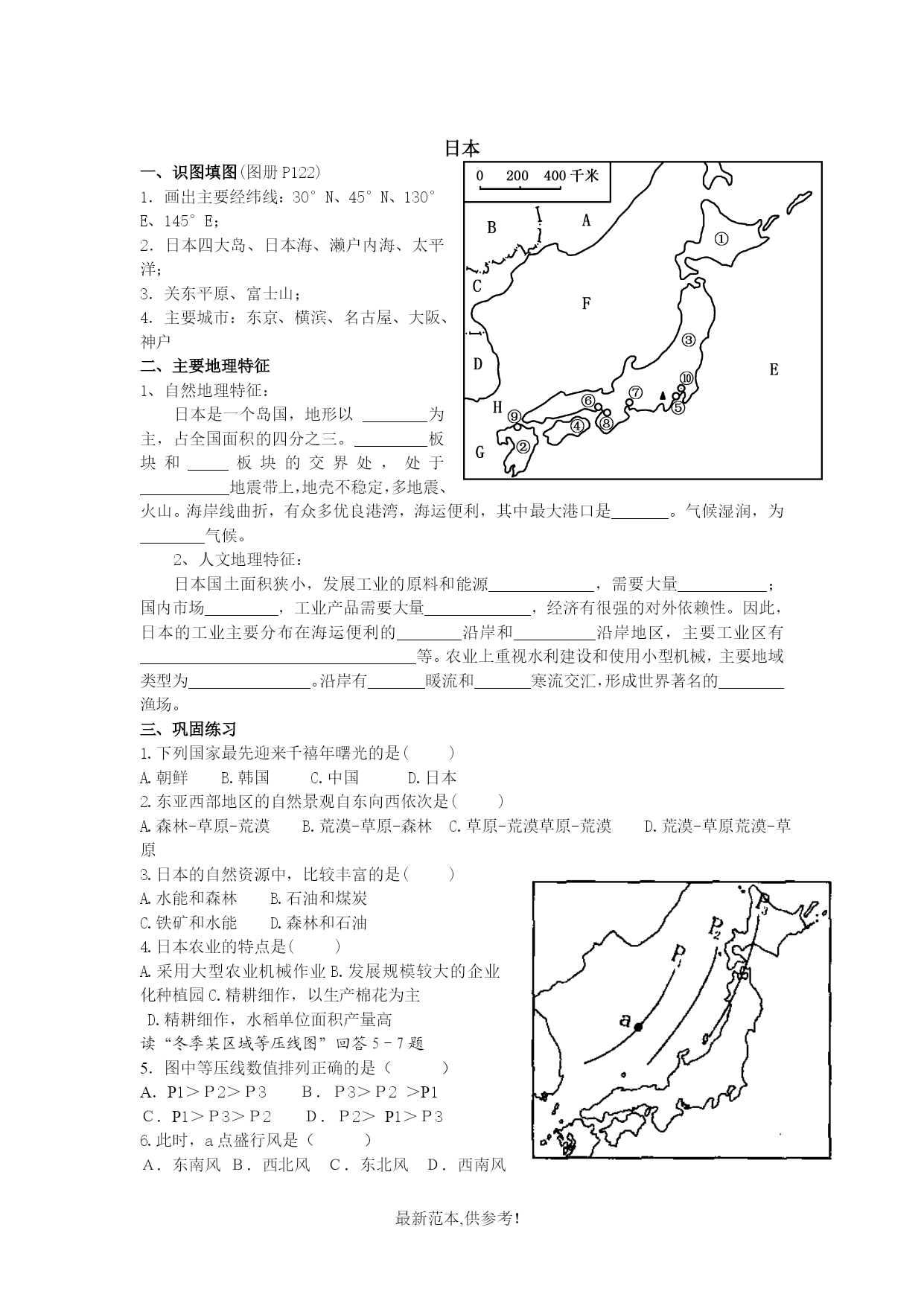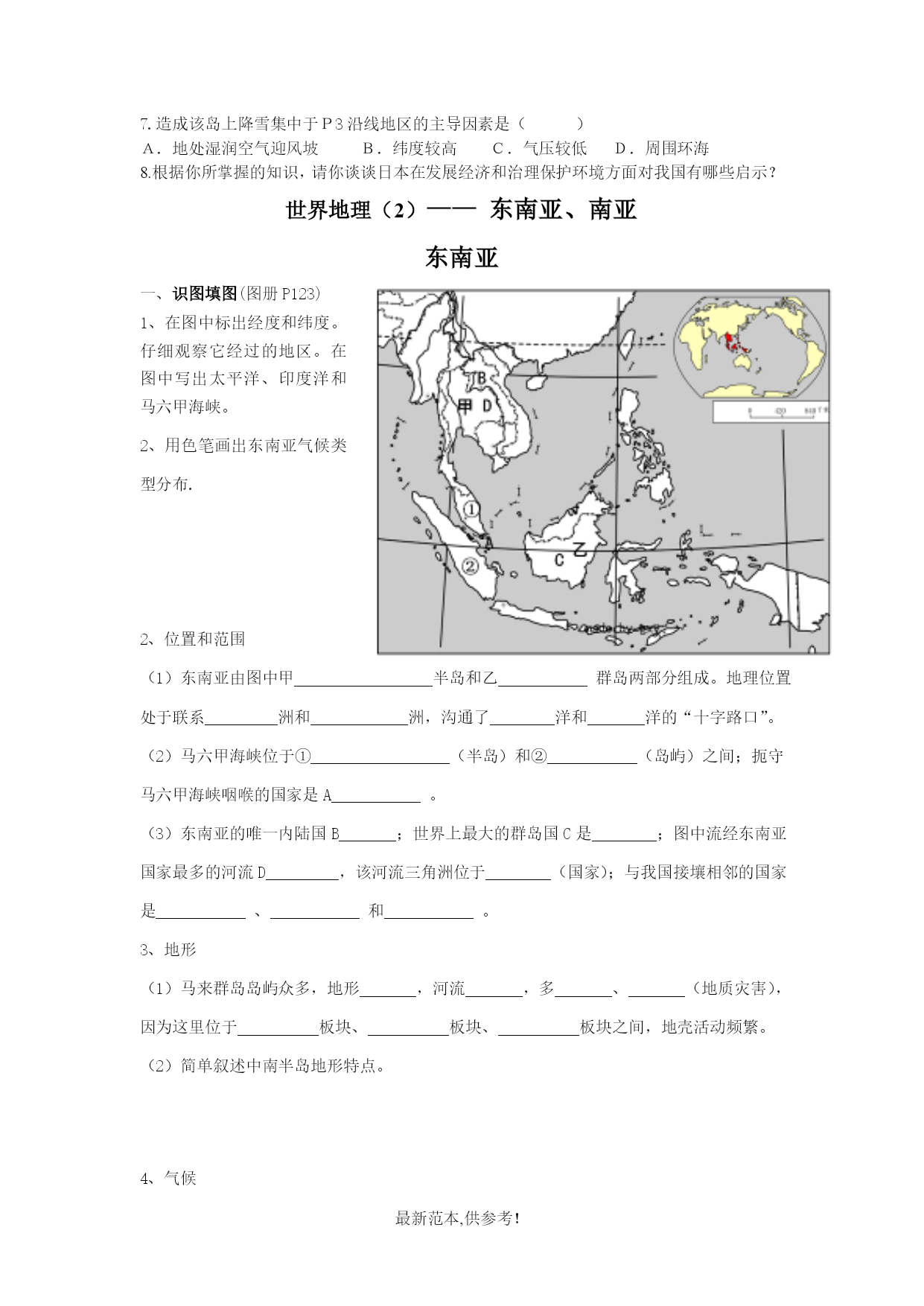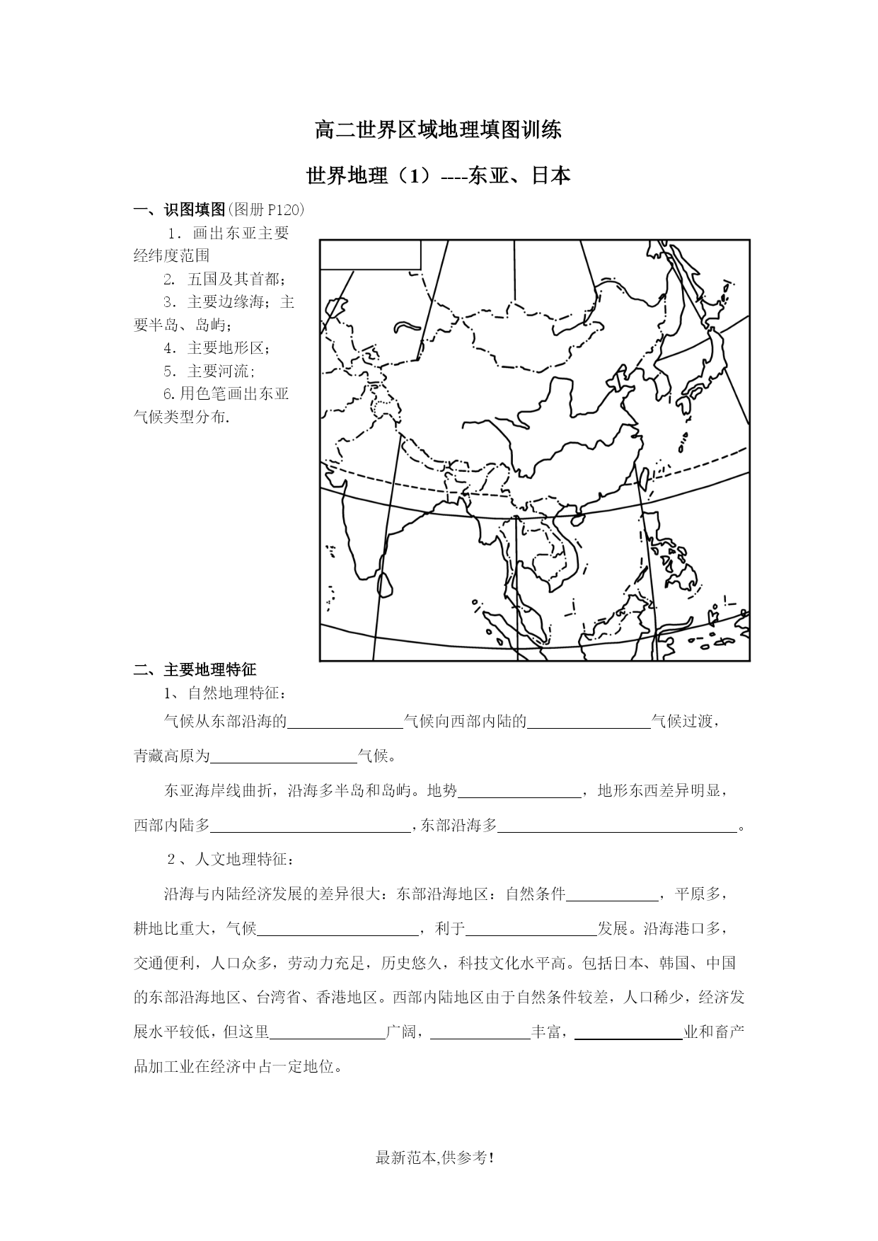 最新范本,供参考! 最新范本,供参考! 最新范本,供参考! 高二世界区域地理填图训练 世界地理(1)----东亚、日本 一、识图填图(图册P120) 1.画出东亚主要经纬度范围 2.五国及其首都; 3.主要边缘海;主要半岛、岛屿; 4.主要地形区; 5.主要河流; 6.用色笔画出东亚气候类型分布. 二、主要地理特征 1、自然地理特征: 气候从东部沿海的_______________气候向西部内陆的________________气候过渡, 青藏高原为___________________气候。 东亚海岸线曲折,沿海多半岛和岛屿。地势________________,地形东西差异明显, 西部内陆多__________________________,东部沿海多_______________________________。 2、人文地理特征: 沿海与内陆经济发展的差异很大:东部沿海地区:自然条件____________,平原多, 耕地比重大,气候_____________________,利于_________________发展。沿海港口多, 交通便利,人口众多,劳动力充足,历史悠久,科技文化水平高。包括日本、韩国、中国 的东部沿海地区、台湾省、香港地区。西部内陆地区由于自然条件较差,人口稀少,经济发展水平较低,但这里_______________广阔,_____________丰富,______________业和畜产品加工业在经济中占一定地位。 日本 一、识图填图(图册P122) 1.画出主要经纬线:30°N、45°N、130°E、145°E; 2.日本四大岛、日本海、濑户内海、太平洋; 3.关东平原、富士山; 4.主要城市:东京、横滨、名古屋、大阪、神户 二、主要地理特征 1、自然地理特征: 日本是一个岛国,地形以________为主,占全国面积的四分之三。_________板块和_____板块的交界处,处于___________地震带上,地壳不稳定,多地震、火山。海岸线曲折,有众多优良港湾,海运便利,其中最大港口是_______。气候湿润,为________气候。 2、人文地理特征: 日本国土面积狭小,发展工业的原料和能源_____________,需要大量___________;国内市场_________,工业产品需要大量_____________,经济有很强的对外依赖性。因此,日本的工业主要分布在海运便利的________沿岸和__________沿岸地区,主要工业区有__________________________________等。农业上重视水利建设和使用小型机械,主要地域类型为_______________。沿岸有_______暖流和_______寒流交汇,形成世界著名的________渔场。 三、巩固练习 1.下列国家最先迎来千禧年曙光的是() A.朝鲜B.韩国C.中国D.日本 2.东亚西部地区的自然景观自东向西依次是() A.森林-草原-荒漠B.荒漠-草原-森林C.草原-荒漠草原-荒漠D.荒漠-草原荒漠-草原 3.日本的自然资源中,比较丰富的是() A.水能和森林B.石油和煤炭 C.铁矿和水能D.森林和石油 4.日本农业的特点是() A.采用大型农业机械作业B.发展规模较大的企业化种植园C.精耕细作,以生产棉花为主 D.精耕细作,水稻单位面积产量高 读“冬季某区域等压线图”回答5-7题 5.图中等压线数值排列正确的是() A.P1>P2>P3B.P3>P2>P1 C.P1>P3>P2D.P2>P1>P3 6.此时,a点盛行风是() A.东南风B.西北风C.东北风D.西南风 7.造成该岛上降雪集中于P3沿线地区的主导因素是() A.地处湿润空气迎风坡B.纬度较高C.气压较低D.周围环海 8.根据你所掌握的知识,请你谈谈日本在发展经济和治理保护环境方面对我国有哪些启示? 世界地理(2)——东南亚、南亚 东南亚 一、识图填图(图册P123) 1、在图中标出经度和纬度。仔细观察它经过的地区。在图中写出太平洋、印度洋和马六甲海峡。 2、用色笔画出东南亚气候类型分布. 2、位置和范围 (1)东南亚由图中甲半岛和乙群岛两部分组成。地理位置处于联系洲和洲,沟通了洋和洋的“十字路口”。 (2)马六甲海峡位于①(半岛)和②(岛屿)之间;扼守马六甲海峡咽喉的国家是A。 (3)东南亚的唯一内陆国B;世界上最大的群岛国C是;图中流经东南亚国家最多的河流D,该河流三角洲位于(国家);与我国接壤相邻的国家是、和。 3、地形 (1)马来群岛岛屿众多,地形,河流,多、(地质灾害),因为这里位于板块、板块、板块之间,地壳活动频繁。 (2)简单叙述中南半岛地形特点。 4、气候 类型主要特征分布地区对农