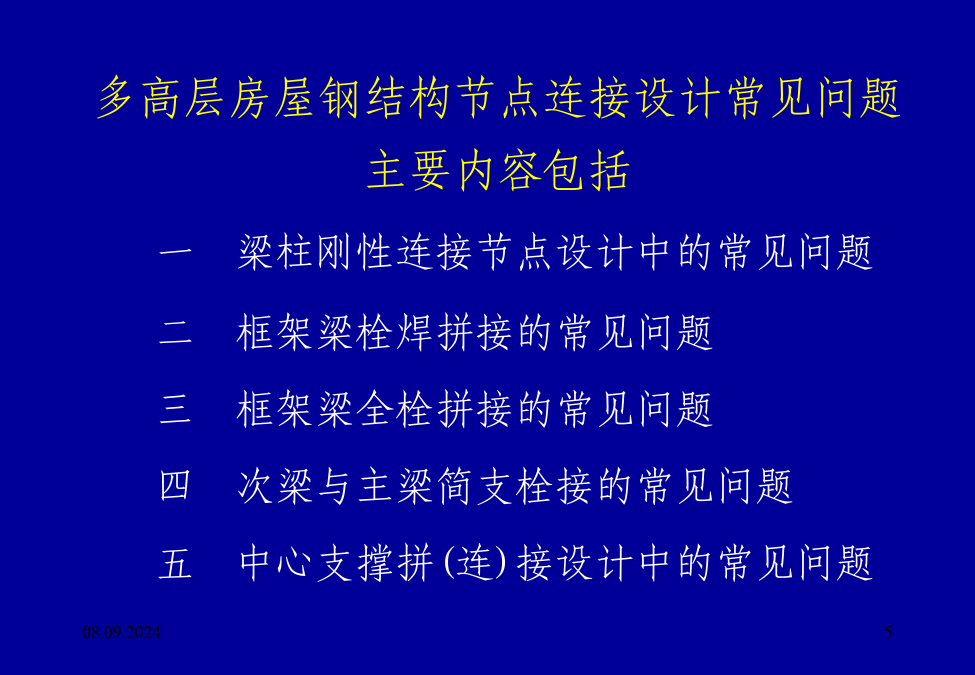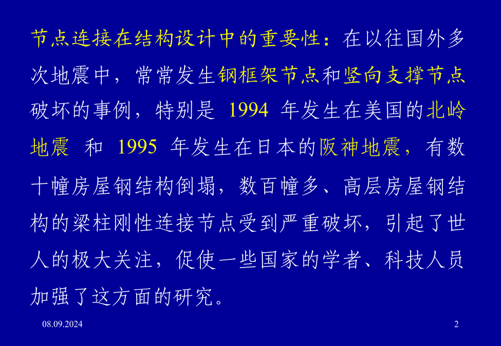 今天要讲的内容节点连接在结构设计中的重要性:在以往国外多次地震中,常常发生钢框架节点和竖向支撑节点破坏的事例,特别是1994年发生在美国的北岭地震和1995年发生在日本的阪神地震,有数十幢房屋钢结构倒塌,数百幢多、高层房屋钢结构的梁柱刚性连接节点受到严重破坏,引起了世人的极大关注,促使一些国家的学者、科技人员加强了这方面的研究。我国是世界上遭受地震最严重的国家之一,不论是历史上还是现代,地震在中国的死亡人数和经济损失在世界上都是居于首位。世界地震史上死亡人数最多的一次地震是1156年我国的陕西华县8级地震,死83万人(摘自魏琏编著的《建筑结构抗震设计》万国学术出版社,1991)。在世界近代地震史中,死亡人数最多的一次.地震也发生在我国,即1976年河北唐山7.8级地震,死24万余人。 地震在我国造成的经济损失十分巨大,据建国以来十几次7级以上地震的不完全统计房屋倒塌一亿多平方米,直接经济损失达数百亿之多。就以最近几年为例,在我国新疆、西藏、云南、内蒙古自治区、江西等地先后就发生了多起6级左右的地震,特别是最近5月12日在四川的汶川还发生了7.8级的特大地震,灾情非常严重。这就说明了地震活动在我国不但相当频繁而且给我国造成的危害和损失也非常巨大。因此正确地认识我国地震活动的特点以及我国经济力量的现状,充分运用国内、国外现代地震科学技术的成就,采用合理的,既安全又经济的抗震设计方法,来改善建筑物的抗震性能,减轻城乡地震灾害,是我们每个结构设计人员义不容辞的使命。多高层房屋钢结构节点连接设计常见问题主要内容包括一首先谈谈在目前多高层房屋钢结构梁柱刚性连接节点设计中所存在的问题及其正确的设计方法 要点:在现行的《高钢规》和《抗震规》中,由于在梁柱刚性连接和中心支撑连接的抗震设计规定,多处存在有较大缺陷,致使在一般条件下,按照现行规程规范设计出来的节点,多数情况下存在并不抗震的情况,特此作专题讨论.按照现行的《建筑抗震设计规范》GB500112001多层和高层房屋钢结构的连接节点的抗震设计应分两个阶段进行,如下所示.即一是,当遭遇多遇地震作用(小震)时的弹性阶段,应采用表达式 即抗震规范公式(5.4.2) (见下页)。注意:该条在规范中为必须严格执行的强制性条文.08.09.2024式中: S—考虑多遇地震作用时,荷载效应和地震作 用效应在结构构件中的组合设计值,包括 组合的弯矩、轴向和剪力设计值。 R—结构构件承载力设计值。 —结构构件承载力的抗震调整系数 (对于框架梁、柱取0.75;连接焊缝取0.9;连 接螺栓、节点板件取0.85;支撑取0.8等)二是,当遭遇超过多遇地震(小震)作用至基本烈度(中震)设防,或遭遇罕遇地震作用(大震)时,规范还要求用公式 即《抗震规》公式(8.1.8)进行连接的极限承载力验算(如下所示)08.09.2024但是,在执行上述规范时,不同的设计人员,很可能在相同设计条件下设计出三种承载力相差非常悬殊的连接作法,这三种不同的作法是: 一是,当按设计表达式计算时,完全按组合内力来设计节点连接。 二是,组合内力只是作为检验构件截面的依据。但在塑性区的节点连接设计时,是取高于构件的最大承载力设计值作为节点的作用力来对节点连接进行设计与验算。 三是,完全抛开以上两种设计方法,而是完全按照公式来进行连接的极限承载力计算。 以上三种截然不同的设计方法,将直接影响到设计的节点是否满足“强节点弱杆杆”的抗震要求。是否能实现“小震不坏,中震可修,大震不倒”设计目标的根本问题,所以下面将着重讨论证明前面所提到的第一种理念正确,但存在有较大缺陷,第三种设计理念虽然可取,但式中的有关系数和强度取值有问题,很不安全。唯第二种设计计算方法才是比较稳妥的。1.1第一种设计方法(即按组合内力来设计的方法)以下是电算结果的表示方法,摘自《高层建筑结构空间有限元分析与设计》软件SATWE假定梁端有一个的地震组合弯矩,并将表达式变换为。在验算梁截面时,要求梁截面抗弯承载力设计值必须 ,但在确定梁端的焊缝连接时,其焊缝截面的抗弯承载力设计值就必须要 。即在相同组合弯矩作用下,经过规范采用不同的调整系数调整后,就变成了在设计焊缝连接与设计梁截面时,分别采用不同的内力设计值来进行设计。即在设计连接焊缝时所取的内力设计值,就应是梁截面内力设计值的倍。1)如果所设计的梁截面刚好等于(即应力强度比R1刚好等于时),由于梁端连接焊缝的抗弯承载力设计值需要此时梁端整个截面即使采用全熔透的对接焊缝,也只能承受的弯矩。怎么办? 可采用加强式连接来解决(如加盖板;或局部加宽梁端翼缘板,或在梁端下翼缘加腋板等办法来增大焊缝的抗弯模量)。2)如果在梁端不采用加强的作法,而是在工厂采用全焊缝连接的常规作法。由于焊缝的抗弯承载力最多只能作到与梁截面的抗弯承载等强,此时就必须