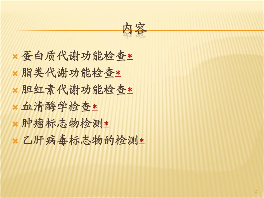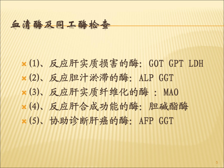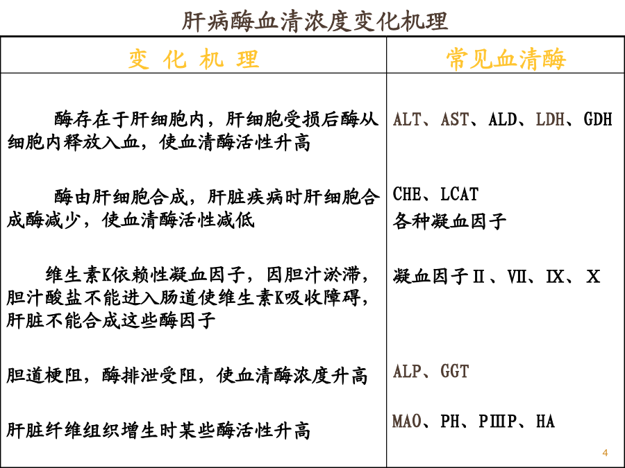 肝脏疾病有关的实验室检测内容四、血清酶及同工酶检测变化机理血清酶及同工酶检查四、血清酶及同工酶检测(一)血清氨基转移酶测定(一)血清氨基转移酶测定ALT&AST血清氨基转移酶测定血清氨基转移酶测定参考值1.急性病毒性肝炎1.急性病毒性肝炎2.慢性病毒性肝炎3.非病毒性肝病4.肝硬化6.急性心肌梗塞常见肝病转氨酶变化(二)碱性磷酸酶测定参考值1.生理性增高2.病理性增高ALPALTAST3.鉴别黄疸黄疸时ALP、STB、ALT的变化(三)γ-谷氨酰转肽酶测定临床意义临床意义(四)乳酸脱氢酶测定参考值临床意义临床意义MAO分布在肝、肾、胰、心等器官 在肝内主要存在于线粒体中。 血清MAO活性与体内结缔组织增生呈正相关. 临床上常用MAO活性测定来观察肝脏纤维化程度。 参考值 速率法0-3U/L(37°C) 肝脏病变:(肝细胞坏死和纤维化形成) 重症肝硬化、伴有肝硬化的肝癌患者 急性肝坏死 1/2中、重度慢性肝炎 肝外疾病: 慢性充血性心衰、糖尿病、甲亢、系统硬化症等思考题思考题思考题常见肝胆疾病时常用酶学指标的变化第八章临床常用免疫学检测甲胎蛋白甲胎蛋白临床意义临床意义第九章临床常用病原体检测病毒性肝炎血清标志物检测目前常用的检测方法有HepatitisBVirus乙型肝炎病毒标志物检测参考值(一)乙型肝炎病毒表面抗原(一)乙型肝炎病毒表面抗原(二)乙型肝炎病毒表面抗体临床意义(三)乙型肝炎病毒e抗原(四)乙型肝炎病毒e抗体临床意义(五)乙型肝炎病毒核心抗原(六)乙型肝炎病毒核心抗体临床意义临床意义临床意义HBV标志物的临床意义HBV标志物检测的临床意义肝功能检测项目的选择与应用肝功能实验选择肝功能实验选择选择原则选择原则病例分析检查指标 思考题谢谢!