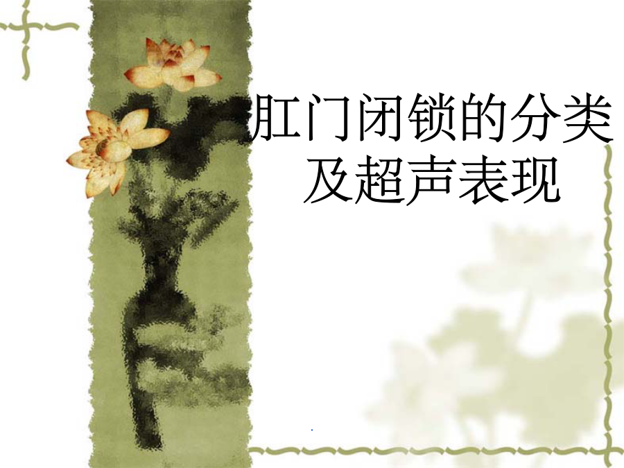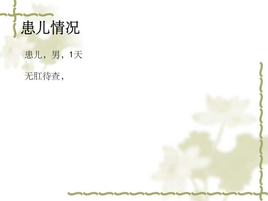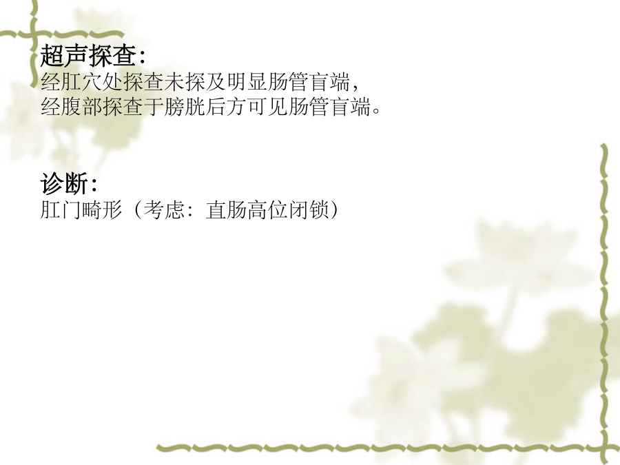 肛门闭锁的分类及超声表现患儿情况超声表现超声探查: 经肛穴处探查未探及明显肠管盲端, 经腹部探查于膀胱后方可见肠管盲端。 诊断: 肛门畸形(考虑:直肠高位闭锁) 腹部倒立位平片先天性直肠肛管畸形 最常见的消化道畸形 常伴发泌尿生殖系统及心脏神经性通畸形,约50%。 直肠肛管畸形分类(wingspread分类法1984)检查方法女性耻骨尾骨连线观察要点诊断标准(综合评价)谢谢感谢亲观看此幻灯片,此课件部分内容来源于网络, 如有侵权请及时联系我们删除,谢谢配合!