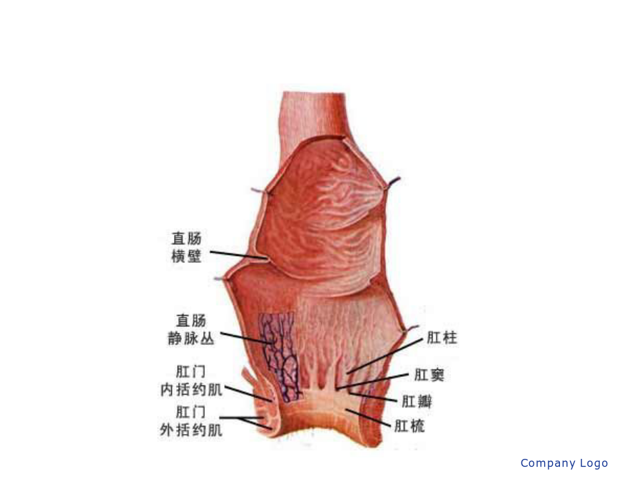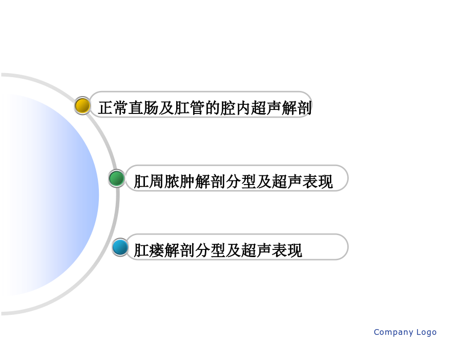 肛管内超声检查肛周脓肿和肛瘘CompanyLogoCompanyLogo解剖图谱解剖图谱直肠:这些层次包括:CompanyLogoCompanyLogoCompanyLogo肛管肛管内括约肌:肛管外括约肌:联合纵肌肛管声像图分层:联合纵肌层,腔内超声很大程度上高估了肛门外括约肌的厚度。男性中部肛管的正常的超声图像:轴向图像男性中部肛管的正常的超声图像:三维重建男性中部肛管的正常的超声图像:示意图CompanyLogo肛管直肠脓肿和肛管直肠瘘的发病原因一般是由于肛腺的感染所致。 腺体的感染可导致脓肿形成,后者可以向多个方向扩散,通常沿阻力最小的通道扩散,并可继发形成肛瘘。肛管直肠脓肿分类:肛周脓肿的分型:肛周脓肿三维图肛周脓肿:肛周脓肿:肛瘘肛瘘分型:括约肌间型瘘管的示意图:肛瘘分型经括约肌型瘘管的示意图:肛瘘分型括约肌上型瘘管的示意图:肛瘘分型括约肌外瘘管的示意图:肛瘘内口位置的超声标准示意图肛瘘内口位置的超声标准示意图:示意图肛瘘病例图片:肛瘘彩超及手术记录:CompanyLogoCompanyLogo肛瘘肛瘘肛瘘ThankYou!