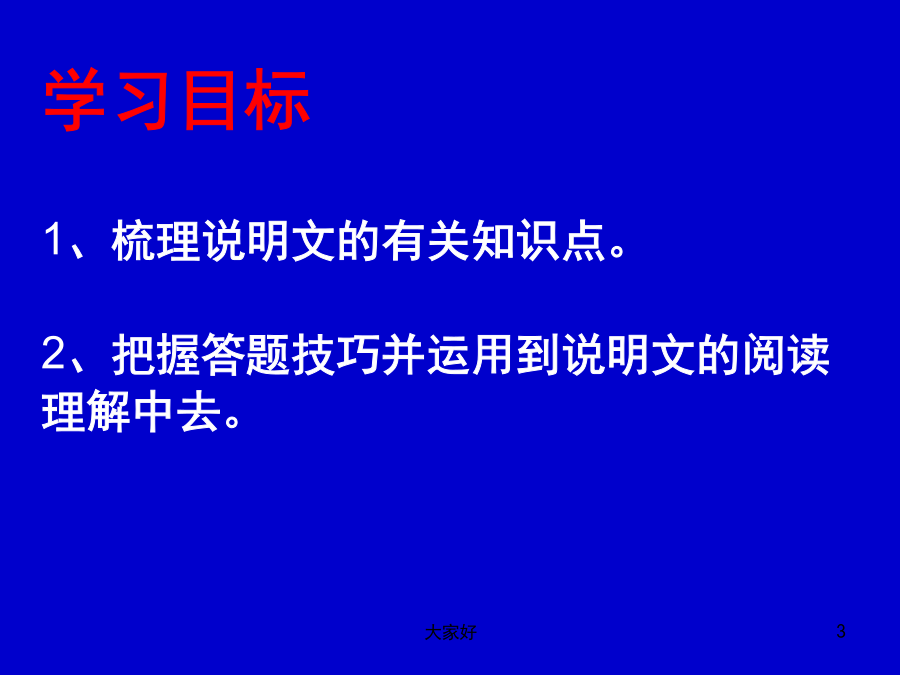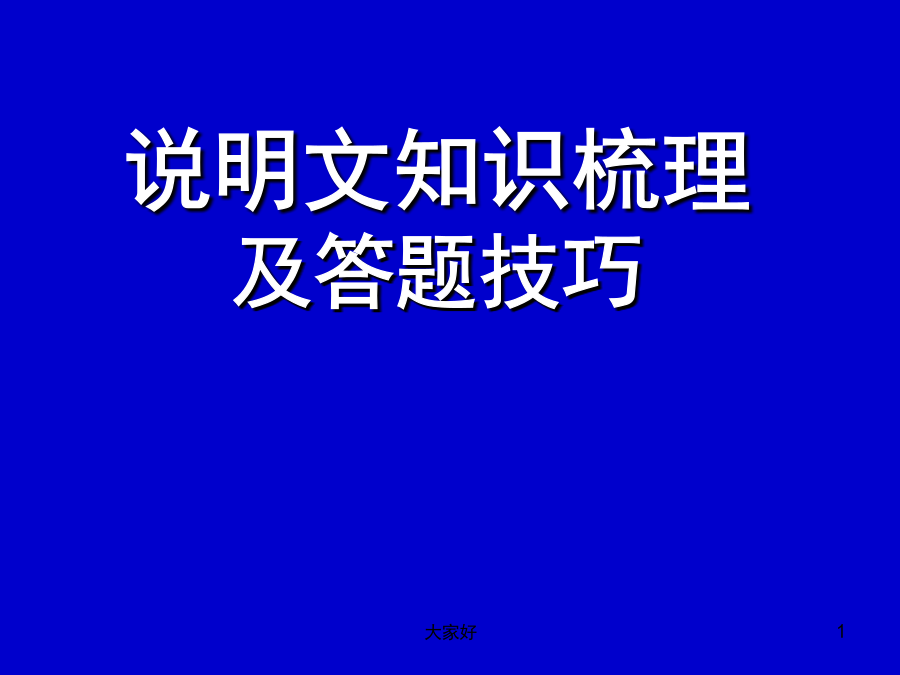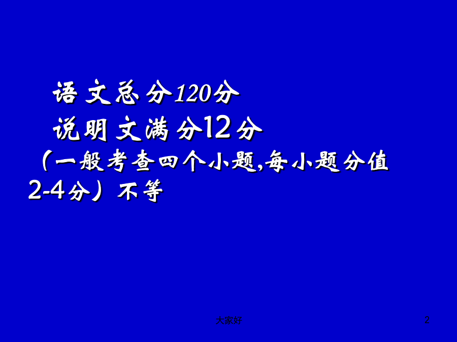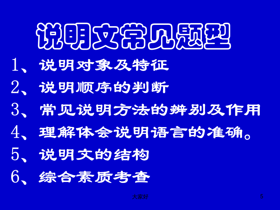 说明文知识梳理及答题技巧 语文总分120分 说明文满分12分 (一般考查四个小题,每小题分值2-4分)不等 学习目标 1、梳理说明文的有关知识点。 2、把握答题技巧并运用到说明文的阅读理解中去。 说明文考什么?说明文常见题型什么是说明文1、说明对象及其特征被说明的事物或被解说的事理就是说明对象。把握说明对象的特征2、说明顺序例1.大殿正中是一个约两米高的朱漆方台,上面安放着金漆雕龙宝座,背后是雕龙屏。方台两旁有6根高大的蟠龙金柱,每根大柱上盘绕着矫健的金龙。仰望殿顶,中央藻井有一条巨大的雕金蟠龙。从龙口里垂下一颗银白色大圆珠,周围环绕着6颗小珠,龙头、宝珠正对着下面的宝座。这是空间顺序。 例2.早在3000多年前,我国就有了文字。这些文字是刻在乌龟壳和扁平的兽骨上 的,所以叫做甲骨文。 正式的书籍,是在两千多年前春秋战国时代出现的。起先,人们把文字写在竹片或木片上,这些木片或竹片叫做简或牍。 春秋末年,还出现了写在绸子上面的书。这种书叫做帛书。这是时间顺序。 例3.永定河上的卢沟桥,修建于公元1189到1192年间。桥长265米,由11个半圆形的石拱组成,每个石拱长度不一,自16米到21.6米。桥宽约8米,路面平坦,几乎与河面平行。说明顺序的归纳方法 抓住显著语言标志: 1.时间顺序的语言标志是:表时间的词; 2.空间顺序的语言标志是:表方位的词; 3.逻辑顺序的语言标志是:首先、其次、因为、 所以等体现逻辑思维的词语。3、说明文的结构 4、说明方法的辨识及作用 说明方法的作用判定例1.赵州桥像一条彩虹矗立在洨河上。 例3.别的动物都吃生的,只有人类才会烧熟了吃。例5.万人大礼堂里面宽七十六米,深六十 米,中部高三十三米,体积达八万六千立方米。分类别:条理清楚地说明了××。 作引用:使说明内容更充实,有说服力。 画图表:使读者一目了然,非常直观形象地说明××。 作诠释:对××加以具体的解释说明,使说明更通俗易懂。 摹状貌:对××加以形象化的描摹,使说明更具体生动形象。 下定义:准确地概括了××的本质特征,使读者对这一概念有较为清晰的认识。 5、说明文语言类型3、限制性词语能否删去? 对策:答:(1)表态(删还是不删)。 (2)定性。如:“比较”“几乎”“相当”等词表程度;“大约”“可能”“左右”等表估计,“多”“有余”等表数量。 (3)若删去,原来什么样的意思就变成了什么样的意思了,不符合实际,太绝对了。 (4)xx词体现了语言的准确性、周密性、科学性。 筛选要理清句子之间的关系;筛选要看分值,力争全面,筛选更要灵活。 实战演练2、第一自然段画线句采用了什么说明方法,其作用是什么?谢谢