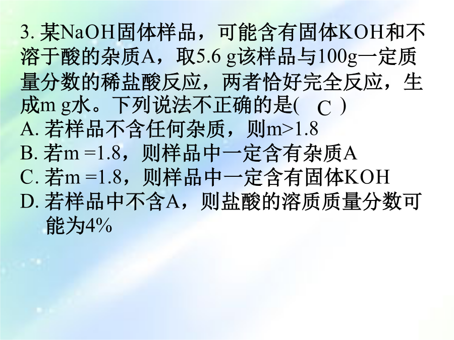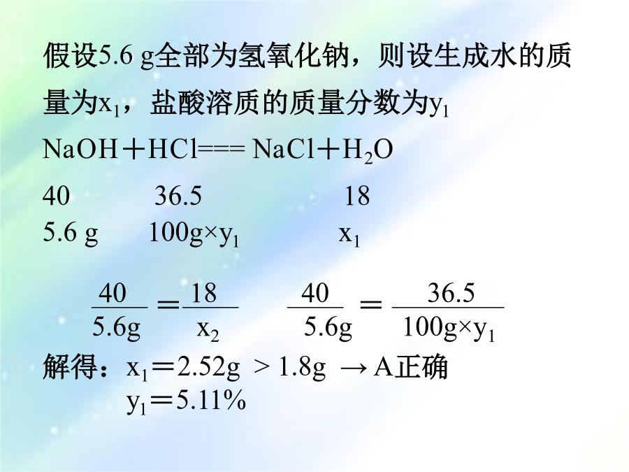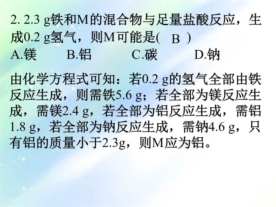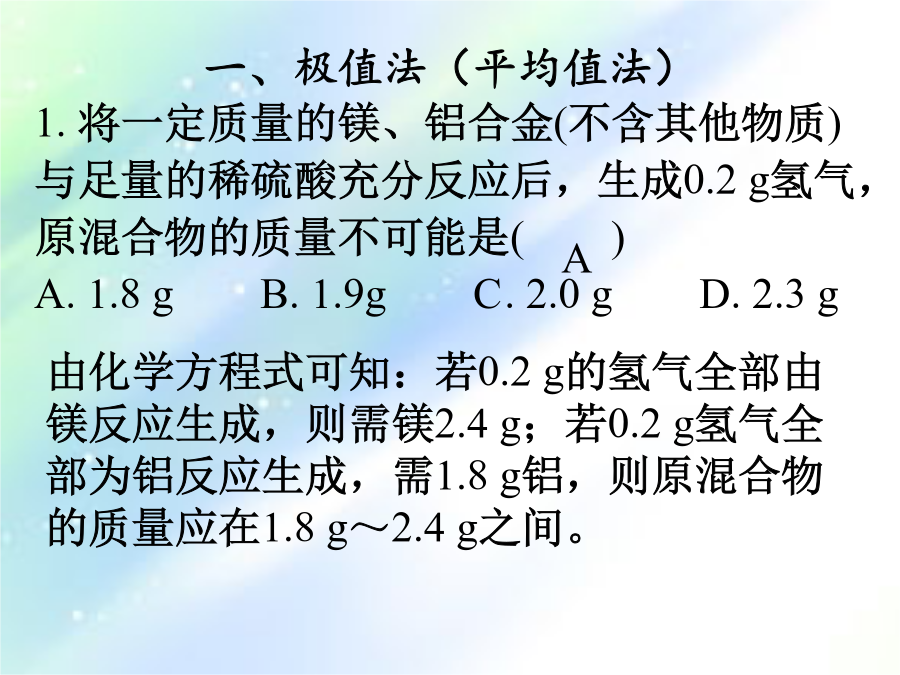 一、极值法(平均值法) 1.将一定质量的镁、铝合金(不含其他物质)与足量的稀硫酸充分反应后,生成0.2g氢气,原混合物的质量不可能是() A.1.8gB.1.9gC.2.0gD.2.3g2.2.3g铁和M的混合物与足量盐酸反应,生成0.2g氢气,则M可能是() A.镁B.铝C.碳D.钠C假设5.6g全部为氢氧化钠,则设生成水的质量为x1,盐酸溶质的质量分数为y1 NaOH+HCl===NaCl+H2O 4036.518 5.6g100g×y1x1 解得:x1=2.52g>1.8g→A正确 y1=5.11%假设样品全部为氢氧化钾,则设生成水的质量为x2,盐酸的溶质质量分数为y2 KOH+HCl===KCl+H2O 5636.518 5.6g100g×y2x2 解得:x2=1.8gy2=3.65%根据上述计算可知,若样品不含任何杂质,生成水2.52g,故A正确;因为全部为NaOH生成水2.52g,所以若生成水1.8g,则说明在样品中一定含有杂质,其中也可能含有KOH,但不能只含有KOH,因为全部为NaOH反应生成水为2.52g,全部为KOH生成的水等于1.8g,若杂质只含KOH,则水在1.8g~2.52g之间,若含有杂质A(不参加反应),则生成的水可能大于、小于或等于1.8g,故B正确、C错误;若不含杂质A,则与NaOH反应的稀盐酸所得HCl溶质质量分数为3.65%~5.11%之间,D正确。二、元素(原子)守恒法2.现有由MgO和MgCO3组成的混合物,其中镁元素的质量分数为48%。取该混合物10g,将其投入适量的稀硫酸中,混合物恰好完全反应,则所得溶液中溶质的质量为() A.12gB.24gC.36gD.48g4.(2017桂林)密闭容器中盛有CH4和O2的混合气体,点燃使其充分反应,CH4全部转化为CO、CO2和H2O,待容器恢复至室温,测得容器内混合气体中碳元素的质量分数为36%。则反应前CH4和O2的质量比为() A.4∶13B.3∶10 C.2∶7D.1∶4设反应后该混合气体的质量为100g,则混合气体中含碳元素100g×36%=36g,则原来甲烷的质量就为36g÷=48g,甲烷中氢元素的质量为48g-36g=12g,所以生成水的质量为12g÷=108g;反应后物质的总质量为100g+108g=208g,则参加反应的氧气的质量为208g-48g=160g,则反应前CH4和O2的质量比为48g:160g=3:10,故选B。5.将一定质量的甲烷和一氧化碳的混合气体在足量的氧气中充分燃烧,将生成物依次通入盛有足量浓硫酸和氢氧化钠溶液的洗气瓶,实验测得装有浓硫酸的洗气瓶增重5.4克;装有氢氧化钠溶液的洗气瓶增重8.8克。混合气体中甲烷和一氧化碳的质量之比为________。设混合气体中甲烷的质量为x,生成二氧化碳的质量为y CH4+2O2CO2+2H2O 164436 xy5.4g x=2.4g y=6.6g(2)由氢氧化钠溶液的质量增加8.8g,可知生成二氧化碳的质量为8.8g,则一氧化碳反应生成的二氧化碳的质量为8.8g-6.6g=2.2g 设生成2.2g二氧化碳需要一氧化碳的质量为z 2CO+O22CO2 5688 z2.2g z=1.4g 故甲烷和一氧化碳的质量比为2.4g:1.4g=12:76.某气体由CH4、C2H2、C2H4中的一种或几种组成,取该气体样品在氧气中完全燃烧,测得生成的二氧化碳和水的质量比为22∶9,则该气体的组成成分中() A.一定含有C2H4B.一定没有CH4 C.可能含有C2H2 D.不可能同时含有CH4、C2H2、C2H4由于二氧化碳和水质量比为22∶9,则碳元素和氢元素的质量比为:(22×):(9×)=6:1,故碳、氢原子的个数比为1:2,当CH4和C2H2分子个数比为1:1时,碳、氢原子个数比可为1:2,气体中不一定含有C2H4,A错;若气体组成为C2H2和C2H4时,任何比例都不能使碳、氢原子个数比达到1:2,B错误;故该气体可能含CH4和C2H2,也可能含CH4、C2H2、C2H4,故C正确,D错误。7.锌粉、铝粉、镁粉的混合物3.8g与一定质量的稀硫酸恰好完全反应,将反应后的混合物蒸发水分得固体硫酸锌、硫酸铝、硫酸镁混合物11g,则反应中生成氢气的质量为() A.0.15gB.0.20gC.0.30gD.0.45g三、差量法 1、18.6gNaOH、Na2CO3的混合固体与100g稀硫酸恰好完全反应,所溶液质量为114.2g,则原固体中含有钠元素的质量为() A.3.3gB.4.6gC.9.2gD.13.8g2.(2017河南)现有NaCl和NaBr的混合物共2.2g,溶于水并加入过量AgNO3溶液后,生成AgCl和AgBr沉淀共4.75g,则原混合物的含钠元素