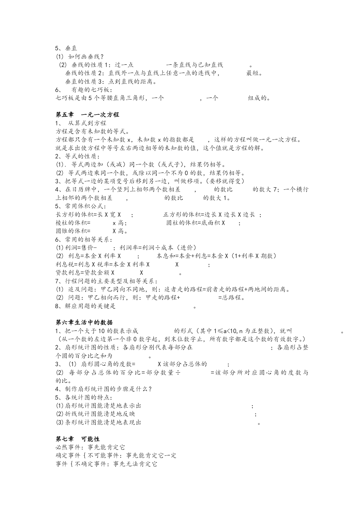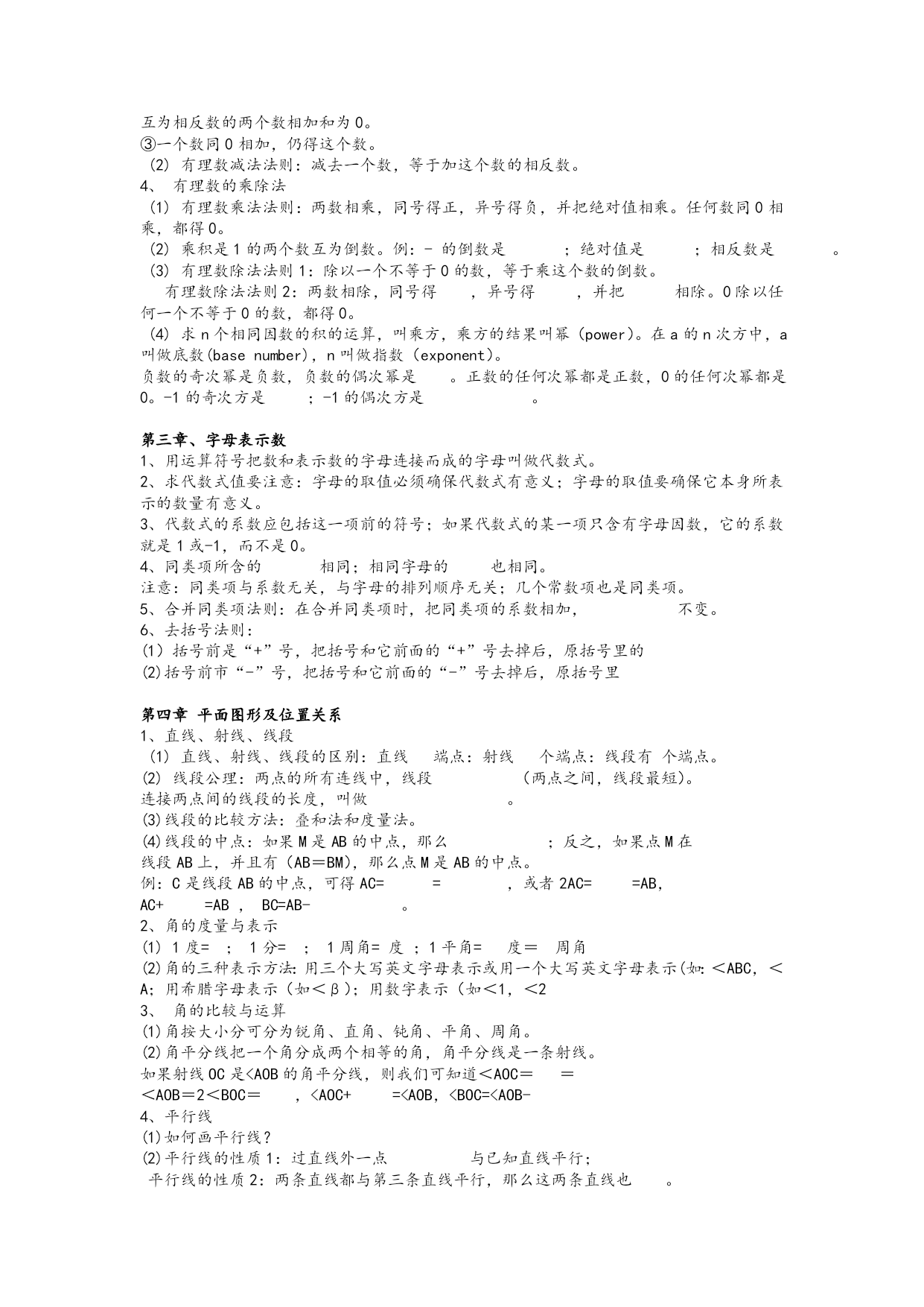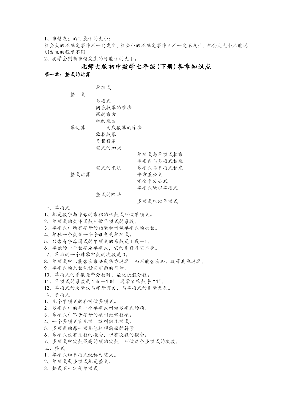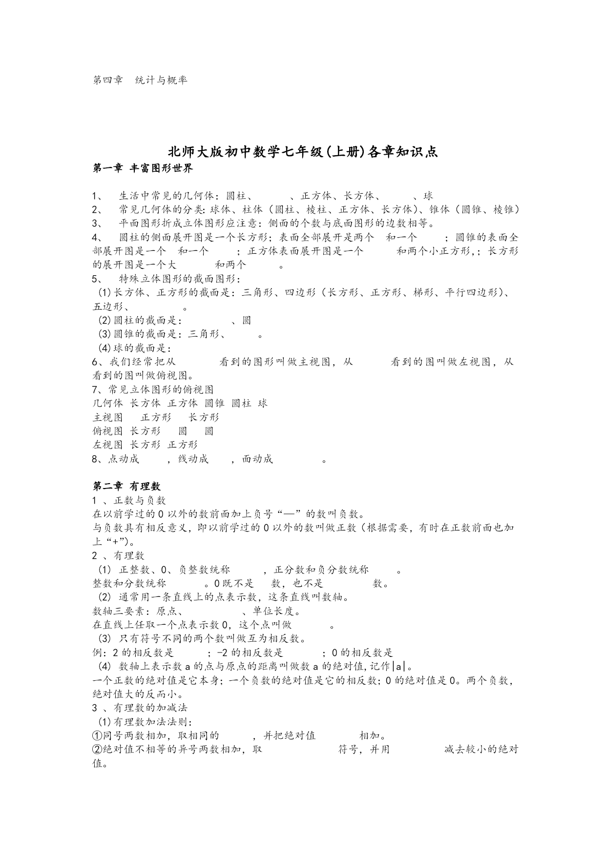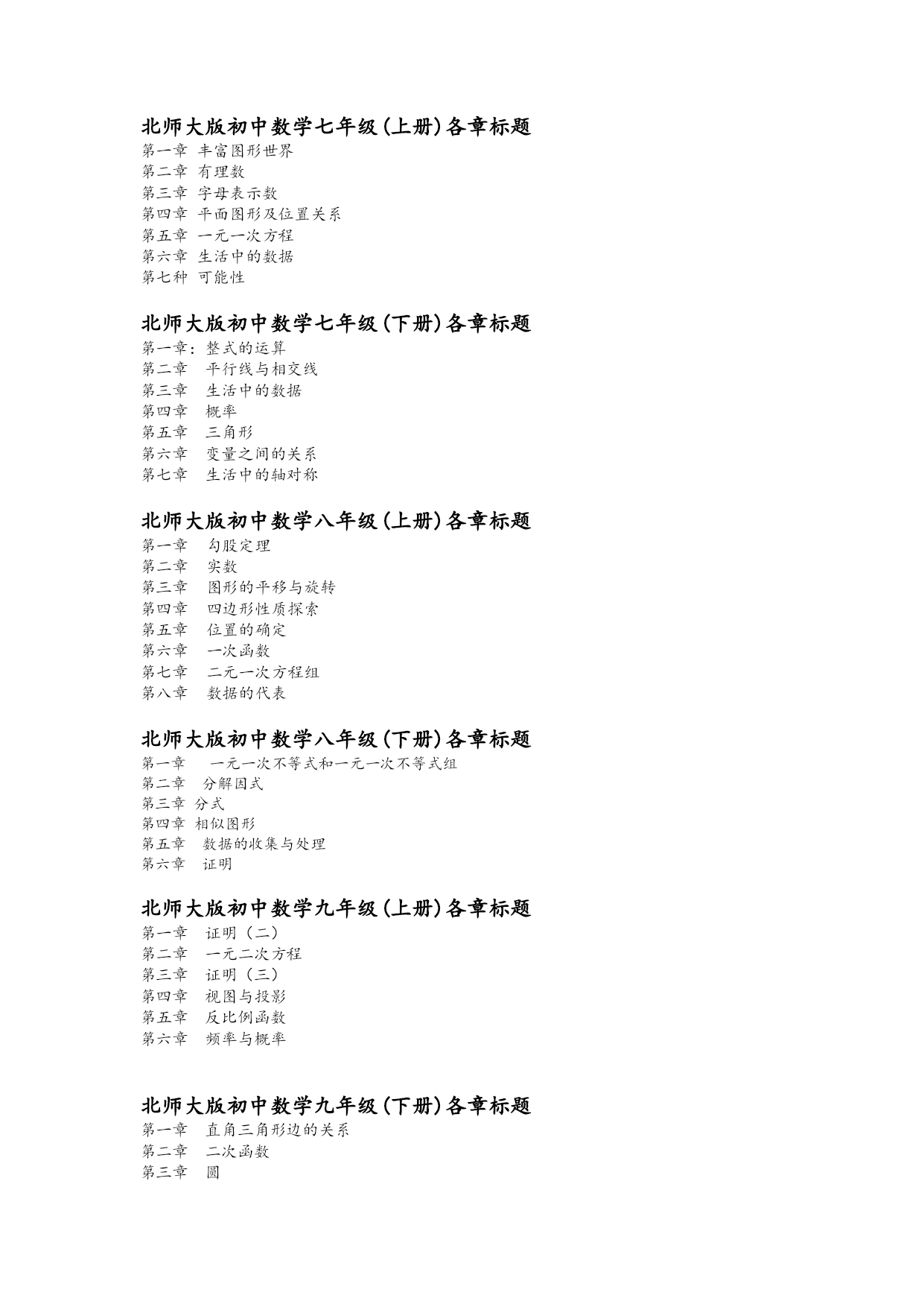 北师大版初中数学七年级(上册)各章标题 第一章丰富图形世界 第二章有理数 第三章字母表示数 第四章平面图形及位置关系 第五章一元一次方程 第六章生活中的数据 第七种可能性 北师大版初中数学七年级(下册)各章标题 第一章:整式的运算 第二章平行线与相交线 第三章生活中的数据 第四章概率 第五章三角形 第六章变量之间的关系 第七章 生活中的轴对称 北师大版初中数学八年级(上册)各章标题 勾股定理 实数 图形的平移与旋转 四边形性质探索 位置的确定 一次函数 二元一次方程组 数据的代表 北师大版初中数学八年级(下册)各章标题 第一章一元一次不等式和一元一次不等式组 第二章分解因式 第三章分式 第四章相似图形 第五章数据的收集与处理 第六章证明 北师大版初中数学九年级(上册)各章标题 第一章证明(二) 第二章一元二次方程 第三章证明(三) 第四章 视图与投影 第五章反比例函数 第六章频率与概率 北师大版初中数学九年级(下册)各章标题 第一章直角三角形边的关系 第二章二次函数 第三章圆 第四章统计与概率 北师大版初中数学七年级(上册)各章知识点 第一章丰富图形世界 1、生活中常见的几何体:圆柱、、正方体、长方体、、球 2、常见几何体的分类:球体、柱体(圆柱、棱柱、正方体、长方体)、锥体(圆锥、棱锥) 3、平面图形折成立体图形应注意:侧面的个数与底面图形的边数相等。 4、圆柱的侧面展开图是一个长方形;表面全部展开是两个和一个;圆锥的表面全部展开图是一个和一个;正方体表面展开图是一个和两个小正方形,;长方形的展开图是一个大和两个。 5、特殊立体图形的截面图形: (1)长方体、正方形的截面是:三角形、四边形(长方形、正方形、梯形、平行四边形)、五边形、。 (2)圆柱的截面是:、圆 (3)圆锥的截面是:三角形、。 (4)球的截面是: 6、我们经常把从看到的图形叫做主视图,从看到的图叫做左视图,从看到的图叫做俯视图。 7、常见立体图形的俯视图 几何体长方体正方体圆锥圆柱球 主视图正方形长方形 俯视图长方形圆圆 左视图长方形正方形 8、点动成,线动成,面动成。 第二章有理数 1、正数与负数 在以前学过的0以外的数前面加上负号“—”的数叫负数。 与负数具有相反意义,即以前学过的0以外的数叫做正数(根据需要,有时在正数前面也加上“+”)。 2、有理数 (1)正整数、0、负整数统称,正分数和负分数统称。 整数和分数统称。0既不是数,也不是数。 (2)通常用一条直线上的点表示数,这条直线叫数轴。 数轴三要素:原点、、单位长度。 在直线上任取一个点表示数0,这个点叫做。 (3)只有符号不同的两个数叫做互为相反数。 例:2的相反数是;-2的相反数是;0的相反数是 (4)数轴上表示数a的点与原点的距离叫做数a的绝对值,记作|a|。 一个正数的绝对值是它本身;一个负数的绝对值是它的相反数;0的绝对值是0。两个负数,绝对值大的反而小。 3、有理数的加减法 (1)有理数加法法则: ①同号两数相加,取相同的,并把绝对值相加。 ②绝对值不相等的异号两数相加,取符号,并用减去较小的绝对值。 互为相反数的两个数相加和为0。 ③一个数同0相加,仍得这个数。 (2)有理数减法法则:减去一个数,等于加这个数的相反数。 4、有理数的乘除法 (1)有理数乘法法则:两数相乘,同号得正,异号得负,并把绝对值相乘。任何数同0相乘,都得0。 (2)乘积是1的两个数互为倒数。例:-的倒数是;绝对值是;相反数是。 (3)有理数除法法则1:除以一个不等于0的数,等于乘这个数的倒数。 有理数除法法则2:两数相除,同号得,异号得,并把相除。0除以任何一个不等于0的数,都得0。 (4)求n个相同因数的积的运算,叫乘方,乘方的结果叫幂(power)。在a的n次方中,a叫做底数(basenumber),n叫做指数(exponent)。 负数的奇次幂是负数,负数的偶次幂是。正数的任何次幂都是正数,0的任何次幂都是0。-1的奇次方是;-1的偶次方是。 第三章、字母表示数 1、用运算符号把数和表示数的字母连接而成的字母叫做代数式。 2、求代数式值要注意:字母的取值必须确保代数式有意义;字母的取值要确保它本身所表示的数量有意义。 3、代数式的系数应包括这一项前的符号;如果代数式的某一项只含有字母因数,它的系数就是1或-1,而不是0。 4、同类项所含的相同;相同字母的也相同。 注意:同类项与系数无关,与字母的排列顺序无关;几个常数项也是同类项。 5、合并同类项法则:在合并同类项时,把同类项的系数相加,不变。 6、去括号法则: (1)括号前是“+”号,把括号和它前面的“+”号去掉后,原括号里的 (2)括号前市“-”号,把括号和它前面的“-”号去掉后,原括号里 第四章平面图形及位置关系 1、直线