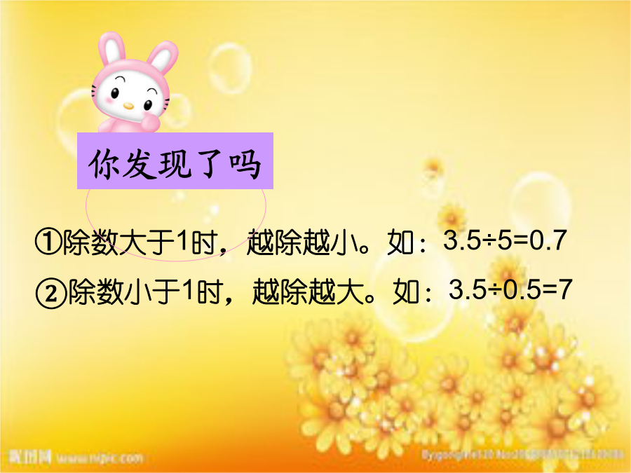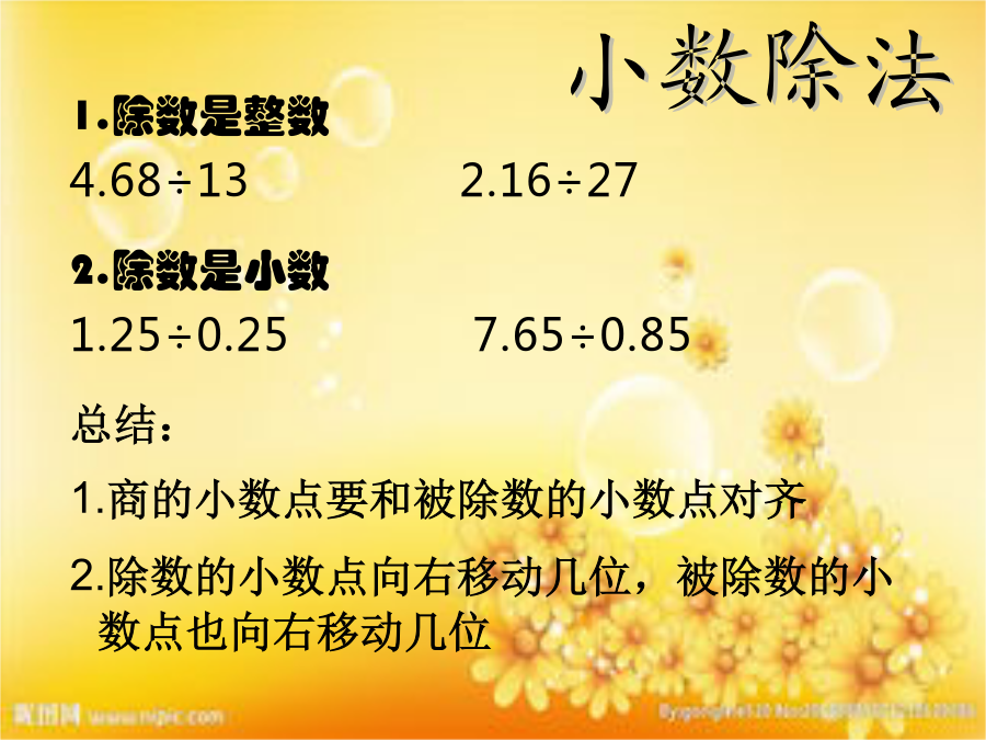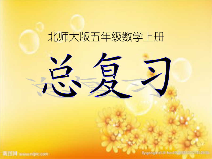 北师大版五年级数学上册数与代数1.除数是整数 4.68÷132.16÷27 2.除数是小数 1.25÷0.257.65÷0.85 总结: 1.商的小数点要和被除数的小数点对齐 2.除数的小数点向右移动几位,被除数的小数点也向右移动几位①除数大于1时,越除越小。如:3.5÷5=0.7 ②除数小于1时,越除越大。如:3.5÷0.5=7商的近似数和循环小数:抢答题!抢答题!数的分类80、-10、85、、-19、0.52、、0、75、 -36、13、-0.95、12、、4.7、-104、561、质数 2、合数 3、奇数 4、偶数 5、因数 6、倍数 一个数只有1和它本身两个因数,这个数叫做质数。一个数除了1和它本身以外还有别的因数,这个数叫做合数。在2,5,36,15,21,1,17,4,23,51,25,27,47,这数中不是2的倍数的数叫奇数。我是小法官因数1824平分秋色十拿九稳 天方夜谭百发百中真分数:分子都比分母小;分数值小于1 假分数:分子比分母大,或者分子与分母相等;分数值大于或等于1。 带分数:由整数和真分数两部分组成的;分 数值大于1分数与除法有什么关系?试一试 分数的分子和分母都乘或除以相同的数(0除外),分数的大小不变。小猴子过河比较下列各组两个分数的大小。谁的占地面积大?说出每组分数的公分母,再进行通分。抢答题!抢答题!空间与图形第二单元轴对称和平移抢答题!抢答题!1.什么叫面积?常用的面积单位有哪些?S=a×h三角形的面积=÷2通过以上实验,你发现了什么?S=(a+b)h÷2一个堤坝的横截面如下图,它的面积是多少?求下列图形的面积。(每个小方格 的边长表示1cm)统计与可能性一定不可能的事情用0表示。 一定可能的事情用1表示。下面3盆花中,各有3朵要开放。(1)月亮从西边出来的可能性是1。() (2)盒子里有黑球1个、白球3个、黄球3个,任意摸一个,摸到黄球的可能性是3/7。() (3)0乘任何数得0的可能性为0。() (4)一粒有数字1—6的色子,任意投掷,出现数字1的可能性为1/5。()