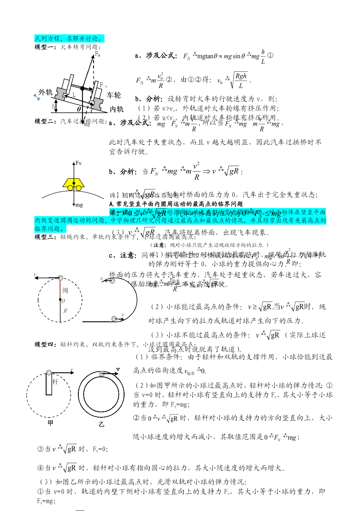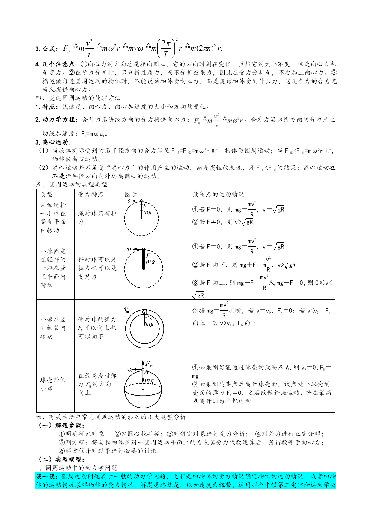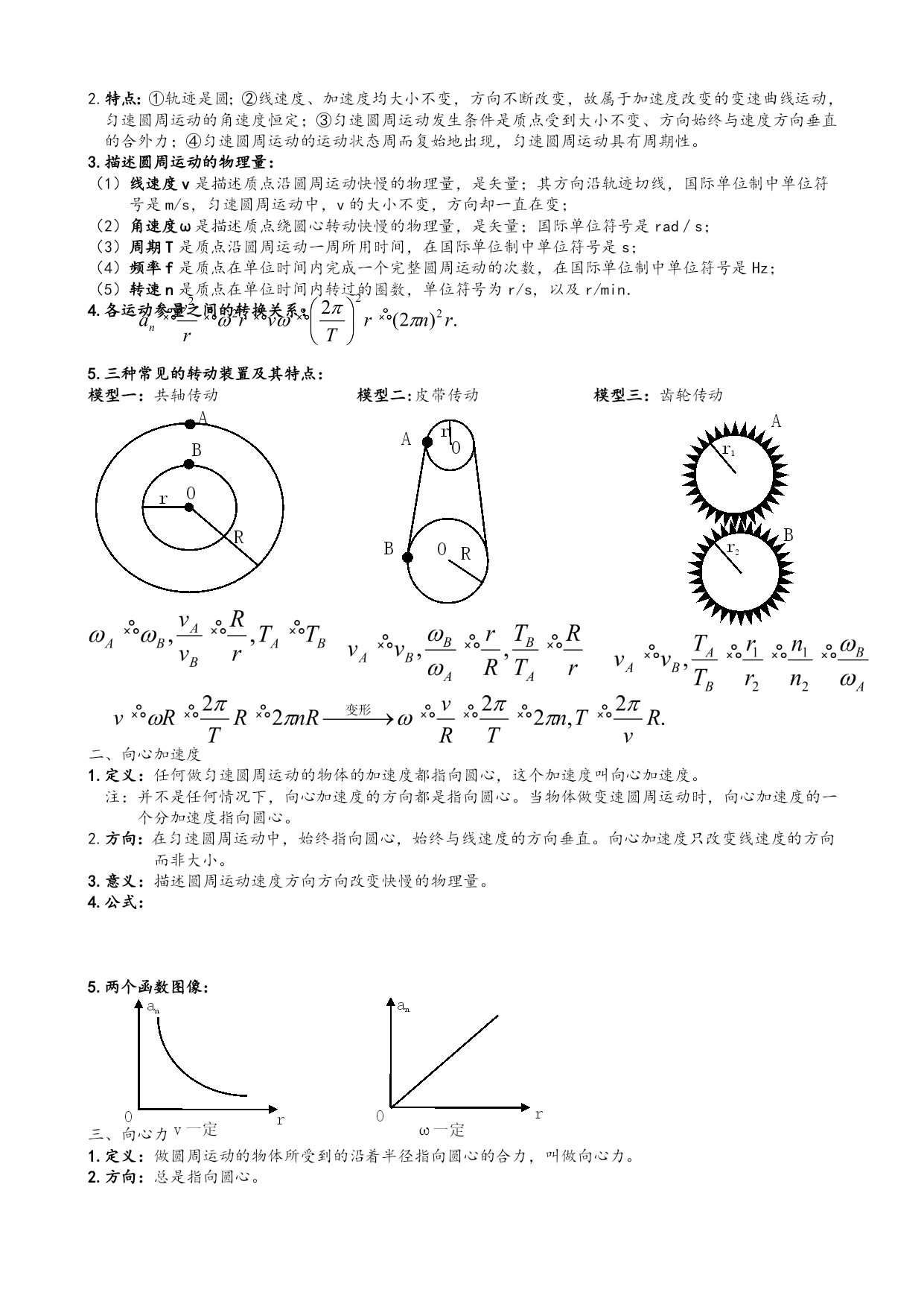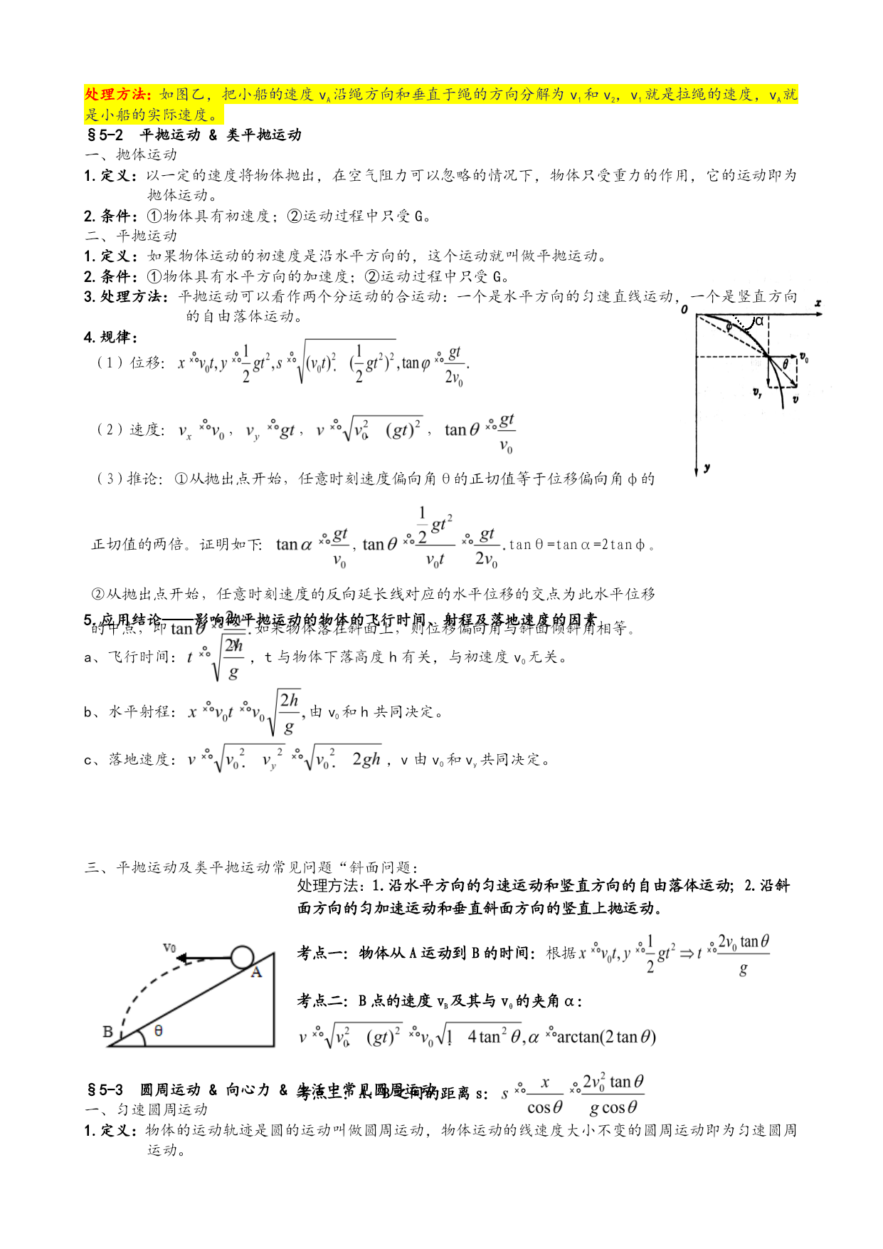 必修二物理知识点 第五章平抛运动 §5-1曲线运动&运动的合成与分解 一、曲线运动 1.定义:物体运动轨迹是曲线的运动。 2.条件:运动物体所受合力的方向跟它的速度方向不在同一直线上。 3.特点:①方向:某点瞬时速度方向就是通过这一点的曲线的切线方向。 ②运动类型:变速运动(速度方向不断变化)。 ③F合≠0,一定有加速度a。 ④F合方向一定指向曲线凹侧。 P 蜡块的位置 v vx vy 涉及的公式: θ ⑤F合可以分解成水平和竖直的两个力。 运动描述——蜡块运动 二、运动的合成与分解 合运动与分运动的关系:等时性、独立性、等效性、矢量性。 互成角度的两个分运动的合运动的判断: ①两个匀速直线运动的合运动仍然是匀速直线运动。 ②速度方向不在同一直线上的两个分运动,一个是匀速直线运动,一个是匀变速直线运动,其合运动是 匀变速曲线运动,a合为分运动的加速度。 ③两初速度为0的匀加速直线运动的合运动仍然是匀加速直线运动。 ④两个初速度不为0的匀加速直线运动的合运动可能是直线运动也可能是曲线运动。当两个分运动的初 速度的和速度方向与这两个分运动的和加速度在同一直线上时,合运动是匀变速直线运动,否则即为 曲线运动。 三、有关“曲线运动”的两大题型 小船过河问题 v v水 v船 θ , d d v v水 v船 θ 当v水<v船时,xmin=d, , 模型一:过河时间t最短:模型二:直接位移x最短:模型三:间接位移x最短: A v水 v船 θ 当v水>v船时,, , θ v船 d 绳杆问题(连带运动问题) 1、实质:合运动的识别与合运动的分解。 2、关键:①物体的实际运动是合速度,分速度的方向要按实际运动效果确定;②沿绳(或杆)方向的分 速度大小相等。 模型四:如图甲,绳子一头连着物体B,一头拉小船A,这时船的运动方向不沿绳子。 B O O A vA θ v1 v2 vA 甲 乙 甲乙 处理方法:如图乙,把小船的速度vA沿绳方向和垂直于绳的方向分解为v1和v2,v1就是拉绳的速度,vA就是小船的实际速度。 §5-2平抛运动&类平抛运动 一、抛体运动 1.定义:以一定的速度将物体抛出,在空气阻力可以忽略的情况下,物体只受重力的作用,它的运动即为 抛体运动。 2.条件:①物体具有初速度;②运动过程中只受G。 二、平抛运动 1.定义:如果物体运动的初速度是沿水平方向的,这个运动就叫做平抛运动。 α 2.条件:①物体具有水平方向的加速度;②运动过程中只受G。 3.处理方法:平抛运动可以看作两个分运动的合运动:一个是水平方向的匀速直线运动,一个是竖直方向 位移: 速度:,,, 推论:①从抛出点开始,任意时刻速度偏向角θ的正切值等于位移偏向角φ的正切值的两倍。证明如下:,tanθ=tanα=2tanφ。 ②从抛出点开始,任意时刻速度的反向延长线对应的水平位移的交点为此水平位移的中点,即如果物体落在斜面上,则位移偏向角与斜面倾斜角相等。 的自由落体运动。 4.规律: 5.应用结论——影响做平抛运动的物体的飞行时间、射程及落地速度的因素 飞行时间:,t与物体下落高度h有关,与初速度v0无关。 水平射程:由v0和h共同决定。 落地速度:,v由v0和vy共同决定。 三、平抛运动及类平抛运动常见问题“斜面问题: 处理方法:1.沿水平方向的匀速运动和竖直方向的自由落体运动;2.沿斜面方向的匀加速运动和垂直斜面方向的竖直上抛运动。 考点一:物体从A运动到B的时间:根据 考点二:B点的速度vB及其与v0的夹角α: 考点三:A、B之间的距离s: §5-3圆周运动&向心力&生活中常见圆周运动 一、匀速圆周运动 1.定义:物体的运动轨迹是圆的运动叫做圆周运动,物体运动的线速度大小不变的圆周运动即为匀速圆周 运动。 特点:①轨迹是圆;②线速度、加速度均大小不变,方向不断改变,故属于加速度改变的变速曲线运动, 匀速圆周运动的角速度恒定;③匀速圆周运动发生条件是质点受到大小不变、方向始终与速度方向垂直 的合外力;④匀速圆周运动的运动状态周而复始地出现,匀速圆周运动具有周期性。 3.描述圆周运动的物理量: (1)线速度v是描述质点沿圆周运动快慢的物理量,是矢量;其方向沿轨迹切线,国际单位制中单位符 号是m/s,匀速圆周运动中,v的大小不变,方向却一直在变; (2)角速度ω是描述质点绕圆心转动快慢的物理量,是矢量;国际单位符号是rad/s; (3)周期T是质点沿圆周运动一周所用时间,在国际单位制中单位符号是s; (4)频率f是质点在单位时间内完成一个完整圆周运动的次数,在国际单位制中单位符号是Hz; (5)转速n是质点在单位时间内转过的圈数,单位符号