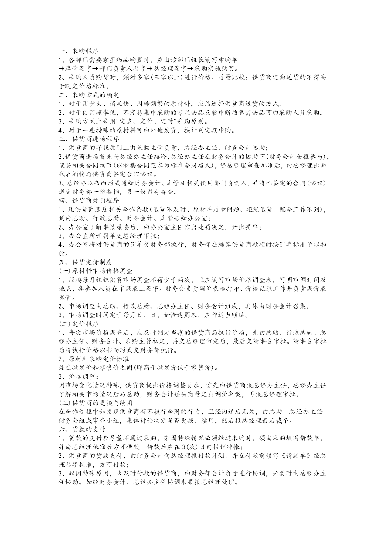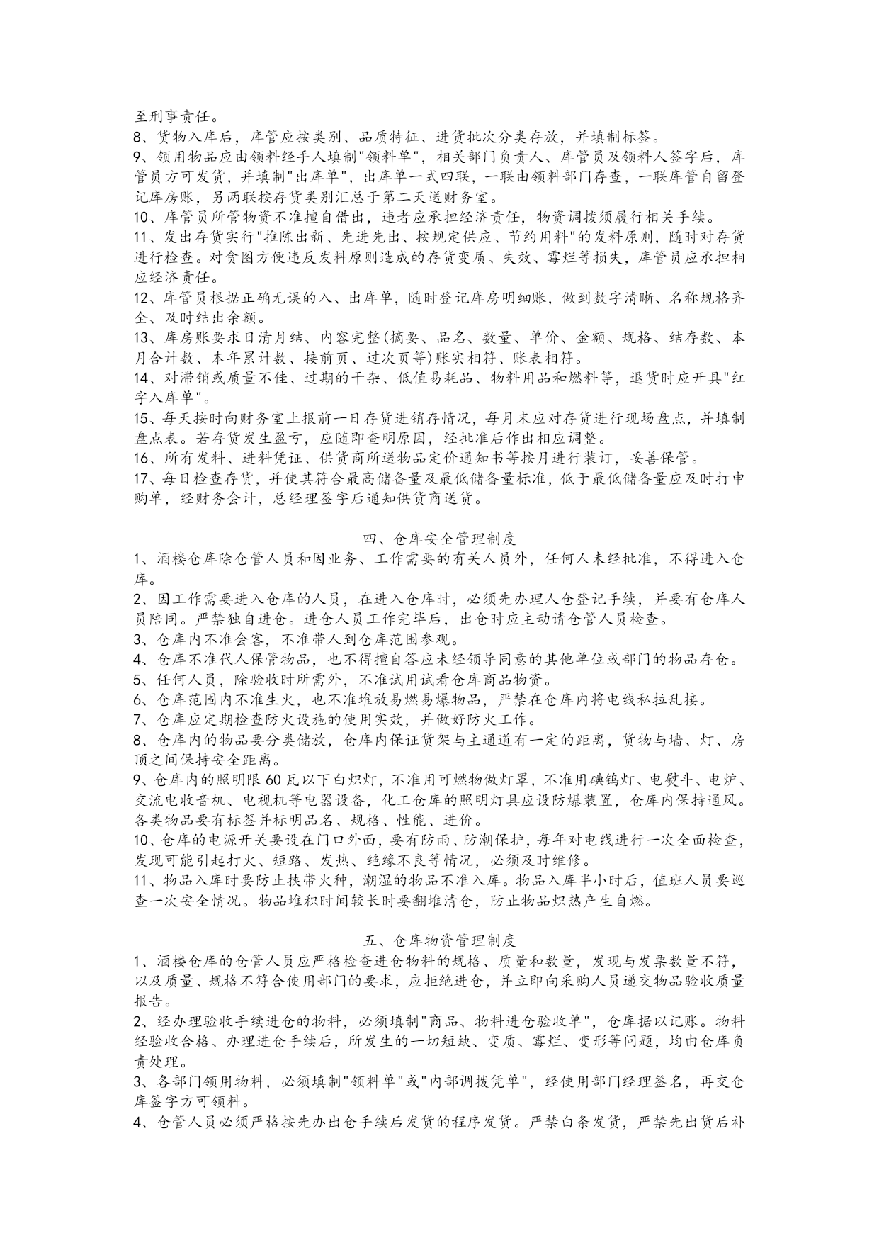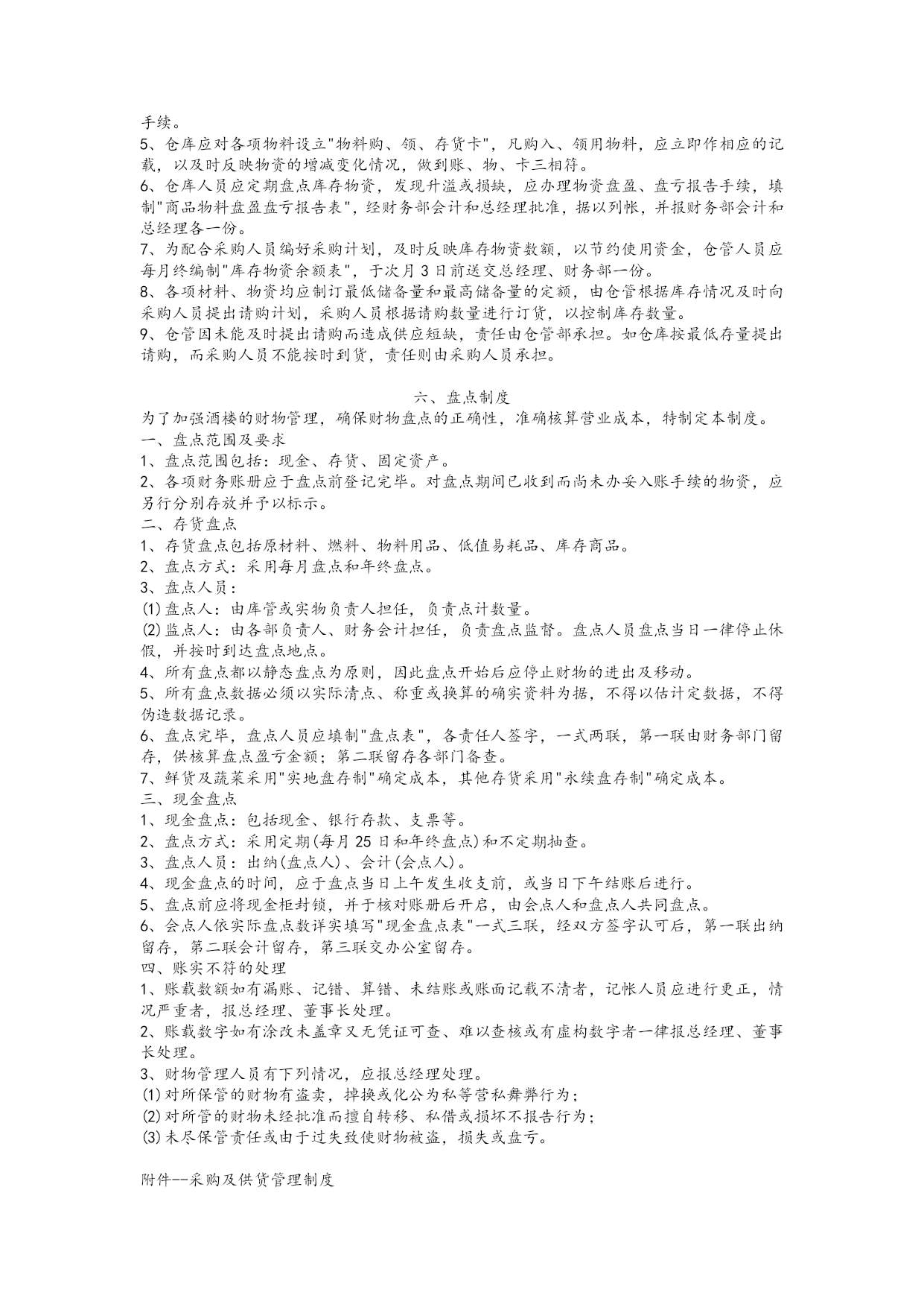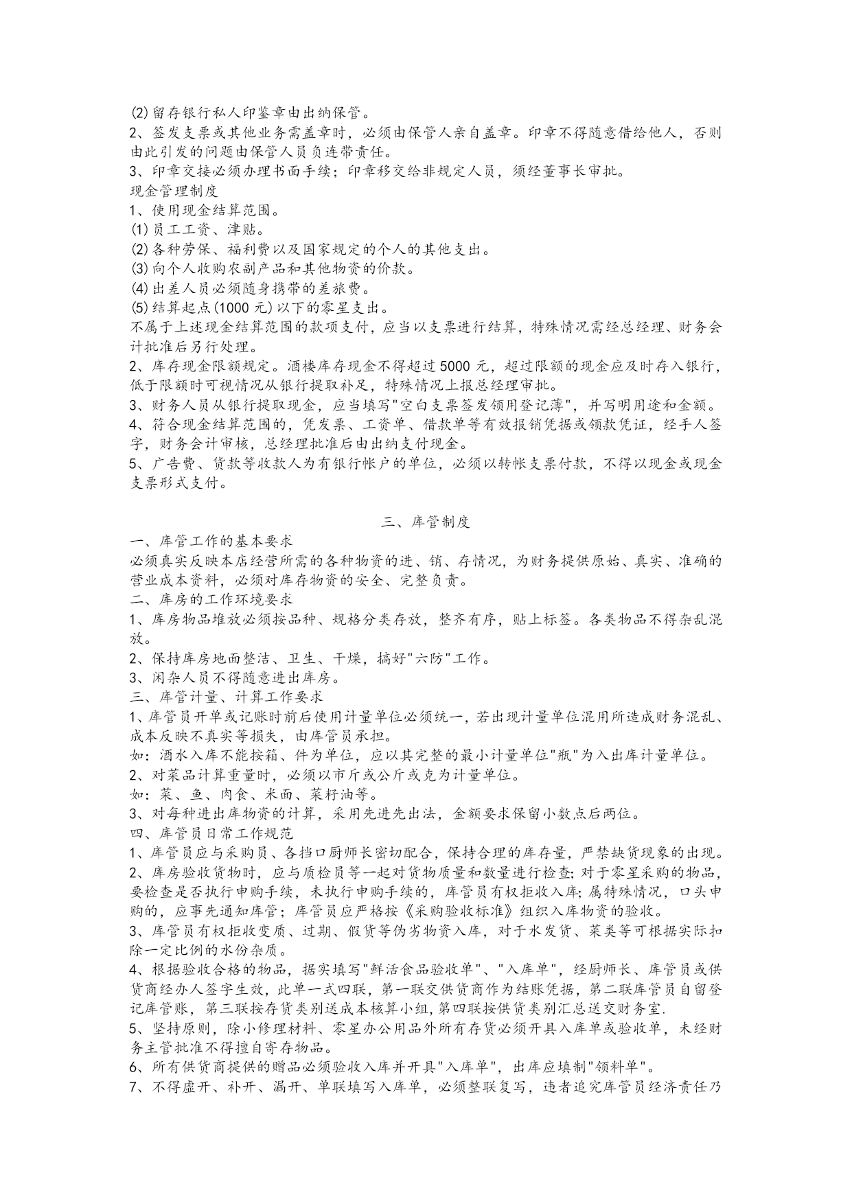 餐饮服务业财务管理制度【实用版】 一、报销制度 1、报销人员将有关发票粘贴附在"费用报销单"或"货款结算凭据"后,小张票据(如车票)应按面值大小分类呈鱼鳞状附在粘贴联上,大张票据不能胶水粘贴,用大头针或回形针别好为宜。 2、根据原始单据分类按规定如实正确填写"费用报销单"或"货物结算凭据",由部门负责人审查并签署意见后交财务会计审核其附件及内容的完整性、票据的合法性、填写的规范性等,再交总经理审核并签署报销意见:"同意报销(支付)"、"同意报销(支付)多少元"、"不同意报销(支付)"字样。总经理签字时,不得只签姓名,不签意见。 3、财务会计有权对违规超支费用和不真实的票据不予报销。 4、出纳凭上述签字齐备的"费用报销单"或"货款结算凭据"支付货币资金。 5、总经理报销费用必须经董事长或董事长授权人签字认可,其所报销费用不得让他人代报,否则财务室有权不予报销;总经理助理报销费用,必须经总经理签字认可,否则不予报销。若有违反,对报销人、出纳各处以报销金额20%(但不低于50元/人)的罚款,并退回违规所得。 6、报销程序。 经办人填写"费用报销单"或"货款结算凭据"--部门负责人签字--财务会计签字--总经理签字--出纳复核报销。 借款制度 为了加速酒楼流动资金周转,保证日常经营的正常开支,规范借款程序,特制定本制度。 1、采购员和吧台收银员实行定额备用金制度,采购员备用金定额为2000元,吧台收银员备用金定额为3000元。 2、借款实行定额控制,前账不清、后账不借的原则。 3、采购人员应根据批准后的申购单采购货物,当货物金额超出其定额备用金时,应正确填写借款单,经财务会计审定、总经理签字批准后在出纳处借支。 4、其他人员因公借款时,应填写借款单,经部门经理签字,财务会计审核,总经理签字批准。 5、因公办事或出差人员凡在财务室有借款的,不得逾期报账或公款私用,事完三天内应清算自已的账务,三天后财务室将催促报销,否则财务室有权在发工资时抵扣借款。 6、酒楼原则上不办理员工私人借款,特殊情况可在员工月工资标准内办理,但应控制人数、时间,且部门负责人负连带责任;员工私人借款应在30日内归还。 7、借款程序。 填写借款单--财务会计审核--总经理批准--出纳处领款 二、支票、发票、印鉴管理制度 (一)、支票管理 1、酒楼必须在当地信誉较好的银行开立账户,办理存款、取款、转账业务。 2、为保证资金的安全,不得在同一银行开立几个账户,同一酒楼的两个银行账户之间不得转账结算。 3、不得出租、出借或转让银行账户给其他单位和个人使用。 4、支票由出纳员保管(放入保险柜)。支票使用时须填写"空白支票签发领用登记薄",填写收款人、日期、用途、金额、支票号码,经批准后加盖印章,领用人签字备查。 5、对于填写错误的支票,必须加盖"作废"戳记,与存根一起装订在当月的凭证内,并在银行存款日记帐中作相应登记。 6、不得签发空白支票和远期支票。 (二)、发票管理 1.建立发票领用登记表,领用发票时须由领用人签字。 2.出纳员应随时掌握发票购、用、存情况,避免发票短缺影响正常营业。 (三)、印鉴管理 1、各种印章必须由各责任人妥善保管,严格按照规定用途使用。 (1)财务专用章由财务会计保管。 (2)留存银行私人印鉴章由出纳保管。 2、签发支票或其他业务需盖章时,必须由保管人亲自盖章。印章不得随意借给他人,否则由此引发的问题由保管人员负连带责任。 3、印章交接必须办理书面手续;印章移交给非规定人员,须经董事长审批。 现金管理制度 1、使用现金结算范围。 (1)员工工资、津贴。 (2)各种劳保、福利费以及国家规定的个人的其他支出。 (3)向个人收购农副产品和其他物资的价款。 (4)出差人员必须随身携带的差旅费。 (5)结算起点(1000元)以下的零星支出。 不属于上述现金结算范围的款项支付,应当以支票进行结算,特殊情况需经总经理、财务会计批准后另行处理。 2、库存现金限额规定。酒楼库存现金不得超过5000元,超过限额的现金应及时存入银行,低于限额时可视情况从银行提取补足,特殊情况上报总经理审批。 3、财务人员从银行提取现金,应当填写"空白支票签发领用登记薄",并写明用途和金额。 4、符合现金结算范围的,凭发票、工资单、借款单等有效报销凭据或领款凭证,经手人签字,财务会计审核,总经理批准后由出纳支付现金。 5、广告费、货款等收款人为有银行帐户的单位,必须以转帐支票付款,不得以现金或现金支票形式支付。 三、库管制度 一、库管工作的基本要求 必须真实反映本店经营所需的各种物资的进、销、存情况,为财务提供原始、真实、准确的营业成本资料,必须对库存物资的安全、完整负责。 二、库房的工作环境要求 1、库房物品堆放必须按品种、规格分类存放,整齐有序,贴上标签。各类物品不得杂乱混放。