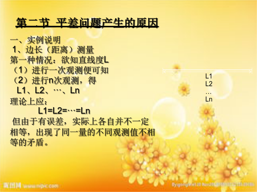 第一章绪论第一节测量平差的重要性线性代数 微分 级数第二节平差问题产生的原因第二种情况:欲得L1、L2、L3的长度 (1)观测了L1、L2,则 L3=L1-L2 (2)也可直接观测L1、L2、L3 理论上应: L1=L2+L3 实际上,由于观测值有误差,上式 不一定成立,而是: L1≠L2+L3 于是产生了矛盾。 2、三角测量:欲知三角形三内角L1、 L2、L3的大小 (1)观测了三角形三内角L1、L2,则 L3=180°-L1-L2 (2)观测了三角形三内角L1、L2、L3,由于有误差,一般情况下: L1+L2+L3≠180° 存在闭合差(观测值与理论值之差) w=L1+L2+L3-180° 出现了三角形三内角观测值之和不等于 180°的矛盾。二、测量平差产生的原因1、示例 设对某三角形三内角进行观测,得观测值: L1=58°30′40″,L2=61°20′10″,L3=60°08′58″ ω=(L1+L2+L3)-1800=-12″ 若将L1,L2,L3分别加上一个改正数v1,v2,v3,使得: (L1+v1)+(L2+v2)+(L3+v3)=1800 即:(v1+v2+v3)+(L1+L2+L3-1800)=0 亦即:v1+v2+v3-12″=0满足方程的v1,v2,v3有无限多组,那么,按什么准 则从无限多解当中选取合理的解呢? 根据最优化数学方法,一般按如下准则,也就是最 小二乘准则来解决该问题。2、平差原则—最小二乘原理测量平差数学模型包括函数模型和随机模型,平差的基本模型有以下四种:3)间接平差模型(高斯-马尔柯夫模型)最基本模型4)、附有限制条件的间接平差法4、测量平差的核心内容6、测量平差中要弄清的几个重要问题4)、协方差传播律和协因数传播律是指什么?设向量F,W分别是随机向量X,Y的以下线性函数: F=AX+BY W=CX+DY 试求F和W的协方差阵D(XY),并由此导出各种特殊情况下求方差和协方差的公式。 5)、VTPV=min平差原则是怎样导出来的?按此原则求出的估值L,X有什么优越性?或为什么称L,X为最佳估计?什么是最佳估计?怎样证明它们是最佳估计(建议对各种不同的平差模型进行证明)。 6)、以下单位权方差估值公式: 是怎么求出来的。为什么从观测值方差阵中任意取出一个公因子都是单位权方差。7)、如何证明以下分布: 怎么由它构造t,F统计量,它们有什么作用。 8)、一个点的误差椭圆说明什么,怎么计算误差椭圆的有关参数。四、测量平差产生的历史五、测量平差的发展六、本课程应掌握的主要内容七、学习方法第三节、补充知识(2)若m=n,即行数与列数相同,称A为方阵。元素a11、a22……ann称为对角元素。矩阵的基本运算:二、矩阵的转置矩阵转置的性质:三、矩阵的逆矩阵的逆的性质矩阵求逆方法:矩阵求逆方法八、二次型和正定阵的函数,记为概率与数理统计内容第二章误差分布及精度指标第一节概述未知参数真值向量1、测量平差的研究对象——观测误差 观测数据:用测绘仪器工具或其他手段获取 的反映地球及其它实体的空间分布 有关信息的数据。 任何量测数据不可避免地含有误差,如何处理含有误差的测量数据便成了一门研究课题。2、产生误差的原因3、误差的分类误差的分类三、误差构成的四种情况一、正态分布2、标准正态分布 若随机变量X的数学期望u=0,标准差σ=1,则称X服从标准正态分布,记为X~(0,1)。二)、n维正态分布 设n维随机向量X=(x1,x2,···,xn)T服从正态分布,其联合分布密度函数为:观测值:对某量观测所得的值,一般用Li表示。观测向量:若进行n次观测,观测值:L1、L2……Ln可表示为:2、偶然误差的特性例2:在相同的条件下独立观测了421个三角形的全部内角,每个三角形内角之和应等于180度,但由于误差的影响往往不等于180度,计算各内角和的真误差,并按误差区间的间隔0.2秒进行统计。1)、有界性:在一定条件下的有限观测值中,其误差的绝对值不会超过一定的界限;3、偶然误差的分布密度函数 设偶然误差△的分布密度函数为f(△),由性质3可知f(△)是△的 偶函数,由性质2可知,在-∞~0区间f(△)是增函数,在0~∞ 区间是减函数,则可构造函数:设偶然误差的方差D(△)=σ2:提示:观测值定了,其分布也就确定了,因此一组观测值对应相同的分布。不同的观测序列,分布不同。但其极限分布均是正态分布。第三节衡量精度的指标一、方差/中误差方差的估值:二、平均误差则得平均误差与中误差的关系:三、或然误差ρ 误差出现在(-ρ,ρ)之间的概率等于1/2,即四、极限误差第五节精度、准确度与精确度1)、协方差当X、Y间互不相关,对于正态分布而言,相互独立时对于向量X=[X1,X2,……Xn]T,将其元素间的方差、协方差阵表