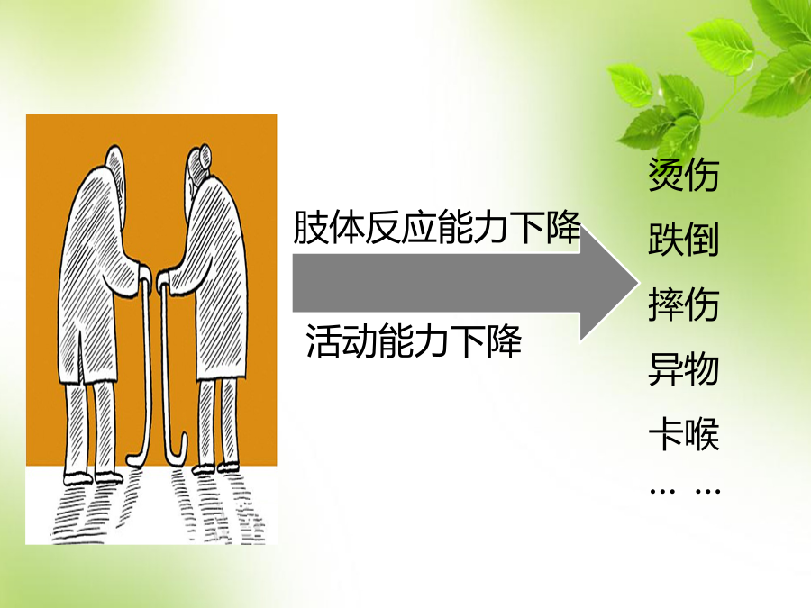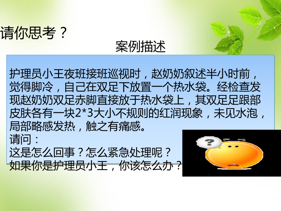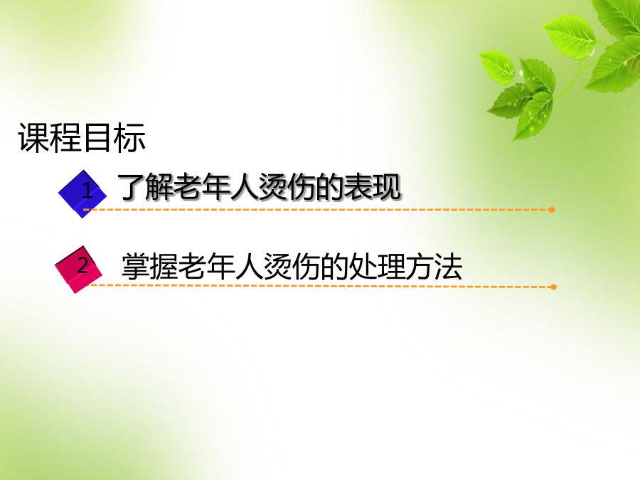 第二章基础护理1.课程引入 课程目标请你思考?2.烫伤的概述2.1烫伤的定义2.2烫伤的表现2.3烫伤的处理原则2.4各类烫伤的处理原则 (1)I度烫伤 立即将伤处浸在凉水中,进行“冷却治疗”,它有降温、减轻余热损伤、减轻肿胀、止痛、防止起泡等作用,如有冰块,把冰块敷于伤处效果更佳。“冷却”30分钟左右就能完全止痛。 随后用鸡蛋清或万花油或烫伤膏涂于烫伤部位,3~5天便可自愈。2.4各类烫伤的处理原则3.烫伤应急处理要求正确应用“冷却治疗” 3.1“冷却治疗”在烫伤后要立即进行,因为5分钟内烫伤的余热还继续损伤肌肤,过了5分钟后才浸泡在冷水中,则只能起到止痛作用,不能保证不起水泡。 3.2若烫伤部位不是手或足,不能将伤处浸泡在水中进行“冷却治疗”时,则可将受伤部位用毛巾包好,再在毛巾上浇水,或用冰块敷效果可能更佳。3.3“冷却治疗”浸泡时间越早、水温越低,效果越好,但水温不能低于5℃,以免冻伤。 3.4若伤处水泡已破,不可浸泡,以防感染。可用无菌纱布或干净手帕包裹冰块,冷敷伤处周围,以减轻疼痛,并立即报告就医。4.初步应对老年人烫伤4.1技能操作步骤与流程(1)工作准备 1)迅速脱离热源 迅速协助老年人脱离热源, 有衣物者,切勿急于立即脱去衣物,应用剪刀剪开脱下。 2)物品准备 根据烫伤部位备物:脸盆或冰块或冷清水,毛巾或手帕若干,鸡蛋清或烫伤膏,记录本,笔。(2)冷却治疗 1)若穿着衣服或鞋袜的部位被烫伤,先用冷水隔着衣裤或鞋袜浇到伤处或周围,然后再剪开衣服并脱去。 2)根据烫伤部位及表现给予合适的“冷却治疗”:浸泡或冰敷。 3)冰敷时要用手帕包裹冰块。 4)若烫伤部位水泡已破,不可浸泡。(3)涂皮肤保护剂 冷却治疗后,观察烫伤部位的 表现,判定烫伤的程度后再涂 皮肤保护剂。(4)报告 报告医护人员或家属,或拨打急救电话。 (5)记录 记录烫伤的原因,伤处的面积、程度及处理过程。(1)若穿着衣服或鞋袜部位被烫伤,千万不要急忙脱去被烫部位的鞋袜或衣裤,以免造成表皮随同鞋袜、衣裤一起脱落。应先用冷水或食醋(食醋有收敛、散疼、消肿、杀菌、止痛作用)隔着衣裤或鞋袜浇到伤处及周围,然后才脱去鞋袜或衣裤,然后再进行“冷却治疗”。 (2)“冷却治疗”其间,要为老年人保暖,以免着凉。5.课程小结烫伤的表现老年人烫伤的处理方法及注意事项 1、冷却治疗要在烫伤后()时间进行。 2、“冷却治疗”应进行()分钟。 3、I度烫伤经正确处理后()天可自愈。 4、冷却治疗的水温不能低于()℃。 5、I度烫伤的表现()。 判断题 6、烫伤发生后应立即迅速脱离热源,脱去衣物。() 7、烫伤部位出现水泡,刺破后即刻进行“冷却治疗”。() 8、“冷却治疗”浸泡时间越早,水温越低,效果越好。水温在零下时效果最好。()判断题 9、烫伤部位不能浸泡时,可冰敷。() 10、烫伤处水泡已破,不可浸泡,以防感 染。()谢谢聆听!