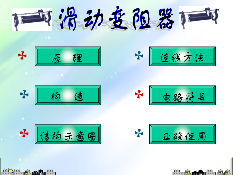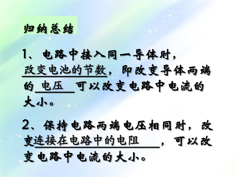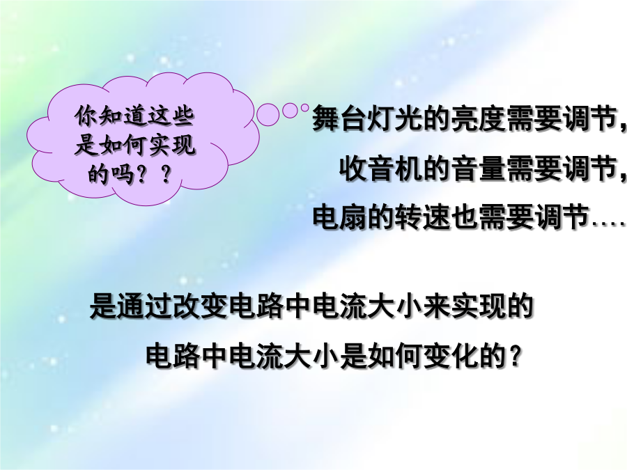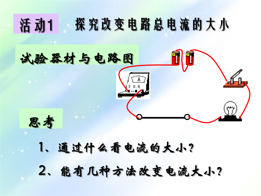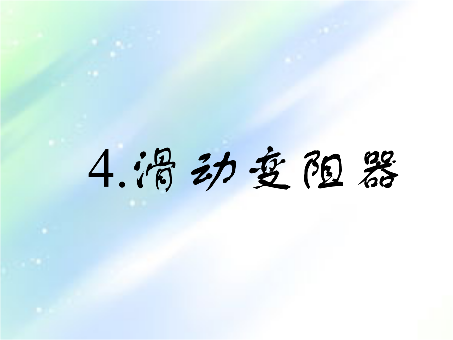 4.滑动变阻器舞台灯光的亮度需要调节, 收音机的音量需要调节, 电扇的转速也需要调节……活动1归纳总结滑动变阻器可以通过滑片的滑动来改变连入电路中电阻的大小构造连接方法:选择电阻线的一端和金属杆的一端,即“一上一下”接线柱