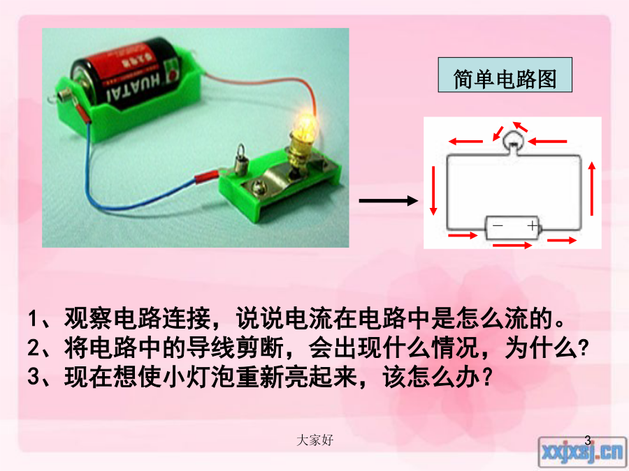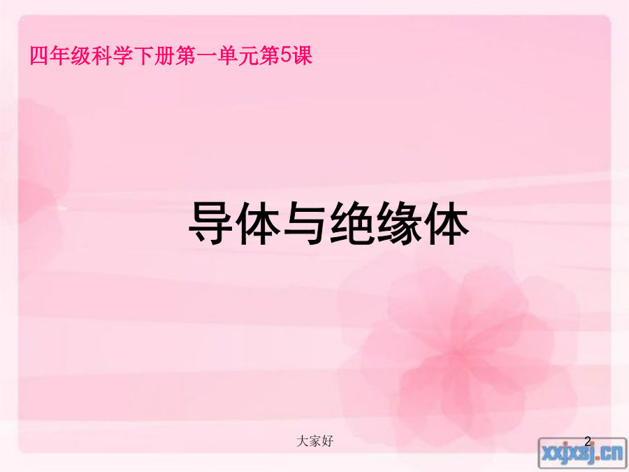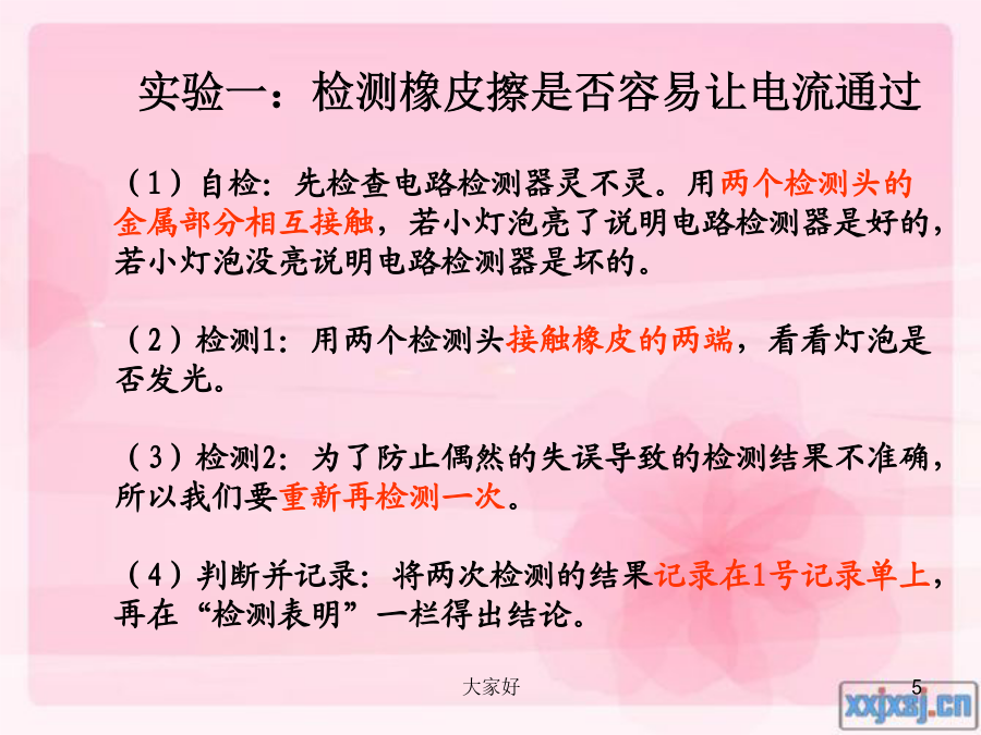 四年级科学下册第一单元第5课1、观察电路连接,说说电流在电路中是怎么流的。 2、将电路中的导线剪断,会出现什么情况,为什么? 3、现在想使小灯泡重新亮起来,该怎么办?我们以橡皮擦为例,你们猜测橡皮擦容不容易让电流通过? 思考:用什么工具检测? 电路检测器 (1)自检:先检查电路检测器灵不灵。用两个检测头的金属部分相互接触,若小灯泡亮了说明电路检测器是好的,若小灯泡没亮说明电路检测器是坏的。 (2)检测1:用两个检测头接触橡皮的两端,看看灯泡是否发光。 (3)检测2:为了防止偶然的失误导致的检测结果不准确,所以我们要重新再检测一次。 (4)判断并记录:将两次检测的结果记录在1号记录单上,再在“检测表明”一栏得出结论。 检测橡皮擦是否容易让电流通过的记录表实验二:检测10种物体的导电性温馨提示:汇报员准备汇报安全用电我们利用导体把电送到人们需要的地方。我知道:结束