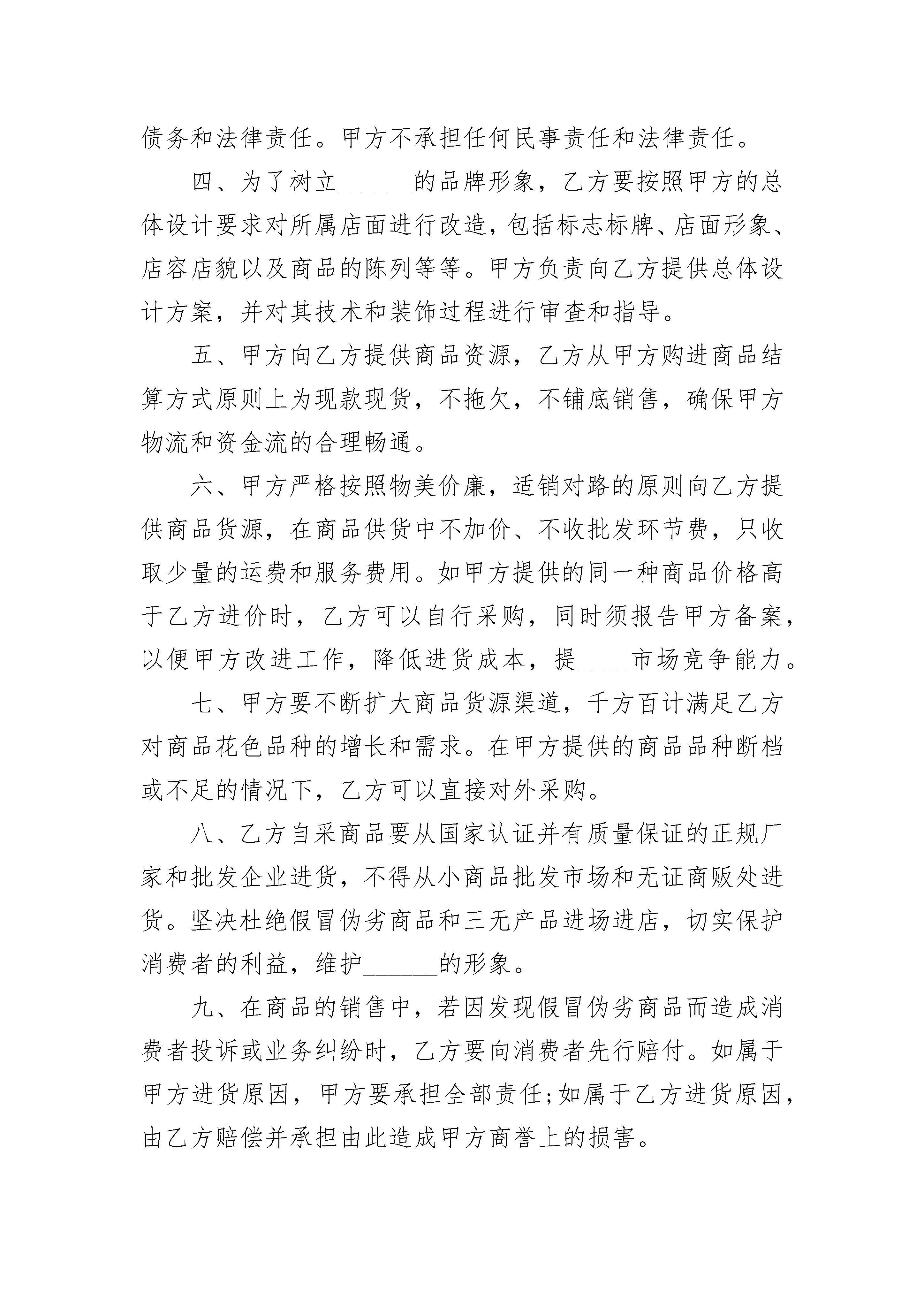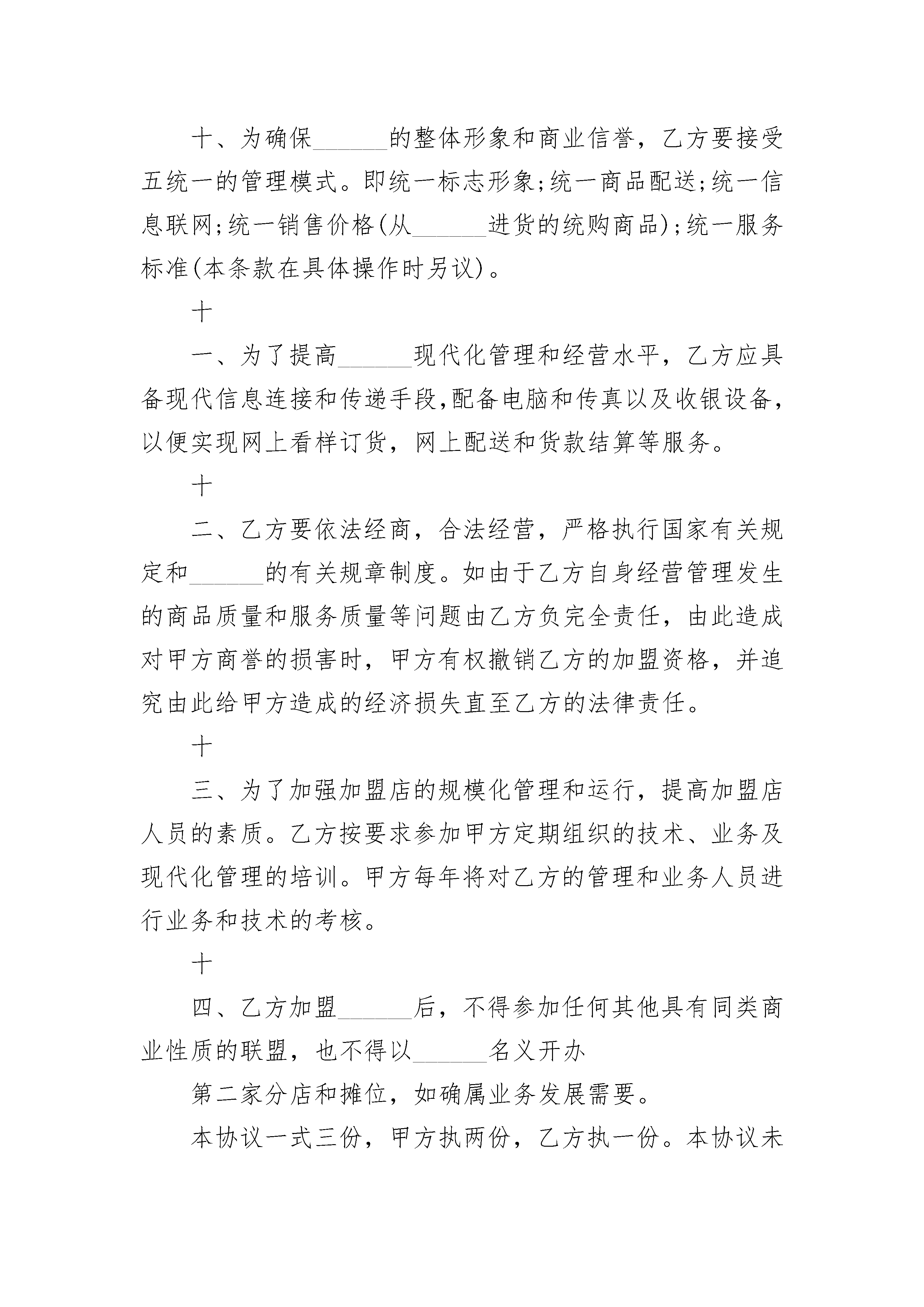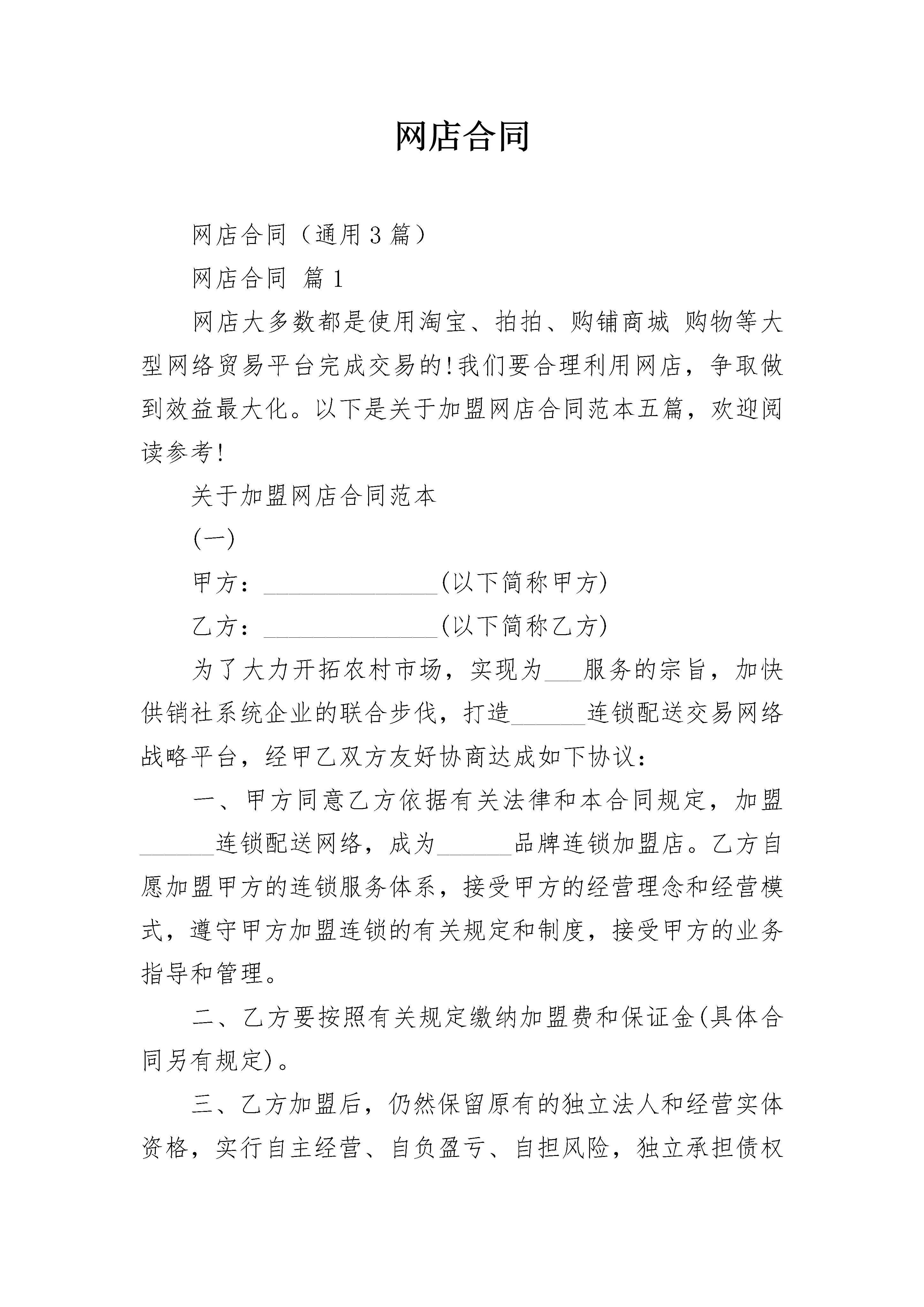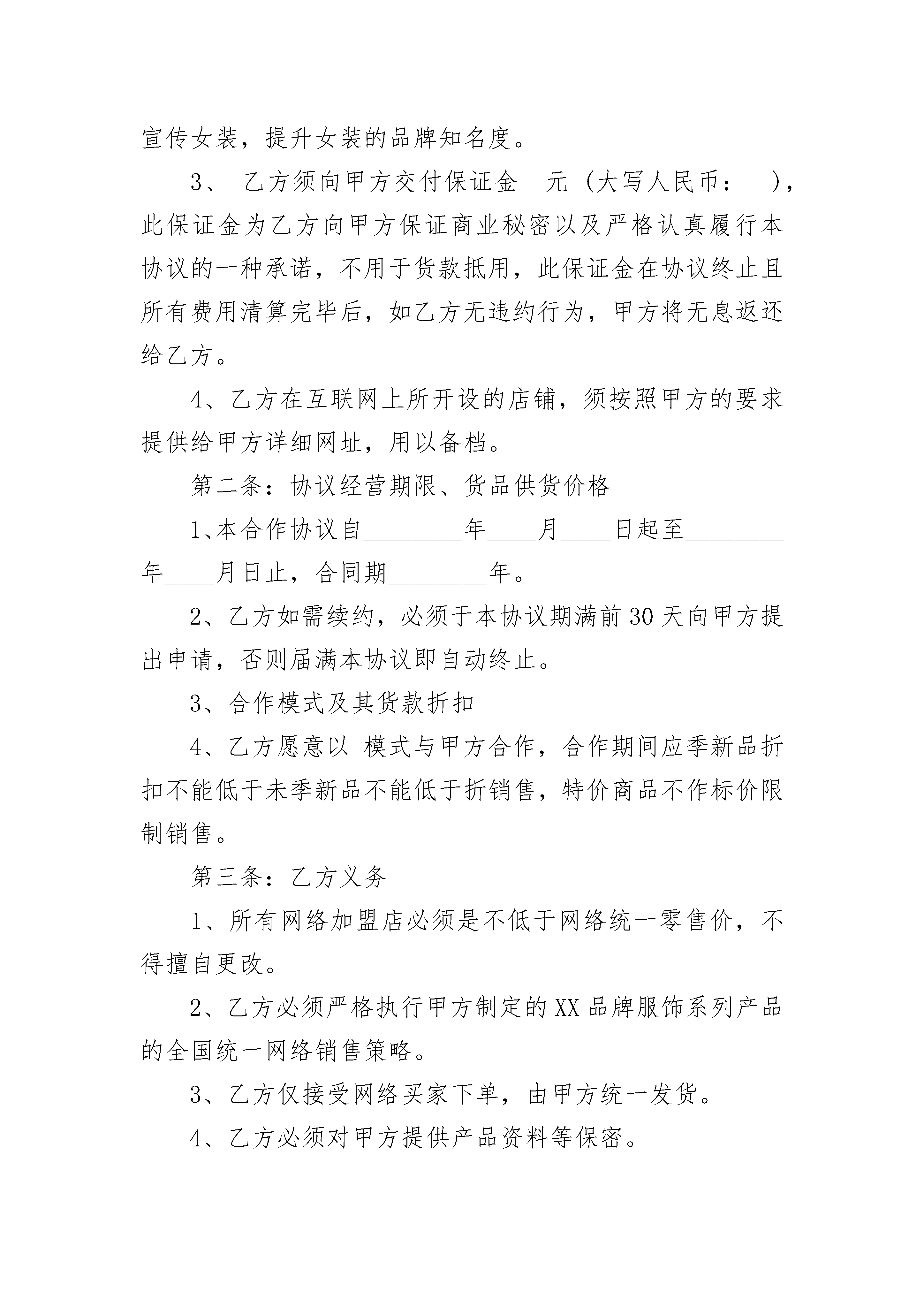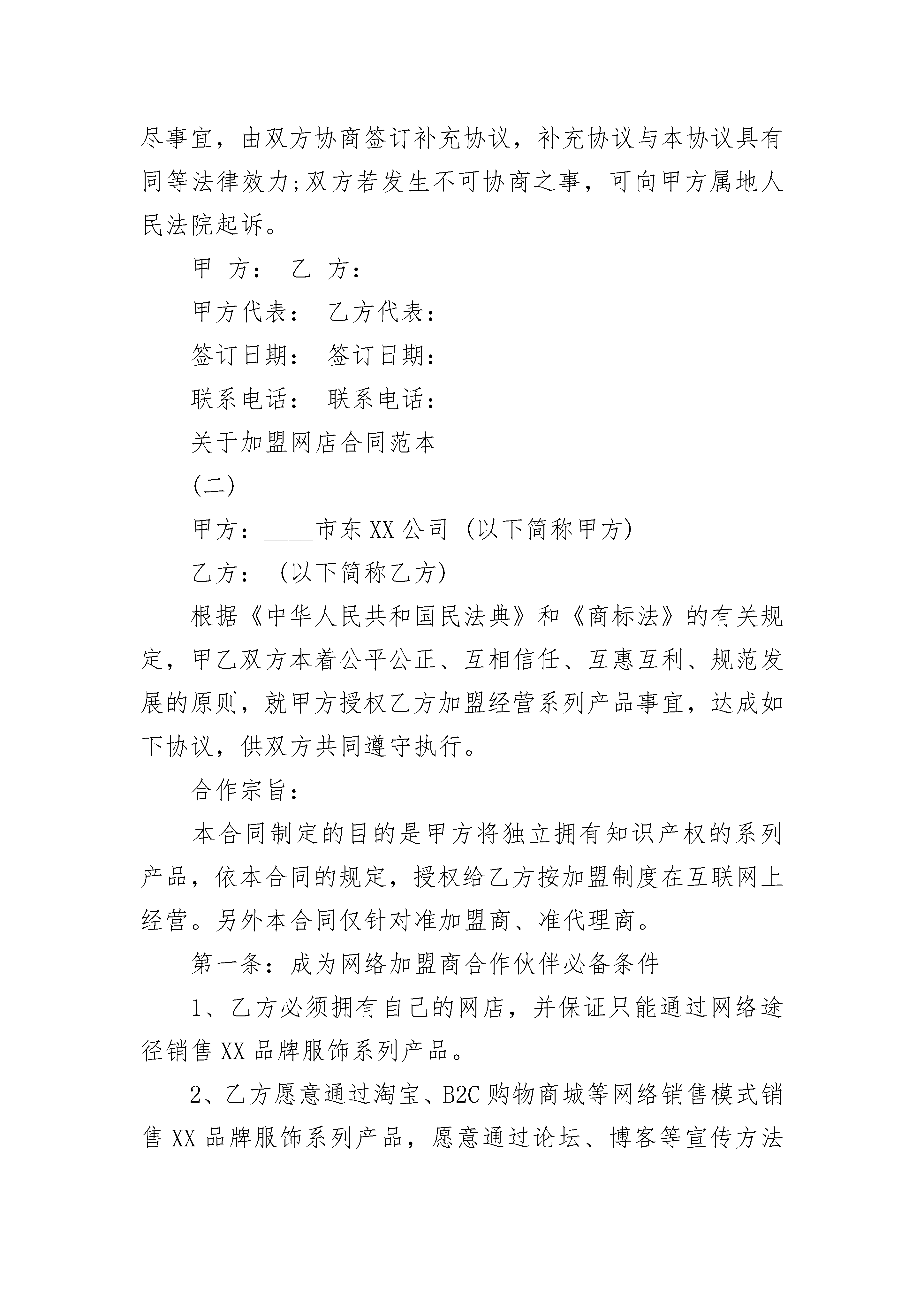 网店合同网店合同(通用3篇)网店合同篇1网店大多数都是使用淘宝、拍拍、购铺商城购物等大型网络贸易平台完成交易的!我们要合理利用网店,争取做到效益最大化。以下是关于加盟网店合同范本五篇,欢迎阅读参考!关于加盟网店合同范本(一)甲方:______________(以下简称甲方)乙方:______________(以下简称乙方)为了大力开拓农村市场,实现为___服务的宗旨,加快供销社系统企业的联合步伐,打造______连锁配送交易网络战略平台,经甲乙双方友好协商达成如下协议:一、甲方同意乙方依据有关法律和本合同规定,加盟______连锁配送网络,成为______品牌连锁加盟店。乙方自愿加盟甲方的连锁服务体系,接受甲方的经营理念和经营模式,遵守甲方加盟连锁的有关规定和制度,接受甲方的业务指导和管理。二、乙方要按照有关规定缴纳加盟费和保证金(具体合同另有规定)。三、乙方加盟后,仍然保留原有的独立法人和经营实体资格,实行自主经营、自负盈亏、自担风险,独立承担债权债务和法律责任。甲方不承担任何民事责任和法律责任。四、为了树立______的品牌形象,乙方要按照甲方的总体设计要求对所属店面进行改造,包括标志标牌、店面形象、店容店貌以及商品的陈列等等。甲方负责向乙方提供总体设计方案,并对其技术和装饰过程进行审查和指导。五、甲方向乙方提供商品资源,乙方从甲方购进商品结算方式原则上为现款现货,不拖欠,不铺底销售,确保甲方物流和资金流的合理畅通。六、甲方严格按照物美价廉,适销对路的原则向乙方提供商品货源,在商品供货中不加价、不收批发环节费,只收取少量的运费和服务费用。如甲方提供的同一种商品价格高于乙方进价时,乙方可以自行采购,同时须报告甲方备案,以便甲方改进工作,降低进货成本,提____市场竞争能力。七、甲方要不断扩大商品货源渠道,千方百计满足乙方对商品花色品种的增长和需求。在甲方提供的商品品种断档或不足的情况下,乙方可以直接对外采购。八、乙方自采商品要从国家认证并有质量保证的正规厂家和批发企业进货,不得从小商品批发市场和无证商贩处进货。坚决杜绝假冒伪劣商品和三无产品进场进店,切实保护消费者的利益,维护______的形象。九、在商品的销售中,若因发现假冒伪劣商品而造成消费者投诉或业务纠纷时,乙方要向消费者先行赔付。如属于甲方进货原因,甲方要承担全部责任;如属于乙方进货原因,由乙方赔偿并承担由此造成甲方商誉上的损害。十、为确保______的整体形象和商业信誉,乙方要接受五统一的管理模式。即统一标志形象;统一商品配送;统一信息联网;统一销售价格(从______进货的统购商品);统一服务标准(本条款在具体操作时另议)。十一、为了提高______现代化管理和经营水平,乙方应具备现代信息连接和传递手段,配备电脑和传真以及收银设备,以便实现网上看样订货,网上配送和货款结算等服务。十二、乙方要依法经商,合法经营,严格执行国家有关规定和______的有关规章制度。如由于乙方自身经营管理发生的商品质量和服务质量等问题由乙方负完全责任,由此造成对甲方商誉的损害时,甲方有权撤销乙方的加盟资格,并追究由此给甲方造成的经济损失直至乙方的法律责任。十三、为了加强加盟店的规模化管理和运行,提高加盟店人员的素质。乙方按要求参加甲方定期组织的技术、业务及现代化管理的培训。甲方每年将对乙方的管理和业务人员进行业务和技术的考核。十四、乙方加盟______后,不得参加任何其他具有同类商业性质的联盟,也不得以______名义开办第二家分店和摊位,如确属业务发展需要。本协议一式三份,甲方执两份,乙方执一份。本协议未尽事宜,由双方协商签订补充协议,补充协议与本协议具有同等法律效力;双方若发生不可协商之事,可向甲方属地人民法院起诉。甲方:乙方:甲方代表:乙方代表:签订日期:签订日期:联系电话:联系电话:关于加盟网店合同范本(二)甲方:____市东XX公司(以下简称甲方)乙方:(以下简称乙方)根据《中华人民共和国民法典》和《商标法》的有关规定,甲乙双方本着公平公正、互相信任、互惠互利、规范发展的原则,就甲方授权乙方加盟经营系列产品事宜,达成如下协议,供双方共同遵守执行。合作宗旨:本合同制定的目的是甲方将独立拥有知识产权的系列产品,依本合同的规定,授权给乙方按加盟制度在互联网上经营。另外本合同仅针对准加盟商、准代理商。第一条:成为网络加盟商合作伙伴必备条件1、乙方必须拥有自己的网店,并保证只能通过网络途径销售XX品牌服饰系列产品。2、乙方愿意通过淘宝、B2C购物商城等网络销售模式销售XX品牌服饰系列产品,愿意通过论坛、博客等宣传方法宣传女装,提升女装的品牌知名度。3、乙方须向甲方交付保证金_元(大写人民币:_),此保证金为乙方向甲方保证商业秘密以及严格认真履行本协议的一种承诺,不用于货款抵用,此保证