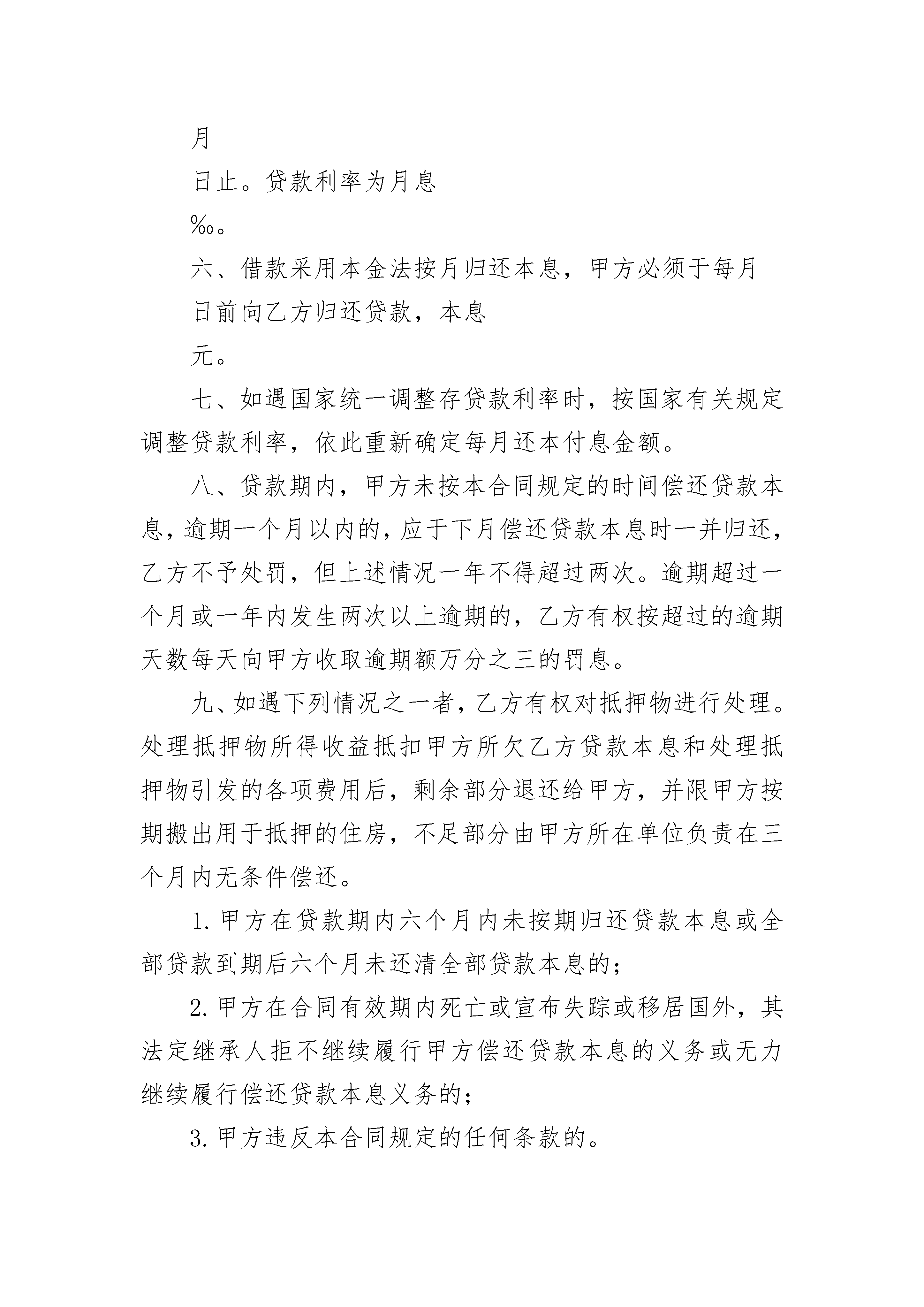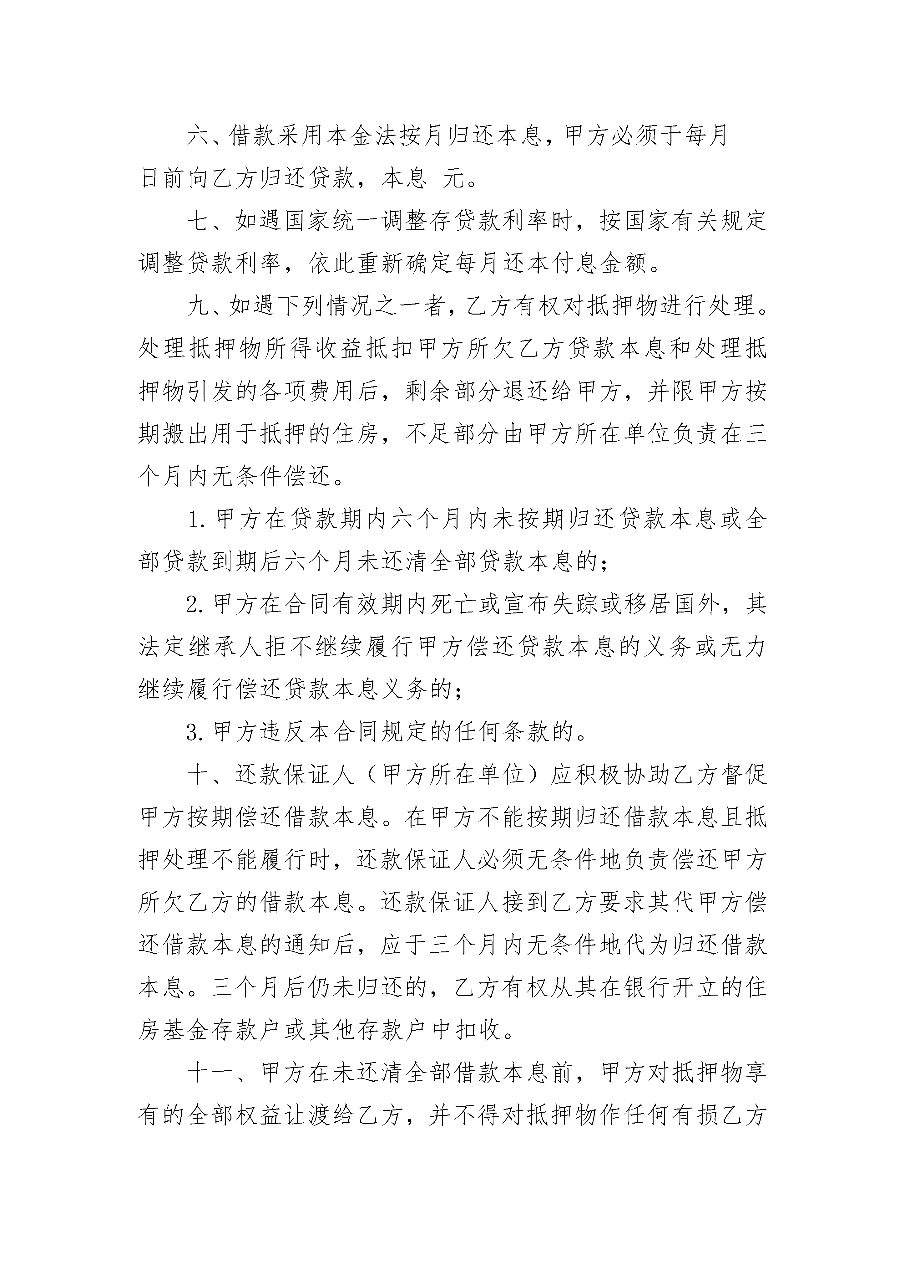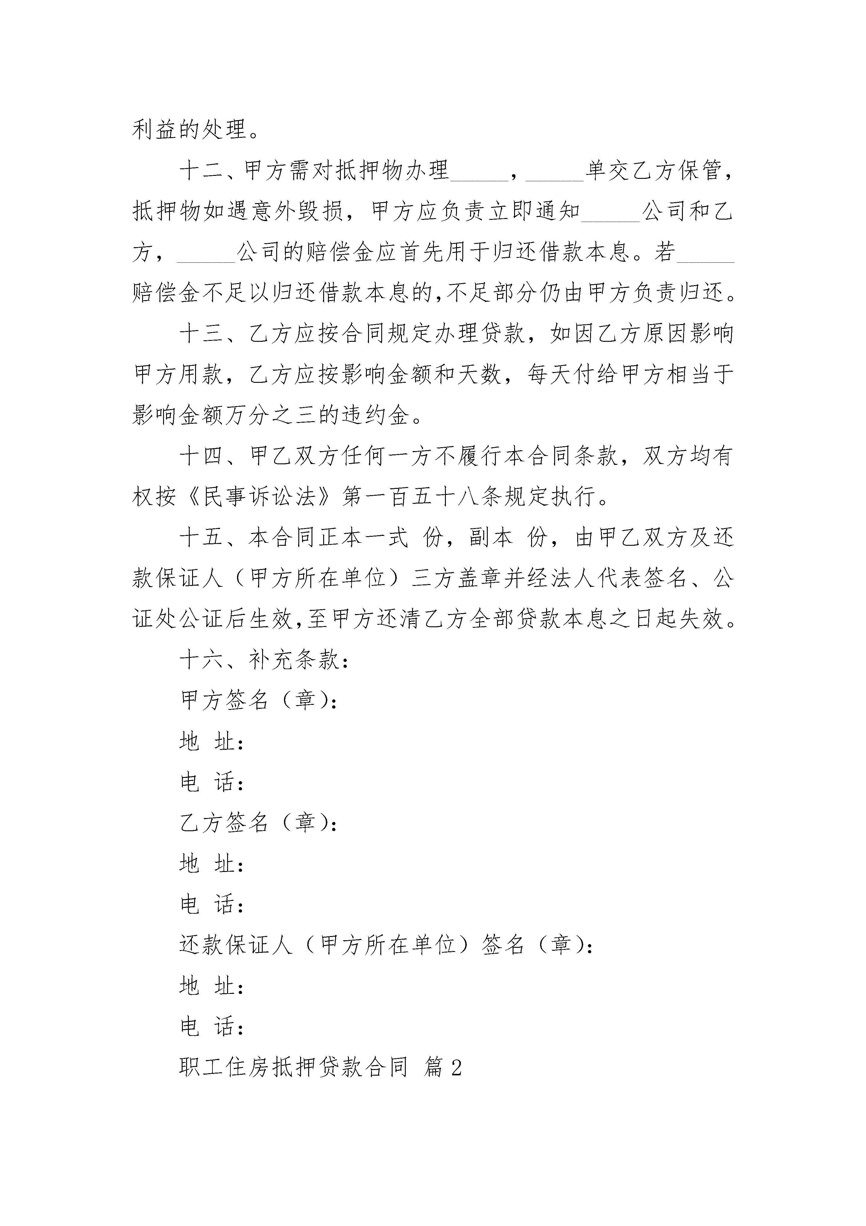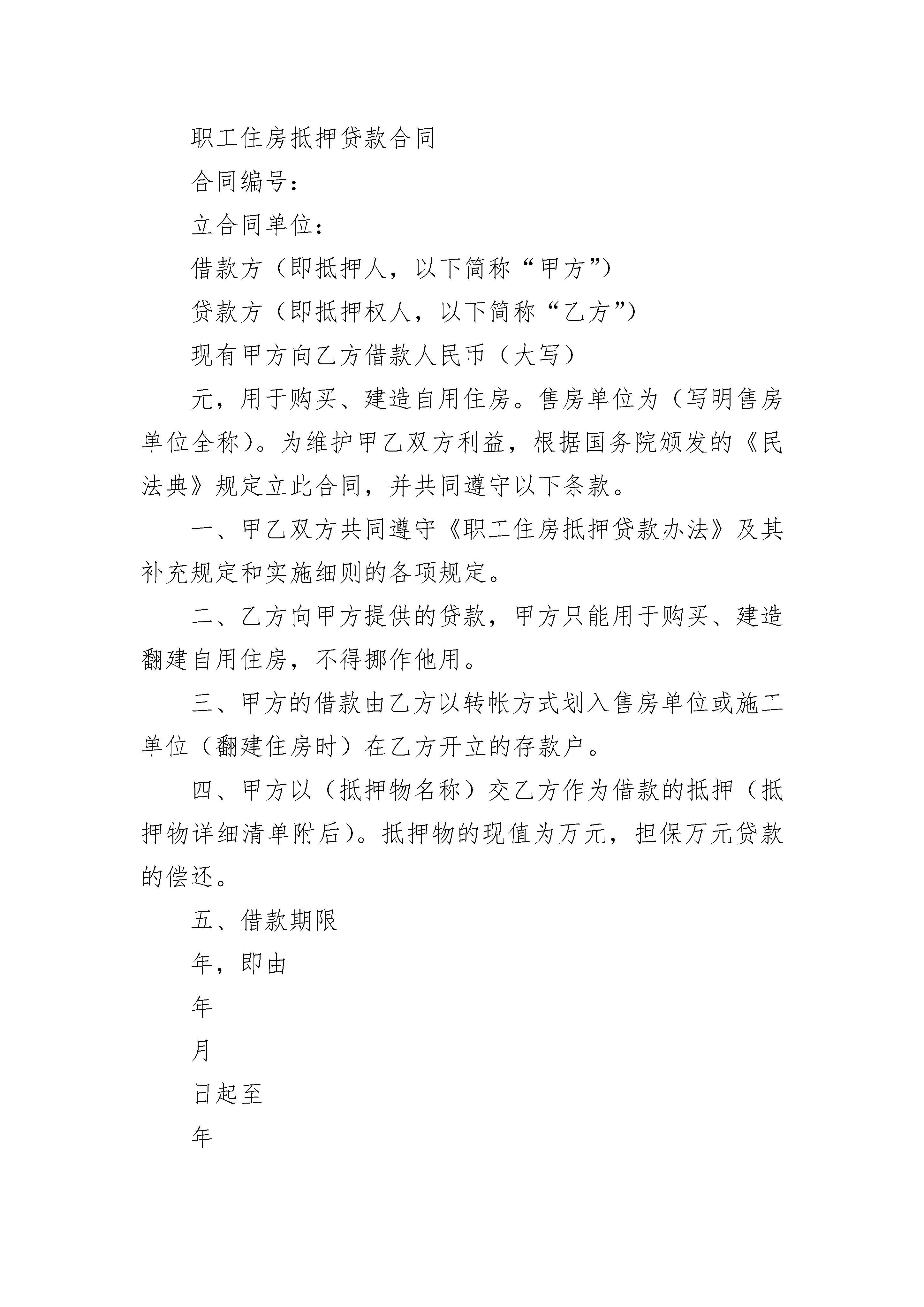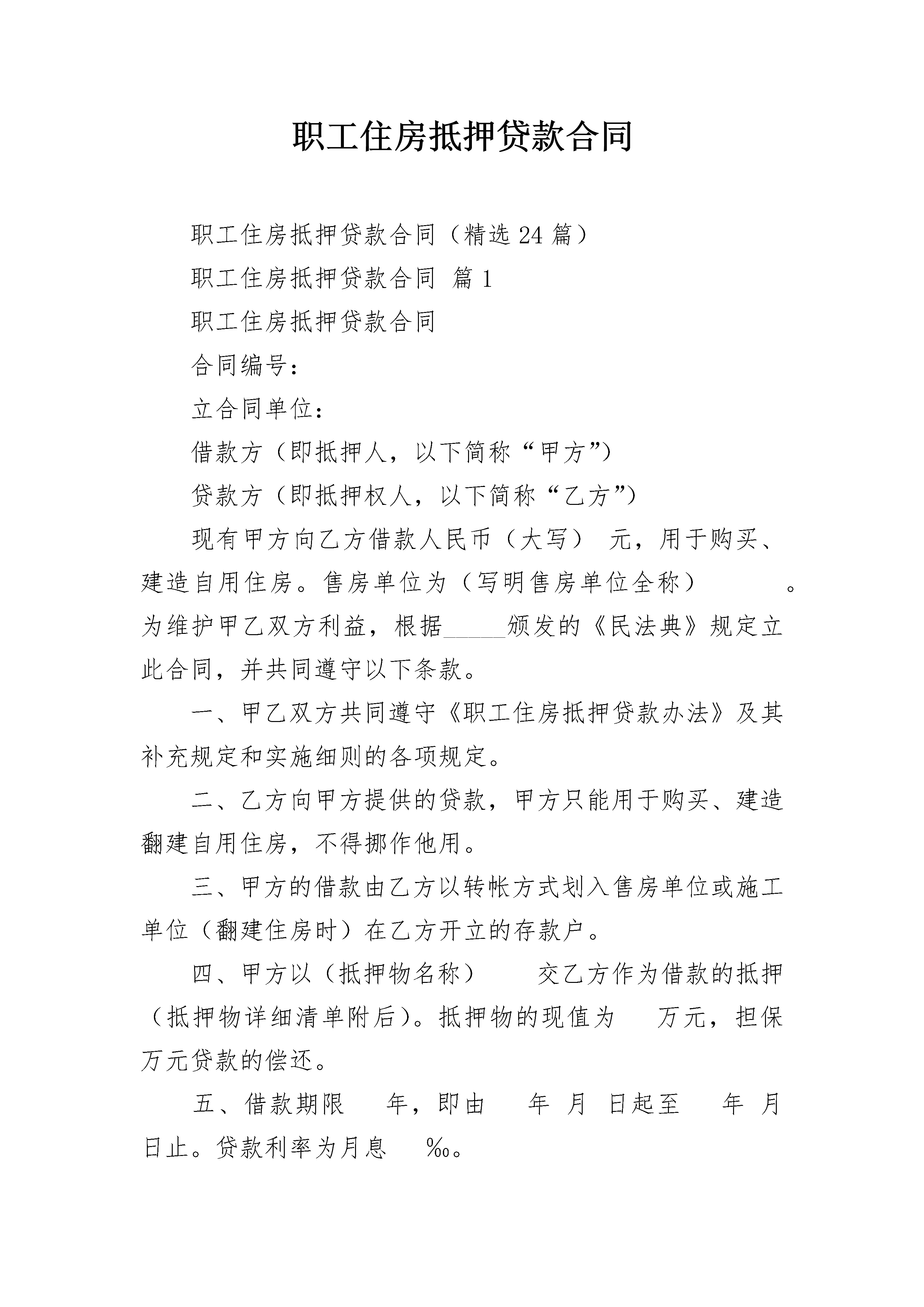 职工住房抵押贷款合同职工住房抵押贷款合同(精选24篇)职工住房抵押贷款合同篇1职工住房抵押贷款合同合同编号:立合同单位:借款方(即抵押人,以下简称“甲方”)贷款方(即抵押权人,以下简称“乙方”)现有甲方向乙方借款人民币(大写)元,用于购买、建造自用住房。售房单位为(写明售房单位全称)。为维护甲乙双方利益,根据_____颁发的《民法典》规定立此合同,并共同遵守以下条款。一、甲乙双方共同遵守《职工住房抵押贷款办法》及其补充规定和实施细则的各项规定。二、乙方向甲方提供的贷款,甲方只能用于购买、建造翻建自用住房,不得挪作他用。三、甲方的借款由乙方以转帐方式划入售房单位或施工单位(翻建住房时)在乙方开立的存款户。四、甲方以(抵押物名称)交乙方作为借款的抵押(抵押物详细清单附后)。抵押物的现值为万元,担保万元贷款的偿还。五、借款期限年,即由年月日起至年月日止。贷款利率为月息‰。六、借款采用本金法按月归还本息,甲方必须于每月日前向乙方归还贷款,本息元。七、如遇国家统一调整存贷款利率时,按国家有关规定调整贷款利率,依此重新确定每月还本付息金额。九、如遇下列情况之一者,乙方有权对抵押物进行处理。处理抵押物所得收益抵扣甲方所欠乙方贷款本息和处理抵押物引发的各项费用后,剩余部分退还给甲方,并限甲方按期搬出用于抵押的住房,不足部分由甲方所在单位负责在三个月内无条件偿还。1.甲方在贷款期内六个月内未按期归还贷款本息或全部贷款到期后六个月未还清全部贷款本息的;2.甲方在合同有效期内死亡或宣布失踪或移居国外,其法定继承人拒不继续履行甲方偿还贷款本息的义务或无力继续履行偿还贷款本息义务的;3.甲方违反本合同规定的任何条款的。十、还款保证人(甲方所在单位)应积极协助乙方督促甲方按期偿还借款本息。在甲方不能按期归还借款本息且抵押处理不能履行时,还款保证人必须无条件地负责偿还甲方所欠乙方的借款本息。还款保证人接到乙方要求其代甲方偿还借款本息的通知后,应于三个月内无条件地代为归还借款本息。三个月后仍未归还的,乙方有权从其在银行开立的住房基金存款户或其他存款户中扣收。十一、甲方在未还清全部借款本息前,甲方对抵押物享有的全部权益让渡给乙方,并不得对抵押物作任何有损乙方利益的处理。十二、甲方需对抵押物办理_____,_____单交乙方保管,抵押物如遇意外毁损,甲方应负责立即通知_____公司和乙方,_____公司的赔偿金应首先用于归还借款本息。若_____赔偿金不足以归还借款本息的,不足部分仍由甲方负责归还。十三、乙方应按合同规定办理贷款,如因乙方原因影响甲方用款,乙方应按影响金额和天数,每天付给甲方相当于影响金额万分之三的违约金。十四、甲乙双方任何一方不履行本合同条款,双方均有权按《民事诉讼法》第一百五十八条规定执行。十五、本合同正本一式份,副本份,由甲乙双方及还款保证人(甲方所在单位)三方盖章并经法人代表签名、公证处公证后生效,至甲方还清乙方全部贷款本息之日起失效。十六、补充条款:甲方签名(章):地址:电话:乙方签名(章):地址:电话:还款保证人(甲方所在单位)签名(章):地址:电话:职工住房抵押贷款合同篇2职工住房抵押贷款合同合同编号:立合同单位:借款方(即抵押人,以下简称“甲方”)贷款方(即抵押权人,以下简称“乙方”)现有甲方向乙方借款人民币(大写)元,用于购买、建造自用住房。售房单位为(写明售房单位全称)。为维护甲乙双方利益,根据国务院颁发的《民法典》规定立此合同,并共同遵守以下条款。一、甲乙双方共同遵守《职工住房抵押贷款办法》及其补充规定和实施细则的各项规定。二、乙方向甲方提供的贷款,甲方只能用于购买、建造翻建自用住房,不得挪作他用。三、甲方的借款由乙方以转帐方式划入售房单位或施工单位(翻建住房时)在乙方开立的存款户。四、甲方以(抵押物名称)交乙方作为借款的抵押(抵押物详细清单附后)。抵押物的现值为万元,担保万元贷款的偿还。五、借款期限年,即由年月日起至年月日止。贷款利率为月息‰。六、借款采用本金法按月归还本息,甲方必须于每月日前向乙方归还贷款,本息元。七、如遇国家统一调整存贷款利率时,按国家有关规定调整贷款利率,依此重新确定每月还本付息金额。八、贷款期内,甲方未按本合同规定的时间偿还贷款本息,逾期一个月以内的,应于下月偿还贷款本息时一并归还,乙方不予处罚,但上述情况一年不得超过两次。逾期超过一个月或一年内发生两次以上逾期的,乙方有权按超过的逾期天数每天向甲方收取逾期额万分之三的罚息。九、如遇下列情况之一者,乙方有权对抵押物进行处理。处理抵押物所得收益抵扣甲方所欠乙方贷款本息和处理抵押物引发的各项费用后,剩余部分退还给甲方,并限甲方按期搬出用于抵押的住房,不足部分由甲方所在单位负责在三个月内无条件偿还。1.甲方在贷款期内六个月内未按期归还