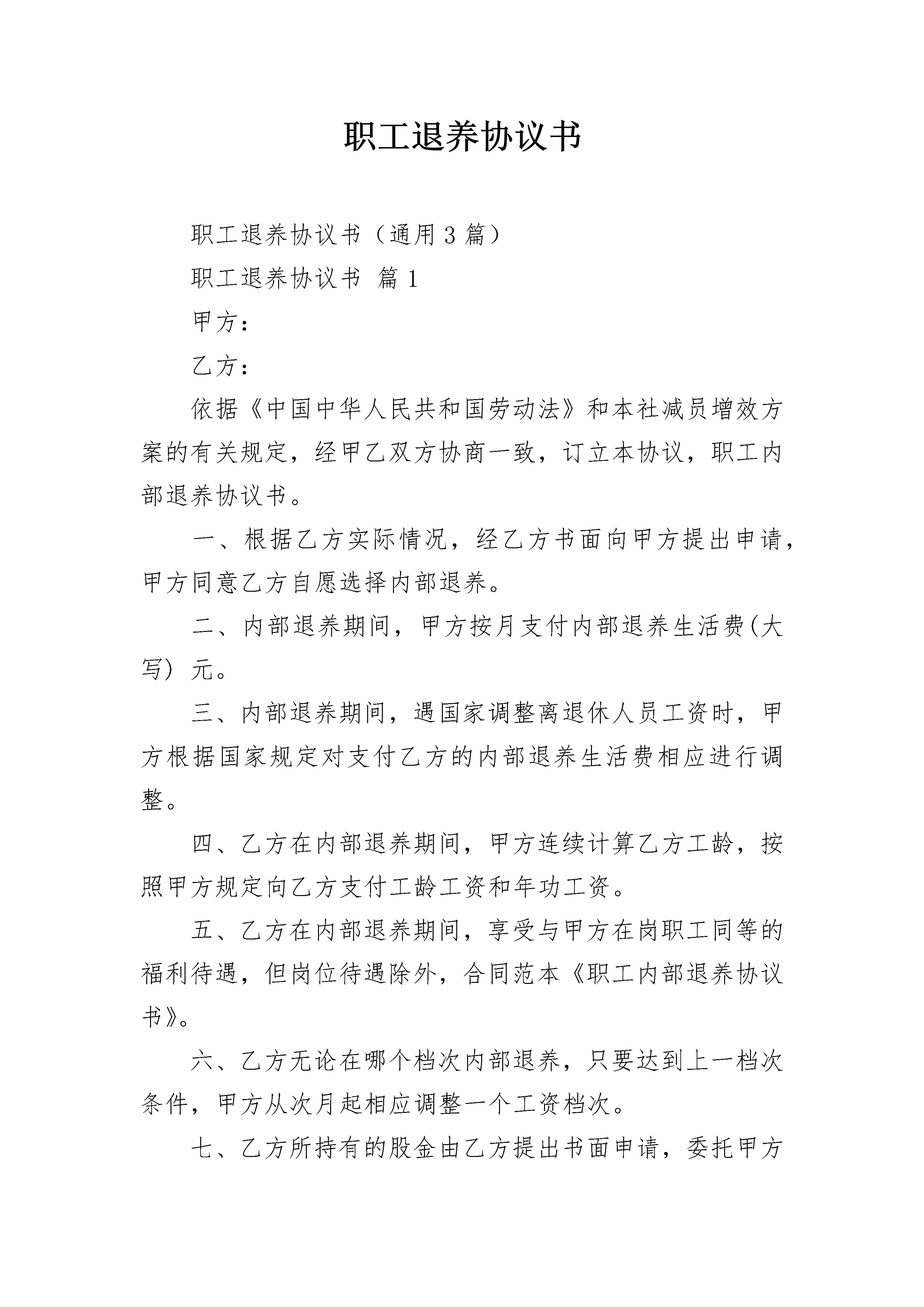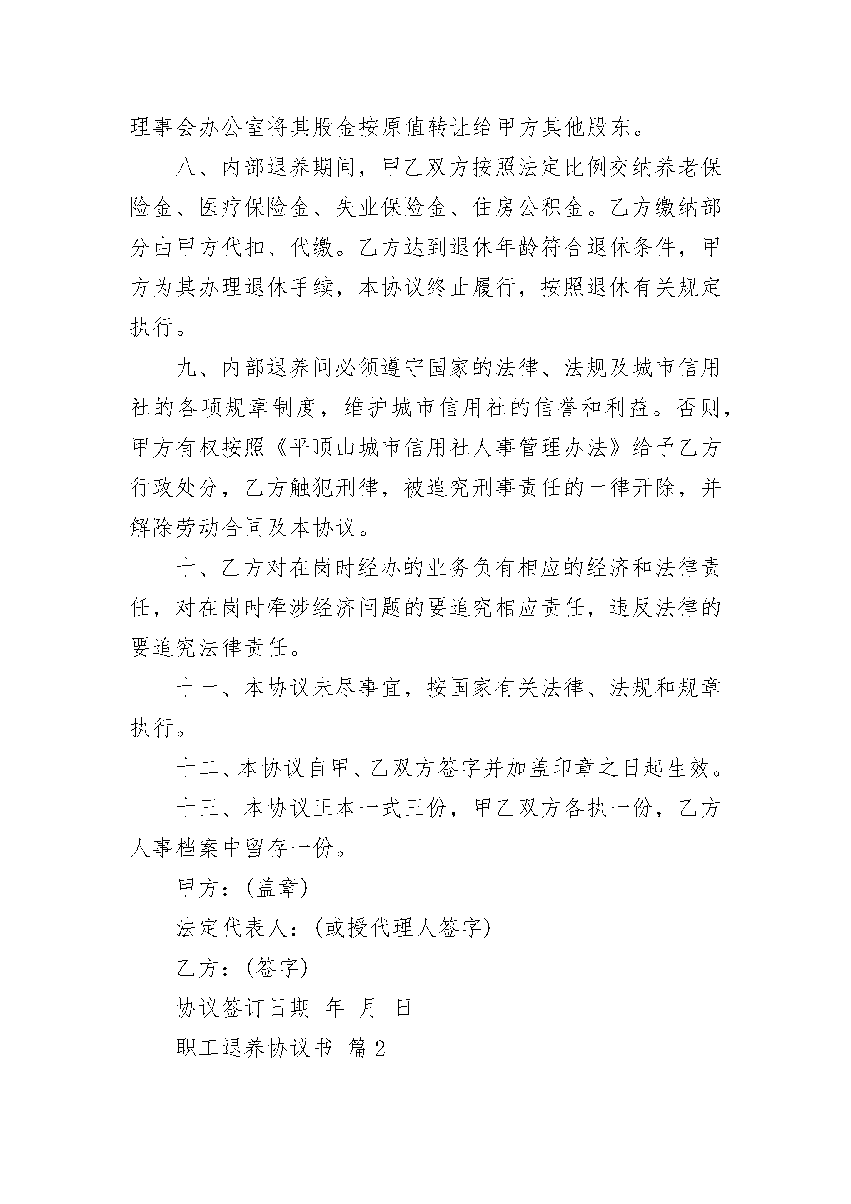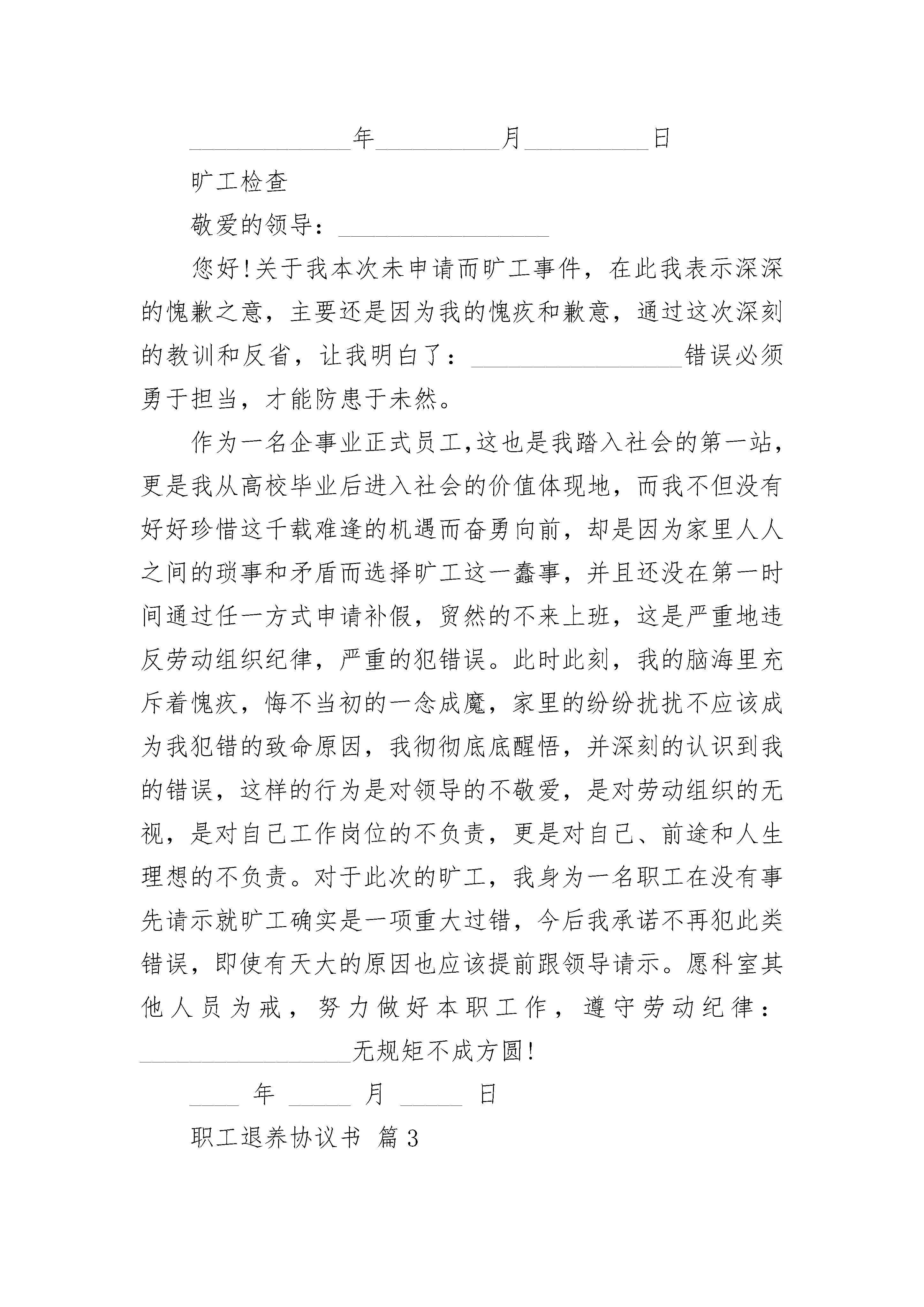 职工退养协议书职工退养协议书(通用3篇)职工退养协议书篇1甲方:乙方:依据《中国中华人民共和国劳动法》和本社减员增效方案的有关规定,经甲乙双方协商一致,订立本协议,职工内部退养协议书。一、根据乙方实际情况,经乙方书面向甲方提出申请,甲方同意乙方自愿选择内部退养。二、内部退养期间,甲方按月支付内部退养生活费(大写)元。三、内部退养期间,遇国家调整离退休人员工资时,甲方根据国家规定对支付乙方的内部退养生活费相应进行调整。四、乙方在内部退养期间,甲方连续计算乙方工龄,按照甲方规定向乙方支付工龄工资和年功工资。五、乙方在内部退养期间,享受与甲方在岗职工同等的福利待遇,但岗位待遇除外,合同范本《职工内部退养协议书》。六、乙方无论在哪个档次内部退养,只要达到上一档次条件,甲方从次月起相应调整一个工资档次。七、乙方所持有的股金由乙方提出书面申请,委托甲方理事会办公室将其股金按原值转让给甲方其他股东。八、内部退养期间,甲乙双方按照法定比例交纳养老保险金、医疗保险金、失业保险金、住房公积金。乙方缴纳部分由甲方代扣、代缴。乙方达到退休年龄符合退休条件,甲方为其办理退休手续,本协议终止履行,按照退休有关规定执行。九、内部退养间必须遵守国家的法律、法规及城市信用社的各项规章制度,维护城市信用社的信誉和利益。否则,甲方有权按照《平顶山城市信用社人事管理办法》给予乙方行政处分,乙方触犯刑律,被追究刑事责任的一律开除,并解除劳动合同及本协议。十、乙方对在岗时经办的业务负有相应的经济和法律责任,对在岗时牵涉经济问题的要追究相应责任,违反法律的要追究法律责任。十一、本协议未尽事宜,按国家有关法律、法规和规章执行。十二、本协议自甲、乙双方签字并加盖印章之日起生效。十三、本协议正本一式三份,甲乙双方各执一份,乙方人事档案中留存一份。甲方:(盖章)法定代表人:(或授代理人签字)乙方:(签字)协议签订日期年月日职工退养协议书篇2尊敬的领导:由于工作责任心的不足,在我身上出现未请假旷工的错误。我的行为,已造成了严重不良的后果,经过您的批评,以及自身的认真反思之后,我深刻地明白到我的错误,我觉得现在强调任何理由都只是借口,我不想再为自己的错误找任何的理由。现在我怀着十二万分的愧疚以及十二万分的懊悔给你写下这份检讨书,已向您表示我对未请假旷工这种错误行为的愧疚和保证以后不再出现同类事件的行为。一、我对我工作上的失误作出的反思:1、放松思想觉悟,没有严格要求自己和约束自己是这次错误发生的主要原因。对公司的规章制度的重视严重不足,就算是有认识,也没能在行为上真正予以执行。2、敬业工作的思想观念不够深刻,不够正确。二、整改措施:_________________1、以本次错误为教训,树立牢固的组织纪律观念,不迟到、不早退、不旷工,严格遵守工作纪律和请假、销假制度。2、认真克服生活懒散,粗心大意的缺点,努力将工作做好,以优秀的表现来弥补我的过错。3、经常自省,及时纠正自身的错误,加强学习,配合领导管理,提高自身思想素质,保证以后不再出现上述错误。我错了,请求领导能给我改正错误的机会,我也会吸取教训,引以为戒,以更加积极和严谨的态度投入工作。检讨人:_______________________________年__________月__________日旷工检查敬爱的领导:_________________您好!关于我本次未申请而旷工事件,在此我表示深深的愧歉之意,主要还是因为我的愧疚和歉意,通过这次深刻的教训和反省,让我明白了:_________________错误必须勇于担当,才能防患于未然。作为一名企事业正式员工,这也是我踏入社会的第一站,更是我从高校毕业后进入社会的价值体现地,而我不但没有好好珍惜这千载难逢的机遇而奋勇向前,却是因为家里人人之间的琐事和矛盾而选择旷工这一蠢事,并且还没在第一时间通过任一方式申请补假,贸然的不来上班,这是严重地违反劳动组织纪律,严重的犯错误。此时此刻,我的脑海里充斥着愧疚,悔不当初的一念成魔,家里的纷纷扰扰不应该成为我犯错的致命原因,我彻彻底底醒悟,并深刻的认识到我的错误,这样的行为是对领导的不敬爱,是对劳动组织的无视,是对自己工作岗位的不负责,更是对自己、前途和人生理想的不负责。对于此次的旷工,我身为一名职工在没有事先请示就旷工确实是一项重大过错,今后我承诺不再犯此类错误,即使有天大的原因也应该提前跟领导请示。愿科室其他人员为戒,努力做好本职工作,遵守劳动纪律:_________________无规矩不成方圆!____年_____月_____日职工退养协议书篇3甲方:________________乙方:________________为加强合作,促进技工学校毕业生就业安置工作,甲乙双方本着平等协商,互惠互利的原则,就安排乙方学生就业事宜