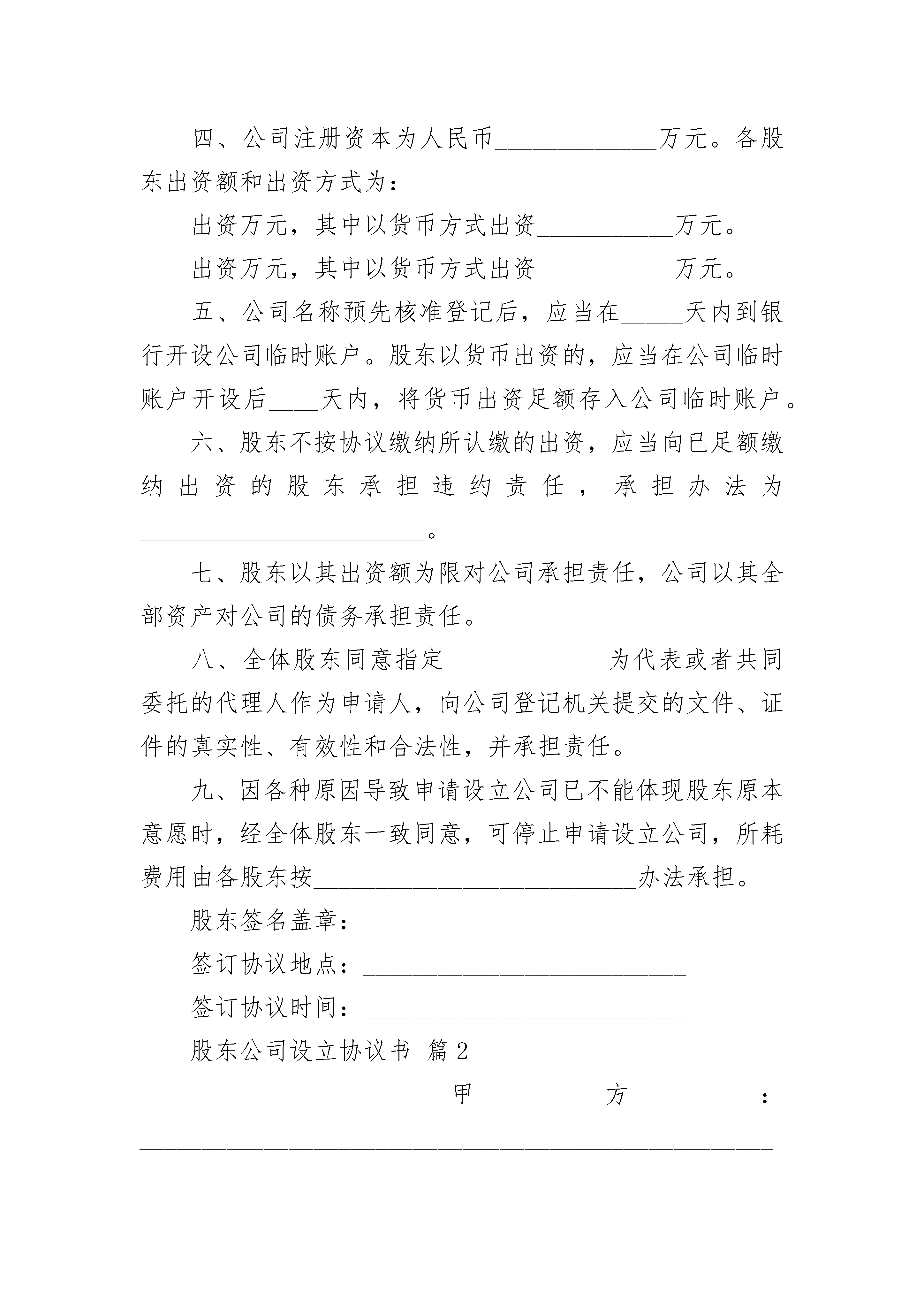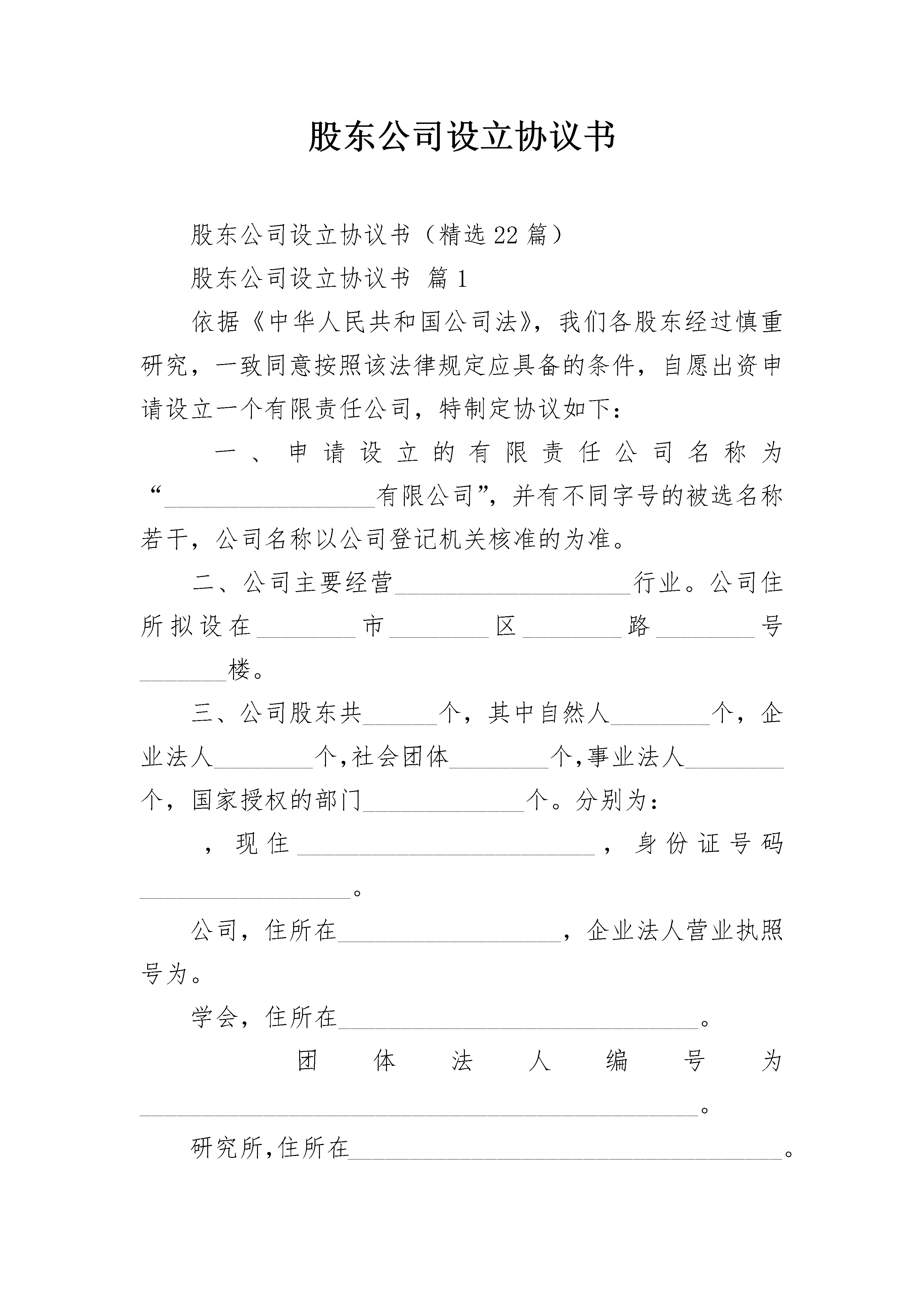股东公司设立协议书股东公司设立协议书(精选22篇)股东公司设立协议书篇1依据《中华人民共和国公司法》,我们各股东经过慎重研究,一致同意按照该法律规定应具备的条件,自愿出资申请设立一个有限责任公司,特制定协议如下:一、申请设立的有限责任公司名称为“_________________有限公司”,并有不同字号的被选名称若干,公司名称以公司登记机关核准的为准。二、公司主要经营___________________行业。公司住所拟设在________市________区________路________号_______楼。三、公司股东共______个,其中自然人________个,企业法人________个,社会团体________个,事业法人________个,国家授权的部门_____________个。分别为:,现住________________________,身份证号码_________________。公司,住所在__________________,企业法人营业执照号为。学会,住所在_____________________________。团体法人编号为_____________________________________________。研究所,住所在___________________________________。四、公司注册资本为人民币_____________万元。各股东出资额和出资方式为:出资万元,其中以货币方式出资___________万元。出资万元,其中以货币方式出资___________万元。五、公司名称预先核准登记后,应当在_____天内到银行开设公司临时账户。股东以货币出资的,应当在公司临时账户开设后____天内,将货币出资足额存入公司临时账户。六、股东不按协议缴纳所认缴的出资,应当向已足额缴纳出资的股东承担违约责任,承担办法为_______________________。七、股东以其出资额为限对公司承担责任,公司以其全部资产对公司的债务承担责任。八、全体股东同意指定_____________为代表或者共同委托的代理人作为申请人,向公司登记机关提交的文件、证件的真实性、有效性和合法性,并承担责任。九、因各种原因导致申请设立公司已不能体现股东原本意愿时,经全体股东一致同意,可停止申请设立公司,所耗费用由各股东按__________________________办法承担。股东签名盖章:__________________________签订协议地点:__________________________签订协议时间:__________________________股东公司设立协议书篇2甲方:_______________________________________________________________住所地:______________________________________________________________法定代表人:__________________________________________________________乙方:__________________________________________________________住所地:__________________________________________________________法定代表人:__________________________________________________________丙方:__________________________________________________________住所地:__________________________________________________________法定代表人:__________________________________________________________丁方:__________________________________________________________住所地:__________________________________________________________法定代表人:__________________________________________________________戊方:__________________________________________________________住所地:_____________________________________________