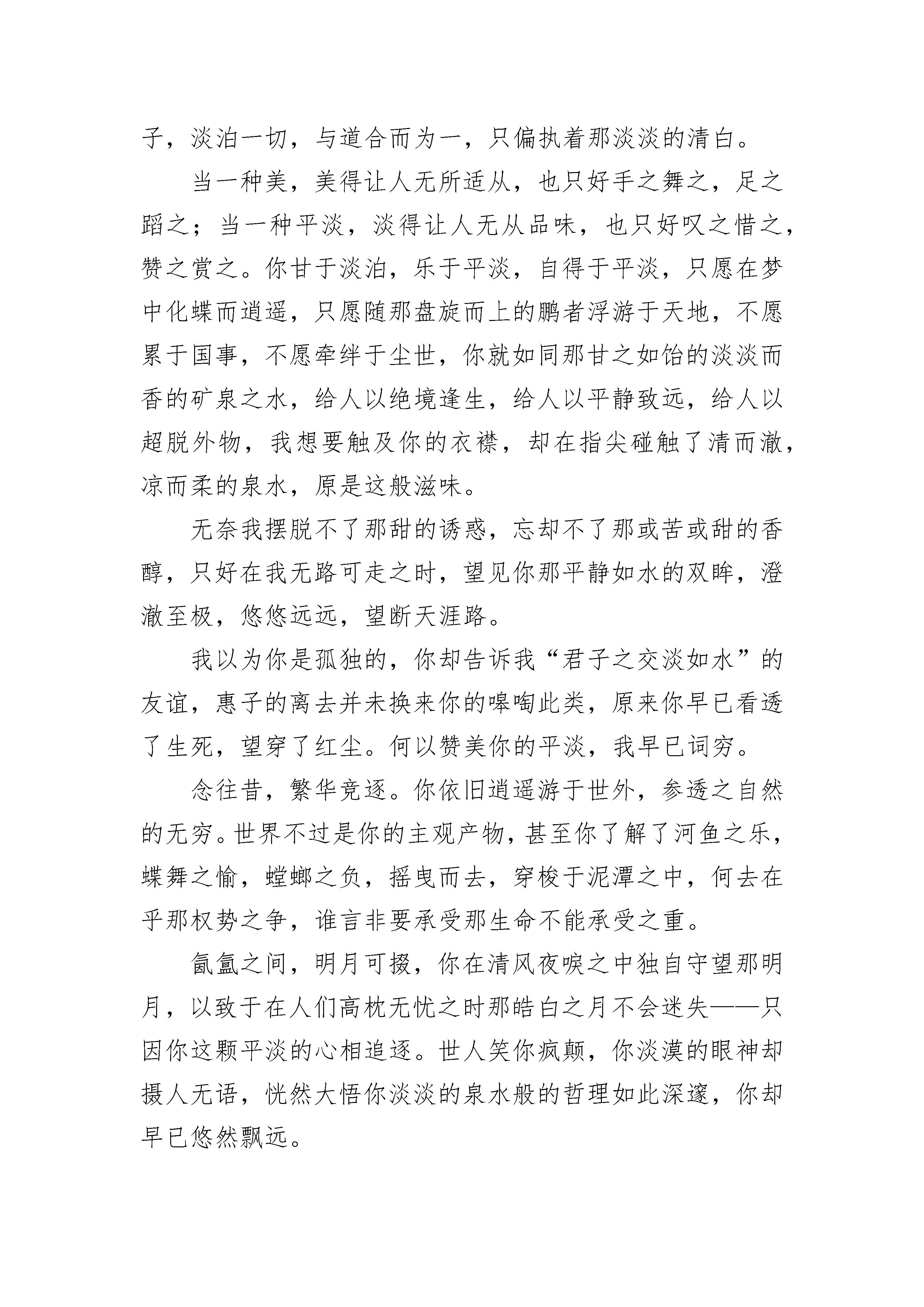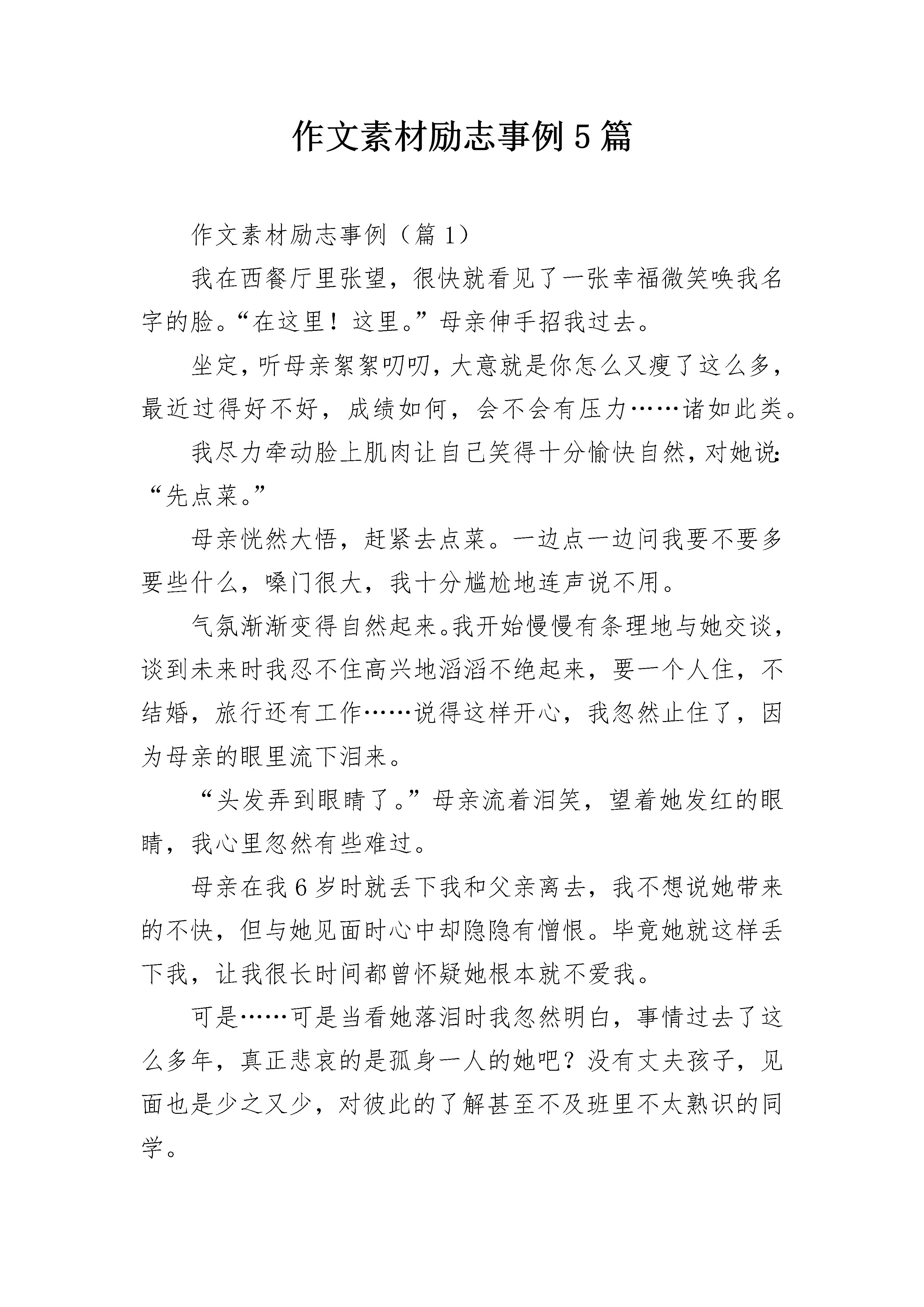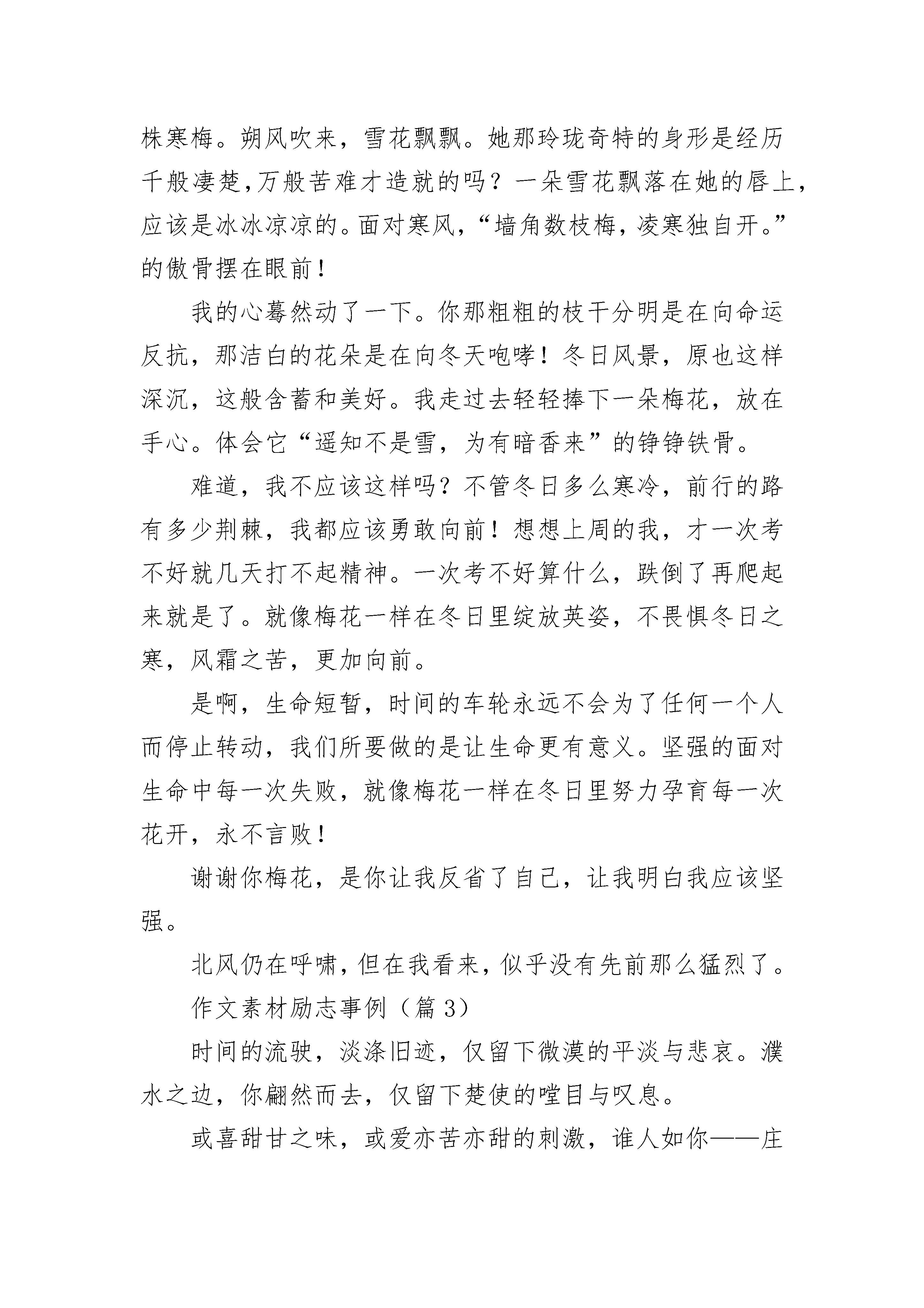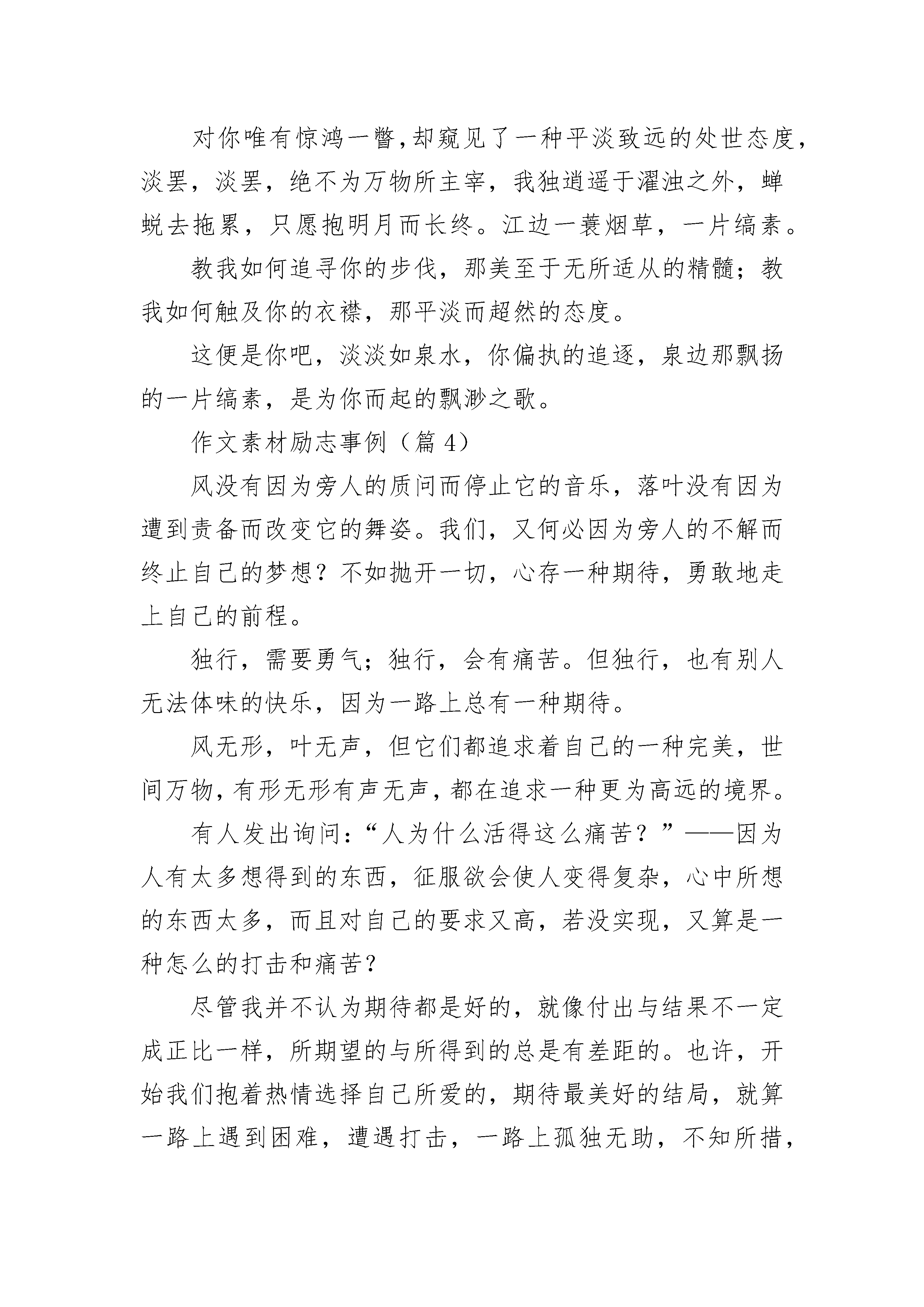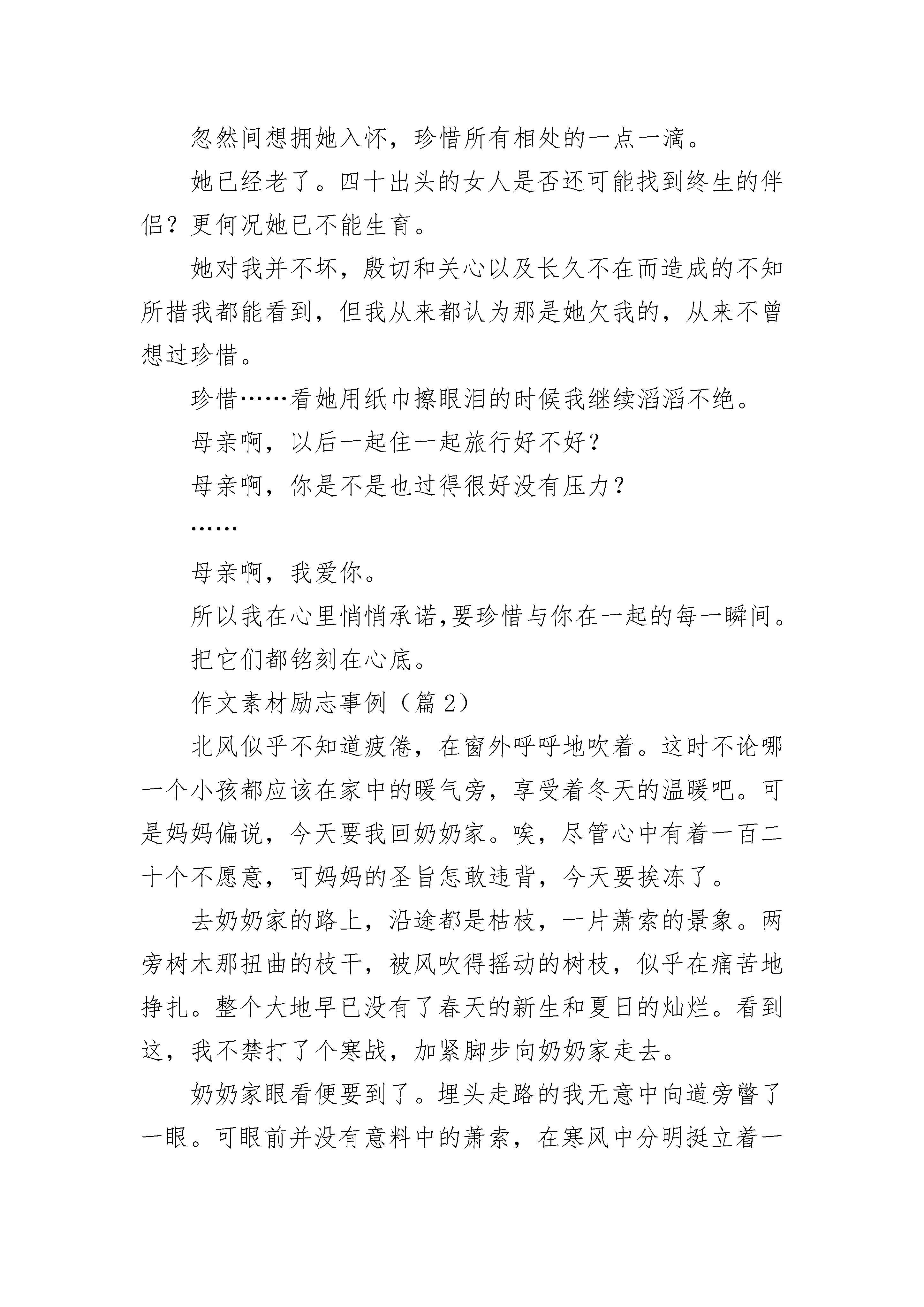 作文素材励志事例5篇作文素材励志事例(篇1)我在西餐厅里张望,很快就看见了一张幸福微笑唤我名字的脸。“在这里!这里。”母亲伸手招我过去。坐定,听母亲絮絮叨叨,大意就是你怎么又瘦了这么多,最近过得好不好,成绩如何,会不会有压力……诸如此类。我尽力牵动脸上肌肉让自己笑得十分愉快自然,对她说:“先点菜。”母亲恍然大悟,赶紧去点菜。一边点一边问我要不要多要些什么,嗓门很大,我十分尴尬地连声说不用。气氛渐渐变得自然起来。我开始慢慢有条理地与她交谈,谈到未来时我忍不住高兴地滔滔不绝起来,要一个人住,不结婚,旅行还有工作……说得这样开心,我忽然止住了,因为母亲的眼里流下泪来。“头发弄到眼睛了。”母亲流着泪笑,望着她发红的眼睛,我心里忽然有些难过。母亲在我6岁时就丢下我和父亲离去,我不想说她带来的不快,但与她见面时心中却隐隐有憎恨。毕竟她就这样丢下我,让我很长时间都曾怀疑她根本就不爱我。可是……可是当看她落泪时我忽然明白,事情过去了这么多年,真正悲哀的是孤身一人的她吧?没有丈夫孩子,见面也是少之又少,对彼此的了解甚至不及班里不太熟识的同学。忽然间想拥她入怀,珍惜所有相处的一点一滴。她已经老了。四十出头的女人是否还可能找到终生的伴侣?更何况她已不能生育。她对我并不坏,殷切和关心以及长久不在而造成的不知所措我都能看到,但我从来都认为那是她欠我的,从来不曾想过珍惜。珍惜……看她用纸巾擦眼泪的时候我继续滔滔不绝。母亲啊,以后一起住一起旅行好不好?母亲啊,你是不是也过得很好没有压力?……母亲啊,我爱你。所以我在心里悄悄承诺,要珍惜与你在一起的每一瞬间。把它们都铭刻在心底。作文素材励志事例(篇2)北风似乎不知道疲倦,在窗外呼呼地吹着。这时不论哪一个小孩都应该在家中的暖气旁,享受着冬天的温暖吧。可是妈妈偏说,今天要我回奶奶家。唉,尽管心中有着一百二十个不愿意,可妈妈的圣旨怎敢违背,今天要挨冻了。去奶奶家的路上,沿途都是枯枝,一片萧索的景象。两旁树木那扭曲的枝干,被风吹得摇动的树枝,似乎在痛苦地挣扎。整个大地早已没有了春天的新生和夏日的灿烂。看到这,我不禁打了个寒战,加紧脚步向奶奶家走去。奶奶家眼看便要到了。埋头走路的我无意中向道旁瞥了一眼。可眼前并没有意料中的萧索,在寒风中分明挺立着一株寒梅。朔风吹来,雪花飘飘。她那玲珑奇特的身形是经历千般凄楚,万般苦难才造就的吗?一朵雪花飘落在她的唇上,应该是冰冰凉凉的。面对寒风,“墙角数枝梅,凌寒独自开。”的傲骨摆在眼前!我的心蓦然动了一下。你那粗粗的枝干分明是在向命运反抗,那洁白的花朵是在向冬天咆哮!冬日风景,原也这样深沉,这般含蓄和美好。我走过去轻轻捧下一朵梅花,放在手心。体会它“遥知不是雪,为有暗香来”的铮铮铁骨。难道,我不应该这样吗?不管冬日多么寒冷,前行的路有多少荆棘,我都应该勇敢向前!想想上周的我,才一次考不好就几天打不起精神。一次考不好算什么,跌倒了再爬起来就是了。就像梅花一样在冬日里绽放英姿,不畏惧冬日之寒,风霜之苦,更加向前。是啊,生命短暂,时间的车轮永远不会为了任何一个人而停止转动,我们所要做的是让生命更有意义。坚强的面对生命中每一次失败,就像梅花一样在冬日里努力孕育每一次花开,永不言败!谢谢你梅花,是你让我反省了自己,让我明白我应该坚强。北风仍在呼啸,但在我看来,似乎没有先前那么猛烈了。作文素材励志事例(篇3)时间的流驶,淡涤旧迹,仅留下微漠的平淡与悲哀。濮水之边,你翩然而去,仅留下楚使的嘡目与叹息。或喜甜甘之味,或爱亦苦亦甜的刺激,谁人如你——庄子,淡泊一切,与道合而为一,只偏执着那淡淡的清白。当一种美,美得让人无所适从,也只好手之舞之,足之蹈之;当一种平淡,淡得让人无从品味,也只好叹之惜之,赞之赏之。你甘于淡泊,乐于平淡,自得于平淡,只愿在梦中化蝶而逍遥,只愿随那盘旋而上的鹏者浮游于天地,不愿累于国事,不愿牵绊于尘世,你就如同那甘之如饴的淡淡而香的矿泉之水,给人以绝境逢生,给人以平静致远,给人以超脱外物,我想要触及你的衣襟,却在指尖碰触了清而澈,凉而柔的泉水,原是这般滋味。无奈我摆脱不了那甜的诱惑,忘却不了那或苦或甜的香醇,只好在我无路可走之时,望见你那平静如水的双眸,澄澈至极,悠悠远远,望断天涯路。我以为你是孤独的,你却告诉我“君子之交淡如水”的友谊,惠子的离去并未换来你的嗥啕此类,原来你早已看透了生死,望穿了红尘。何以赞美你的平淡,我早已词穷。念往昔,繁华竞逐。你依旧逍遥游于世外,参透之自然的无穷。世界不过是你的主观产物,甚至你了解了河鱼之乐,蝶舞之愉,螳螂之负,摇曳而去,穿梭于泥潭之中,何去在乎那权势之争,谁言非要承受那生命不能承受之重。氤氲之间,明月可掇,你在清风夜唳之中独自守望那明月,以致于在人们高枕无忧之时那皓白之月不会迷失——只因你这颗平淡的心相追逐。世人笑你疯颠,你淡漠的眼