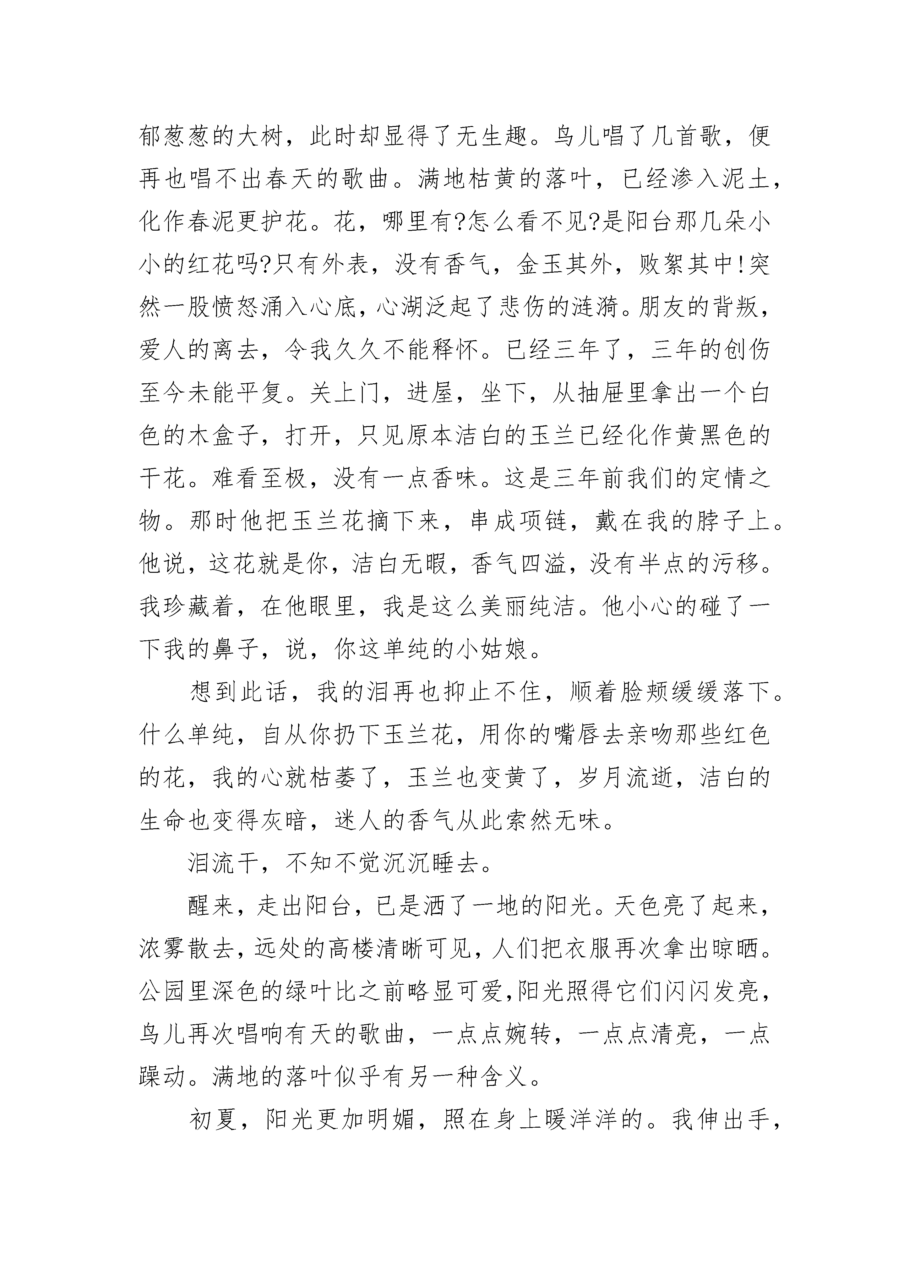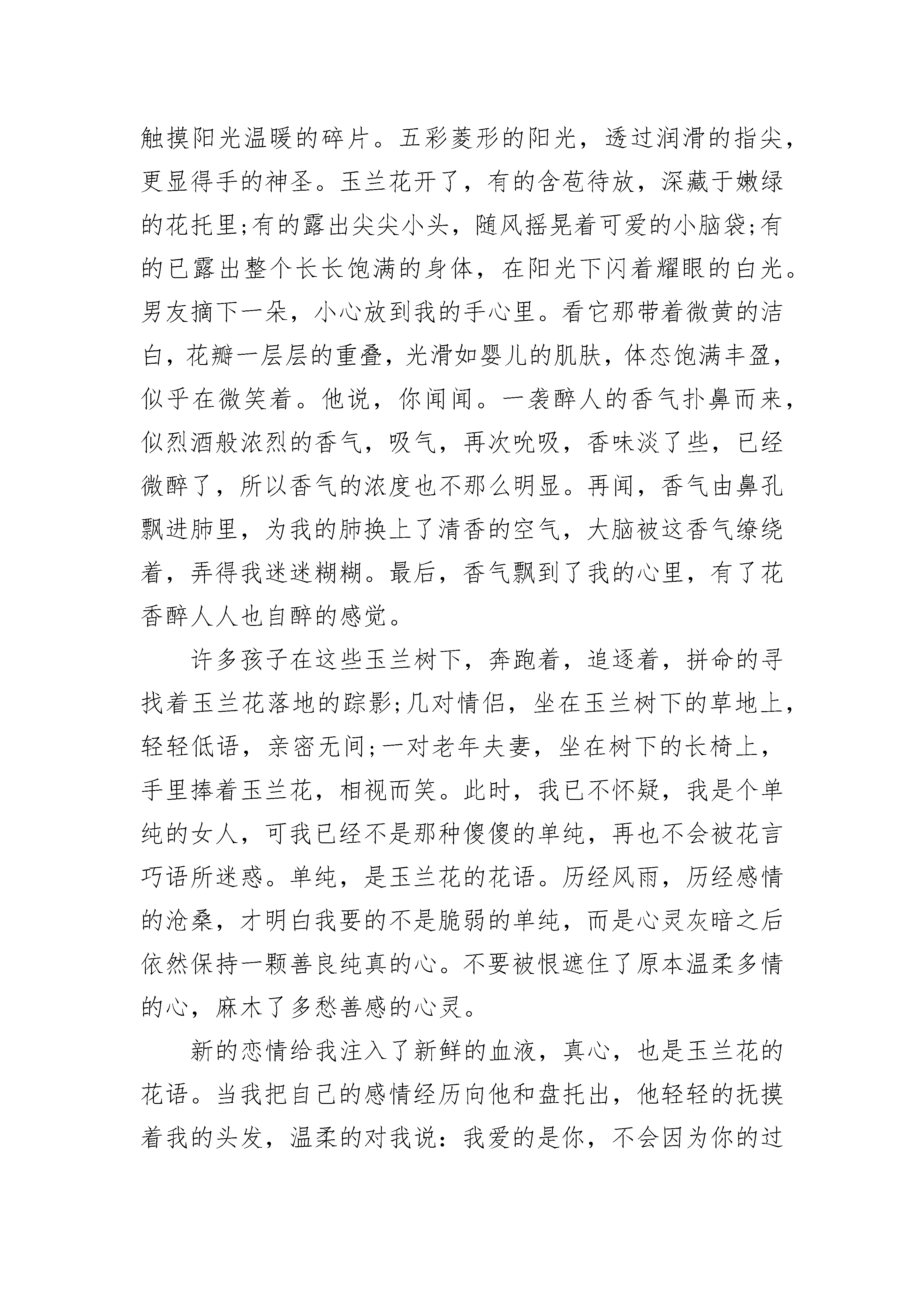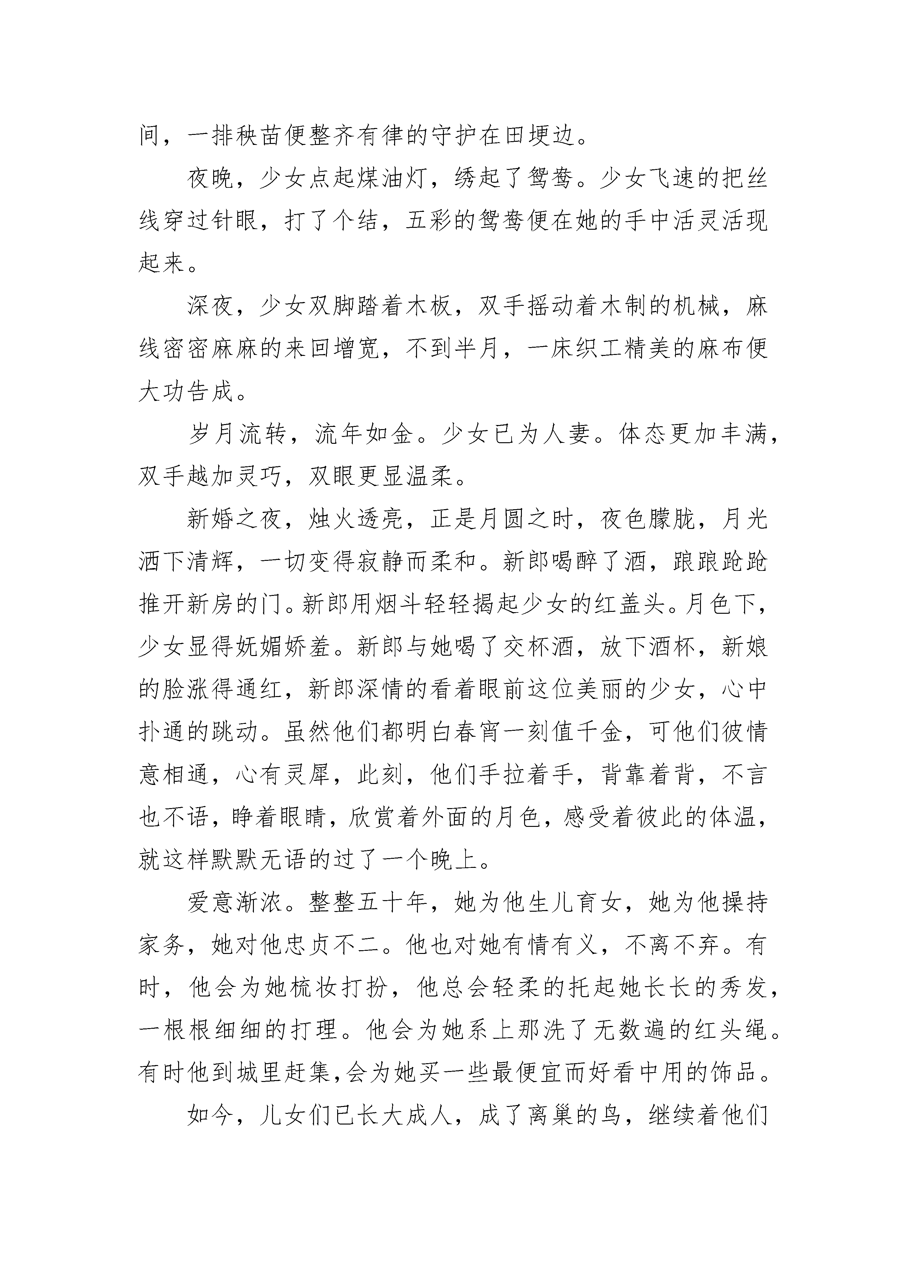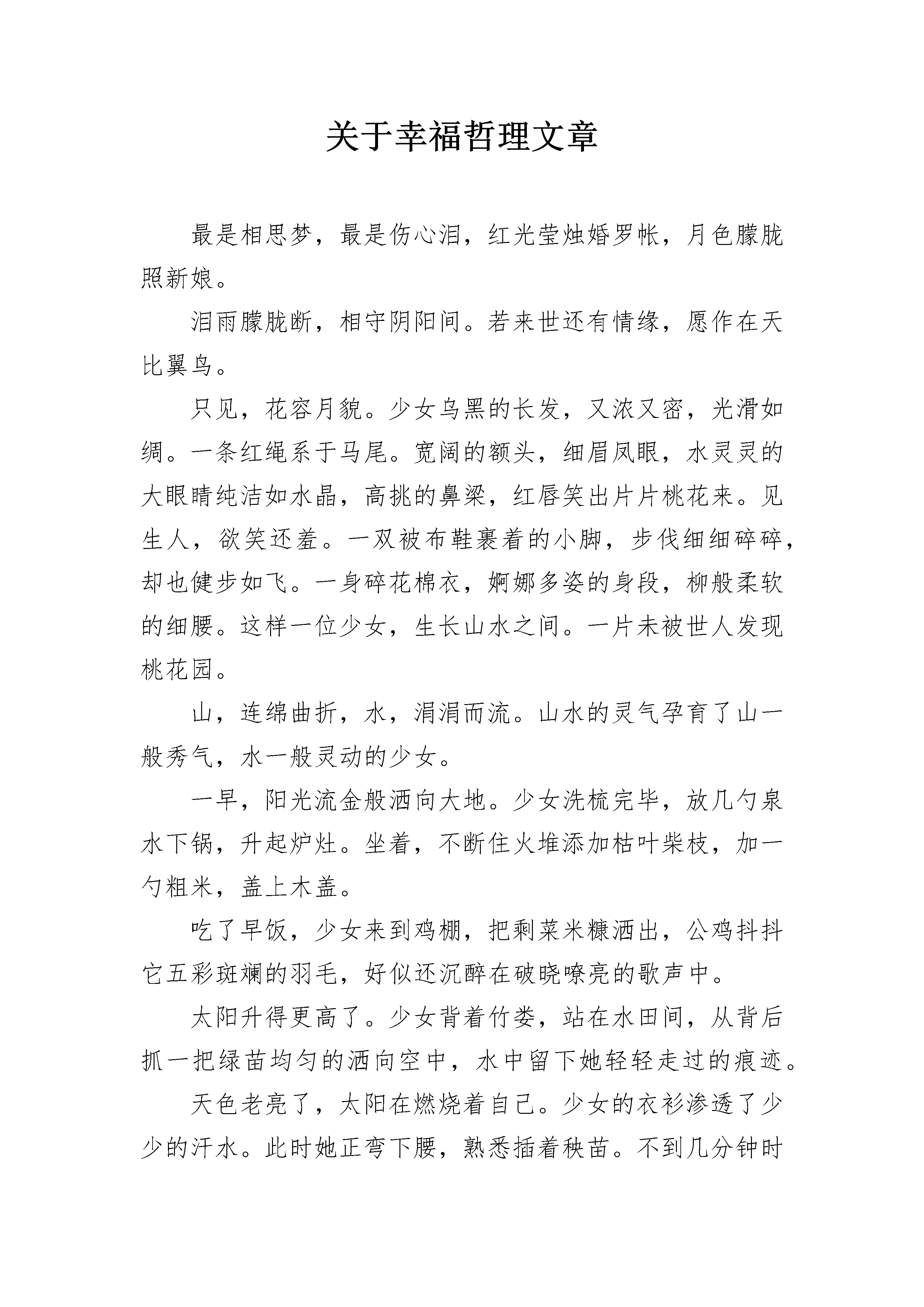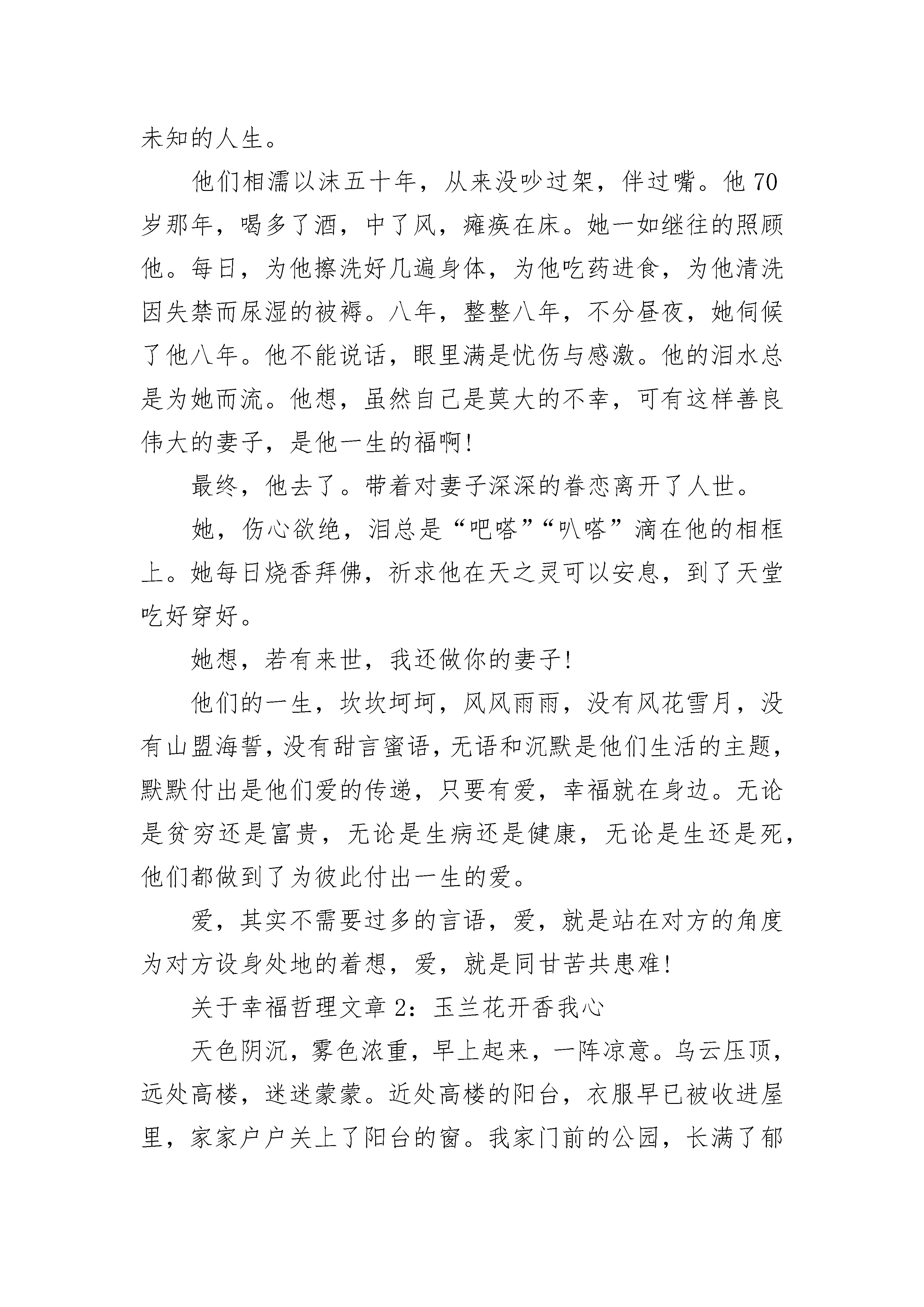关于幸福哲理文章最是相思梦,最是伤心泪,红光莹烛婚罗帐,月色朦胧照新娘。泪雨朦胧断,相守阴阳间。若来世还有情缘,愿作在天比翼鸟。只见,花容月貌。少女乌黑的长发,又浓又密,光滑如绸。一条红绳系于马尾。宽阔的额头,细眉凤眼,水灵灵的大眼睛纯洁如水晶,高挑的鼻梁,红唇笑出片片桃花来。见生人,欲笑还羞。一双被布鞋裹着的小脚,步伐细细碎碎,却也健步如飞。一身碎花棉衣,婀娜多姿的身段,柳般柔软的细腰。这样一位少女,生长山水之间。一片未被世人发现桃花园。山,连绵曲折,水,涓涓而流。山水的灵气孕育了山一般秀气,水一般灵动的少女。一早,阳光流金般洒向大地。少女洗梳完毕,放几勺泉水下锅,升起炉灶。坐着,不断住火堆添加枯叶柴枝,加一勺粗米,盖上木盖。吃了早饭,少女来到鸡棚,把剩菜米糠洒出,公鸡抖抖它五彩斑斓的羽毛,好似还沉醉在破晓嘹亮的歌声中。太阳升得更高了。少女背着竹娄,站在水田间,从背后抓一把绿苗均匀的洒向空中,水中留下她轻轻走过的痕迹。天色老亮了,太阳在燃烧着自己。少女的衣衫渗透了少少的汗水。此时她正弯下腰,熟悉插着秧苗。不到几分钟时间,一排秧苗便整齐有律的守护在田埂边。夜晚,少女点起煤油灯,绣起了鸳鸯。少女飞速的把丝线穿过针眼,打了个结,五彩的鸳鸯便在她的手中活灵活现起来。深夜,少女双脚踏着木板,双手摇动着木制的机械,麻线密密麻麻的来回增宽,不到半月,一床织工精美的麻布便大功告成。岁月流转,流年如金。少女已为人妻。体态更加丰满,双手越加灵巧,双眼更显温柔。新婚之夜,烛火透亮,正是月圆之时,夜色朦胧,月光洒下清辉,一切变得寂静而柔和。新郎喝醉了酒,踉踉跄跄推开新房的门。新郎用烟斗轻轻揭起少女的红盖头。月色下,少女显得妩媚娇羞。新郎与她喝了交杯酒,放下酒杯,新娘的脸涨得通红,新郎深情的看着眼前这位美丽的少女,心中扑通的跳动。虽然他们都明白春宵一刻值千金,可他们彼情意相通,心有灵犀,此刻,他们手拉着手,背靠着背,不言也不语,睁着眼睛,欣赏着外面的月色,感受着彼此的体温,就这样默默无语的过了一个晚上。爱意渐浓。整整五十年,她为他生儿育女,她为他操持家务,她对他忠贞不二。他也对她有情有义,不离不弃。有时,他会为她梳妆打扮,他总会轻柔的托起她长长的秀发,一根根细细的打理。他会为她系上那洗了无数遍的红头绳。有时他到城里赶集,会为她买一些最便宜而好看中用的饰品。如今,儿女们已长大成人,成了离巢的鸟,继续着他们未知的人生。他们相濡以沫五十年,从来没吵过架,伴过嘴。他70岁那年,喝多了酒,中了风,瘫痪在床。她一如继往的照顾他。每日,为他擦洗好几遍身体,为他吃药进食,为他清洗因失禁而尿湿的被褥。八年,整整八年,不分昼夜,她伺候了他八年。他不能说话,眼里满是忧伤与感激。他的泪水总是为她而流。他想,虽然自己是莫大的不幸,可有这样善良伟大的妻子,是他一生的福啊!最终,他去了。带着对妻子深深的眷恋离开了人世。她,伤心欲绝,泪总是“吧嗒”“叭嗒”滴在他的相框上。她每日烧香拜佛,祈求他在天之灵可以安息,到了天堂吃好穿好。她想,若有来世,我还做你的妻子!他们的一生,坎坎坷坷,风风雨雨,没有风花雪月,没有山盟海誓,没有甜言蜜语,无语和沉默是他们生活的主题,默默付出是他们爱的传递,只要有爱,幸福就在身边。无论是贫穷还是富贵,无论是生病还是健康,无论是生还是死,他们都做到了为彼此付出一生的爱。爱,其实不需要过多的言语,爱,就是站在对方的角度为对方设身处地的着想,爱,就是同甘苦共患难!关于幸福哲理文章2:玉兰花开香我心天色阴沉,雾色浓重,早上起来,一阵凉意。乌云压顶,远处高楼,迷迷蒙蒙。近处高楼的阳台,衣服早已被收进屋里,家家户户关上了阳台的窗。我家门前的公园,长满了郁郁葱葱的大树,此时却显得了无生趣。鸟儿唱了几首歌,便再也唱不出春天的歌曲。满地枯黄的落叶,已经渗入泥土,化作春泥更护花。花,哪里有?怎么看不见?是阳台那几朵小小的红花吗?只有外表,没有香气,金玉其外,败絮其中!突然一股愤怒涌入心底,心湖泛起了悲伤的涟漪。朋友的背叛,爱人的离去,令我久久不能释怀。已经三年了,三年的创伤至今未能平复。关上门,进屋,坐下,从抽屉里拿出一个白色的木盒子,打开,只见原本洁白的玉兰已经化作黄黑色的干花。难看至极,没有一点香味。这是三年前我们的定情之物。那时他把玉兰花摘下来,串成项链,戴在我的脖子上。他说,这花就是你,洁白无暇,香气四溢,没有半点的污移。我珍藏着,在他眼里,我是这么美丽纯洁。他小心的碰了一下我的鼻子,说,你这单纯的小姑娘。想到此话,我的泪再也抑止不住,顺着脸颊缓缓落下。什么单纯,自从你扔下玉兰花,用你的嘴唇去亲吻那些红色的花,我的心就枯萎了,玉兰也变黄了,岁月流逝,洁白的生命也变得灰暗,迷人的香气从此索然无味。泪流干,不知不觉沉沉睡去。醒来,走出阳台,已是洒了一地的阳光。天色亮了