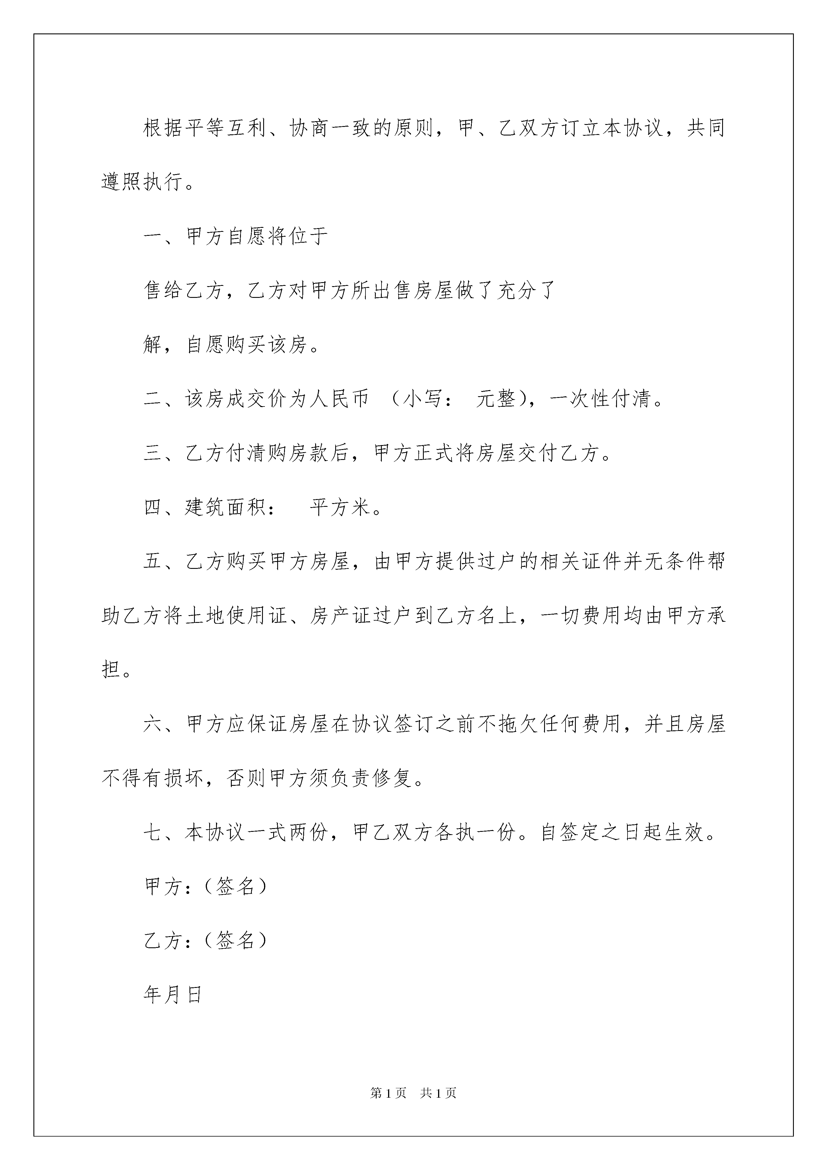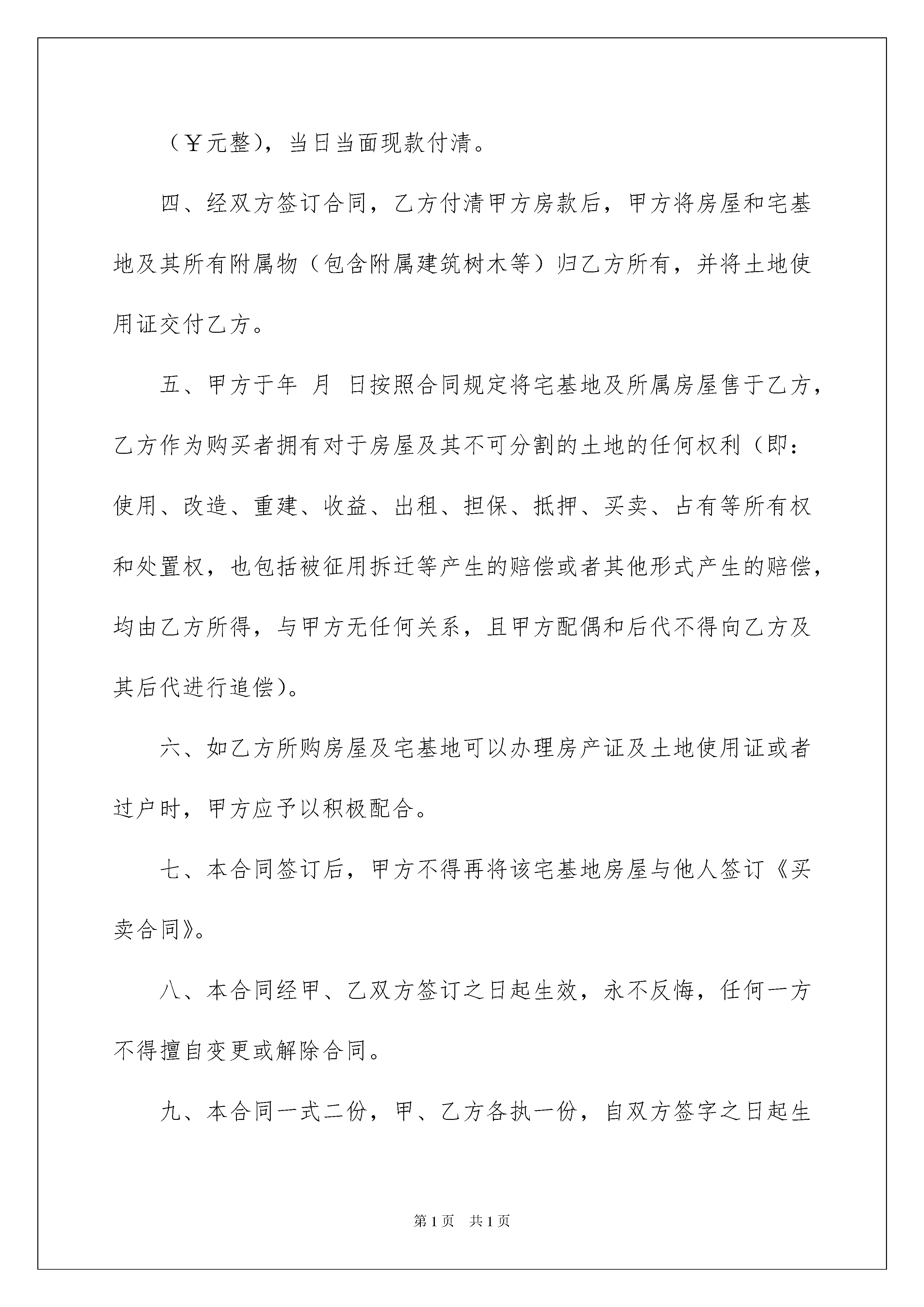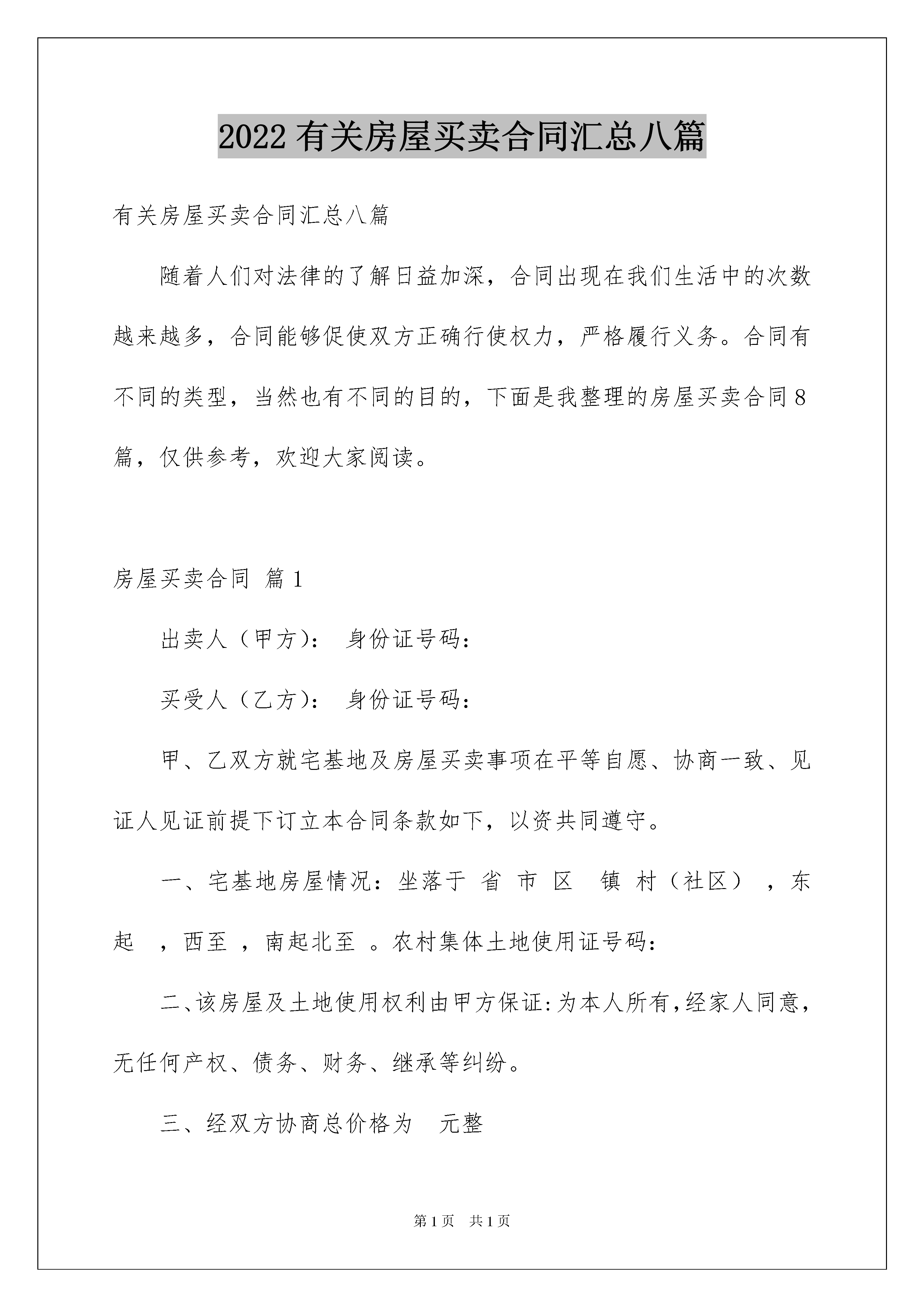 2022有关房屋买卖合同汇总八篇有关房屋买卖合同汇总八篇随着人们对法律的了解日益加深,合同出现在我们生活中的次数越来越多,合同能够促使双方正确行使权力,严格履行义务。合同有不同的类型,当然也有不同的目的,下面是我整理的房屋买卖合同8篇,仅供参考,欢迎大家阅读。房屋买卖合同篇1出卖人(甲方):身份证号码:买受人(乙方):身份证号码:甲、乙双方就宅基地及房屋买卖事项在平等自愿、协商一致、见证人见证前提下订立本合同条款如下,以资共同遵守。一、宅基地房屋情况:坐落于省市区镇村(社区),东起,西至,南起北至。农村集体土地使用证号码:二、该房屋及土地使用权利由甲方保证:为本人所有,经家人同意,无任何产权、债务、财务、继承等纠纷。三、经双方协商总价格为元整(¥元整),当日当面现款付清。四、经双方签订合同,乙方付清甲方房款后,甲方将房屋和宅基地及其所有附属物(包含附属建筑树木等)归乙方所有,并将土地使用证交付乙方。五、甲方于年月日按照合同规定将宅基地及所属房屋售于乙方,乙方作为购买者拥有对于房屋及其不可分割的土地的任何权利(即:使用、改造、重建、收益、出租、担保、抵押、买卖、占有等所有权和处置权,也包括被征用拆迁等产生的赔偿或者其他形式产生的赔偿,均由乙方所得,与甲方无任何关系,且甲方配偶和后代不得向乙方及其后代进行追偿)。六、如乙方所购房屋及宅基地可以办理房产证及土地使用证或者过户时,甲方应予以积极配合。七、本合同签订后,甲方不得再将该宅基地房屋与他人签订《买卖合同》。八、本合同经甲、乙双方签订之日起生效,永不反悔,任何一方不得擅自变更或解除合同。九、本合同一式二份,甲、乙方各执一份,自双方签字之日起生效。甲方:乙方:见证人:年月日房屋买卖合同篇2卖方(甲方):买方(乙方):姓名:电话:身份证号码:甲乙双方就农村建房买卖事项在平等自愿,协商一致前提下订立本合同,条款如下,以共同遵守。一、甲方自愿将产权房位于综合楼的单元室房屋(建筑面积______平方米)以人民币___拾__万__仟__佰__拾___元整(¥________元)的价款出售给乙方;同时出具有效票据,票据金额必须与本合同金额一致,房屋为简易成品房(见图纸)。二、乙方支付甲方合同定金伍万元,如甲方反悔本合同,双倍赔偿;如反悔本合同,定金不退。三、签定本合时,房屋产权不具备房屋产权过户条件。等过户条件成熟时,甲方应协助职工办理房屋产权过户登记手续。办理房屋产权登记的手续费、契税、土地出让金等有关费用由房屋所有人承担。四、根据建设进度乙方分批次将建设用款付给甲方,待大楼封顶完毕职工将剩余的房款一次性交付甲方。五、本合同签订后,甲方对本协议所售房屋的使用、收益、出租、占有等权利一并转让给乙方。六、本合同签订后,乙方不得随意就该房屋与他人订立《买卖合同》。七、本合同一式两份,甲乙双方各一份。甲方:乙方:签订日期:签订日期:房屋买卖合同篇3甲方(卖方):身份证号:乙方(买方):身份证号:根据平等互利、协商一致的原则,甲、乙双方订立本协议,共同遵照执行。一、甲方自愿将位于售给乙方,乙方对甲方所出售房屋做了充分了解,自愿购买该房。二、该房成交价为人民币(小写:元整),一次性付清。三、乙方付清购房款后,甲方正式将房屋交付乙方。四、建筑面积:平方米。五、乙方购买甲方房屋,由甲方提供过户的相关证件并无条件帮助乙方将土地使用证、房产证过户到乙方名上,一切费用均由甲方承担。六、甲方应保证房屋在协议签订之前不拖欠任何费用,并且房屋不得有损坏,否则甲方须负责修复。七、本协议一式两份,甲乙双方各执一份。自签定之日起生效。甲方:(签名)乙方:(签名)年月日房屋买卖合同篇4双方当事人:出卖人:身份证联系电话:买受人:身份证联系电话:根据《中华人民共和国合同法》、《中华人民共和国城市房地产管理法》及其他有关法律、法规之规定,买受人和出卖人在平等、自愿、协商一致的基础上就买卖商品房达成如下协议:第一条买受人所购房屋的基本情况买受人购买的商品房为:北京市海淀区中关村东路123号第__1__2206_号房。该商品房的用途为住宅,属钢混结构,建筑层数地上__24__层,地下_2_层。该商品房阳台是。该商品房建筑面积共137.24平方米.第二条计价方式与价款出卖人与买受人约定按下述第_1_种方式计算该商品房价款:1、按建筑面积计算,该房屋每平方米10565.43元,总金额(1450000元)壹佰肆拾伍万零仟零佰零拾零元整。2、按套内建筑面积计算,该房屋单价为每平方米__________元,总金额_____千_____百_____拾_____万_____千_____百___