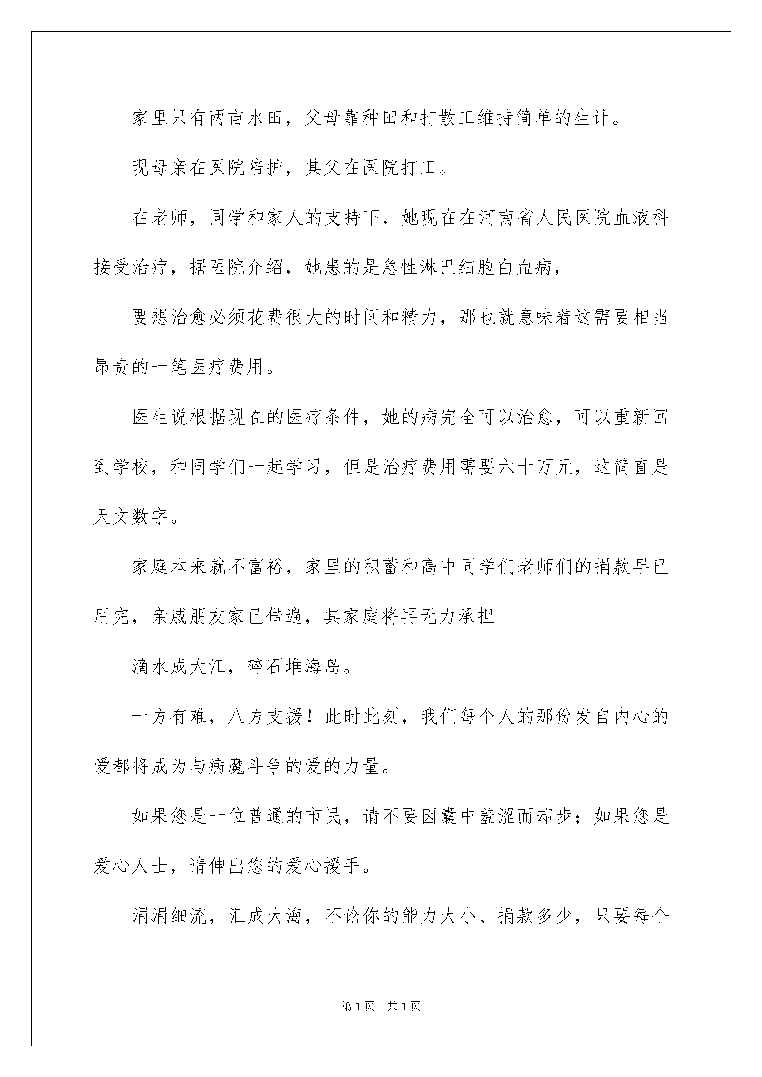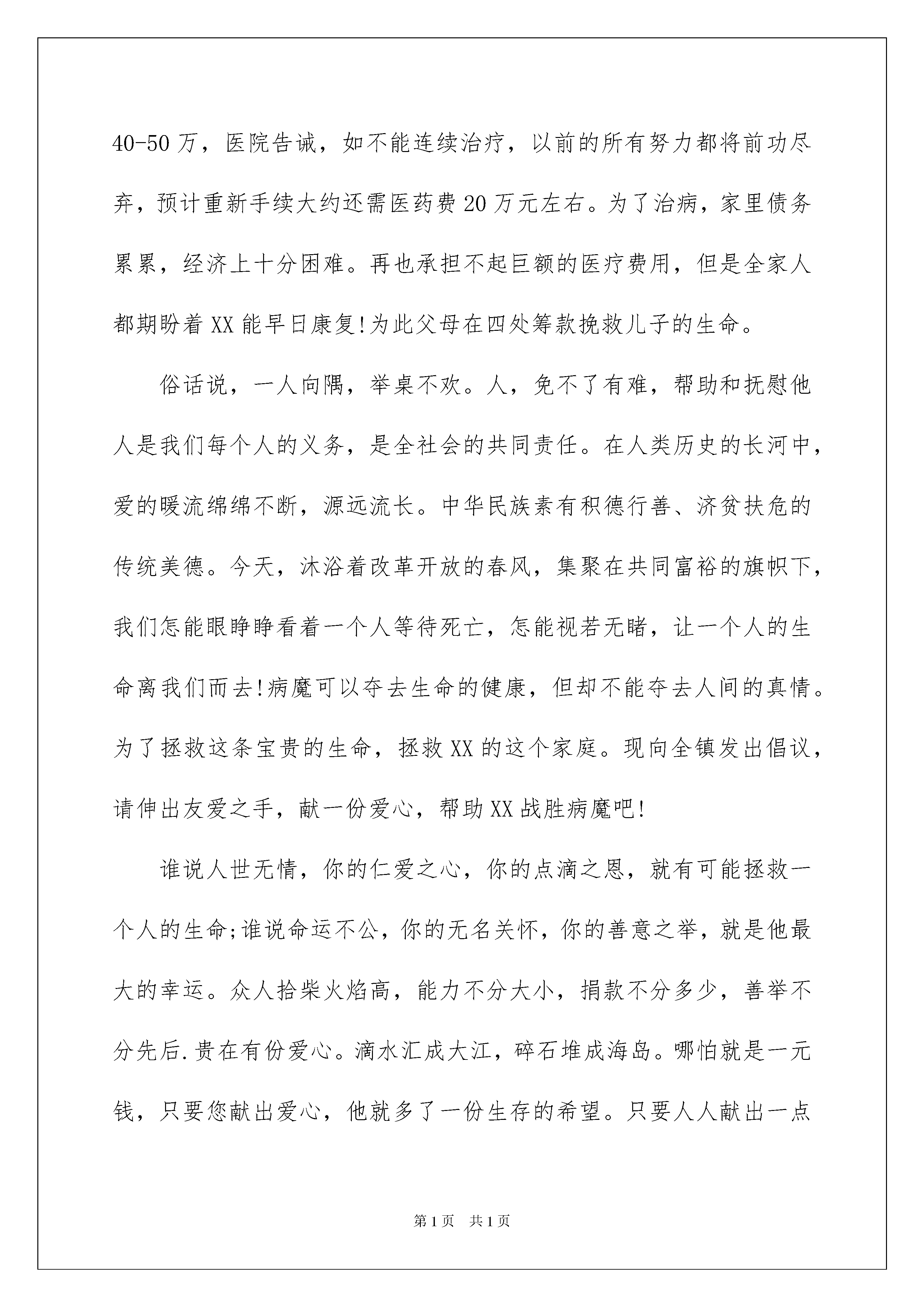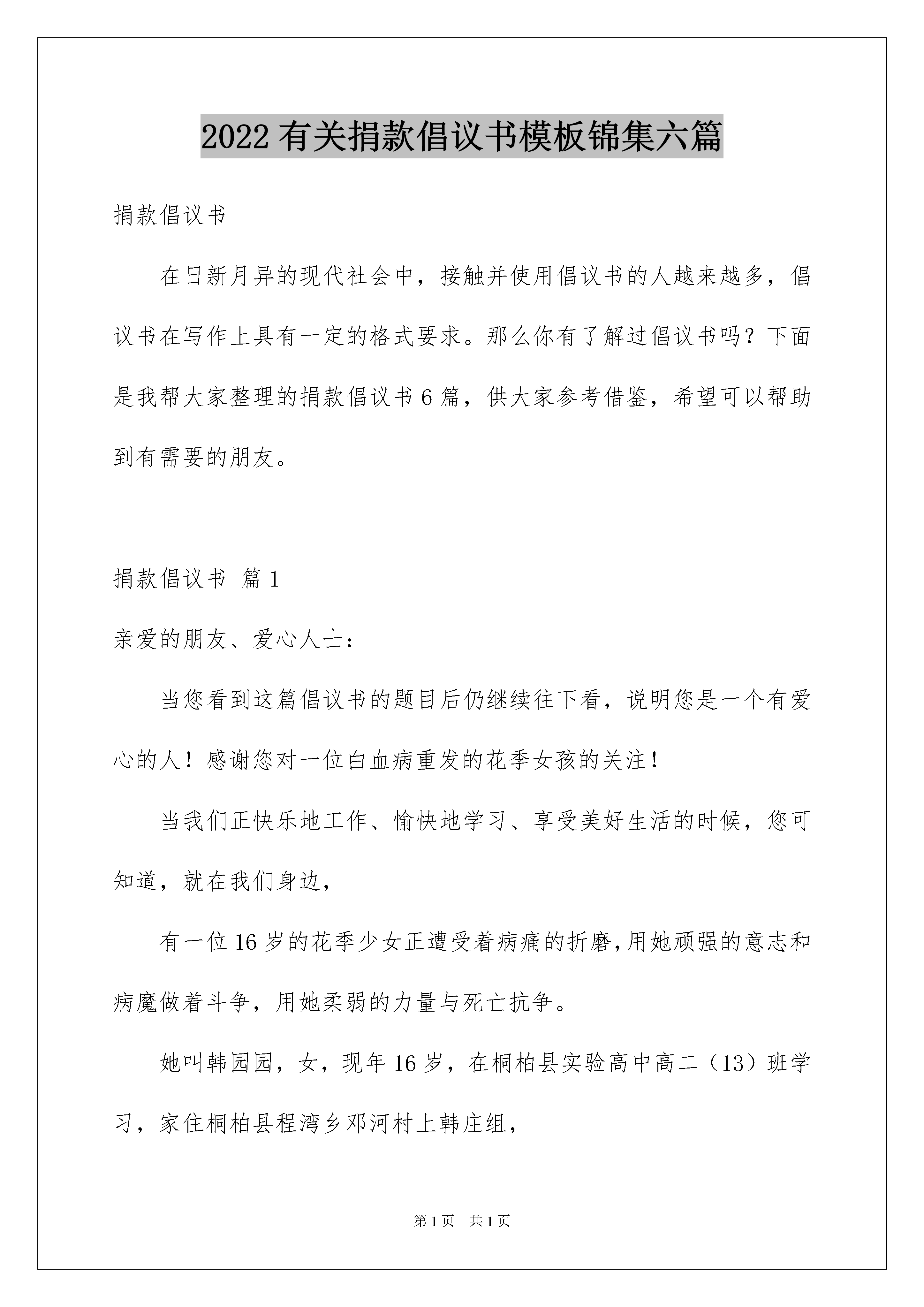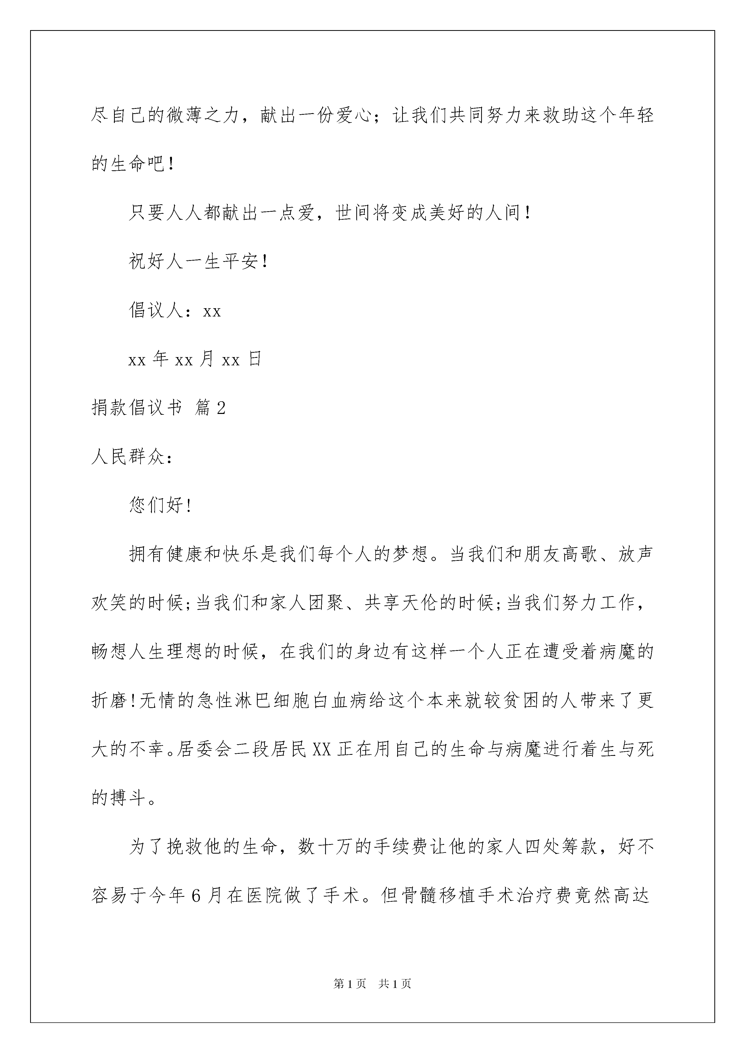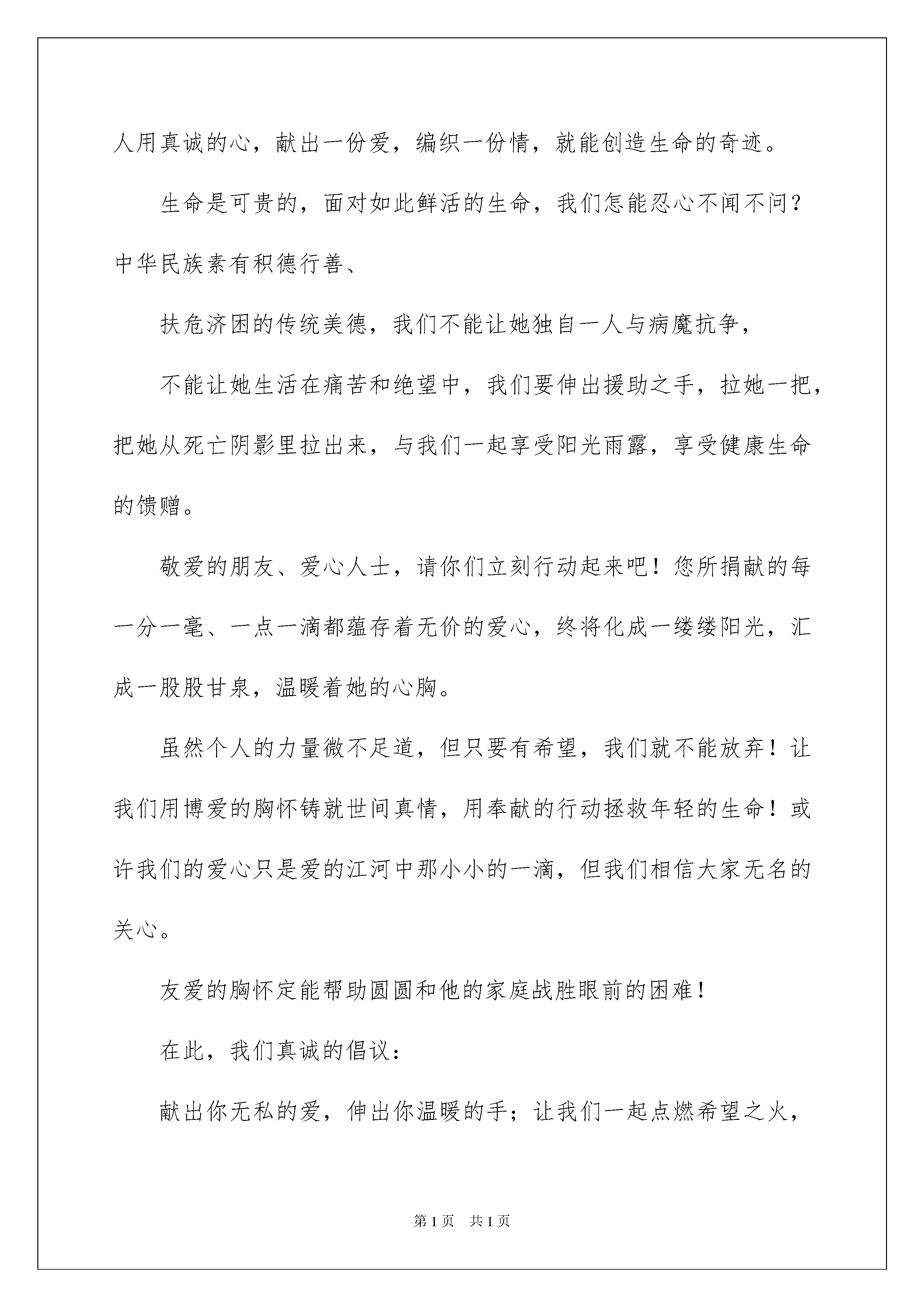 2022有关捐款倡议书模板锦集六篇捐款倡议书在日新月异的现代社会中,接触并使用倡议书的人越来越多,倡议书在写作上具有一定的格式要求。那么你有了解过倡议书吗?下面是我帮大家整理的捐款倡议书6篇,供大家参考借鉴,希望可以帮助到有需要的朋友。捐款倡议书篇1亲爱的朋友、爱心人士:当您看到这篇倡议书的题目后仍继续往下看,说明您是一个有爱心的人!感谢您对一位白血病重发的花季女孩的关注!当我们正快乐地工作、愉快地学习、享受美好生活的时候,您可知道,就在我们身边,有一位16岁的花季少女正遭受着病痛的折磨,用她顽强的意志和病魔做着斗争,用她柔弱的力量与死亡抗争。她叫韩园园,女,现年16岁,在桐柏县实验高中高二(13)班学习,家住桐柏县程湾乡邓河村上韩庄组,家里只有两亩水田,父母靠种田和打散工维持简单的生计。现母亲在医院陪护,其父在医院打工。在老师,同学和家人的支持下,她现在在河南省人民医院血液科接受治疗,据医院介绍,她患的是急性淋巴细胞白血病,要想治愈必须花费很大的时间和精力,那也就意味着这需要相当昂贵的一笔医疗费用。医生说根据现在的医疗条件,她的病完全可以治愈,可以重新回到学校,和同学们一起学习,但是治疗费用需要六十万元,这简直是天文数字。家庭本来就不富裕,家里的积蓄和高中同学们老师们的捐款早已用完,亲戚朋友家已借遍,其家庭将再无力承担滴水成大江,碎石堆海岛。一方有难,八方支援!此时此刻,我们每个人的那份发自内心的爱都将成为与病魔斗争的爱的力量。如果您是一位普通的市民,请不要因囊中羞涩而却步;如果您是爱心人士,请伸出您的爱心援手。涓涓细流,汇成大海,不论你的能力大小、捐款多少,只要每个人用真诚的心,献出一份爱,编织一份情,就能创造生命的奇迹。生命是可贵的,面对如此鲜活的生命,我们怎能忍心不闻不问?中华民族素有积德行善、扶危济困的传统美德,我们不能让她独自一人与病魔抗争,不能让她生活在痛苦和绝望中,我们要伸出援助之手,拉她一把,把她从死亡阴影里拉出来,与我们一起享受阳光雨露,享受健康生命的馈赠。敬爱的朋友、爱心人士,请你们立刻行动起来吧!您所捐献的每一分一毫、一点一滴都蕴存着无价的爱心,终将化成一缕缕阳光,汇成一股股甘泉,温暖着她的心胸。虽然个人的力量微不足道,但只要有希望,我们就不能放弃!让我们用博爱的胸怀铸就世间真情,用奉献的行动拯救年轻的生命!或许我们的爱心只是爱的江河中那小小的一滴,但我们相信大家无名的关心。友爱的胸怀定能帮助圆圆和他的家庭战胜眼前的困难!在此,我们真诚的倡议:献出你无私的爱,伸出你温暖的手;让我们一起点燃希望之火,尽自己的微薄之力,献出一份爱心;让我们共同努力来救助这个年轻的生命吧!只要人人都献出一点爱,世间将变成美好的人间!祝好人一生平安!倡议人:xxxx年xx月xx日捐款倡议书篇2人民群众:您们好!拥有健康和快乐是我们每个人的梦想。当我们和朋友高歌、放声欢笑的时候;当我们和家人团聚、共享天伦的时候;当我们努力工作,畅想人生理想的时候,在我们的身边有这样一个人正在遭受着病魔的折磨!无情的急性淋巴细胞白血病给这个本来就较贫困的人带来了更大的不幸。居委会二段居民XX正在用自己的生命与病魔进行着生与死的搏斗。为了挽救他的生命,数十万的手续费让他的家人四处筹款,好不容易于今年6月在医院做了手术。但骨髓移植手术治疗费竟然高达40-50万,医院告诫,如不能连续治疗,以前的所有努力都将前功尽弃,预计重新手续大约还需医药费20万元左右。为了治病,家里债务累累,经济上十分困难。再也承担不起巨额的医疗费用,但是全家人都期盼着XX能早日康复!为此父母在四处筹款挽救儿子的生命。俗话说,一人向隅,举桌不欢。人,免不了有难,帮助和抚慰他人是我们每个人的义务,是全社会的共同责任。在人类历史的长河中,爱的暖流绵绵不断,源远流长。中华民族素有积德行善、济贫扶危的传统美德。今天,沐浴着改革开放的春风,集聚在共同富裕的旗帜下,我们怎能眼睁睁看着一个人等待死亡,怎能视若无睹,让一个人的生命离我们而去!病魔可以夺去生命的健康,但却不能夺去人间的真情。为了拯救这条宝贵的生命,拯救XX的这个家庭。现向全镇发出倡议,请伸出友爱之手,献一份爱心,帮助XX战胜病魔吧!谁说人世无情,你的仁爱之心,你的点滴之恩,就有可能拯救一个人的生命;谁说命运不公,你的无名关怀,你的善意之举,就是他最大的幸运。众人拾柴火焰高,能力不分大小,捐款不分多少,善举不分先后.贵在有份爱心。滴水汇成大江,碎石堆成海岛。哪怕就是一元钱,只要您献出爱心,他就多了一份生存的希望。只要人人献出一点爱,世界将变成美好的人间!也许您与他素不相识,但爱心