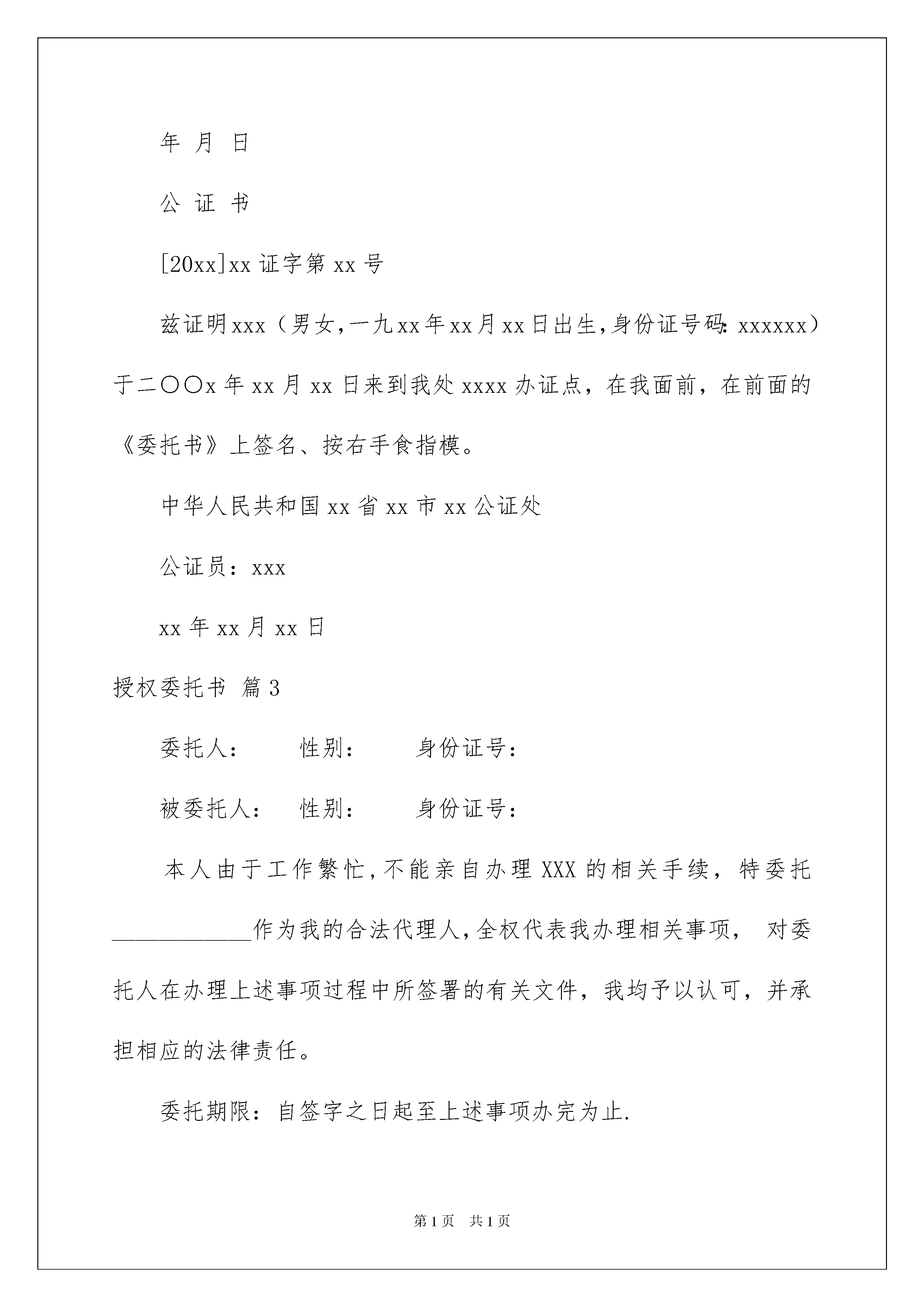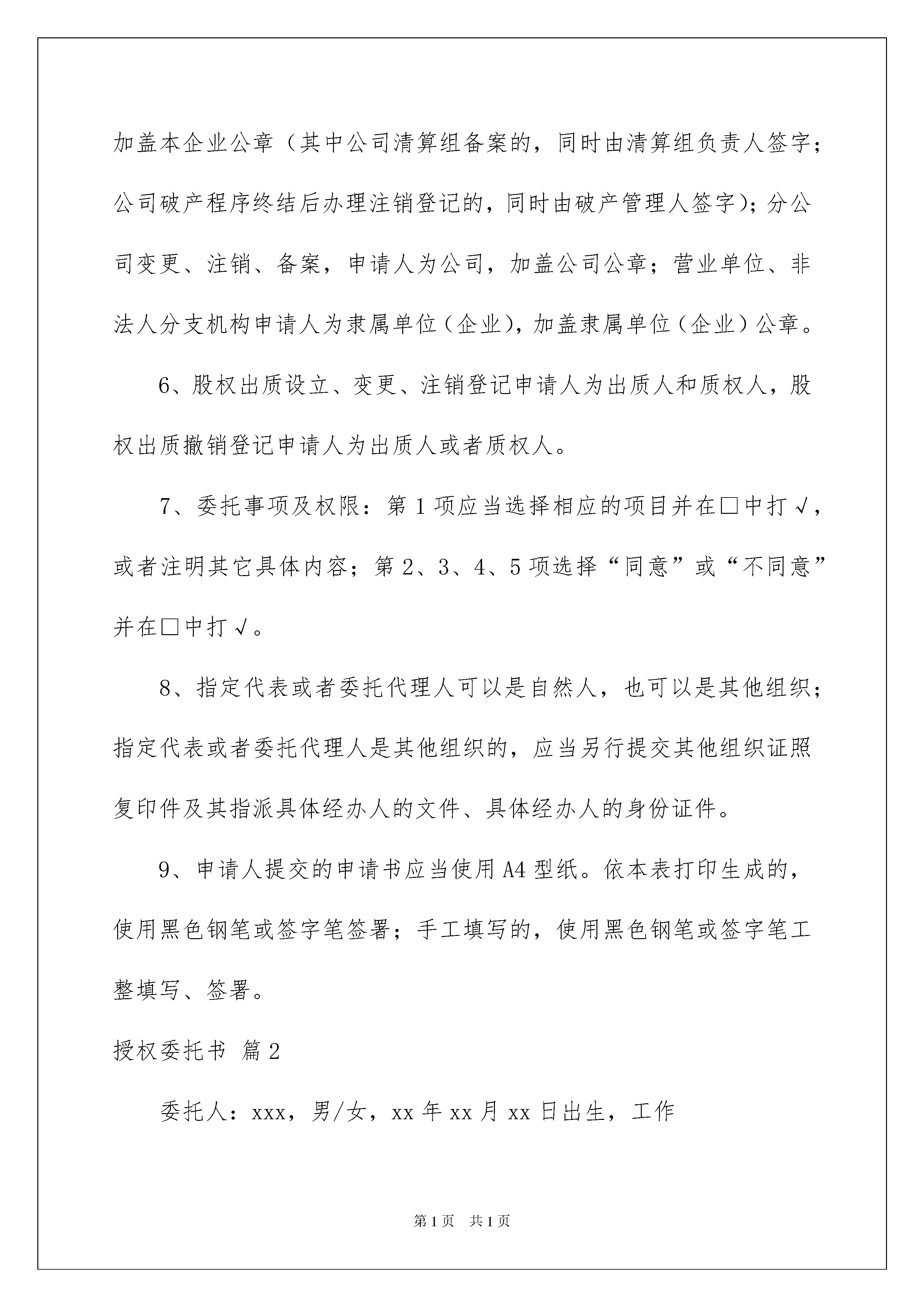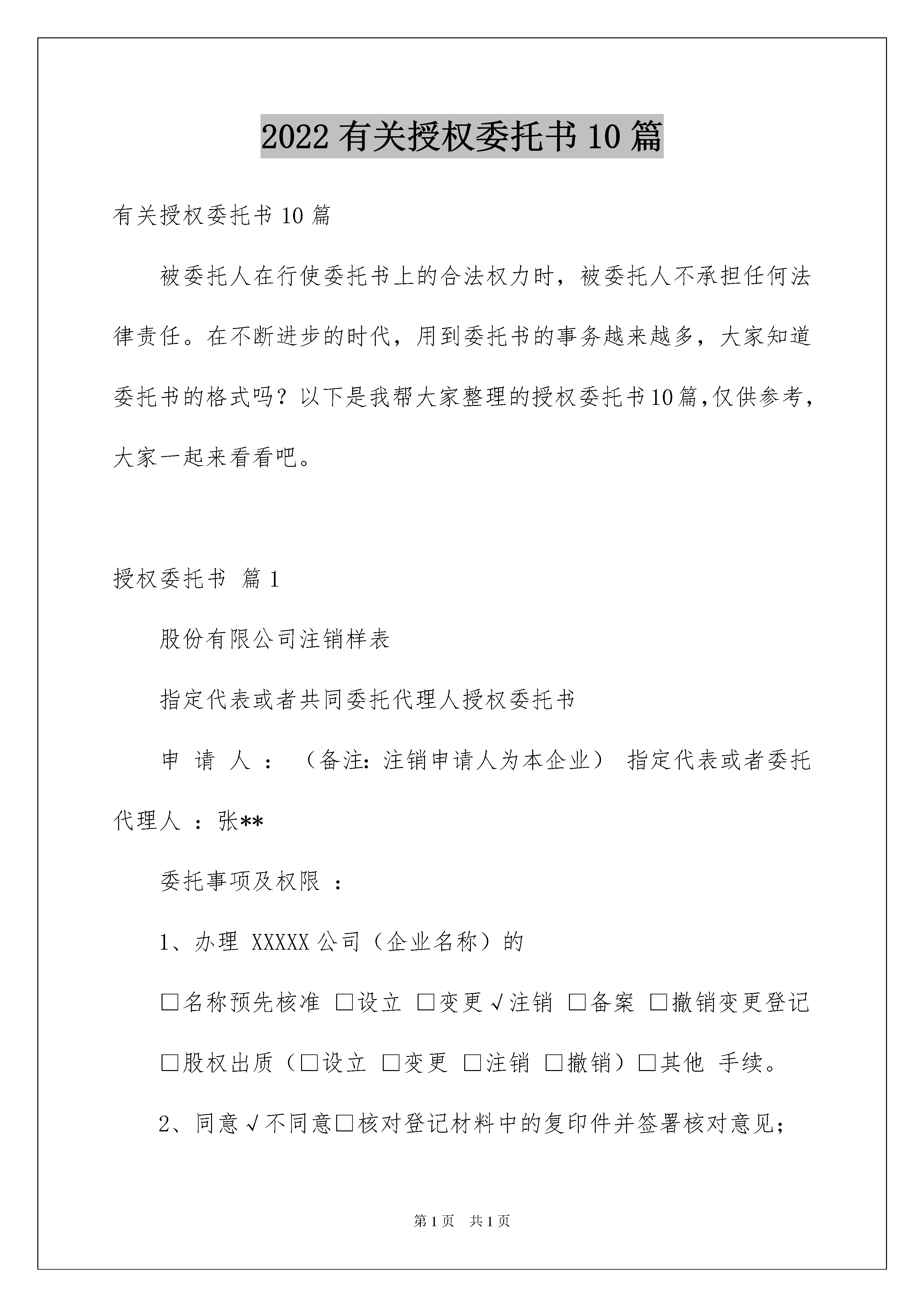 2022有关授权委托书10篇有关授权委托书10篇被委托人在行使委托书上的合法权力时,被委托人不承担任何法律责任。在不断进步的时代,用到委托书的事务越来越多,大家知道委托书的格式吗?以下是我帮大家整理的授权委托书10篇,仅供参考,大家一起来看看吧。授权委托书篇1股份有限公司注销样表指定代表或者共同委托代理人授权委托书申请人:(备注:注销申请人为本企业)指定代表或者委托代理人:张**委托事项及权限:1、办理XXXXX公司(企业名称)的□名称预先核准□设立□变更√注销□备案□撤销变更登记□股权出质(□设立□变更□注销□撤销)□其他手续。2、同意√不同意□核对登记材料中的复印件并签署核对意见;3、同意√不同意□修改企业自备文件的错误;4、同意√不同意□修改有关表格的填写错误;5、同意√不同意□领取营业执照和有关文书。公司盖章XXXX年XX月XX日填写说明1、本委托书适用于公司及其分公司、非公司企业法人及其分支机构、营业单位在工商行政管理部门办理登记、备案,公司办理股权出质登记等业务。2、名称预先核准,新申请名称申请人为全体投资人或隶属企业,已设立企业变更名称申请人为本企业,由企业法定代表人签署。3、设立登记,有限责任公司申请人为全体股东,国有独资公司申请人为国务院或地方人民政府国有资产监督管理机构,股份有限公司申请人为董事会,非公司企业法人申请人为主管部门(出资人),分公司申请人为公司,营业单位、非法人分支机构申请人为隶属单位(企业)。自然人申请人由本人签字,非自然人申请人加盖公章。4、公司、非公司企业法人变更、注销、备案,申请人为本企业,加盖本企业公章(其中公司清算组备案的,同时由清算组负责人签字;公司破产程序终结后办理注销登记的,同时由破产管理人签字);分公司变更、注销、备案,申请人为公司,加盖公司公章;营业单位、非法人分支机构申请人为隶属单位(企业),加盖隶属单位(企业)公章。6、股权出质设立、变更、注销登记申请人为出质人和质权人,股权出质撤销登记申请人为出质人或者质权人。7、委托事项及权限:第1项应当选择相应的项目并在□中打√,或者注明其它具体内容;第2、3、4、5项选择“同意”或“不同意”并在□中打√。8、指定代表或者委托代理人可以是自然人,也可以是其他组织;指定代表或者委托代理人是其他组织的,应当另行提交其他组织证照复印件及其指派具体经办人的文件、具体经办人的身份证件。9、申请人提交的申请书应当使用A4型纸。依本表打印生成的,使用黑色钢笔或签字笔签署;手工填写的,使用黑色钢笔或签字笔工整填写、签署。授权委托书篇2委托人:xxx,男/女,xx年xx月xx日出生,工作单位:xxxxxxxxx,现住址:xxxxxxxxxxx,身份证xxxxxxxxxxxxxxxxx受委托人:xxx,男/女,xx年xx月xx日出生,工作单位:xxxxxxxxxxxx,现住址:xxxxxxxxxxx,身份证xxxxxxxxxxxxxxxxxx受委托人与委托人是夫妻关系,我们夫妻以xxx名义购买了位于xxxx的住房一套,按相关规定夫妻双方须到场办理贷款手续,因本人工作繁忙,不能到现场亲自办理相关事宜,现委托丈夫xxx作为我的全权代理人,在xx住房公积金管理中心和相关住房置业担保机构代我签定《个人住房公积金借款申请书》、《借款合同》、《抵押(反担保)合同》、《收押协议》、《抵押登记申请书》、《房屋未出租证明明》、《授权委托书》、《还款帐房确认书》、《电话委托服务协议》、《交接单》及其它相关未尽事项。受托人xxx代我签定的上述文件我均予以承认,并由我承担由此产生的一切法律后果。代理期限:自委托书签署之日起至xx年xx月xx日止。受托人有转委托权。委托人:年月日公证书[20xx]xx证字第xx号兹证明xxx(男女,一九xx年xx月xx日出生,身份证号码:xxxxxx)于二○○x年xx月xx日来到我处xxxx办证点,在我面前,在前面的《委托书》上签名、按右手食指模。中华人民共和国xx省xx市xx公证处公证员:xxxxx年xx月xx日授权委托书篇3委托人:性别:身份证号:被委托人:性别:身份证号:本人由于工作繁忙,不能亲自办理XXX的相关手续,特委托____________作为我的合法代理人,全权代表我办理相关事项,对委托人在办理上述事项过程中所签署的有关文件,我均予以认可,并承担相应的法律责任。委托期限:自签字之日起至上述事项办完为止.委托人:年月日授权委托书篇4授权委托书兹委托湖州久居房产中介代表本委托人全权办理位于的水、电、有线电视,过户给的手续。委托人:受托人:湖州久居房产中介年月日业务联系单兹有