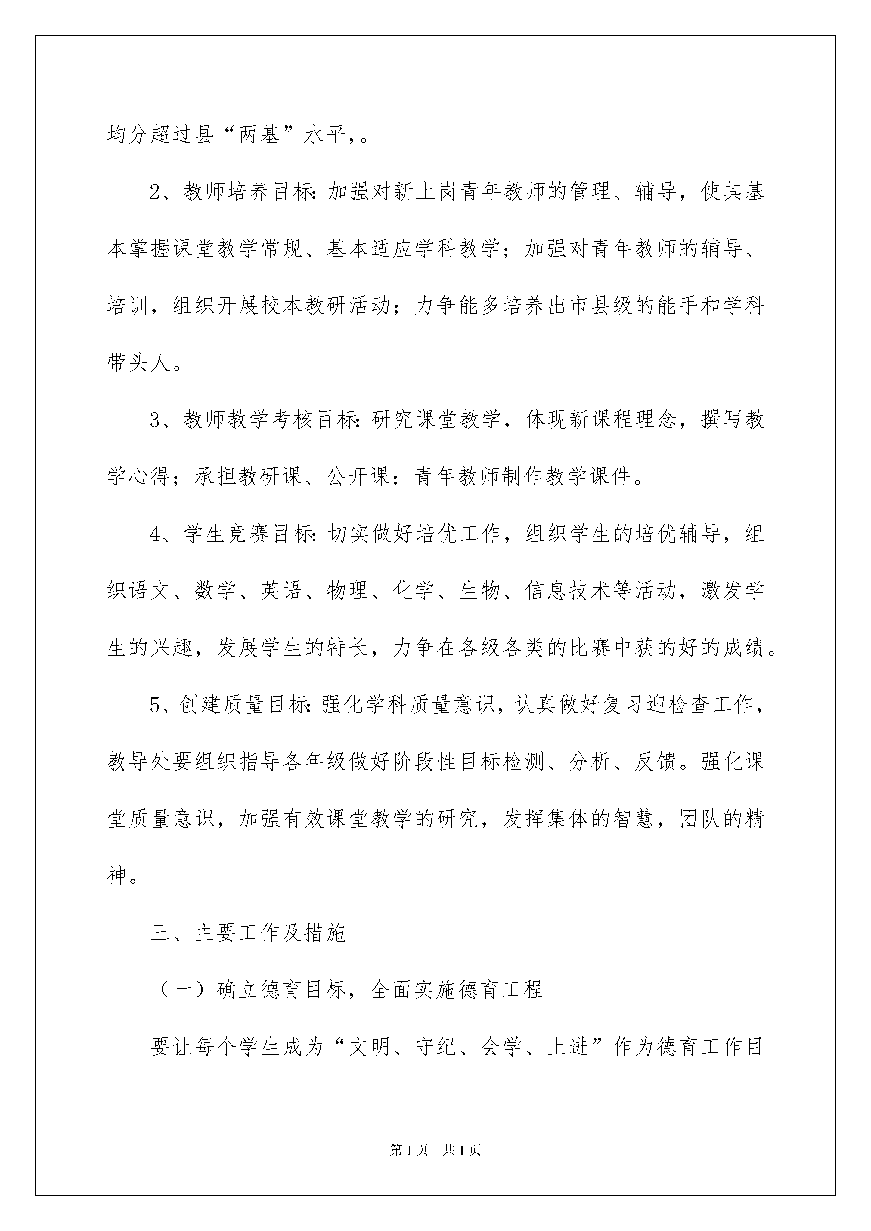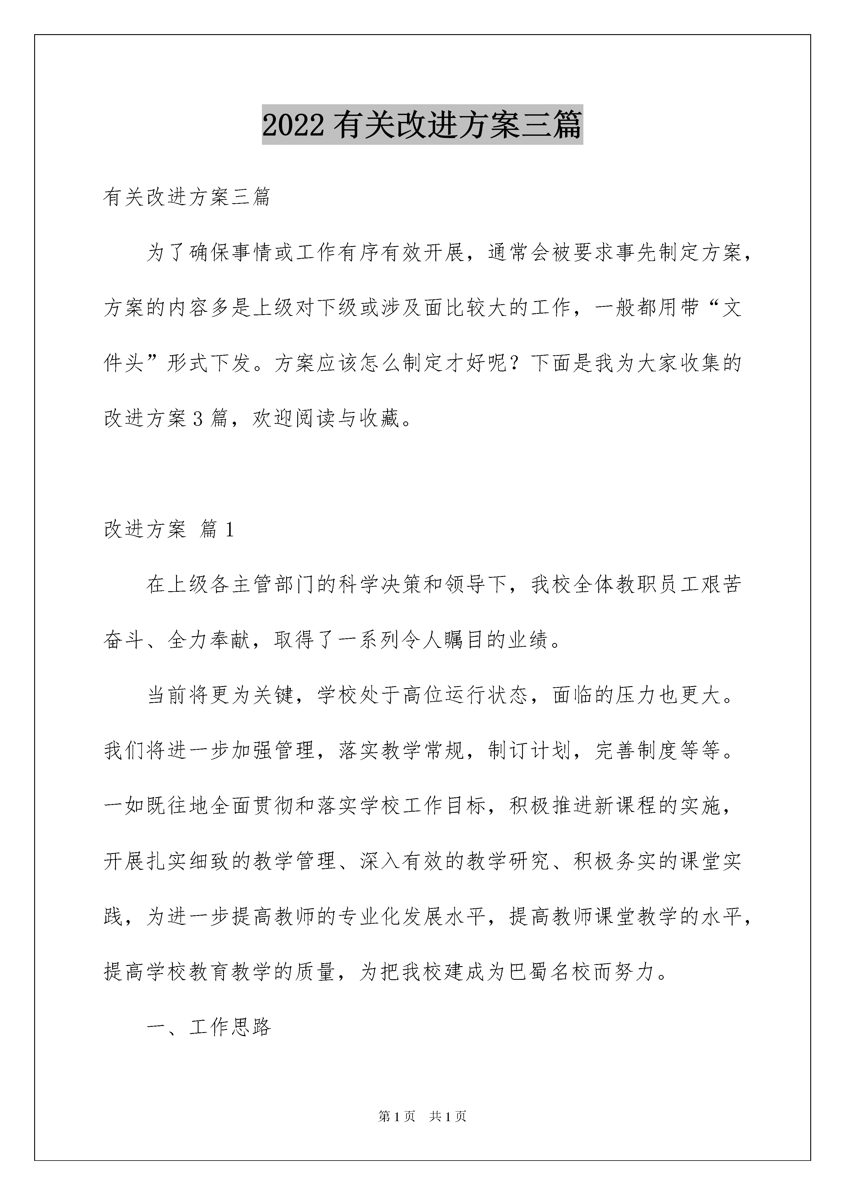 2022有关改进方案三篇有关改进方案三篇为了确保事情或工作有序有效开展,通常会被要求事先制定方案,方案的内容多是上级对下级或涉及面比较大的工作,一般都用带“文件头”形式下发。方案应该怎么制定才好呢?下面是我为大家收集的改进方案3篇,欢迎阅读与收藏。改进方案篇1在上级各主管部门的科学决策和领导下,我校全体教职员工艰苦奋斗、全力奉献,取得了一系列令人瞩目的业绩。当前将更为关键,学校处于高位运行状态,面临的压力也更大。我们将进一步加强管理,落实教学常规,制订计划,完善制度等等。一如既往地全面贯彻和落实学校工作目标,积极推进新课程的实施,开展扎实细致的教学管理、深入有效的教学研究、积极务实的课堂实践,为进一步提高教师的专业化发展水平,提高教师课堂教学的水平,提高学校教育教学的质量,为把我校建成为巴蜀名校而努力。一、工作思路1、加强教学过程管理,注意科学管理、细节管理,增强教学工作的实效性。要规范课堂教学常规、教研常规、科研常规、教学检查常规等工作。2、以课程改革实验为主线,继续加强学习培训,进一步增强教师的新课改意识,使教师进行课改的实践研究化为自觉的行动,促使教师向专业化发展,提高教师的综合素质;3、以课改为核心,立足课堂,扎实开展课堂教学改革,探究教学新方法,总结新经验,提高我校教师授课水平。4、努力做好各级科研课题的实验研究工作,积极开展新课题的研究。5、继续扎实有效地抓好教学环节的落实与督查工作,加强教学设计的研究、课堂教学的调研和学科质量的调研,进一步提高教师教学设计的研究能力、提高教育教学质量;6、加强制度建设。进一步建立健全各种教学管理规章制度,完善师生评价机制,促进教学工作和谐发展。7、重视体、卫、音、美教育教学工作,全面提升素质,体现学校特色。8、加强教研组建设,提倡教师间围绕教学进行交流和对话,发挥教师集体智慧,提高教学质量,促进教师专业发展。加强教师自我反思和监控,树立科学的教育质量观。9、提高学生在校学习、生活、活动的质量,抓好各年级学科竞赛辅导和考务工作,全面提高学生素质。10、加强学校教育信息化工程建设,深入开展信息技术与学科教学的整合的研究。11、加强教导处、教科室的日常管理工作,使管理走向规范化、科学化,以点带面努力提高学校的教学管理水平。二、工作质量目标1、学科质量目标高三各学科成绩统计数据(平均分、达标率和有效达标率等)居全县第一名,在市内同类学校处于领先位置,初三年级各学科能进入到全县前列;高一、高二基地班学生必须有学生进入全市前10名,力争囊括县前10名,全县前100名中,我校应力争占80%以上,各学科成绩统计数据(平均分、达标率和有效达标率等)居全县第一名,在市内同类学校处于领先位置;初一、二年级各学科合格率、优秀率和均分超过县“两基”水平,。2、教师培养目标:加强对新上岗青年教师的管理、辅导,使其基本掌握课堂教学常规、基本适应学科教学;加强对青年教师的辅导、培训,组织开展校本教研活动;力争能多培养出市县级的能手和学科带头人。3、教师教学考核目标:研究课堂教学,体现新课程理念,撰写教学心得;承担教研课、公开课;青年教师制作教学课件。4、学生竞赛目标:切实做好培优工作,组织学生的培优辅导,组织语文、数学、英语、物理、化学、生物、信息技术等活动,激发学生的兴趣,发展学生的特长,力争在各级各类的比赛中获的好的成绩。5、创建质量目标:强化学科质量意识,认真做好复习迎检查工作,教导处要组织指导各年级做好阶段性目标检测、分析、反馈。强化课堂质量意识,加强有效课堂教学的研究,发挥集体的智慧,团队的精神。三、主要工作及措施(一)确立德育目标,全面实施德育工程要让每个学生成为“文明、守纪、会学、上进”作为德育工作目标,以形成良好的行为习惯和道德观念、增强法观念理想信念为德育工作重点。对学生的评价,不唯分数,而是多层次,多角度的综合评价各类优秀学生。依据目标,实施多维评价,确保德育工作的有效性、实践性。(二)加强教师业务学习,促进老师专业发展。学校管理最灵魂最核心的东西就是用老师的专业发展带动学校的发展,影响学生的成长。本学年,我们将围绕德阳市第三届青年教师技能大赛的一系列活动(笔试、说课、讲课),积极开展校内相关活动。各教研组分学科进行,通过学习与实践,提升和转变教师的教育理念、教育行为。(三)狠抓教学常规工作,重务实,重实效。1、认真贯彻落实国家教育方针,努力开齐课程,开足课时,全面提高学生的综合素质,减轻学生的课业负担,让学生在德、智、美、劳等方面都得到全面的`发展。2、建立健全教学管理制度和教学质量的综合评价体系,加强教学过程的有序管理。《教学常规管
