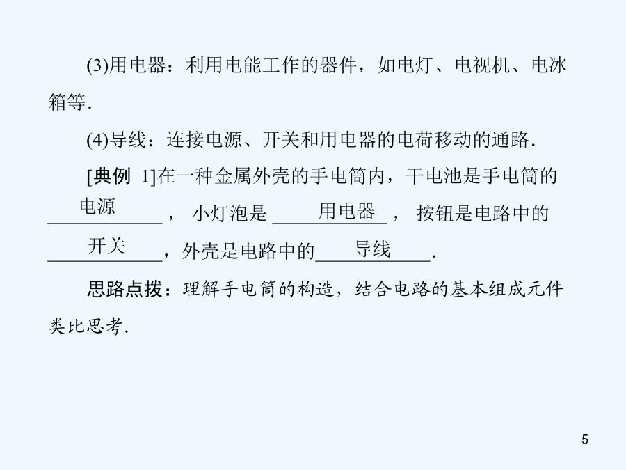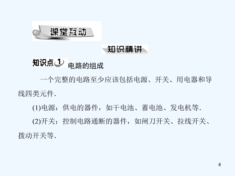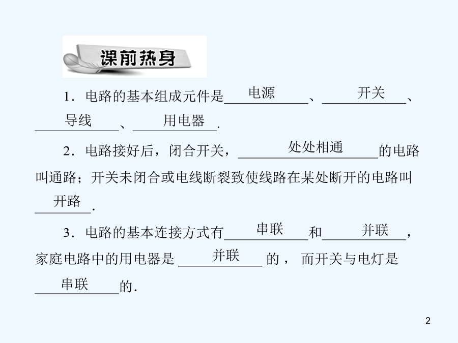 13.2电路的组成和连接方式1.电路的基本组成元件是____________、____________、)电路的组成(3)用电器:利用电能工作的器件,如电灯、电视机、电冰 [典例2]如图11-2-1所示的电路中,开关处于图示状态 时,电灯__________(“亮”或“不亮”);此时电路是 __________;将开关闭合后,电路是____________. 电路图 1.定义:用规定的符号表示电路连接情况的图,叫做电路 图. 2.常见电路元件的符号大家学习辛苦了,还是要坚持[典例3]在框内画出图11-2-2所示实物电路的电路图. 电路的连接方式 1.串联与并联(2)并联:把各个电路元件并列地连接起来(如图11-2-4).[典例4](2011年广东深圳一模)下列选项的四个电路中与图思路点拨:把握电路的串、并联特点,从电源正极出发,