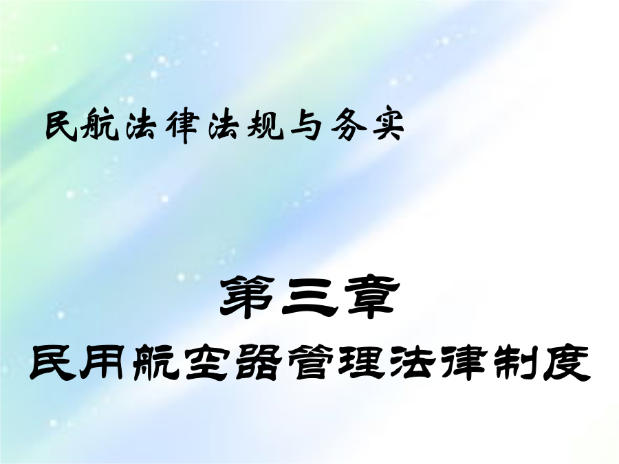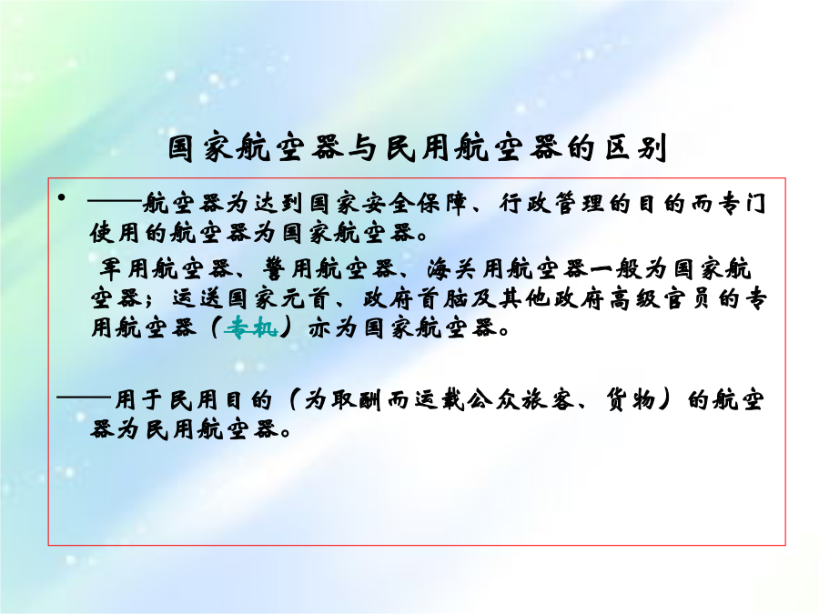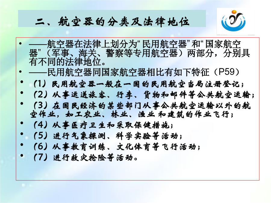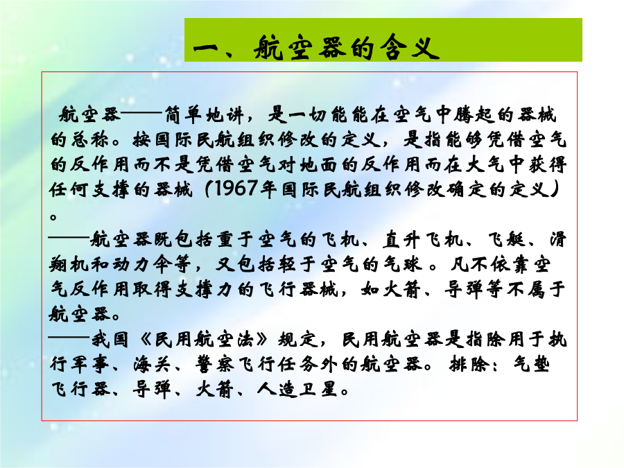第三章 民用航空器管理法律制度航空器——简单地讲,是一切能能在空气中腾起的器械的总称。按国际民航组织修改的定义,是指能够凭借空气的反作用而不是凭借空气对地面的反作用而在大气中获得任何支撑的器械(1967年国际民航组织修改确定的定义)。——航空器既包括重于空气的飞机、直升飞机、飞艇、滑翔机和动力伞等,又包括轻于空气的气球。凡不依靠空气反作用取得支撑力的飞行器械,如火箭、导弹等不属于航空器。——我国《民用航空法》规定,民用航空器是指除用于执行军事、海关、警察飞行任务外的航空器。排除:气垫飞行器、导弹、火箭、人造卫星。二、航空器的分类及法律地位国家航空器与民用航空器的区别航空器按照ICAO(国际民航组织)的分类(1)气球(非动力驱动航空器)(2)飞艇(动力驱动航空器)(3)滑翔机(4)风筝(5)飞机-军用飞机幻影2000(5)飞机-军用飞机(5)飞机-民用飞机货机农业机体育运动飞机公务机空客A380(6)直升机(7)旋翼机(8)扑翼机(8)扑翼机二、民用飞机的分类我国民航的分类方法:民用飞机按起降的场所分为:2.通用航空飞机(一)国家航空器的法律地位一、民用航空器的意义《国际民用航空公约》规定: ——民用航空器不得具有双(多)重国籍,它具有其登记国的国籍; ——民用航空器的登记可以由一国转移到另一国; ——民用航空器登记和转移登记的条件、程序由登记国的国内法规定; ——民用航空器登记后即具有登记机构给定的国籍标志和登记标志,这是从事航行的必要条件之一。一、民用航空器的意义——民用航空器在进行登记以后即具有登记机构给定的国籍标志和登记标志,并依法取得国籍登记证;且必须按照规定在该航空器的外表标明国籍登记识别标志。航空器国籍的重要意义一、民用航空器国籍管理基本原则用登记制度确定国籍的缺陷——“方便旗”问题一、民用航空器国籍管理基本原则一个国籍的规则(三)联合经营原则 《芝加哥公约》规定:“本公约不妨碍两个或两个以上缔约国组成航空运输联营组织或国际性经营机构”,以及在任何航线或地区合营航班。 ——1946年,“北欧航空公司”(SAS)由瑞典、丹麦与挪威三国的航空公司,按3/7、2/7、2/7的资金比例联合组成,这个航空公司的机群,亦按上述比例分别在三国登记。它是世界上成立最早、最成功的国际航空联营组织。1961年,由11个法语系非洲国家联合组成“非洲航空公司”。经ICAO(国际民航组织)决定,只要在一国做联合登记,而将该公司在各国登记的航空器填入联合登记簿内,即可成立;但该公司所属机群只涂共用标志而不是某一个国家的标志,各国承担连带责任(国籍+共用标志)。该航空公司后来是在象牙海岸国联合登记的。三、航空器登记国的权利和义务四、航空器登记的条件“应当登记法”(我国民用航空法)中外合资航空运输企业国务院民用航空主管部门准予登记的其他民用航空器五、民用航空器国籍登记程序六、航空器的国籍标志、登记标志和服务商标服务标志(航徽) 上图中,B为国籍标志,2326为登记标志, 为东方航空公司的服务标志。航空公司的服务商标航空公司的服务商标航空公司的服务商标挂旗公司中国国际航空公司一、民用航空器权利概述民用航空器权利的相关法规二、民用航空器权利的种类(一)民用航空器所有权(一)民用航空器所有权(二)民用航空器抵押权(二)民用航空器抵押权——民用航空器权利除了上面讲的所有权、抵押权外,教材P74还专门讲述了通过购买行为取得并占用民用航空器的权利;根据租赁期限六个月以上的租赁合同占有民主航空器的权利。(一般了解)三、民主航空器登记的作用(三大作用)四、航空器权利登记的管理四、航空器权利登记的管理2、民用航空器权利人应当就下列权利分别向国务院民用航空主管部门办理权利登记:3、民用航空器权利登记程序五、民用航空器权利国籍登记的转移六、民用航空器权利的优先权2、民用航空器优先权的无公示性(二)民用航空器优先权的债权项目(三)民用航空器优先权的受偿顺序(四)民用航空器优先权的期限(五)民用航空器优先权的行使方式(六)民用航空器优先权消灭事由(1)两种解决方法: 一是转移航空器的国籍登记; 二是转移航空器登记国的职能和义务。 (2)第二种方法在航空业中更为普遍。 第一种:先注销该航空器的美国国籍,然后申请中国国籍,可能导致航空器国籍的频繁变更,带来经营上的巨大不便。 第二种:航空器保留美国国籍,由中国与美国达成转移协议,将登记国美国对该航空器的职能和义务转移至经营人所在国中国。这样既保留了航空器国籍登记的稳定性,又使得航空器登记国对航空器的管辖和管理职能顺利实施,有利于控制适航性。一、民用航空器租赁概述一、民用航空器租赁概述二、民用航空器融资性租赁(二)融资性租赁中双方的权利义务 出租人享有航空器的所有权,承租人享有占有、使用、收益权 (航空公司) 出租方供货方