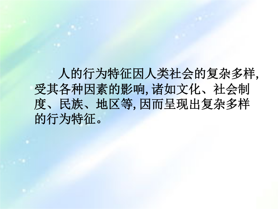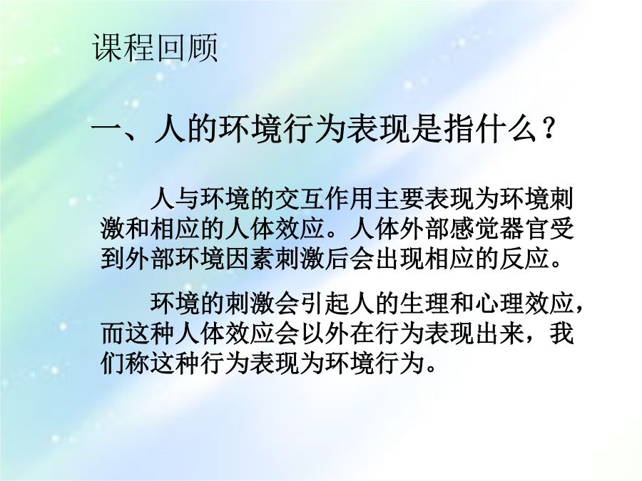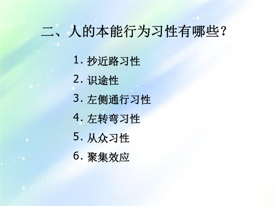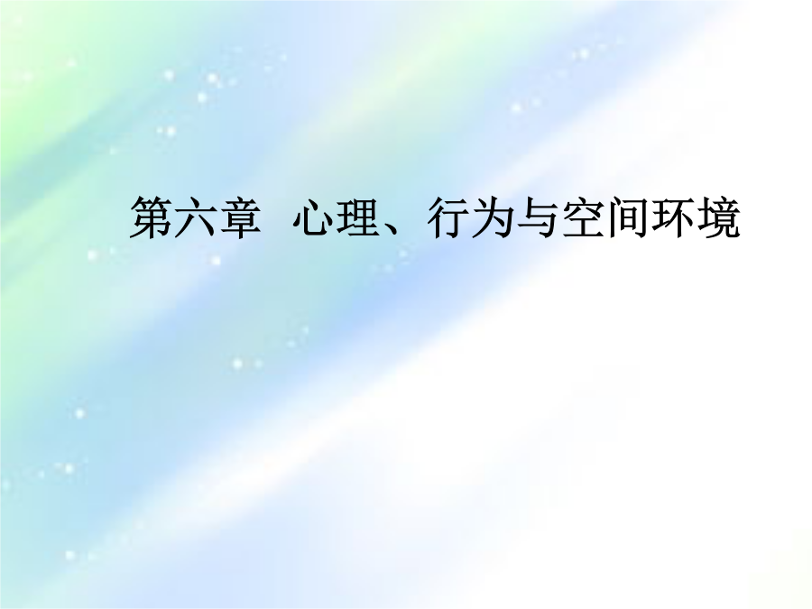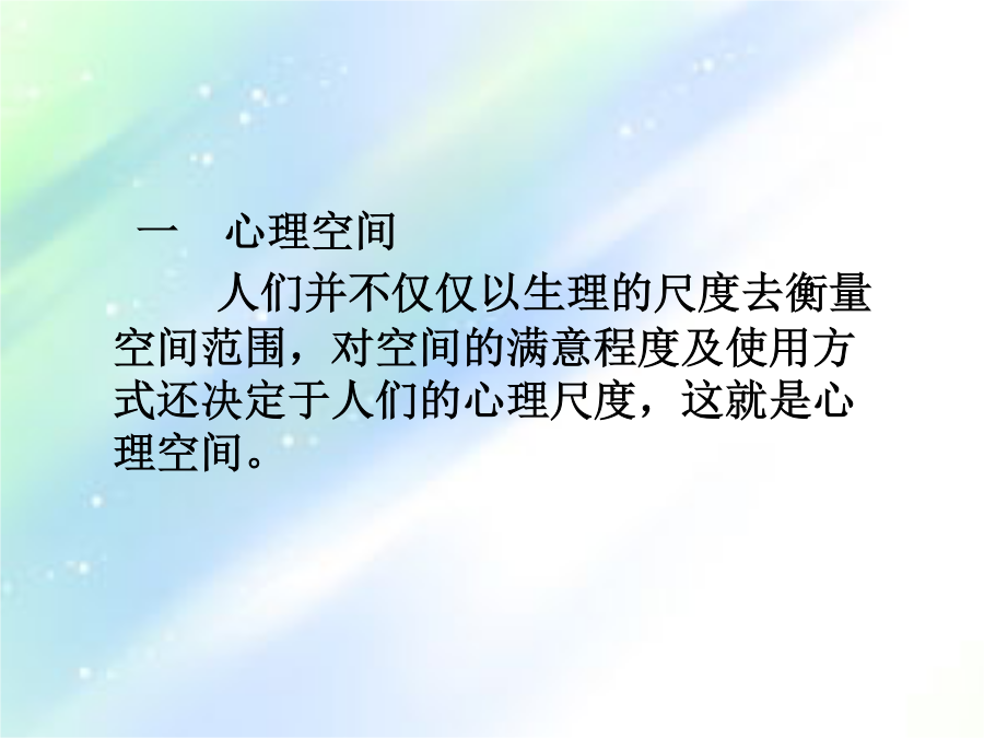 第六章心理、行为与空间环境课程回顾二、人的本能行为习性有哪些?人的行为特征因人类社会的复杂多样,受其各种因素的影响,诸如文化、社会制度、民族、地区等,因而呈现出复杂多样的行为特征。一心理空间1个人空间2领域性人的距离保持3.人际距离人类的与“领土”有关的距离有以下四种接近状态:指亲密者之间发生的爱护、安慰、保护、接触、交流的距离,此时身体接触,气味相透;视觉过近,反而分辨不清。一种是接近态(45—75厘米),是亲密者允许对方进入的不发生为难、躲避的距离,但非亲密者(例如其他异性)进入此距离时会有较强烈反应。社会距离:指参加社会活动时所表现的距离公众距离:指演说、演出等公众场合的距离 人类行为的特点: 主动性动机性目的性 因果性持久性可塑性一、人们的行为状态可分为正常、异常和非常三种。 正常状态:是指在日常的情况下,人们生活的各种因素相互平衡,发展趋势一般在人们的预见之内,各种条件有利于满足人们的心理、生理和社会需求的情况。 异常状态:是指当各因素之间的相互平衡被打破,某一问题突出地显现出它的地位,造成了异乎于平常的状态。 非常状态:当异常状态进一步恶化并伴有生命危险或集团化的倾向时,就进入一种非常状态,常常不自觉地出现恐慌或惊慌。二、行为与环境 行为是人们的社会结构意识等支配的能动性的活动,行为必然发生在一定的环境脉络之中,并且在许多方面与外在的环境,包括自然的、人工的、文化的、心理的、物理的环境有着很好的对应关系而形成一定的行为模式。 行为场所有3个显著特点: (1)存在着固定的或经常发生的行为模式; (2)行为模式通常是有目的的,或者受社交习惯所支配; (3)行为场所的交际特点与行为模式有着不可分割的联系。 二人在空间中的定位在火车站人们等车时选择的位置 (依托的安全感)一依托的安全感二、私密性与尽端趋向在餐馆人们选择位置的频度 (私密性与尽端趋向) 第二节特定环境下的行为模式 一、环境中人们的分布模式 某些特定环境中人群的分布图形与人群的行为特征之间的关系如表5-1所示:例: 由于考虑到不同顾客就餐的需要,西餐厅内采用大空间内再划分若干小空间的作法,如图5-3所示。 详细分析了餐馆中的顾客类型及其行为心理的特点,我们可以把顾客分为12种类型: (1)亲朋好友(2)一家人(3)情侣(4)赶路人(5)知识分子青年夫妇(6)同学、同事、谈得来的朋友(7)摆酒席请客者(8)孤寡老人(9)心情不悦者(10)旅游团体 (11)等候的人(12)外宾。 二、环境中人们的流动模式 人们在环境中的移动,就形成人们的流动。人们的流动具有一定的规律性和倾向性。某时某地的人们流动量和流动模式受到社会规范(例如上、下班时间)的影响等。(一)人群流动的特点 1.靠右行2.识途性3.走捷径 4.不走回头路5.乘兴而行 6.人流的暂时停滞 (二)人群流动的量化指标 美国学者约翰·杰·弗鲁茵对步行者提出了空间模数的概念,实际上它就是密度的倒数。 还有流动系数的指标,这是在交通环境中,以单位宽度、单位时间内能够通过的人数为指标,是表示人流性能的有效指标。步行街道路服务水准的规定 三、特殊环境中的非常行为 (一)集群行为 其联系和作用达到了足够的有效性、持久性、广泛性、密切性和融洽性。有以下特点:狂热性、非常规性、短暂性和自发性。 (二)避险行为 人们在火灾、水灾、地震、沉船等自然灾害和突发的意外面前,由于事故的突然性,使人们的心理缺乏准备;由于压力的巨大性,使人们的反抗无济于事;由于灾难的致命性,使人们的本能暴露无遗。(求生本能、躲避本能、向光本能、追随本能、患难相助与同室操戈) (三)人群灾害 人群灾害是指人群在异常警觉的环境中,由于特殊或偶然的原因,引起群体的恐慌、骚乱和危机,而造成的人身伤亡事故。四、捷径效应五、幽闭恐惧六、恐高症课程回顾二、行为场所中存在哪些特点?三、人在空间中定位模式?四、幽闭恐惧?第三节环境心理学一、公务环境的舒适性 为了克服疲劳对工作的不利影响,心理学家提出了以下几点建议: 1.设计良好的工作环境 例如在电脑工作室中,有草香味时,工作错误比平时减少20%;茉莉花香味时,减少33%;柠檬香味时,减少54%。气味类型 2.加强工作的计划性和预见性 3.避免单调工作,使工作丰富化 4.房间的设计和布置要具有人情味二、环境的开放性与封闭性(二)开窗面积与开放性 窗户的总面积确定时,如果窗户不是一个,而是分成两个甚至更多,则窗户的大小就不能令人满意;或者说,同样面积的窗户,只开一个比开几个的效果要好一些。 窗外的景观可以分为3个层次,一是天空、远山和大自然;二是城市的横向远跳的景观;三是地面上人们的活动情况。如果3个层次都能满足,则是最佳的选择。(三)公务环境的开放性 室内,通常有办公人员1-4人,私密性