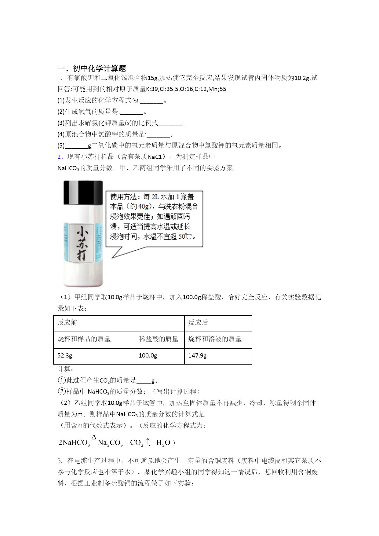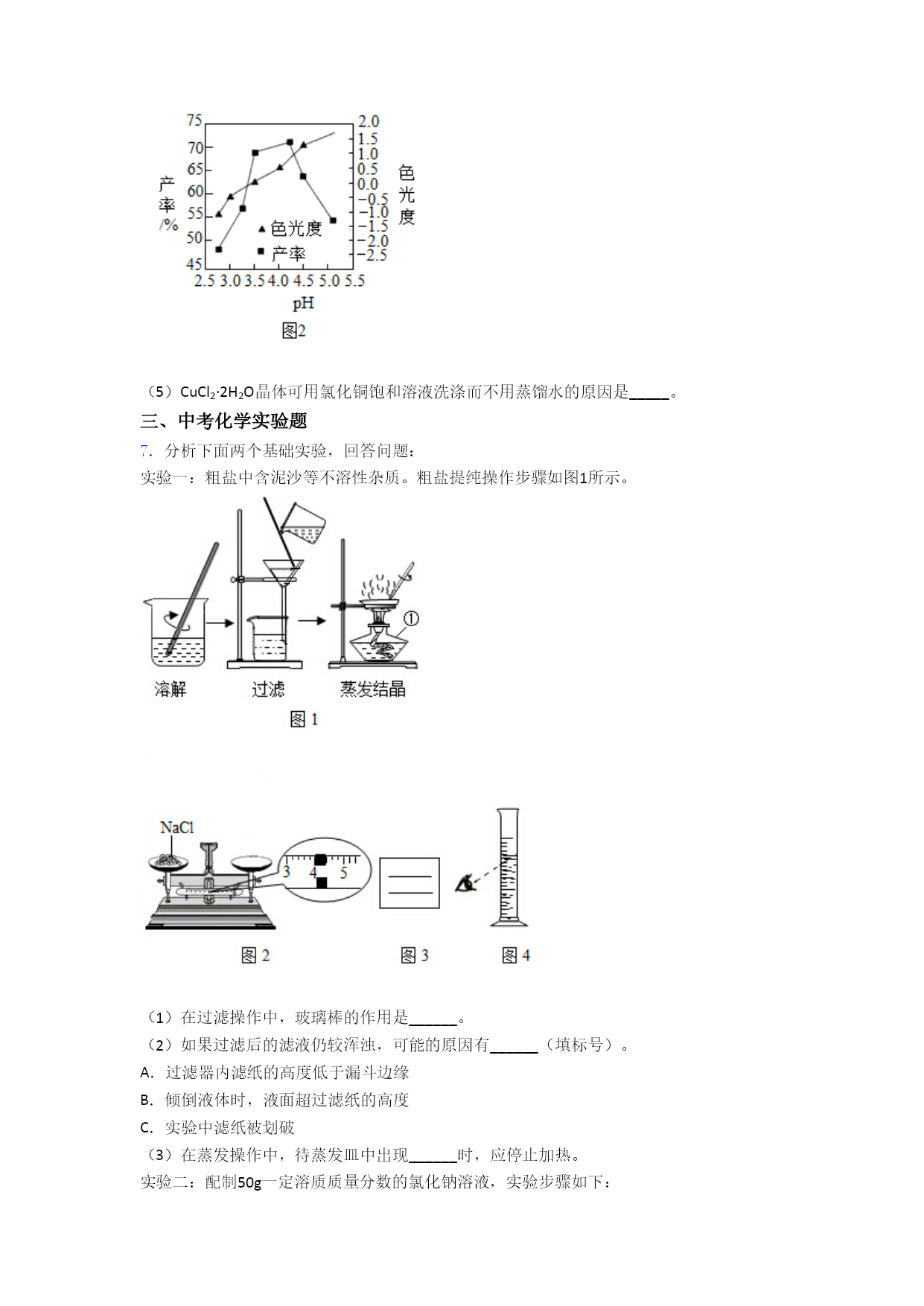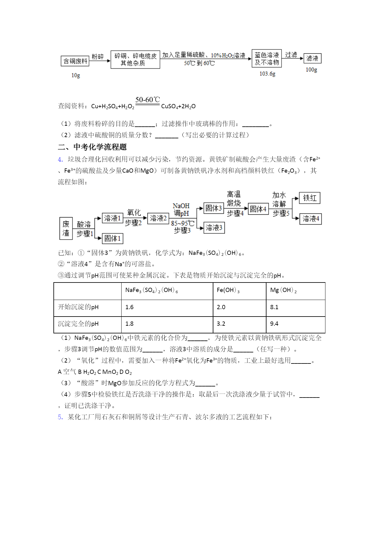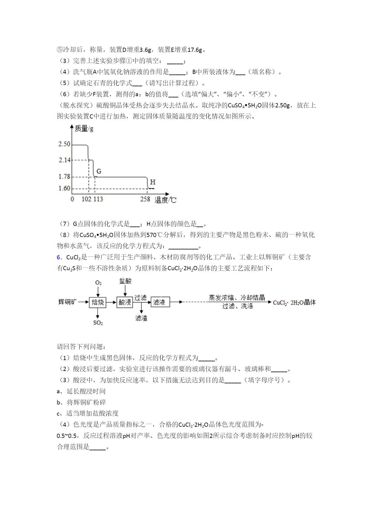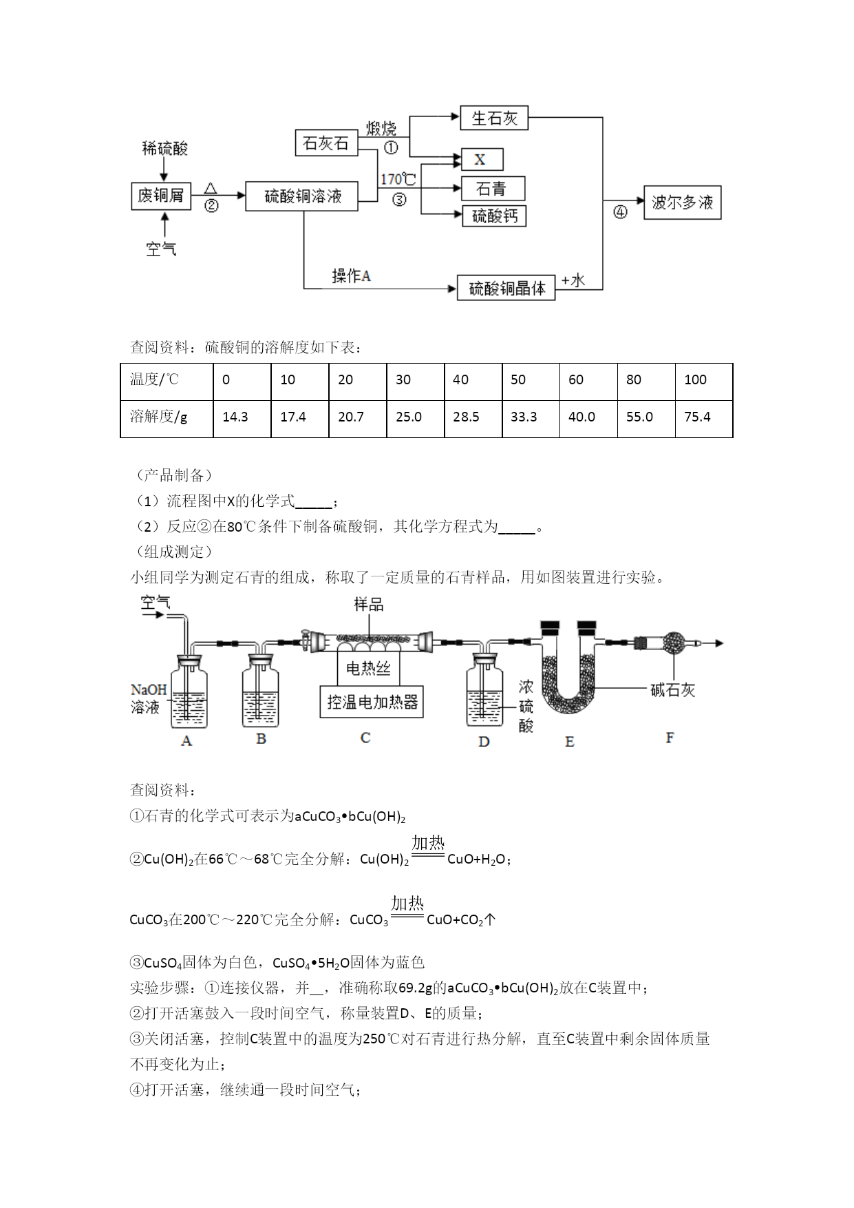 一、初中化学计算题 1.有氯酸钾和二氧化锰混合物15g,加热使它完全反应,结果发现试管内固体物质为10.2g,试回答:可能用到的相对原子质量K:39,Cl:35.5,O:16,C:12,Mn;55 (1)发生反应的化学方程式为:_______。 (2)生成氧气的质量是:_______。 (3)列出求解氯化钾质量(x)的比例式_______。 (4)原混合物中氯酸钾的质量是:_______。 (5)_______g二氧化碳中的氧元素质量与原混合物中氯酸钾的氧元素质量相同。 2.现有小苏打样品(含有杂质NaC1),为测定样品中NaHCO3的质量分数。甲、乙两组同学采用了不同的实验方案。 (1)甲组同学取10.0g样品于烧杯中,加入100.0g稀盐酸,恰好完全反应,有关实验数据记录如下表: 反应前反应后烧杯和样品的质量稀盐酸的质量烧杯和溶液的质量52.3g100.0g147.9g计算: ①此过程产生CO2的质量是g。 ②样品中NaHCO3的质量分数;(写出计算过程) (2)乙组同学取10.0g样品于试管中,加热至固体质量不再减少,冷却、称量得剩余固体质量为m。则样品中NaHCO3的质量分数的计算式是(用含m的代数式表示)。(反应的化学方程式为:) 3.在电缆生产过程中,不可避免地会产生一定量的含铜废料(废料中电缆皮和其它杂质不参与化学反应也不溶于水)。某化学兴趣小组的同学得知这一情况后,想回收利用含铜废料,根据工业制备硫酸铜的流程做了如下实验: 查阅资料:Cu+H2SO4+H2O2CuSO4+2H2O (1)将废料粉碎的目的是______;过滤操作中玻璃棒的作用:________。 (2)滤液中硫酸铜的质量分数?_______(写出必要的计算过程) 二、中考化学流程题 4.垃圾合理化回收利用可以减少污染,节约资源。黄铁矿制硫酸会产生大量废渣(含Fe2+、Fe3+的硫酸盐及少量CaO和MgO)可制备黄钠铁矾净水剂和高档颜料铁红(Fe2O3),其流程如图: 已知:①“固体3”为黄钠铁矾,化学式为:NaFe3(SO4)2(OH)6。 ②“溶液4”是含有Na+的可溶盐。 ③通过调节pH范围可使某种金属沉淀。下表是物质开始沉淀与沉淀完全的pH。 NaFe3(SO4)2(OH)6Fe(OH)3Mg(OH)2开始沉淀的pH1.62.08.1沉淀完全的pH1.83.29.4(1)NaFe3(SO4)2(OH)6中铁元素的化合价为______,为使铁元素以黄钠铁矾形式沉淀完全,步骤3调节pH的数值范围为______,溶液3中溶质的成分是______(任写一种)。 (2)“氧化”过程中,需要加入一种将Fe2+氧化为Fe3+的物质,工业上最好选用______。 A空气BH2O2CMnO2DO2 (3)“酸溶”时MgO参加反应的化学方程式为______。 (4)步骤5中检验铁红是否洗涤干净的操作是:取最后一次洗涤液少量于试管中,______,证明已洗涤干净。 5.某化工厂用石灰石和铜屑等设计生产石青、波尔多液的工艺流程如下: 查阅资料:硫酸铜的溶解度如下表: 温度/℃010203040506080100溶解度/g14.317.420.725.028.533.340.055.075.4 (产品制备) (1)流程图中X的化学式_____; (2)反应②在80℃条件下制备硫酸铜,其化学方程式为_____。 (组成测定) 小组同学为测定石青的组成,称取了一定质量的石青样品,用如图装置进行实验。 查阅资料: ①石青的化学式可表示为aCuCO3•bCu(OH)2 ②Cu(OH)2在66℃~68℃完全分解:Cu(OH)2CuO+H2O;CuCO3在200℃~220℃完全分解:CuCO3CuO+CO2↑ ③CuSO4固体为白色,CuSO4•5H2O固体为蓝色 实验步骤:①连接仪器,并,准确称取69.2g的aCuCO3•bCu(OH)2放在C装置中; ②打开活塞鼓入一段时间空气,称量装置D、E的质量; ③关闭活塞,控制C装置中的温度为250℃对石青进行热分解,直至C装置中剩余固体质量不再变化为止; ④打开活塞,继续通一段时间空气; ⑤冷却后,称量,装置D增重3.6g,装置E增重17.6g。 (3)完善上述实验步骤①中的填空:_____; (4)洗气瓶A中氢氧化钠溶液的作用是_____;B中所装液体为___(填名称)。 (5)试确定石青的化学式___(请写出计算过程)。 (6)若缺少F装置,测得的a:b的值将___(选填“偏大”、“偏小”、“不变”)。 (脱水探究)硫酸铜晶体受热会逐步失去结晶水。取纯净的CuSO4•5H2O固体2.50g,放在上图实验装置C中进行加热,测定固体质量随温度的变化情况如图所示。 (7)G点固体的化学式是___;H点固体的颜