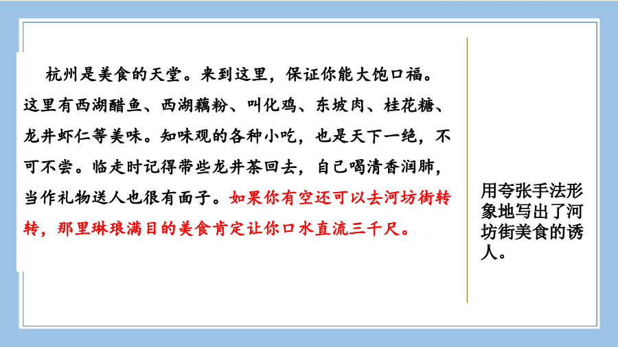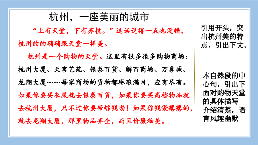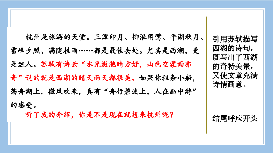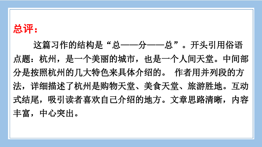 杭州,一座美丽的城市杭州是美食的天堂。来到这里,保证你能大饱口福。这里有西湖醋鱼、西湖藕粉、叫化鸡、东坡肉、桂花糖、龙井虾仁等美味。知味观的各种小吃,也是天下一绝,不可不尝。临走时记得带些龙井茶回去,自己喝清香润肺,当作礼物送人也很有面子。如果你有空还可以去河坊街转转,那里琳琅满目的美食肯定让你口水直流三千尺。杭州是旅游的天堂。三潭印月、柳浪闻莺、平湖秋月、雷峰夕照、满陇桂雨……都是最佳去处。尤其是西湖,更是迷人。苏轼有诗云“水光潋滟晴方好,山色空蒙雨亦奇”说的就是西湖的晴天雨天都很美。如果你租条小船,荡舟湖上,微风吹来,真有“舟行碧波上,人在画中游”的感受。 听了我的介绍,你是不是现在就想来杭州呢?总评: 这篇习作的结构是“总——分——总”。开头引用俗语点题:杭州,是一个美丽的城市,也是一个人间天堂。中间部分是按照杭州的几大特色来具体介绍的。作者用并列段的方法,详细描述了杭州是购物天堂、美食天堂、旅游胜地。互动式结尾,吸引读者喜欢自己介绍的地方。文章思路清晰,内容丰富,中心突出。以下资料为赠送学习目标陈尧咨(善射)1、联系生活、学习,说说熟能生巧的事例。 2、你认为一个人应该如何看待自己的长处?又如何看待他人的长处?1、课文主要写了和两个场面。人外有人,天外有天。 取人之长,补己之短。 自满人十事九空,虚心人万事可成。 谦受益,满招损。1、正视自己的长处,扬长避短, 2、正视自己的缺点,知错能改, 3谦虚使人进步, 4、人应有一技之长, 5、自信是走向成功的第一步, 6强中更有强中手,一山还比一山高, 7艺无止境 8、宝剑锋从磨砺出,梅花香自苦寒来,刻苦训练才能有所收获,取得成效。 9、骄傲自大、不可一世者往往遭人轻视; 10、智者超然物外